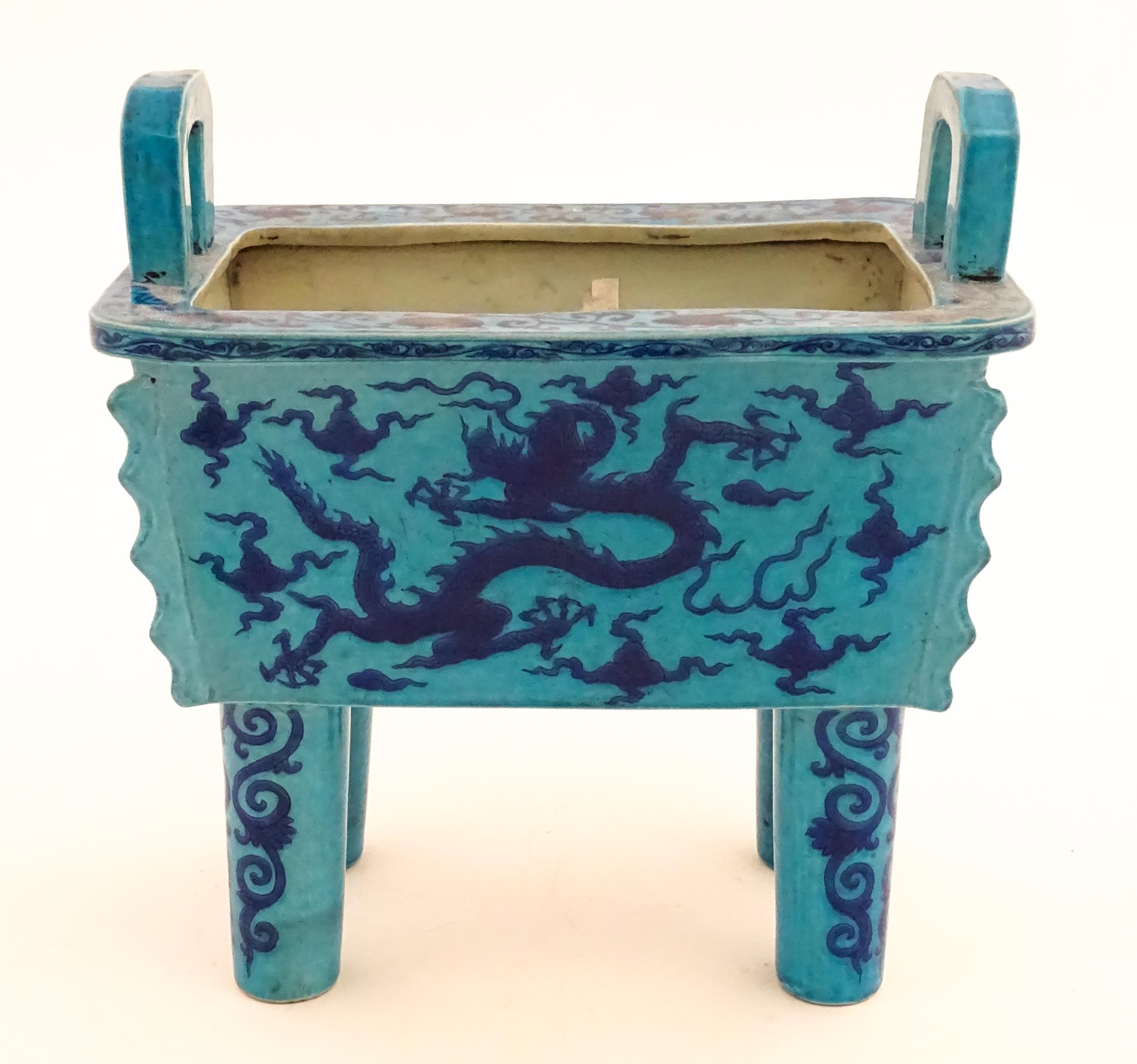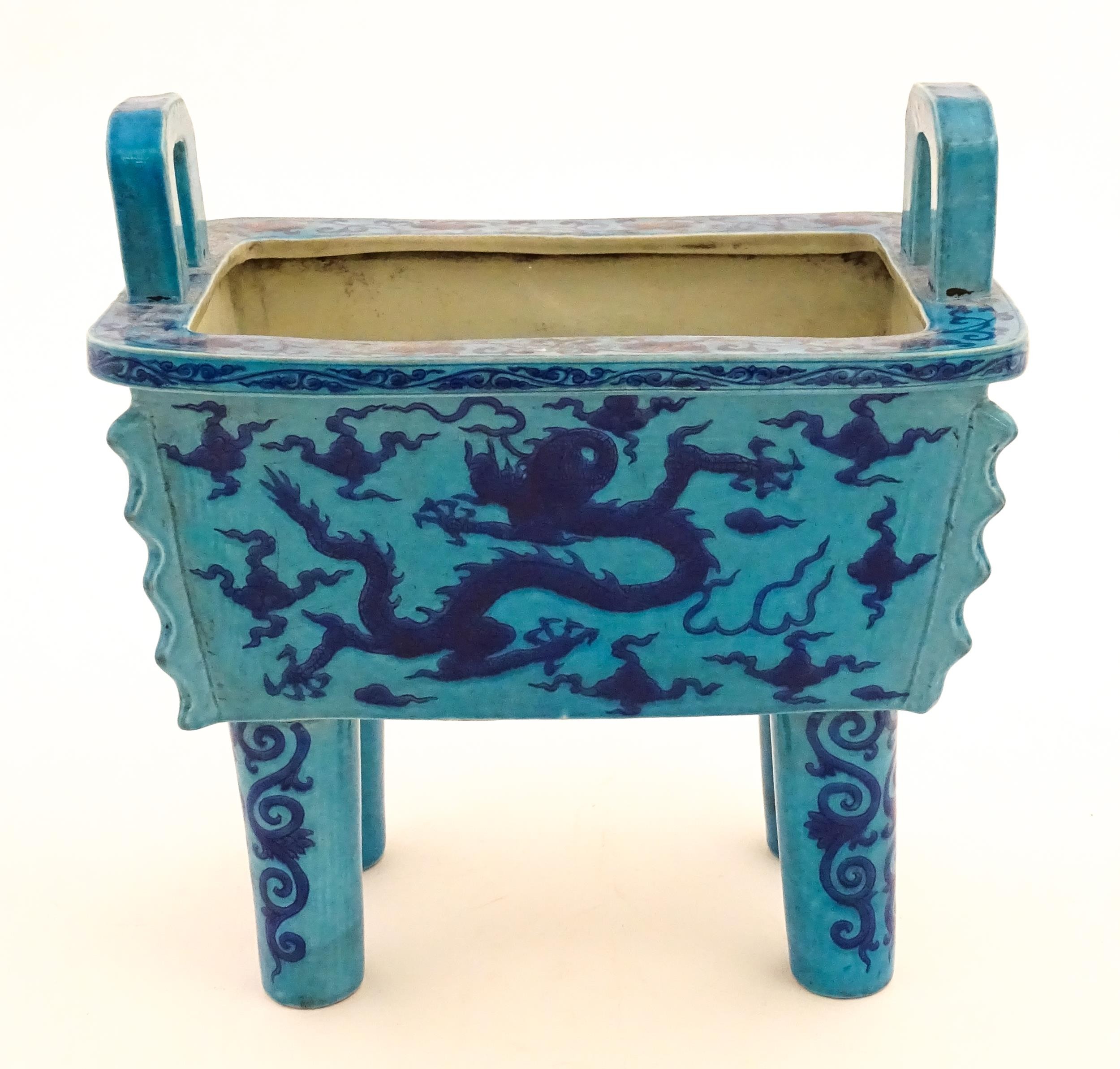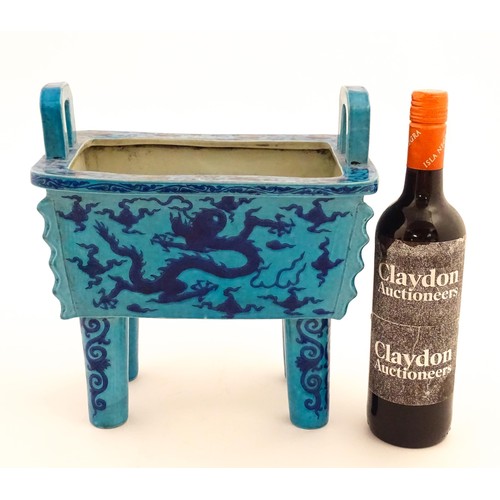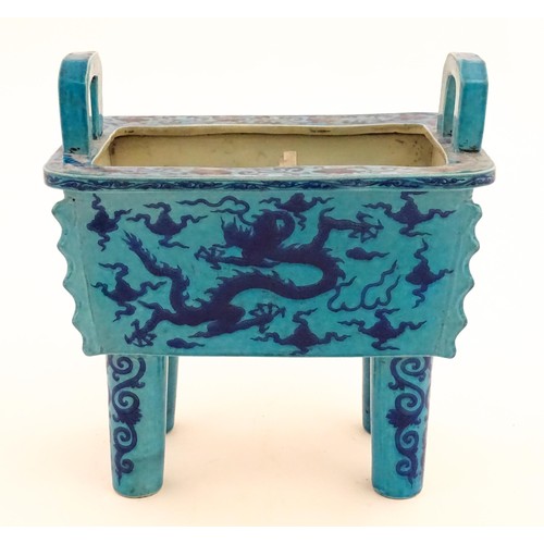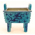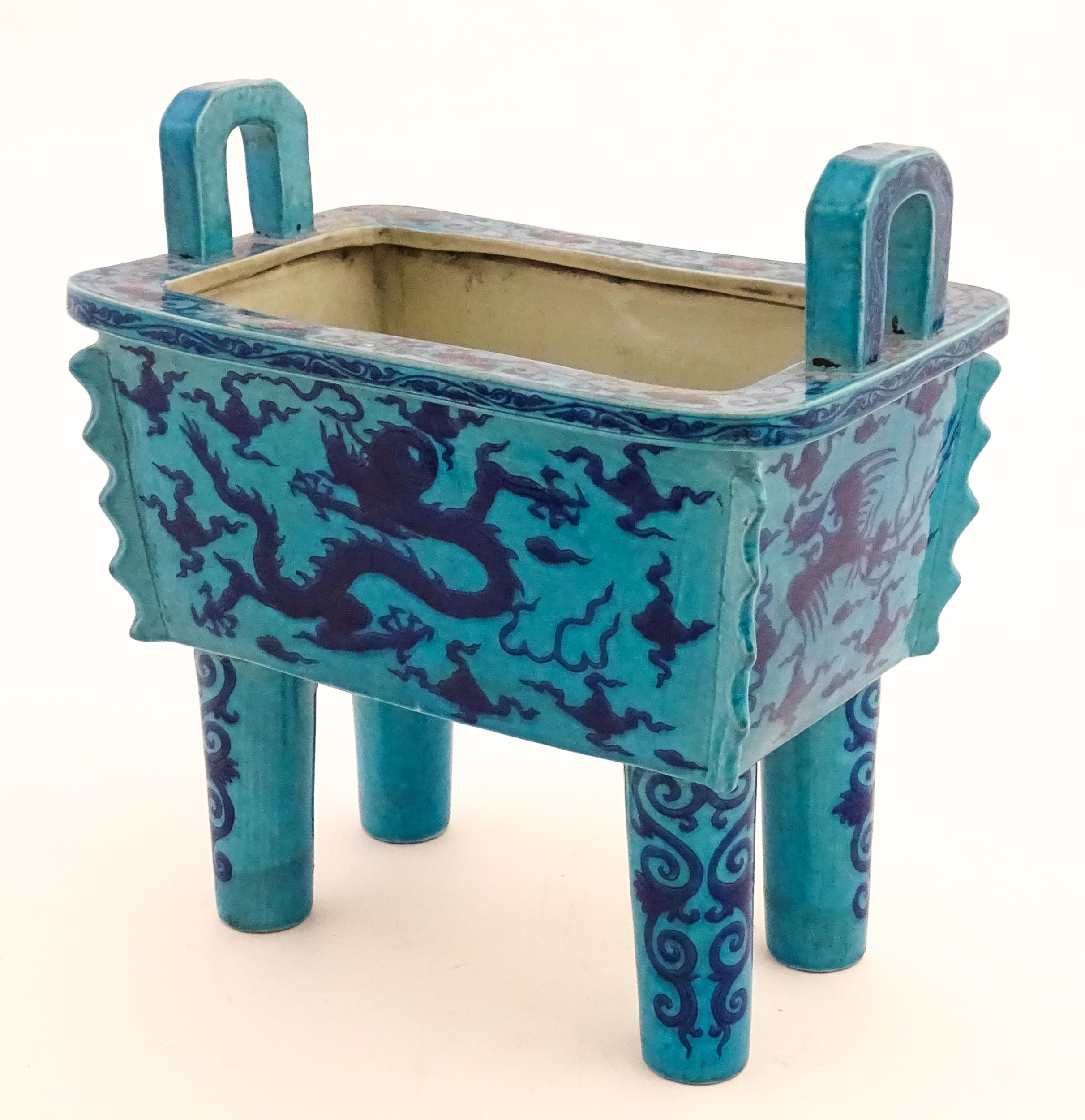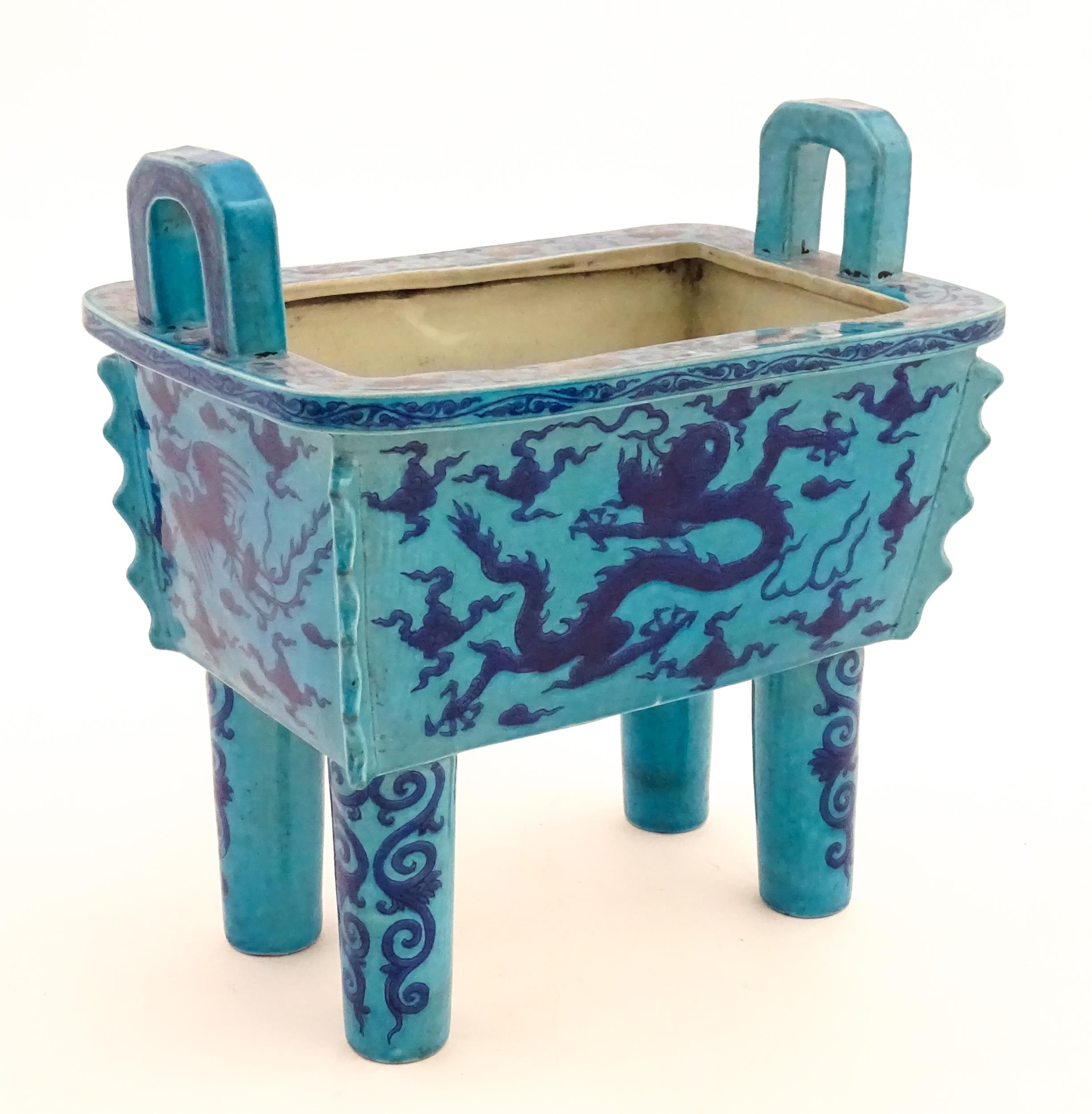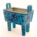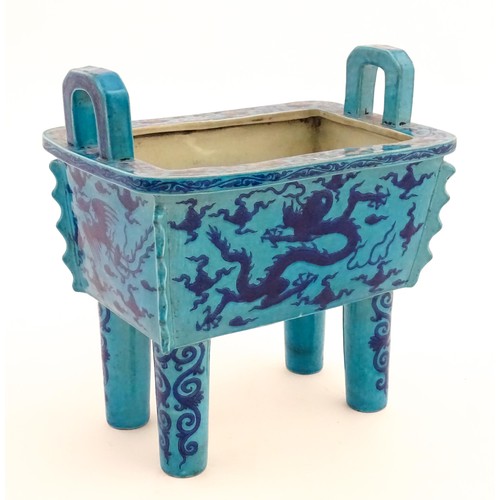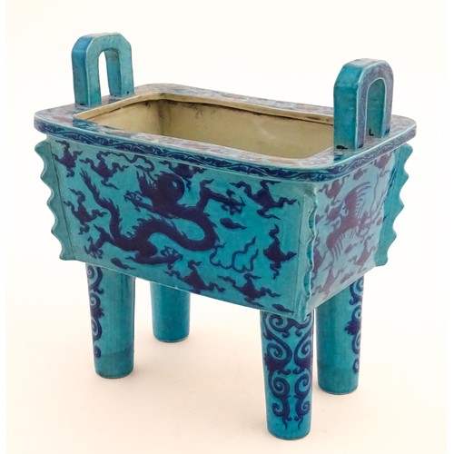 A Chinese planter of fang ding form with a turquoise ground decorated with blue dragons and phoenix birds amongst stylised clouds. Character marks under. Approx. 12 1/2" high x 11" wide