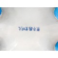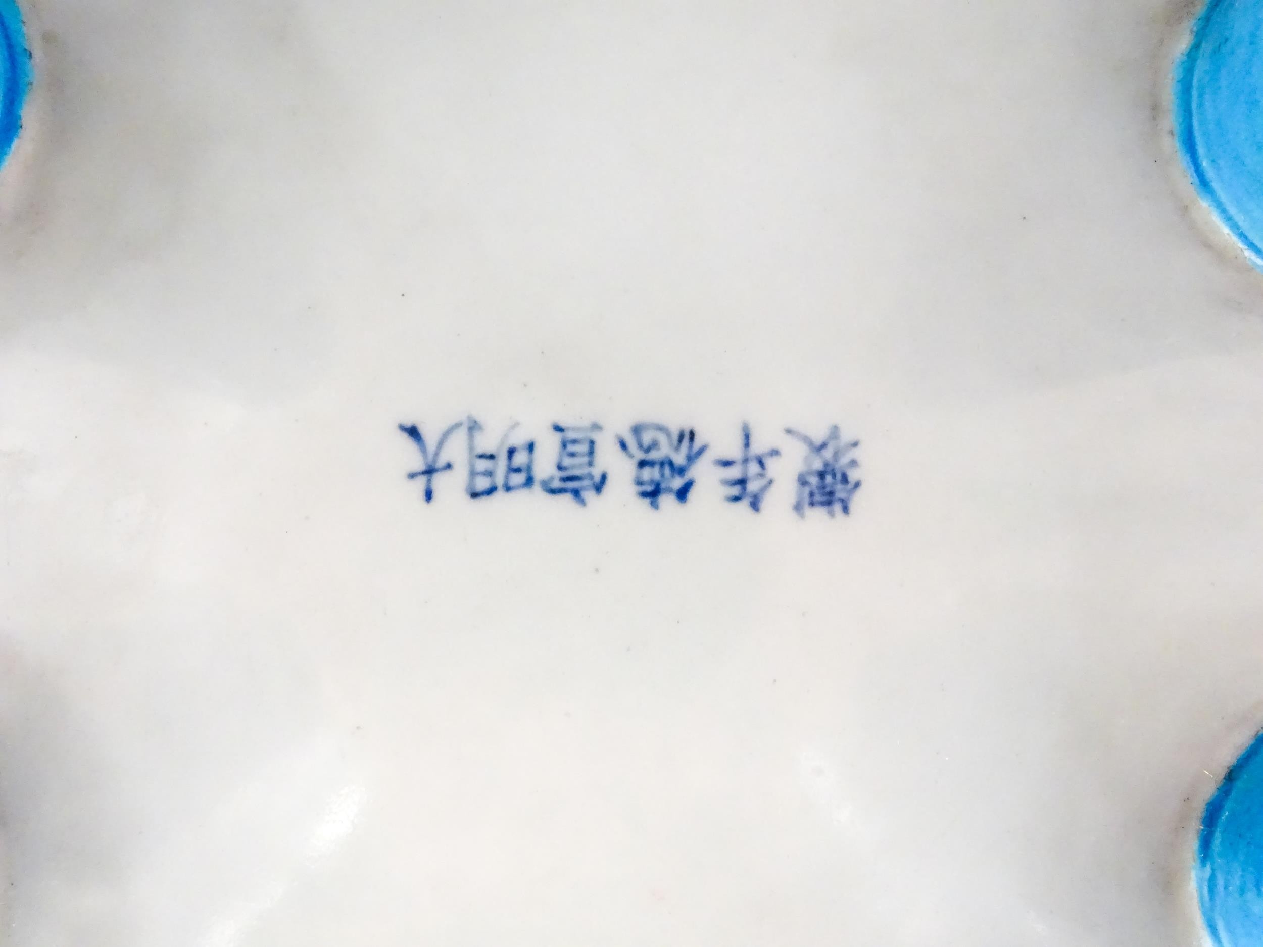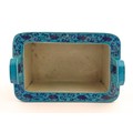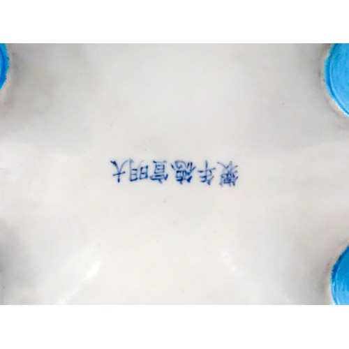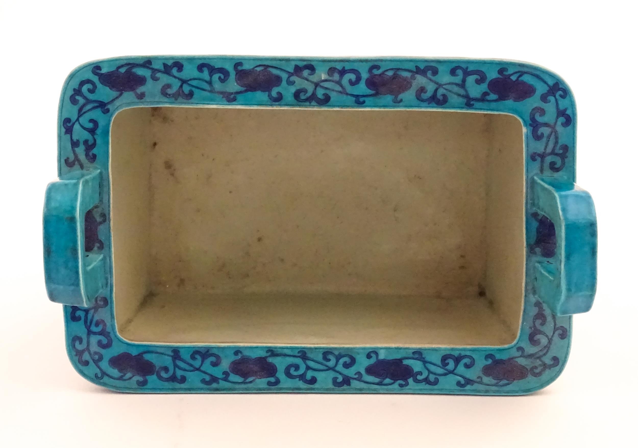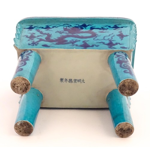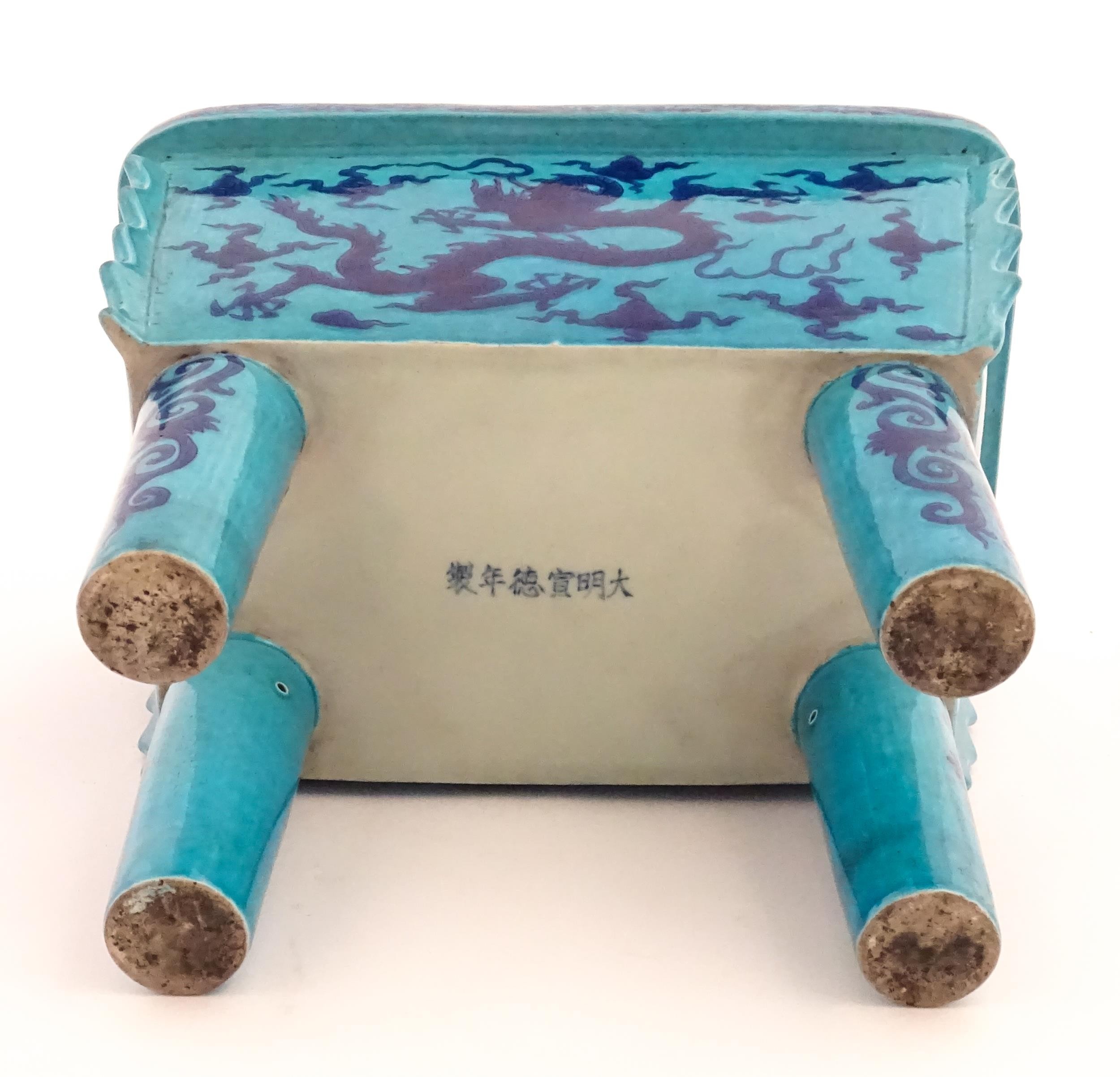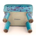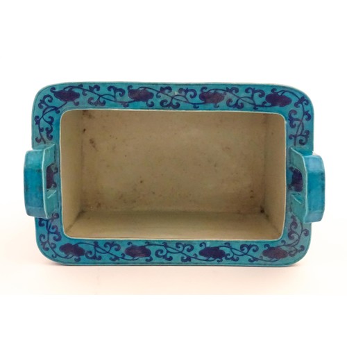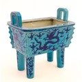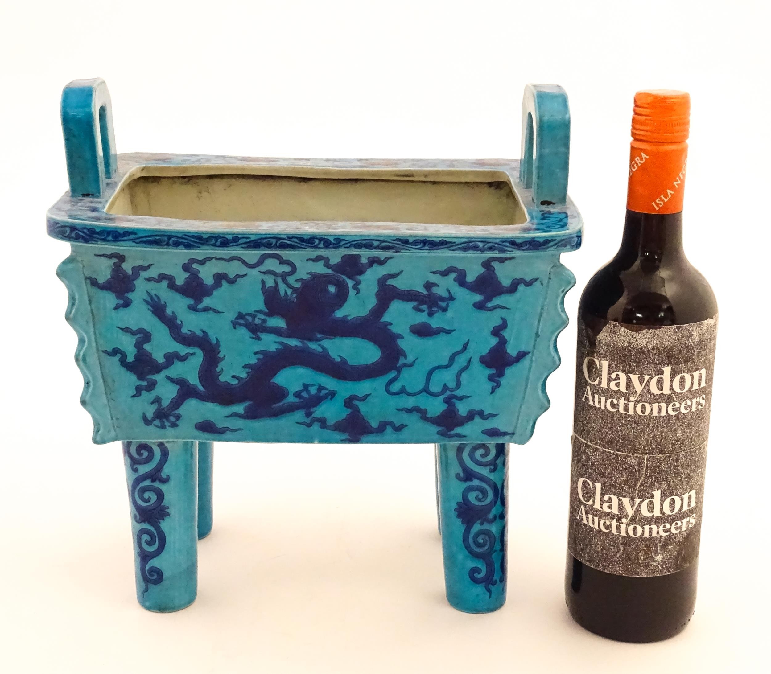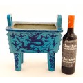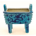 A Chinese planter of fang ding form with a turquoise ground decorated with blue dragons and phoenix birds amongst stylised clouds. Character marks under. Approx. 12 1/2" high x 11" wide