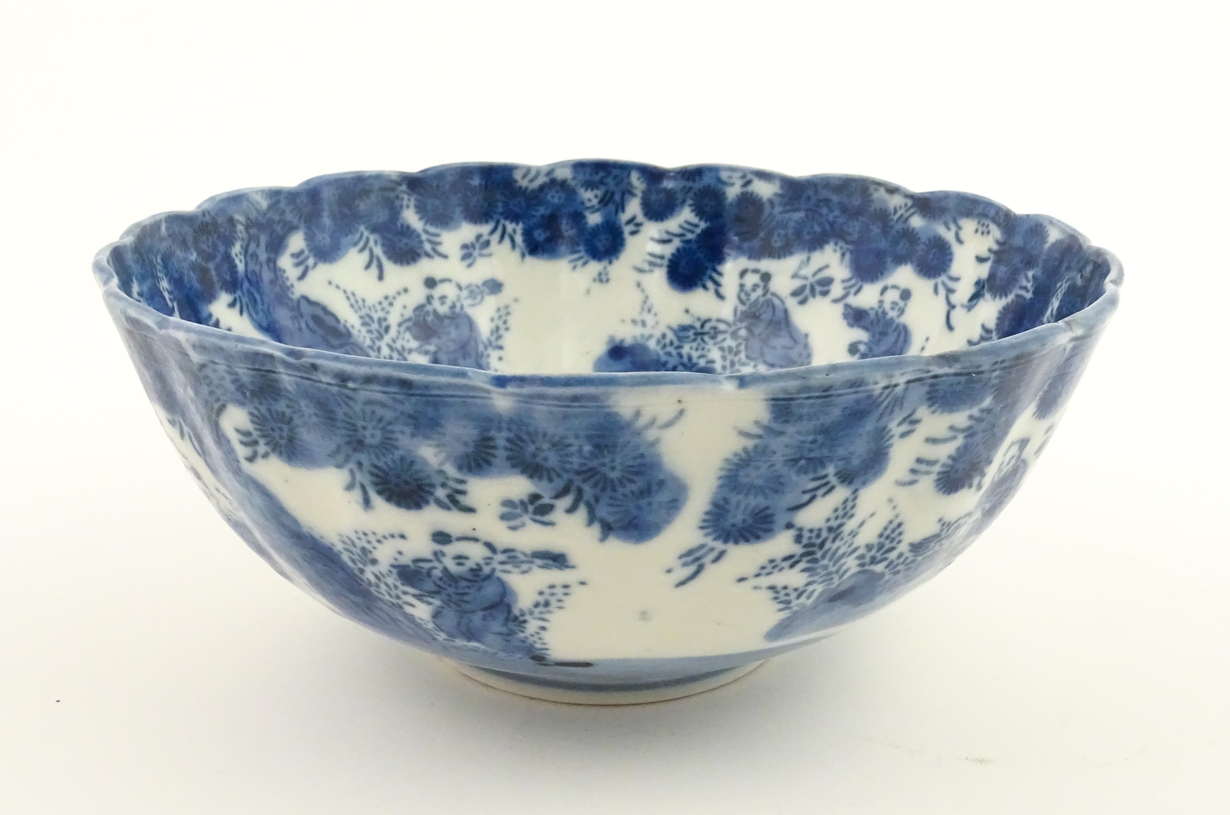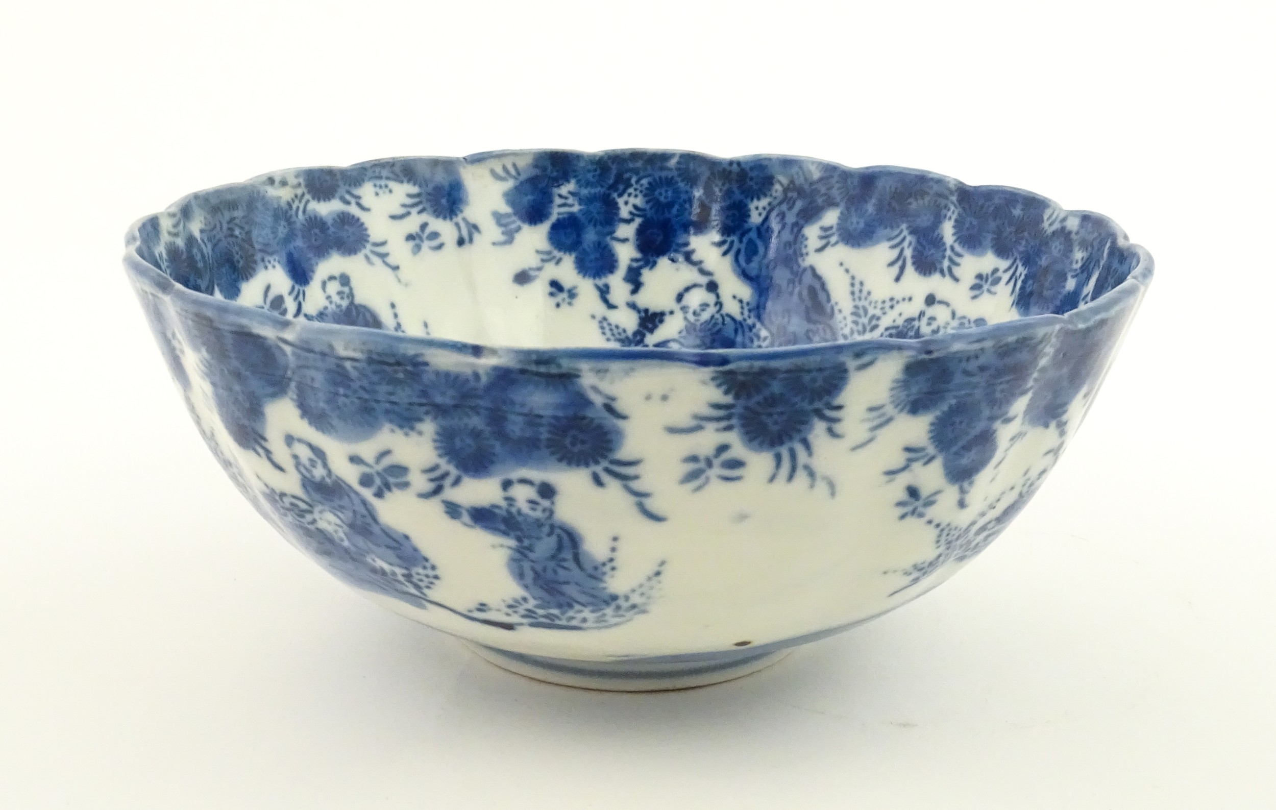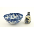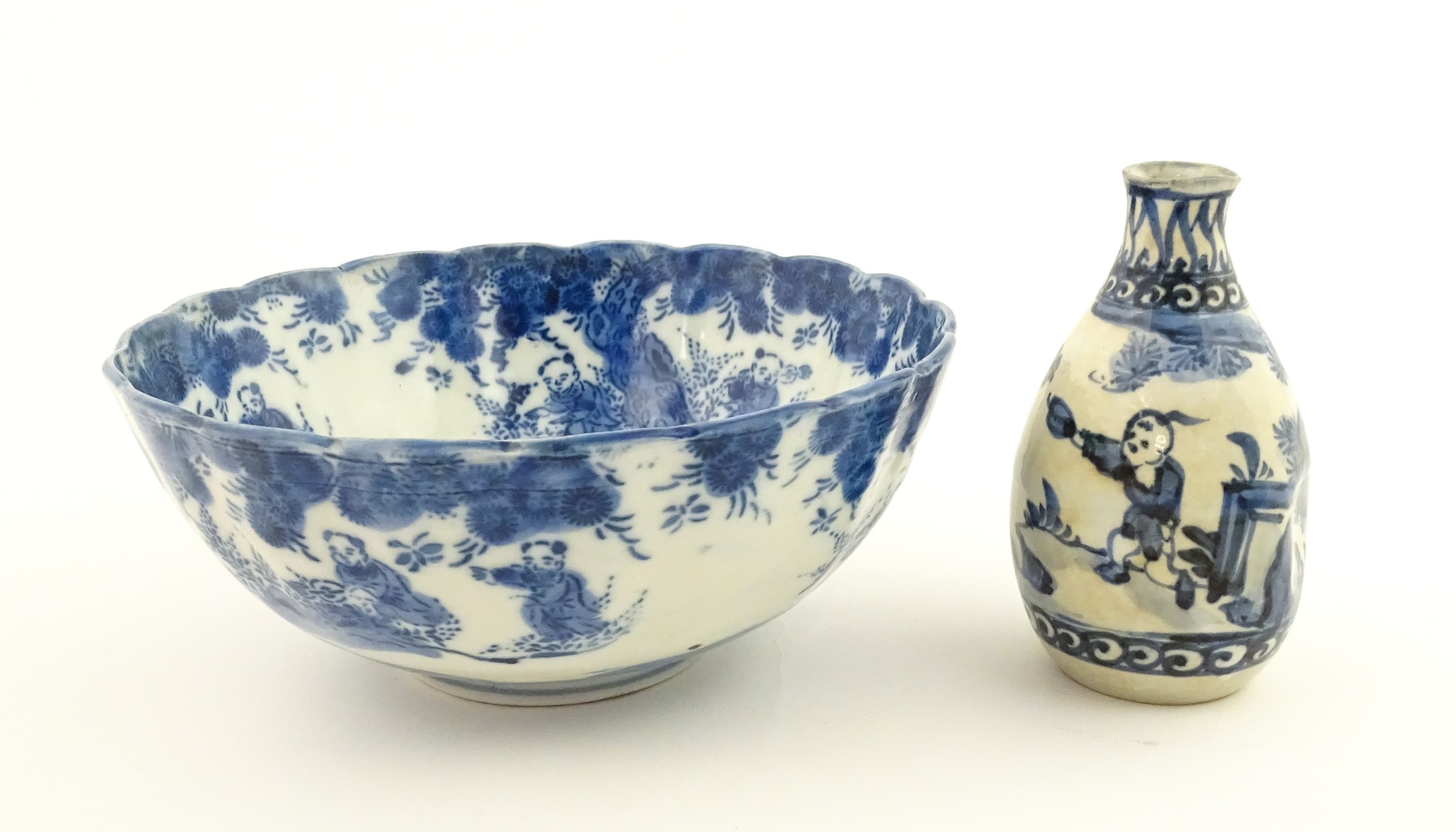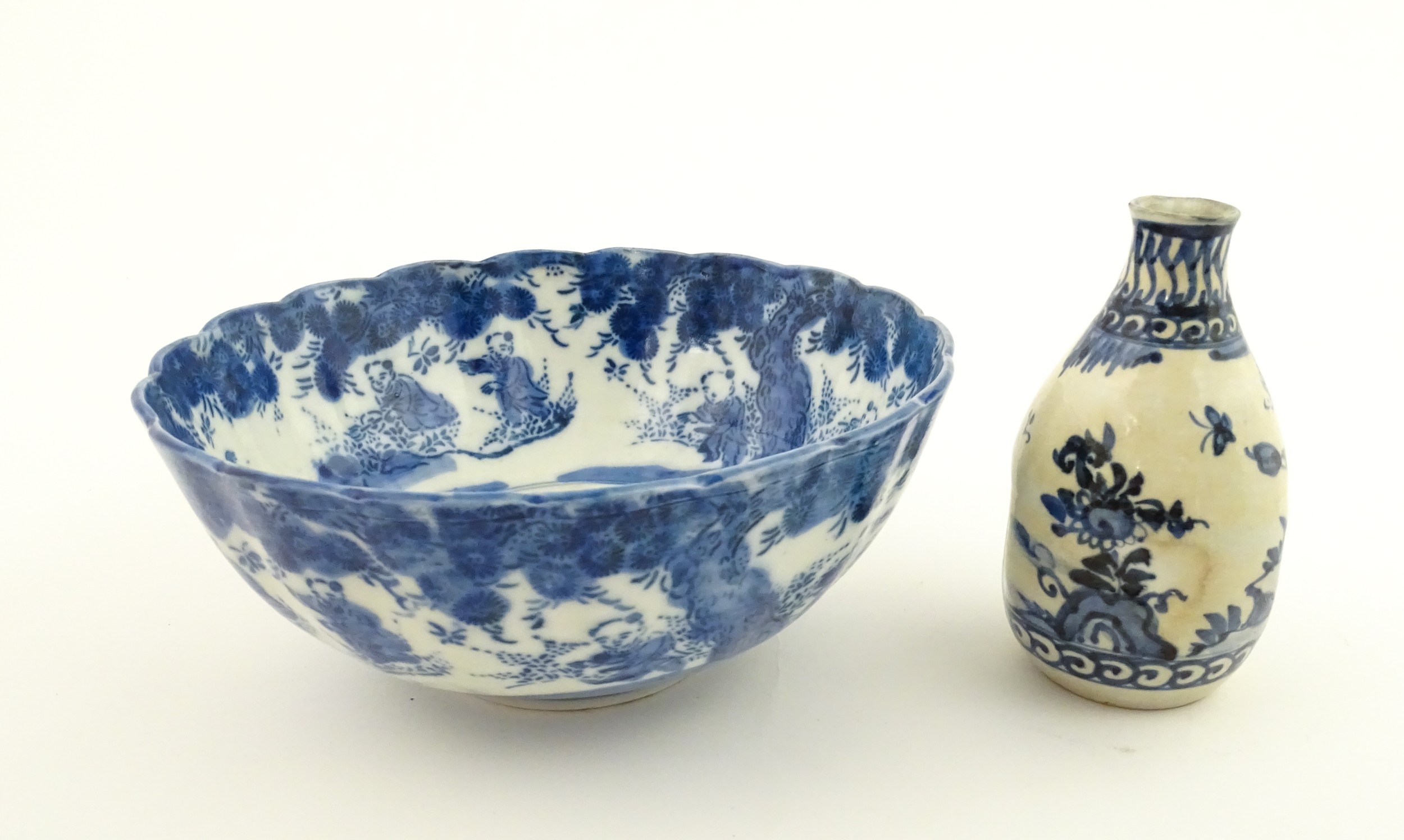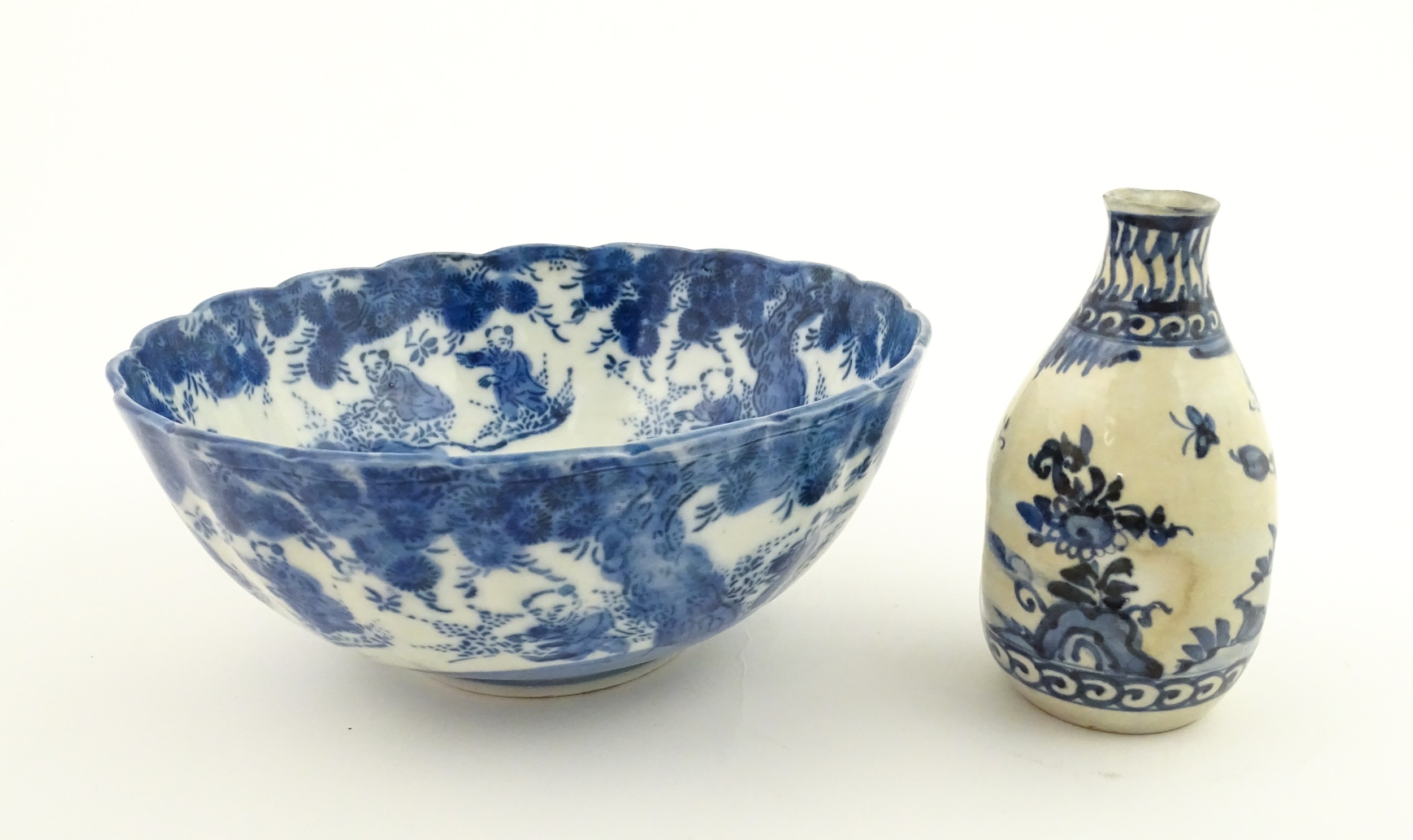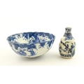 A Chinese blue and white bottle vase with pinch detail decorated with a figure in a landscape. Together with a Japanese blue and white bowl decorated with figures and flowers. Bowl approx. 4" high x 9 1/2" diameter (2)