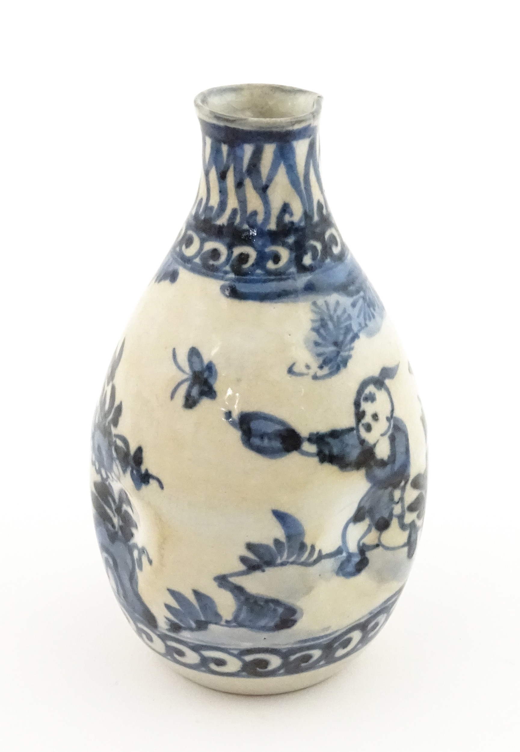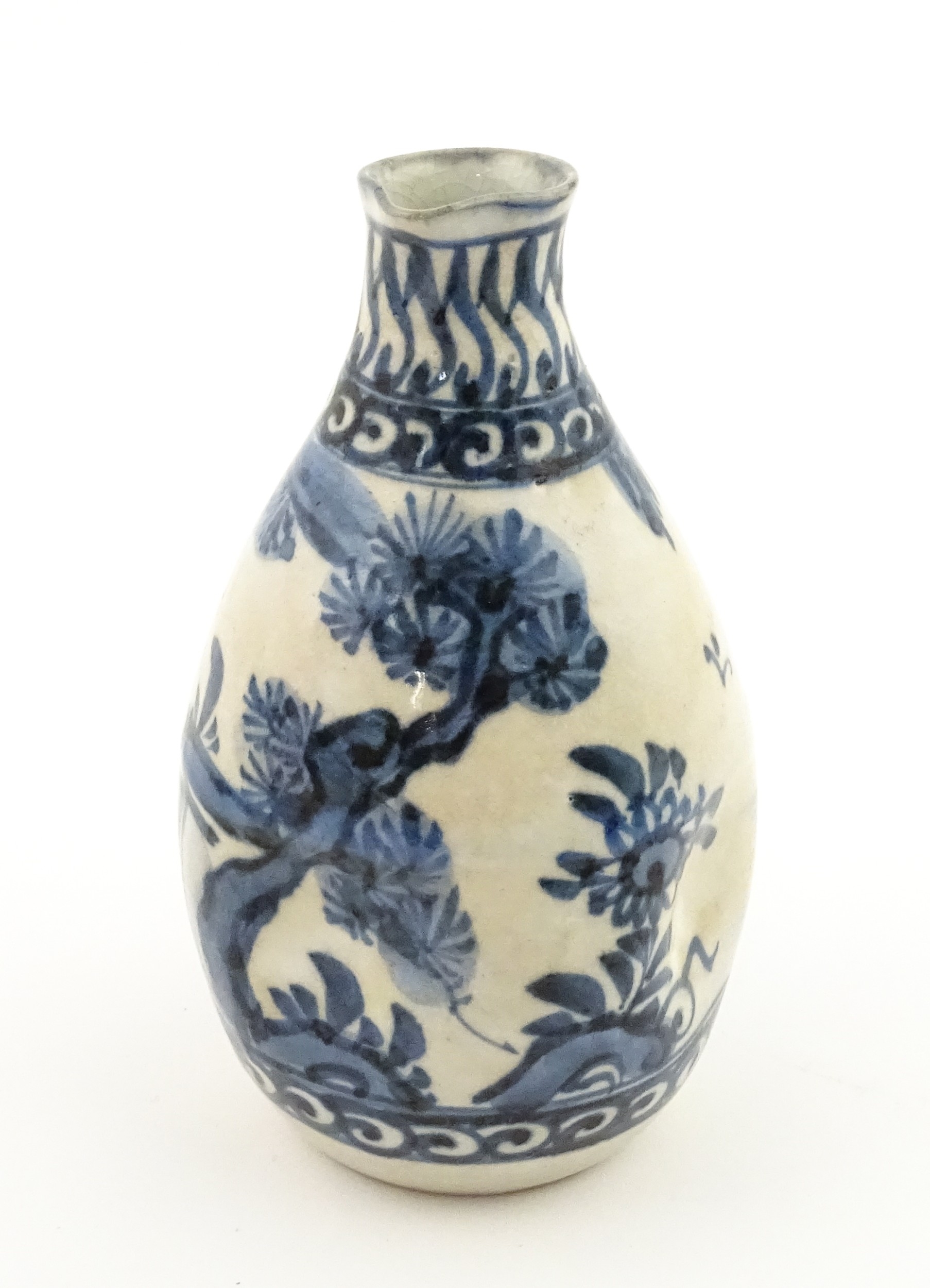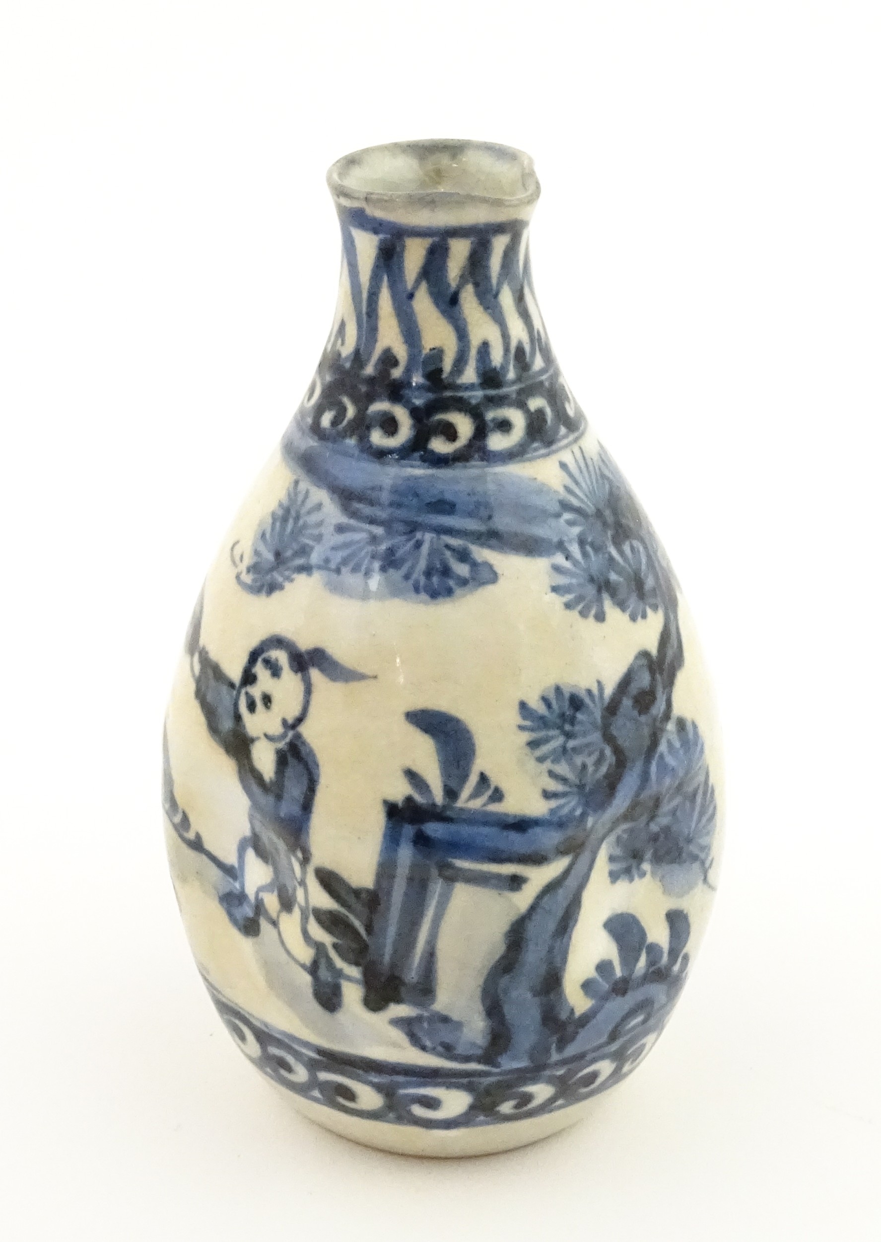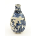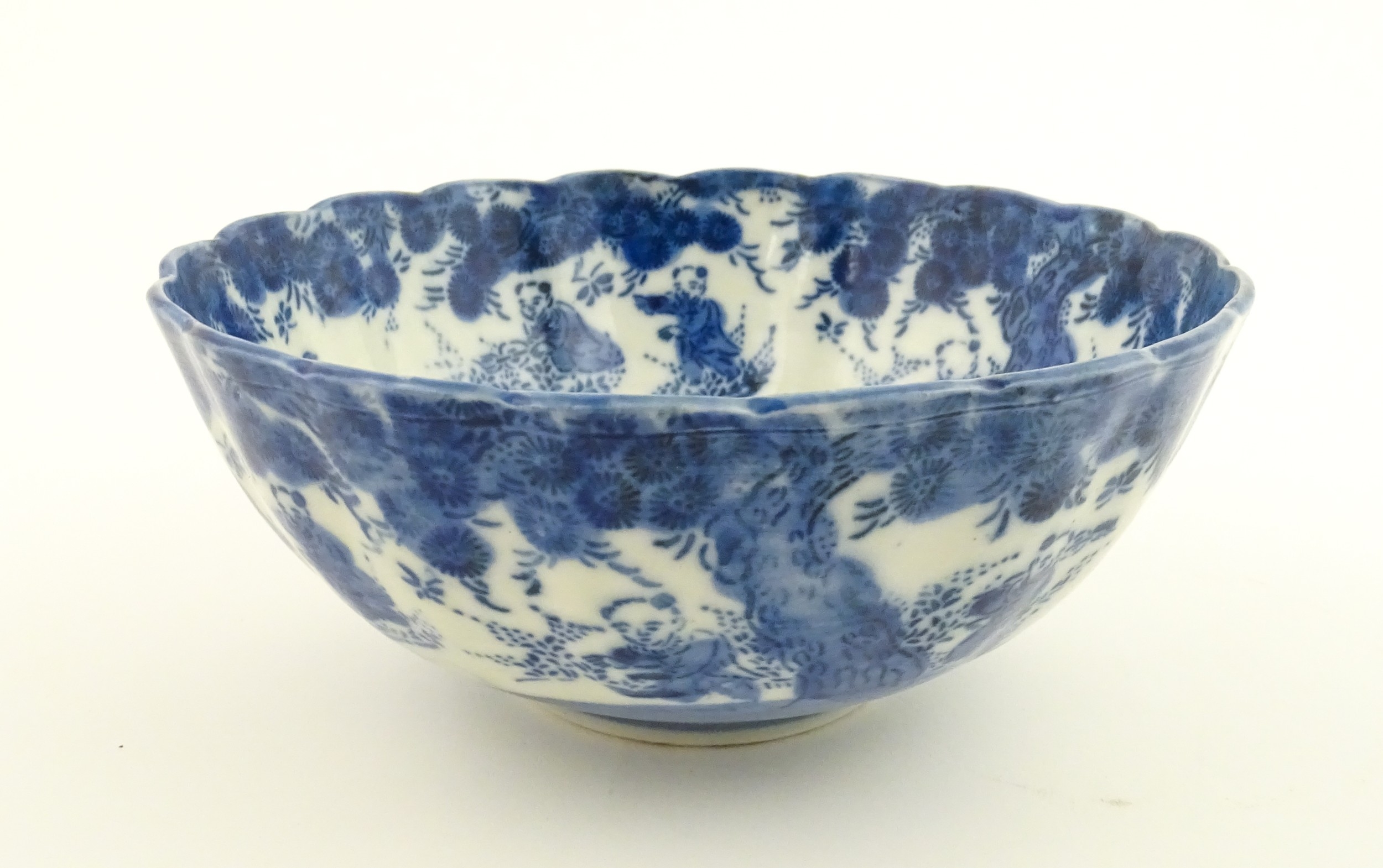 A Chinese blue and white bottle vase with pinch detail decorated with a figure in a landscape. Together with a Japanese blue and white bowl decorated with figures and flowers. Bowl approx. 4" high x 9 1/2" diameter (2)