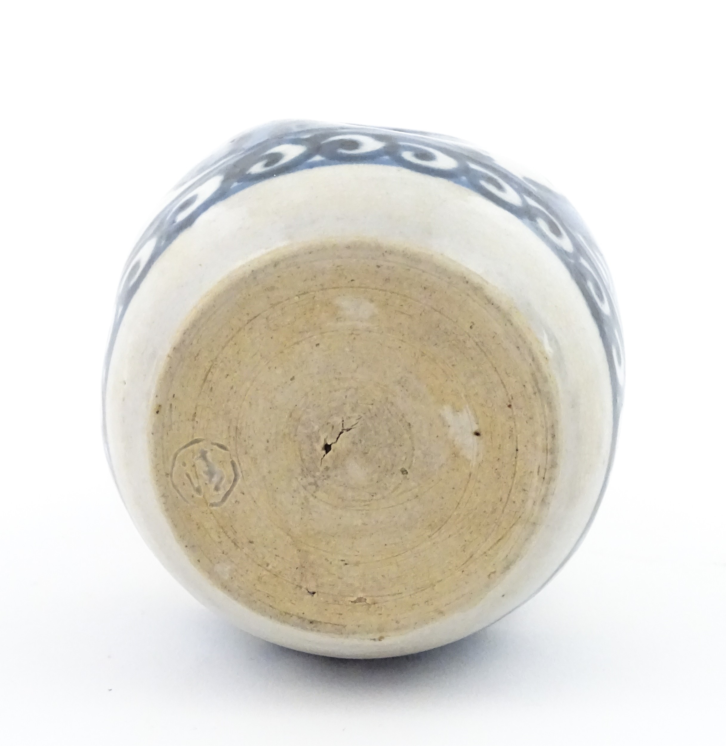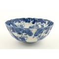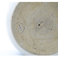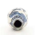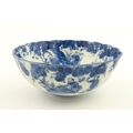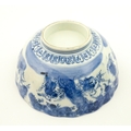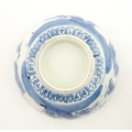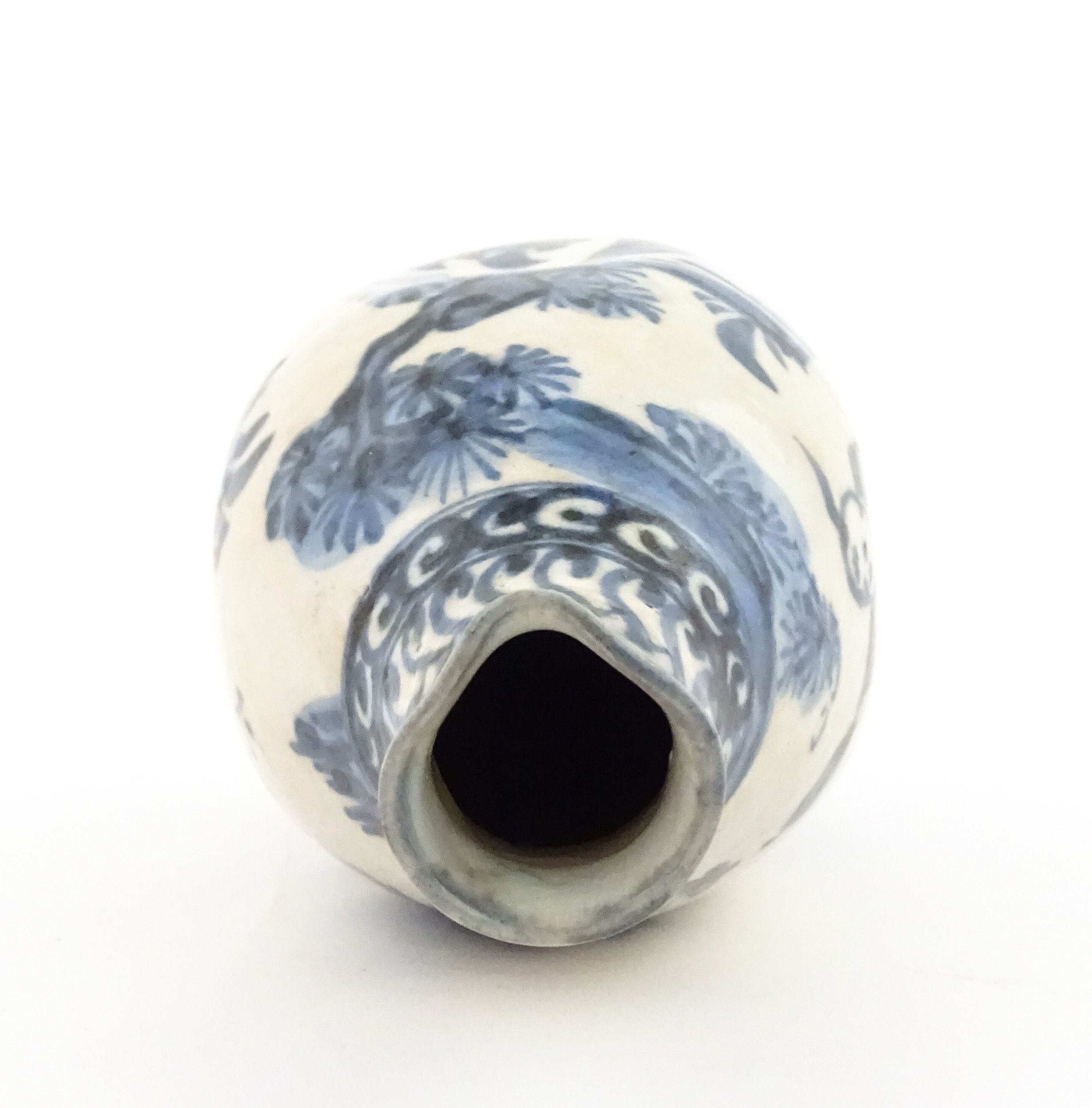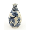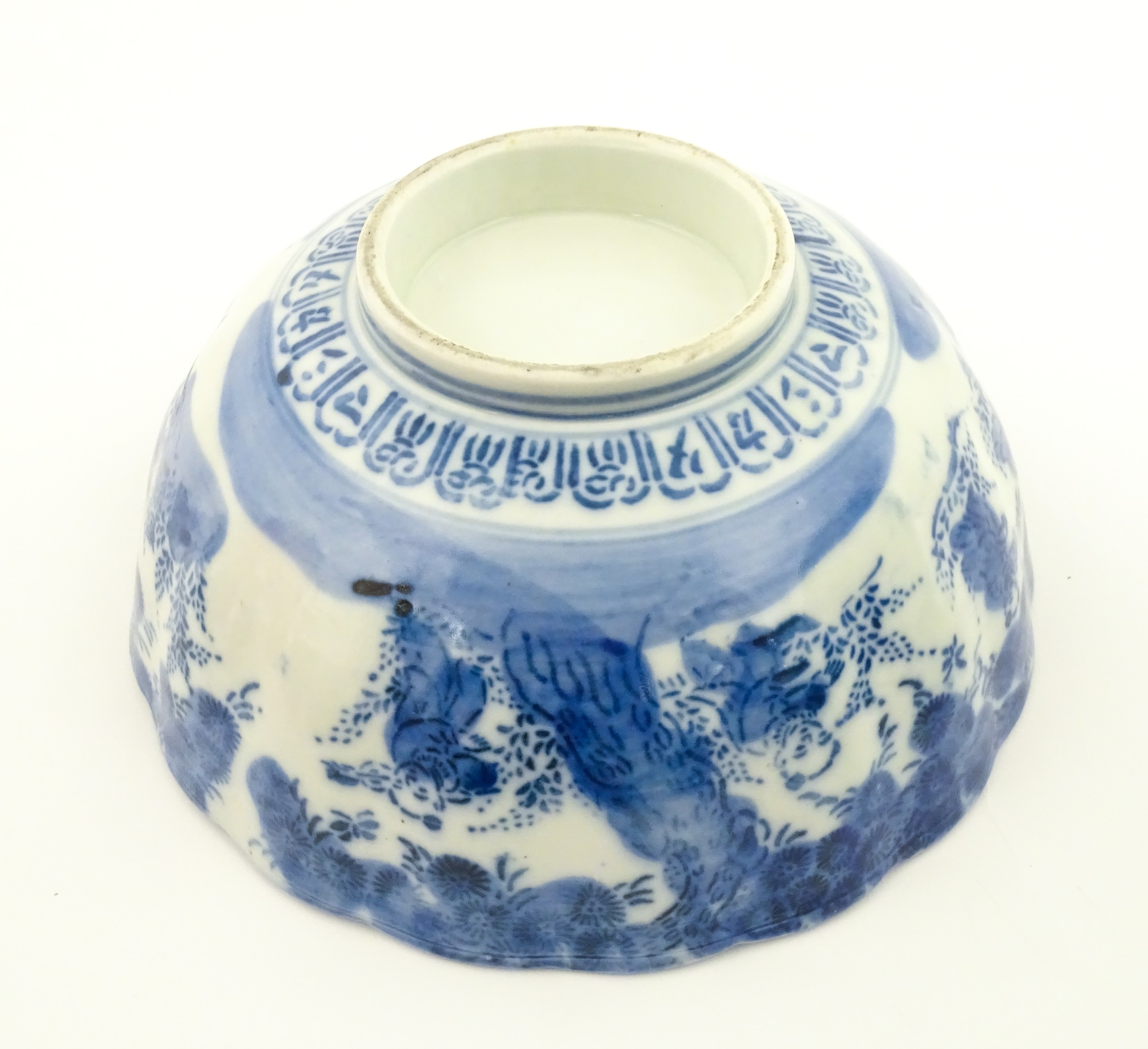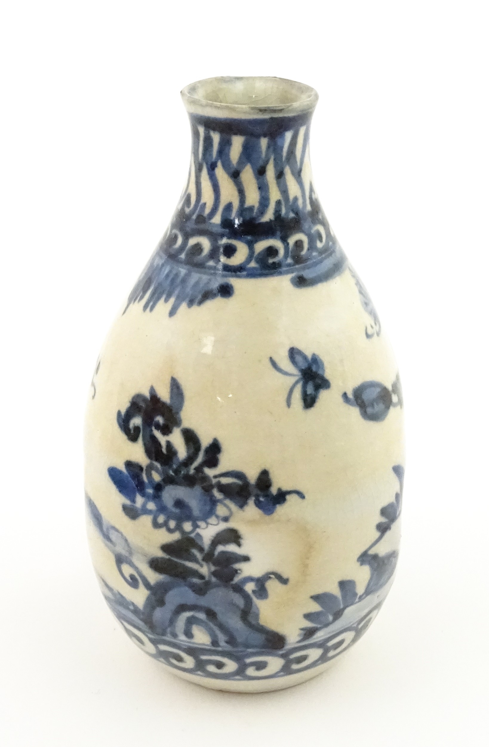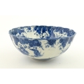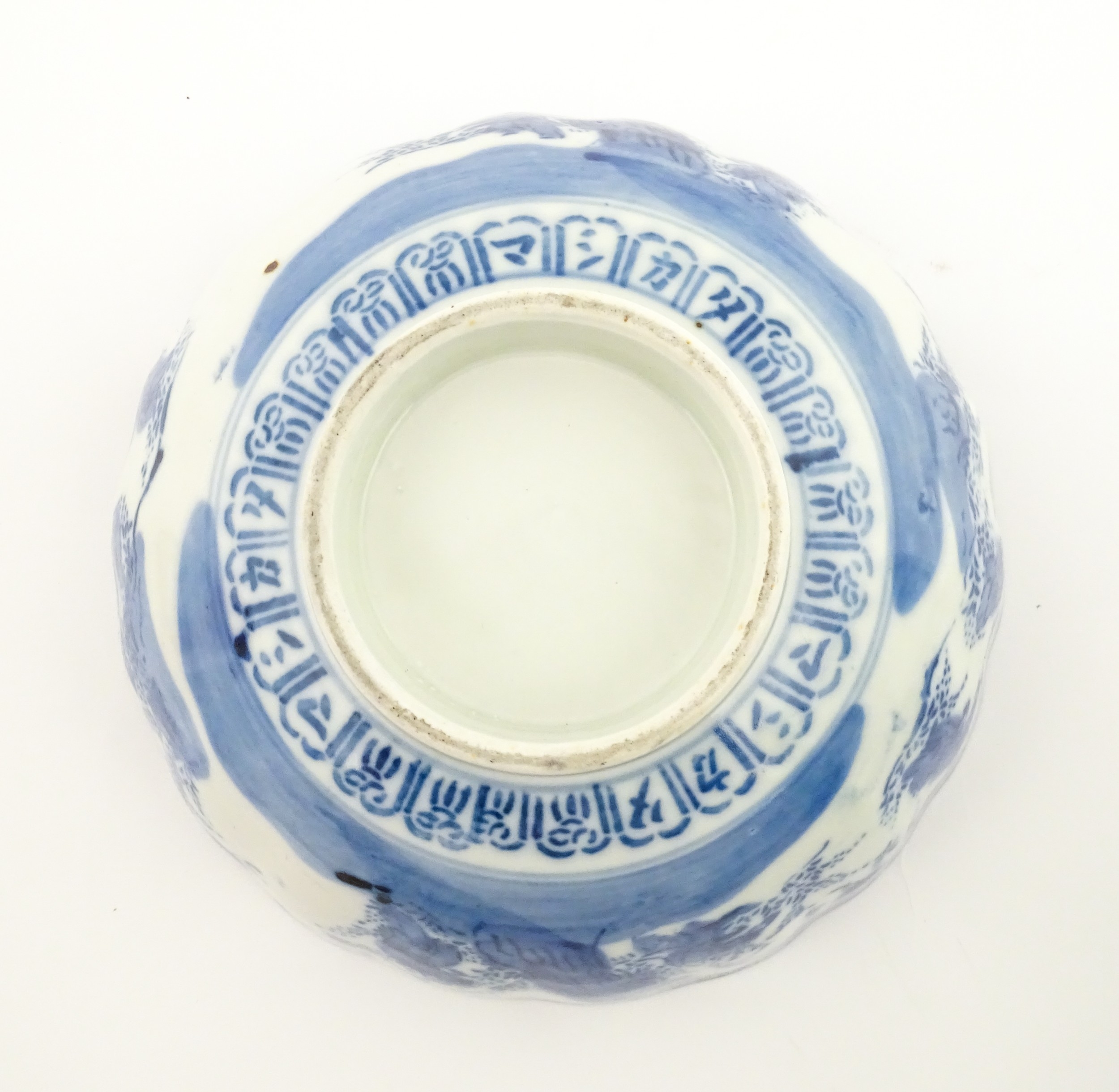 A Chinese blue and white bottle vase with pinch detail decorated with a figure in a landscape. Together with a Japanese blue and white bowl decorated with figures and flowers. Bowl approx. 4" high x 9 1/2" diameter (2)