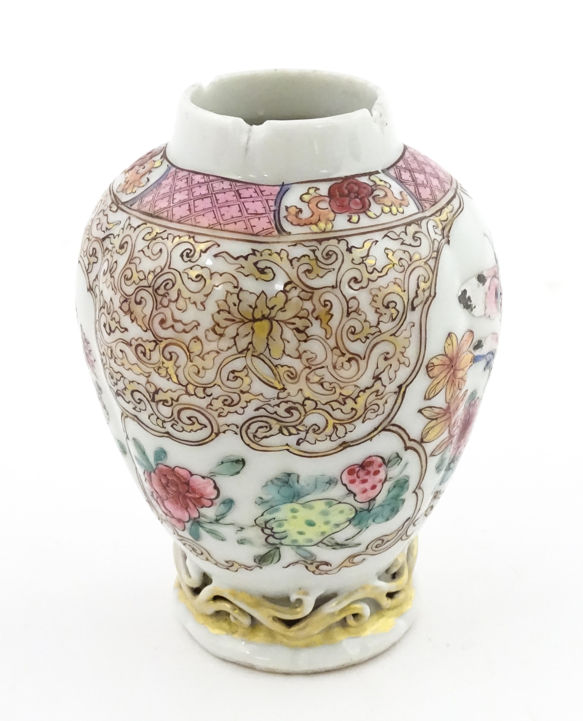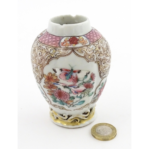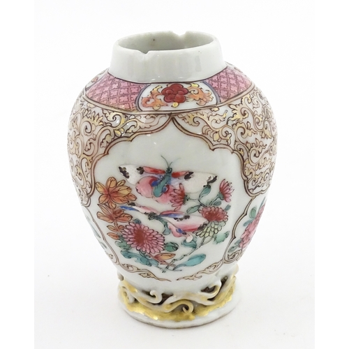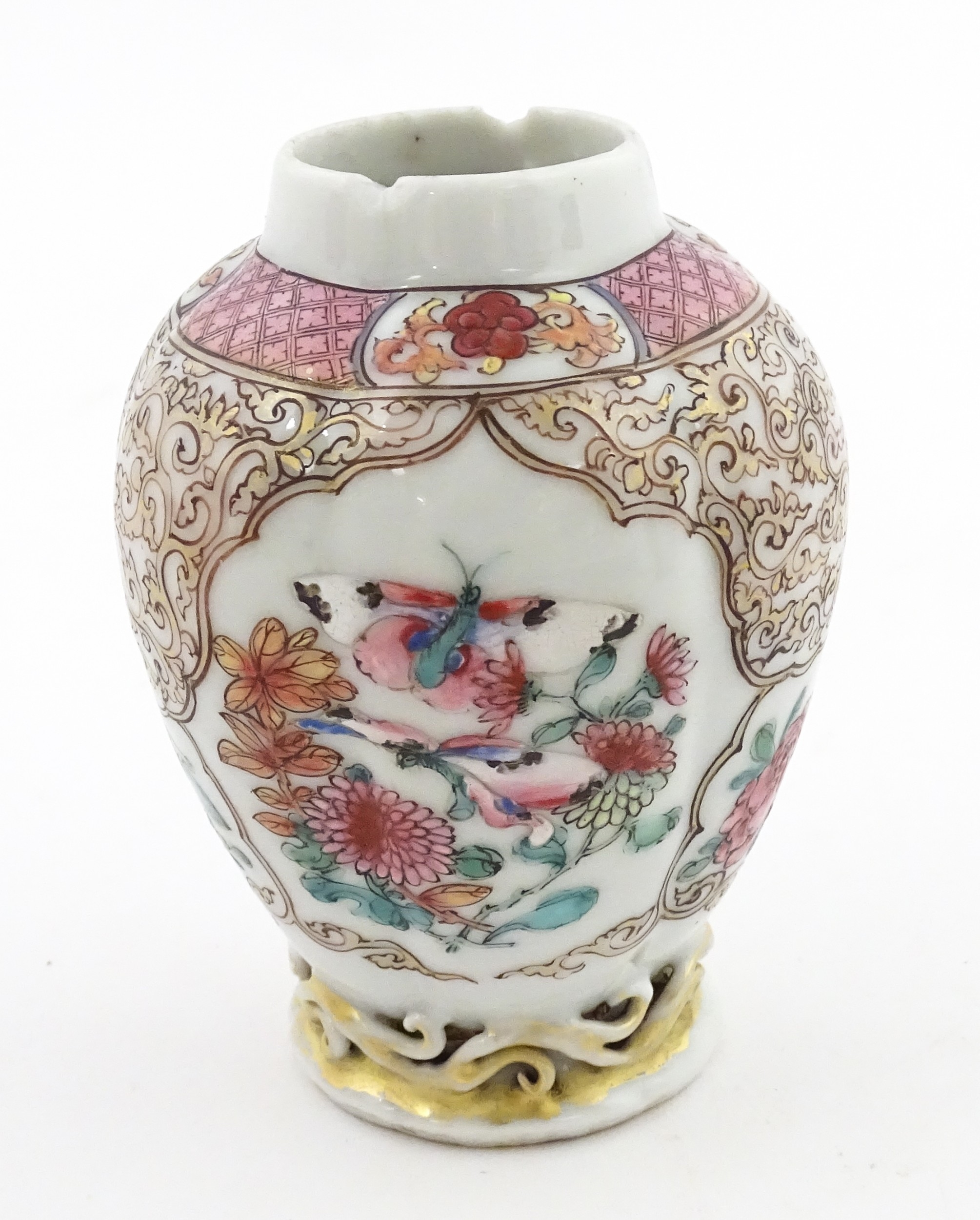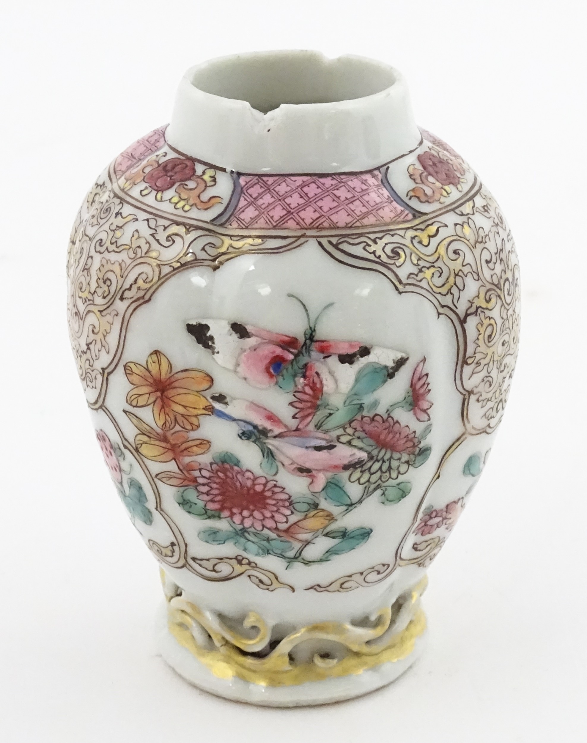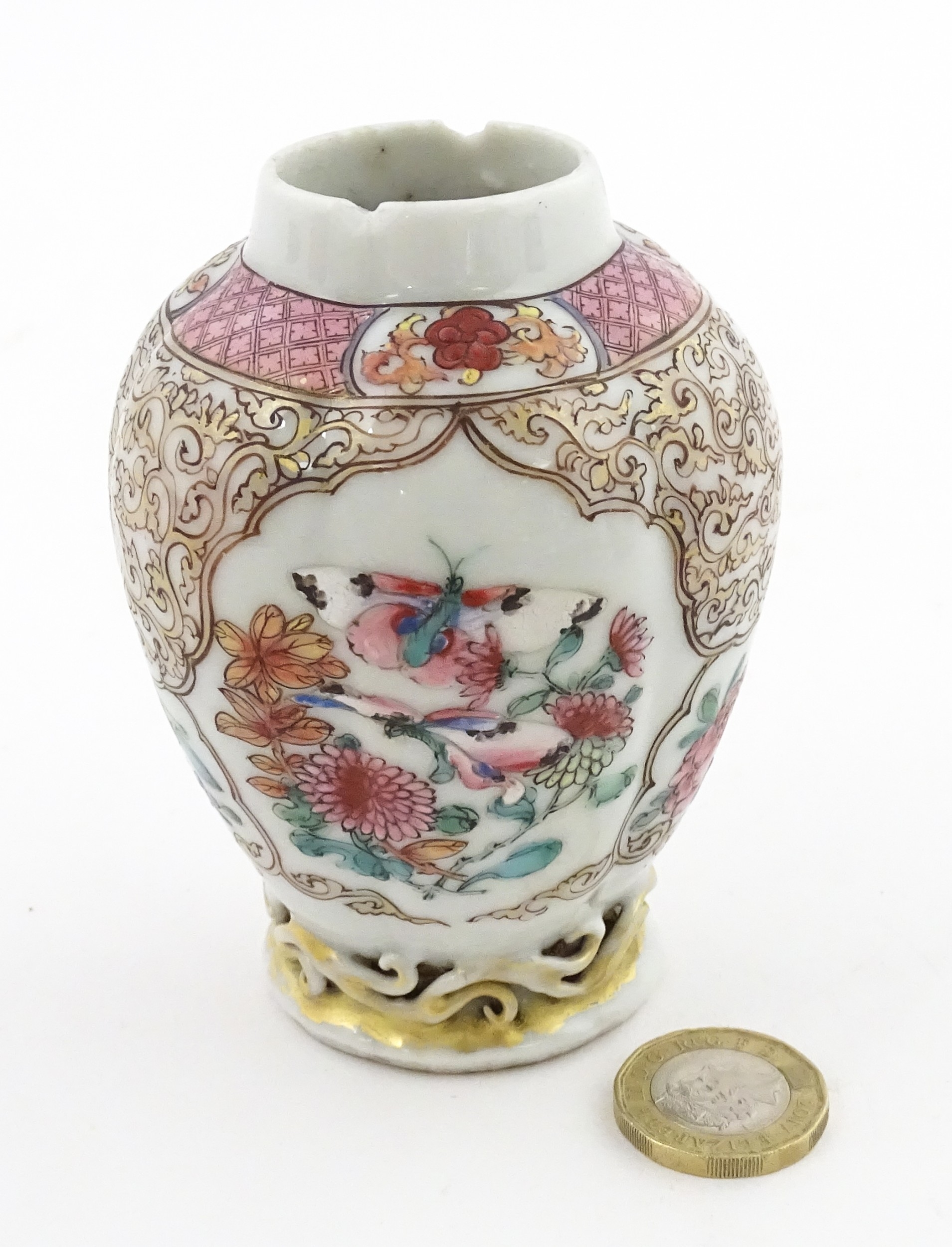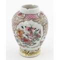 A small Chinese famille rose vase decorated with flowers and butterflies. Approx. 4" high