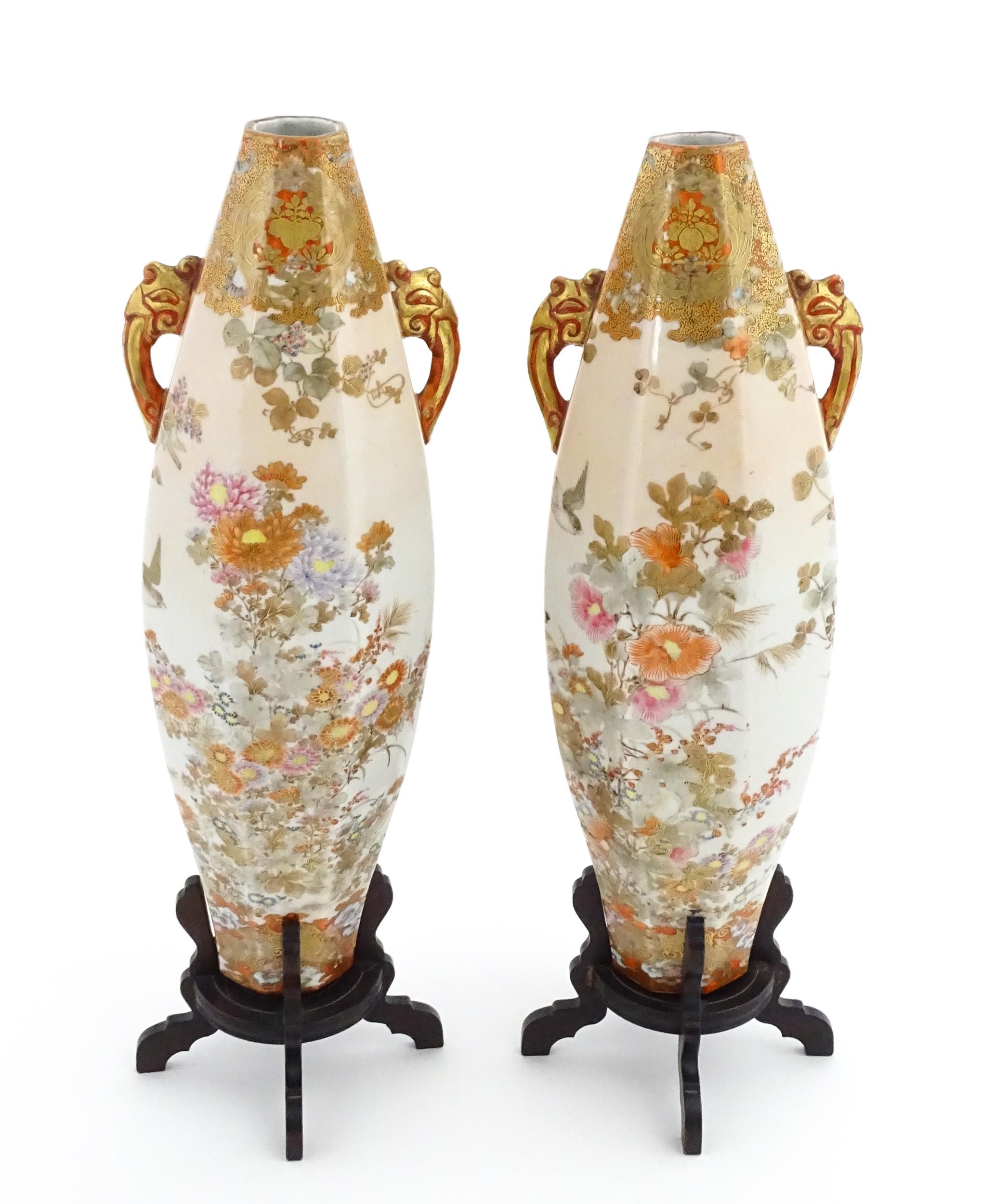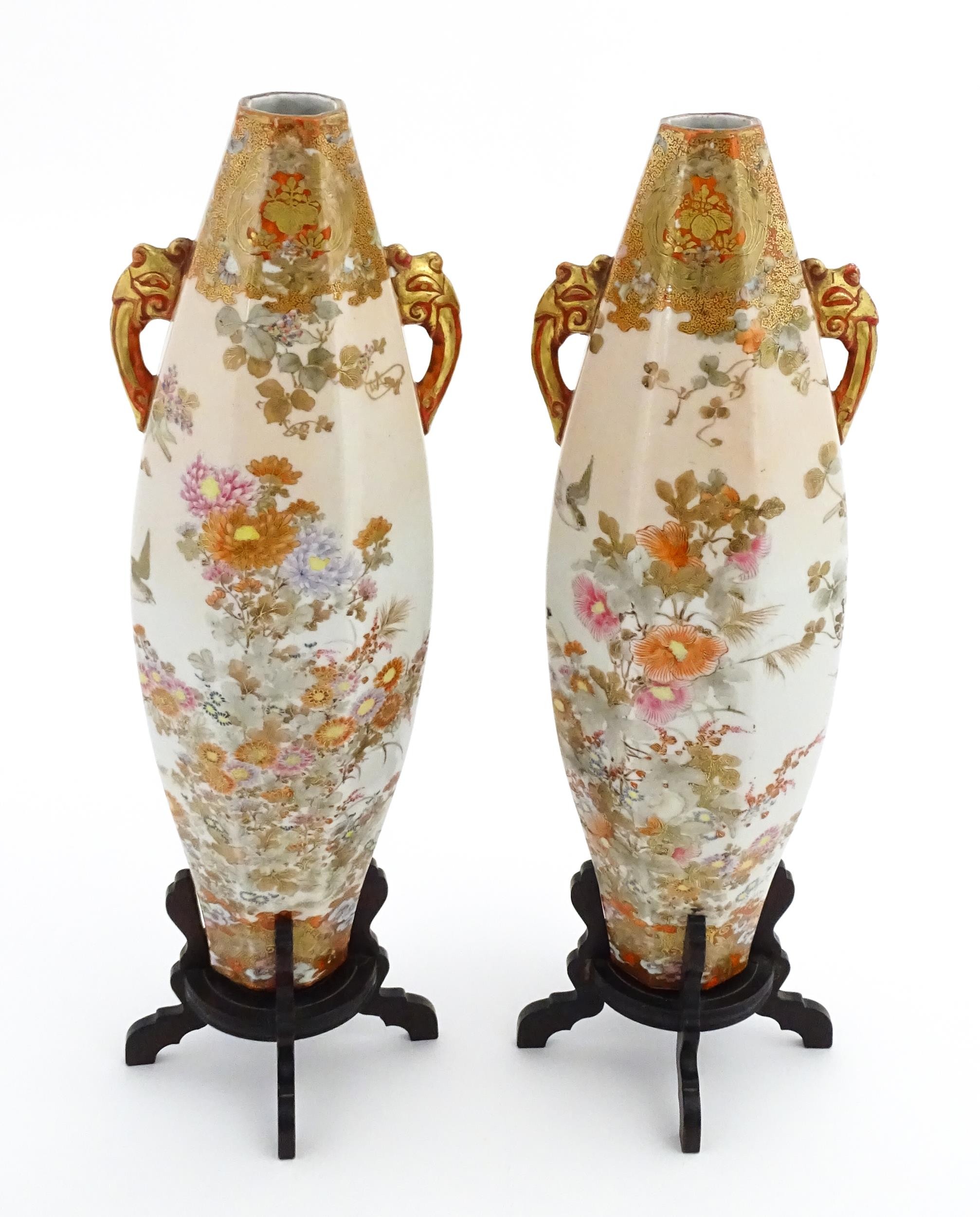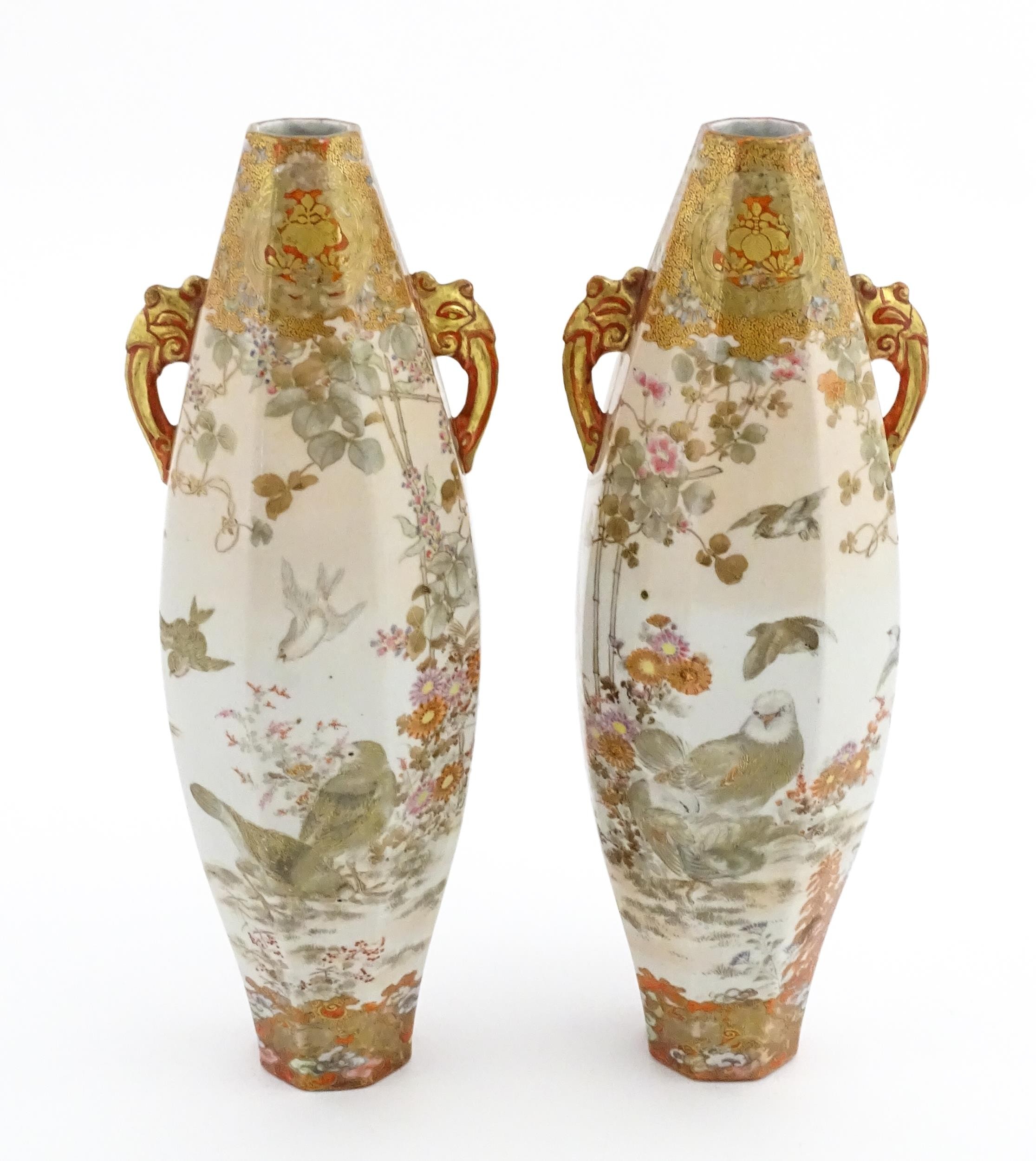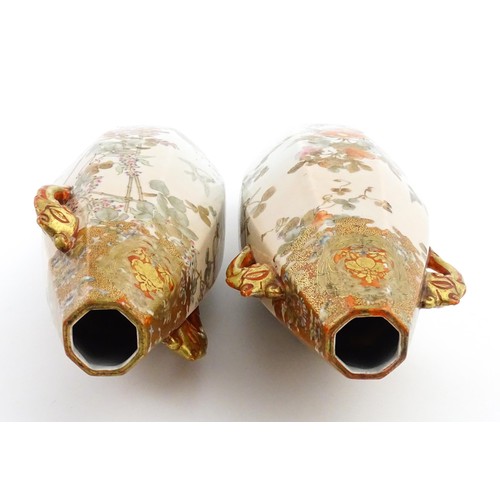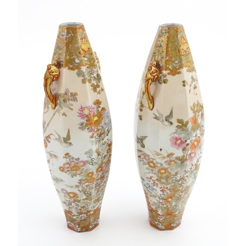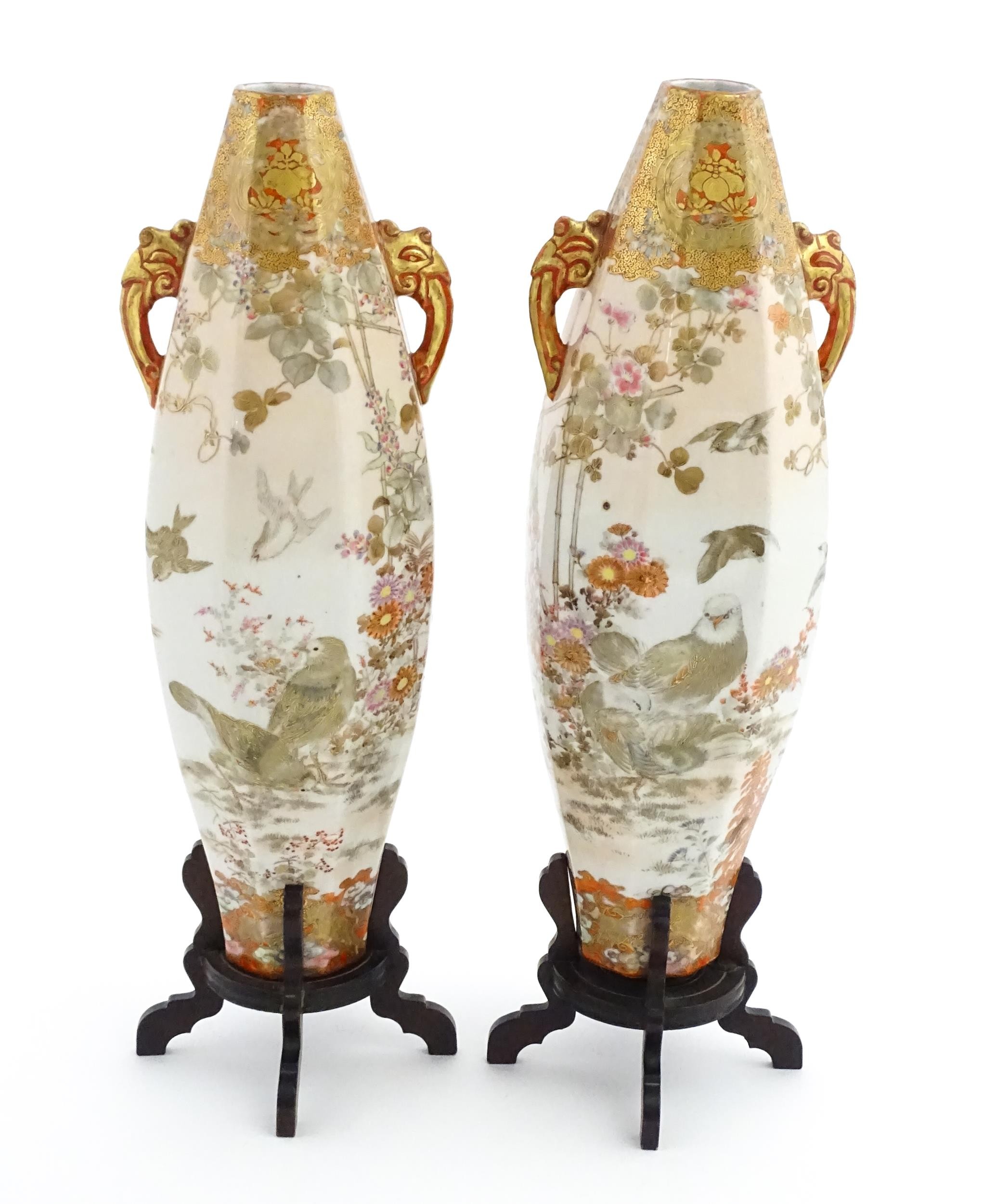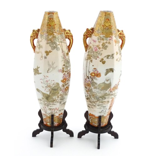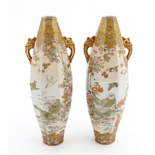 A pair of Japanese Satsuma vases with twin handles of octagonal, elongated form, decorated with birds, flowers, and foliage. Character marks under. Approx. 12 1/4" high (excluding stands) (2)