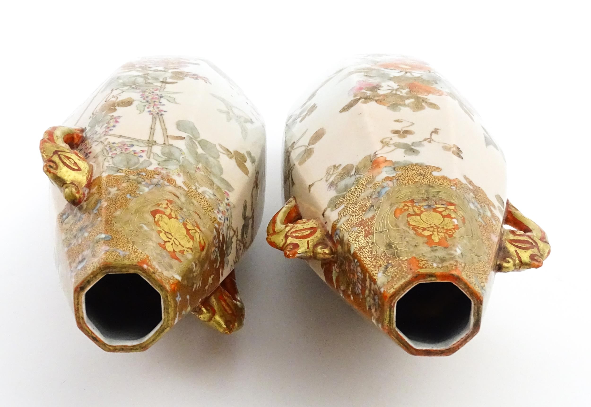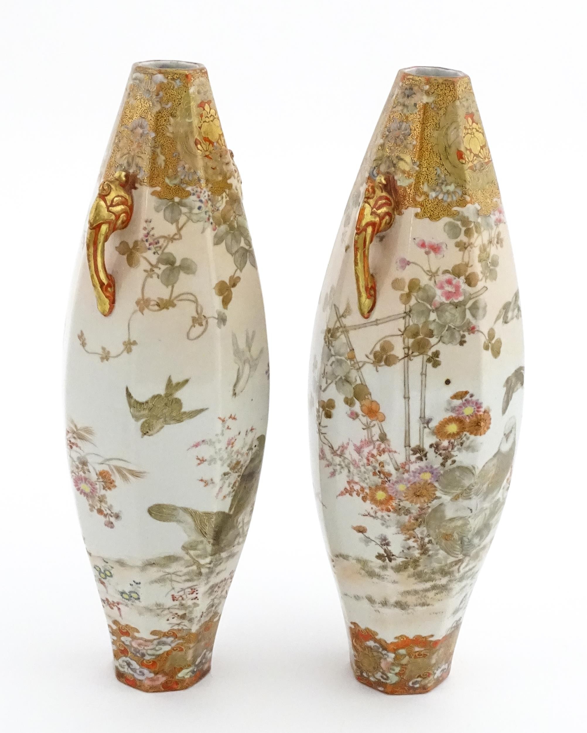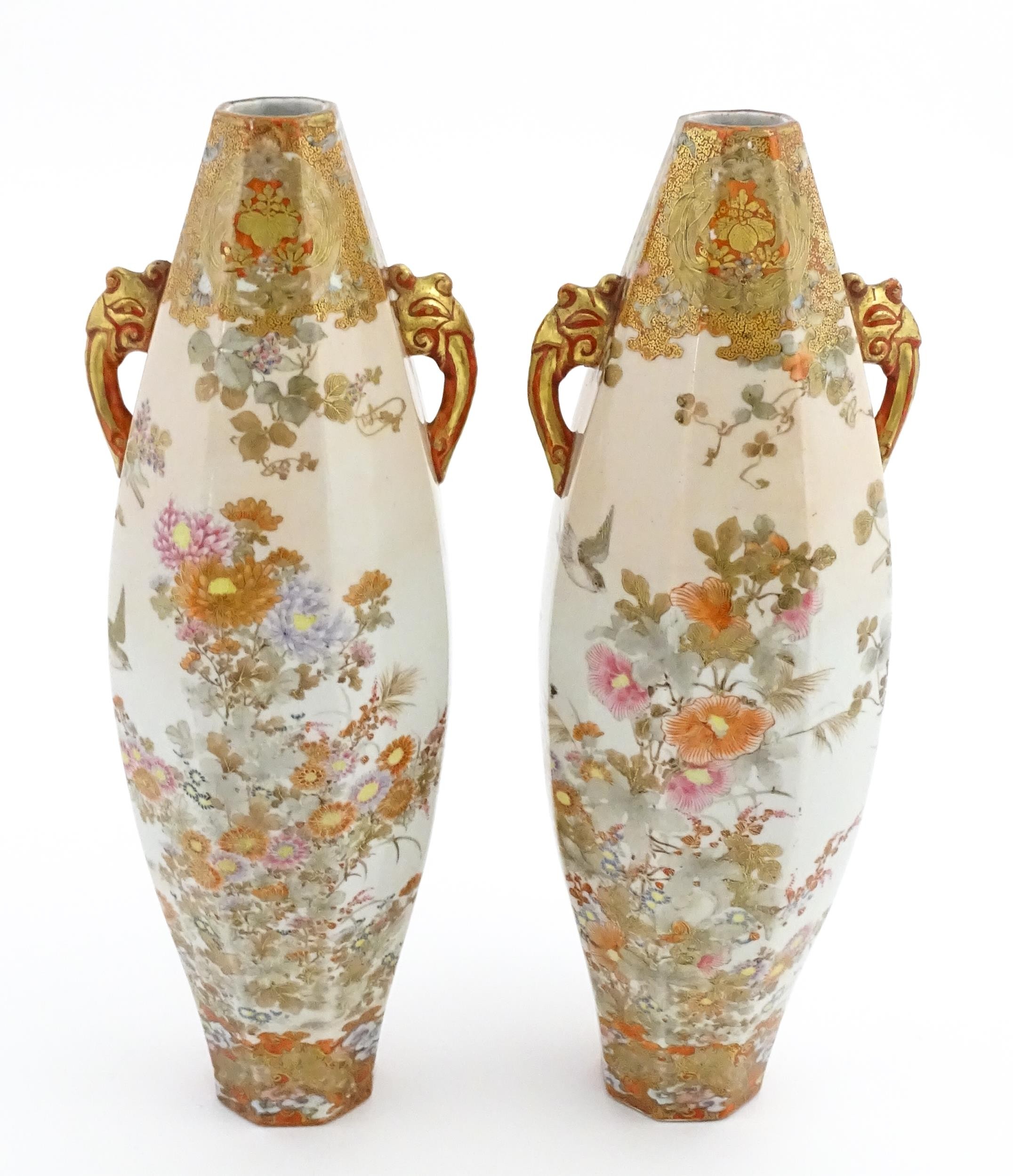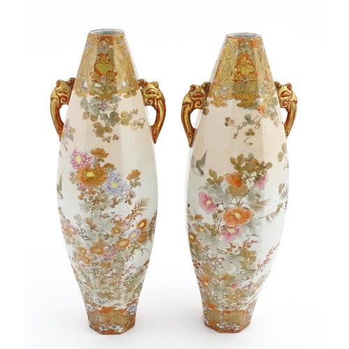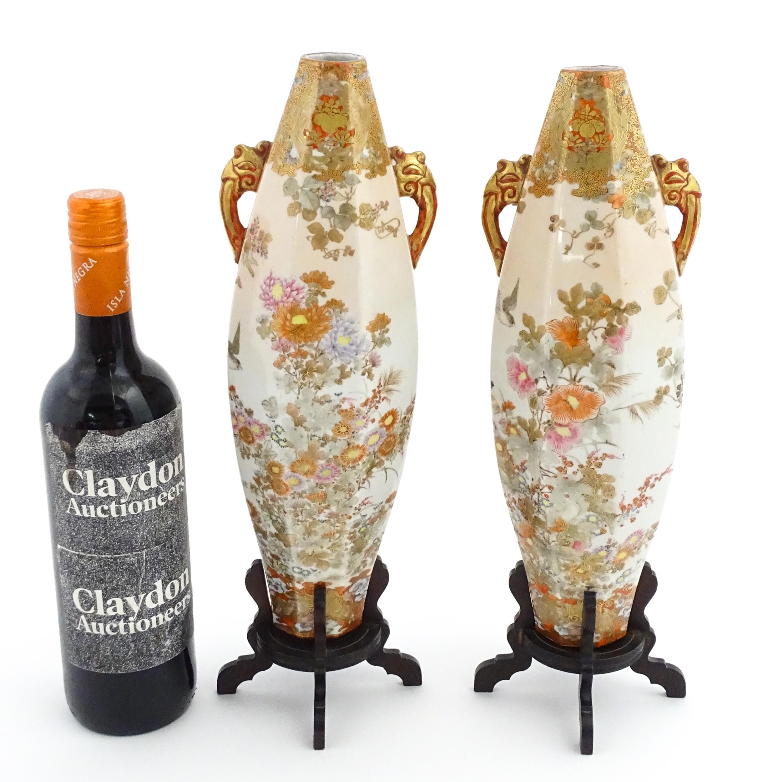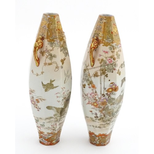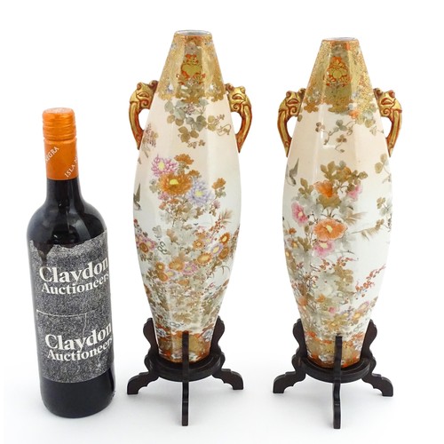 A pair of Japanese Satsuma vases with twin handles of octagonal, elongated form, decorated with birds, flowers, and foliage. Character marks under. Approx. 12 1/4" high (excluding stands) (2)