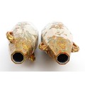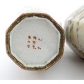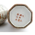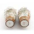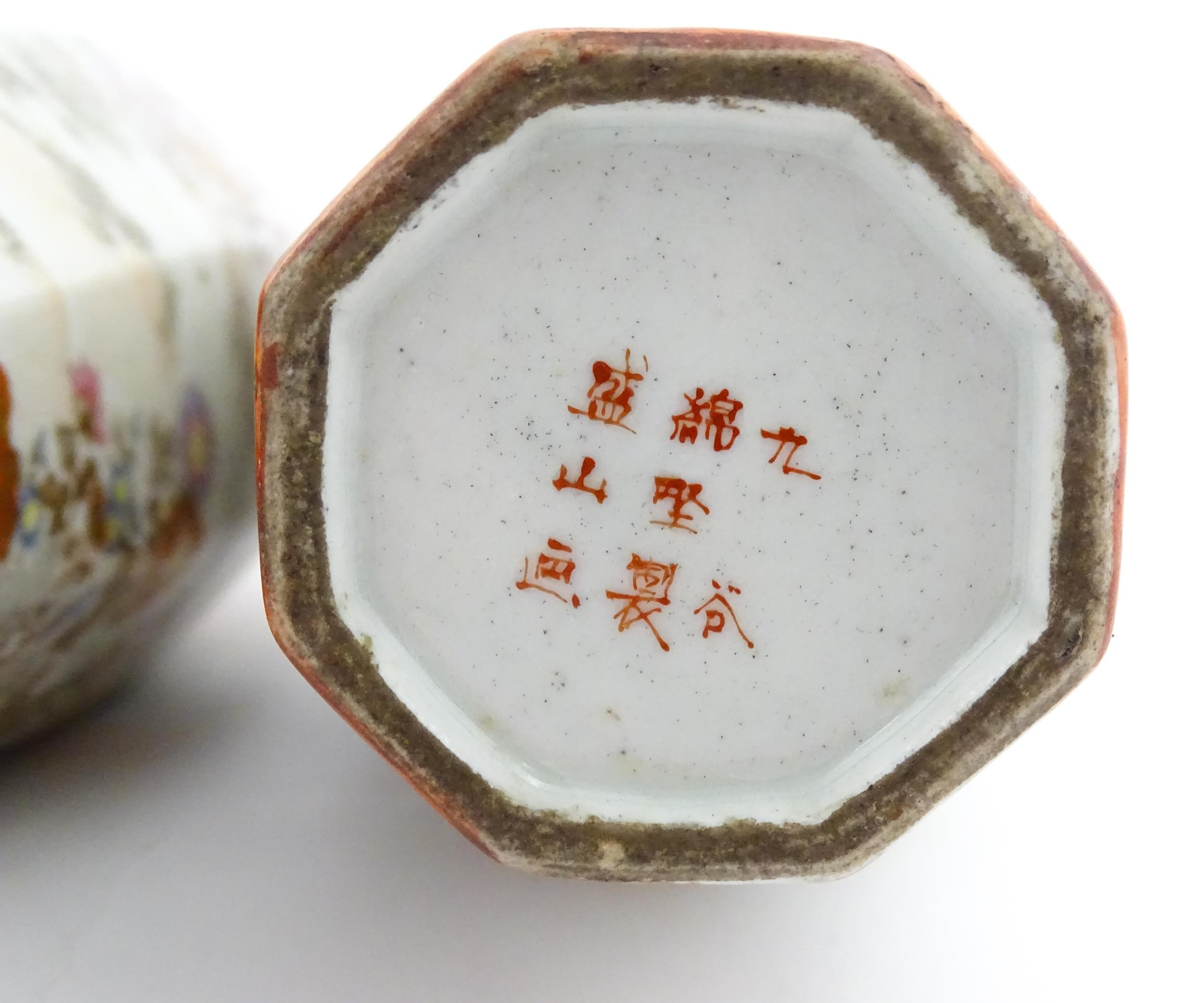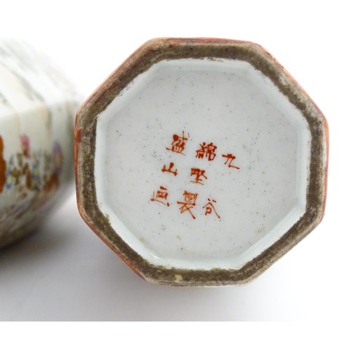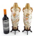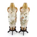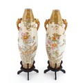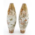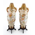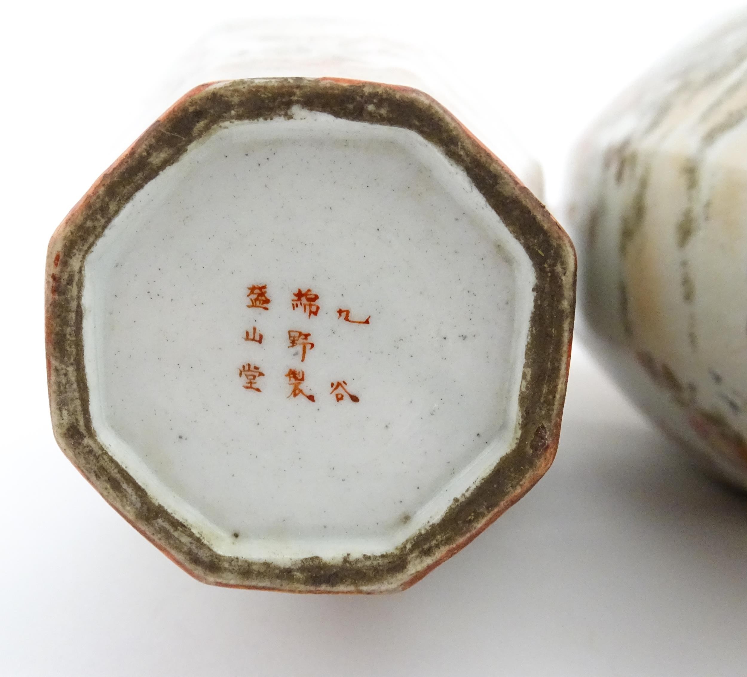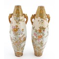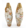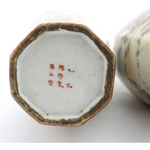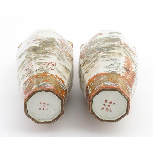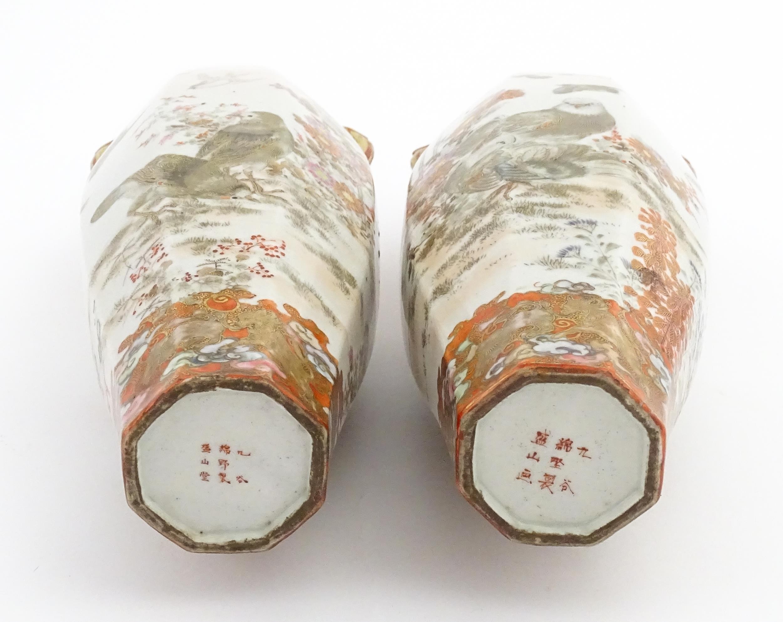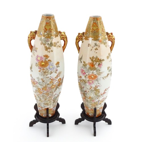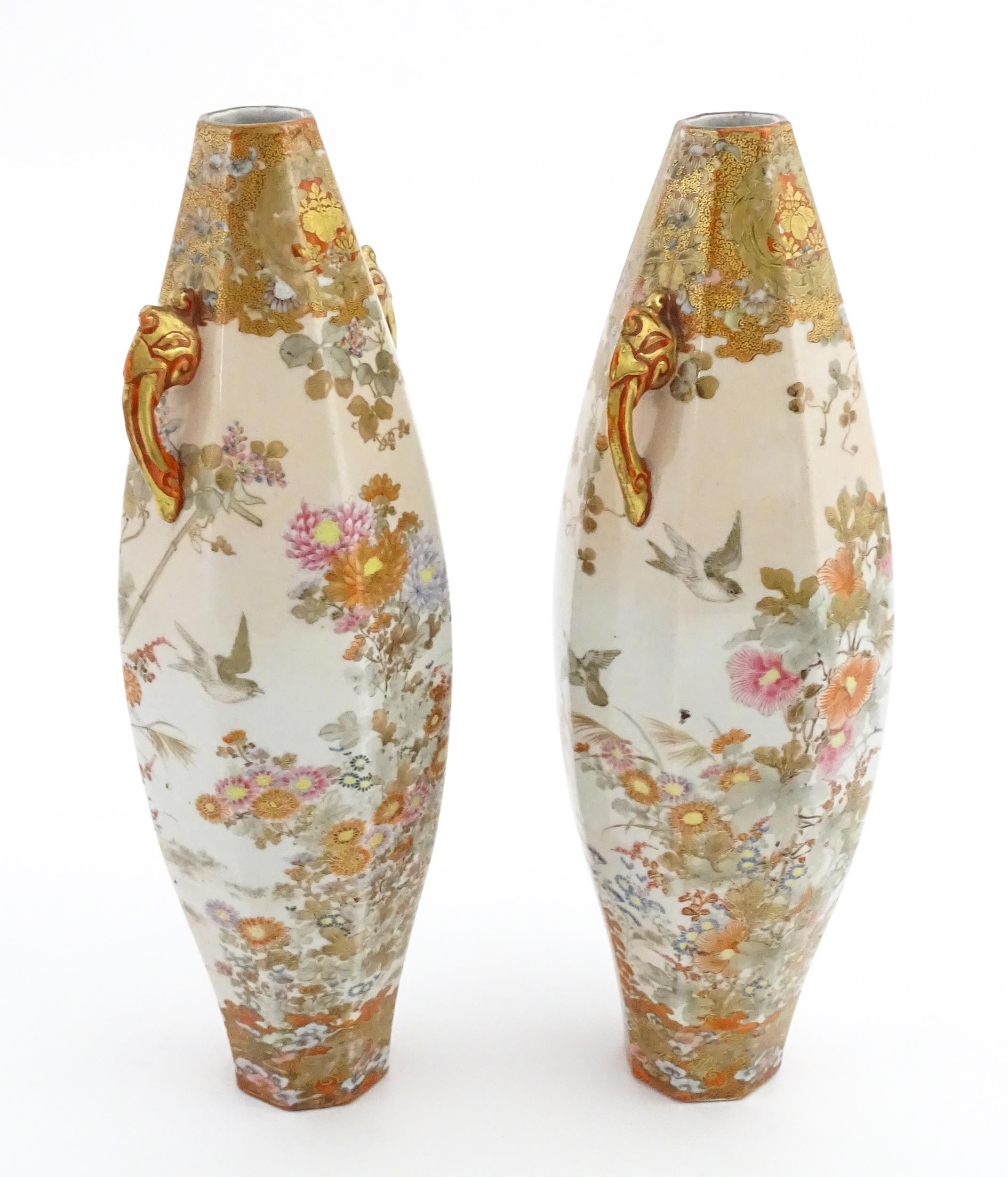 A pair of Japanese Satsuma vases with twin handles of octagonal, elongated form, decorated with birds, flowers, and foliage. Character marks under. Approx. 12 1/4" high (excluding stands) (2)