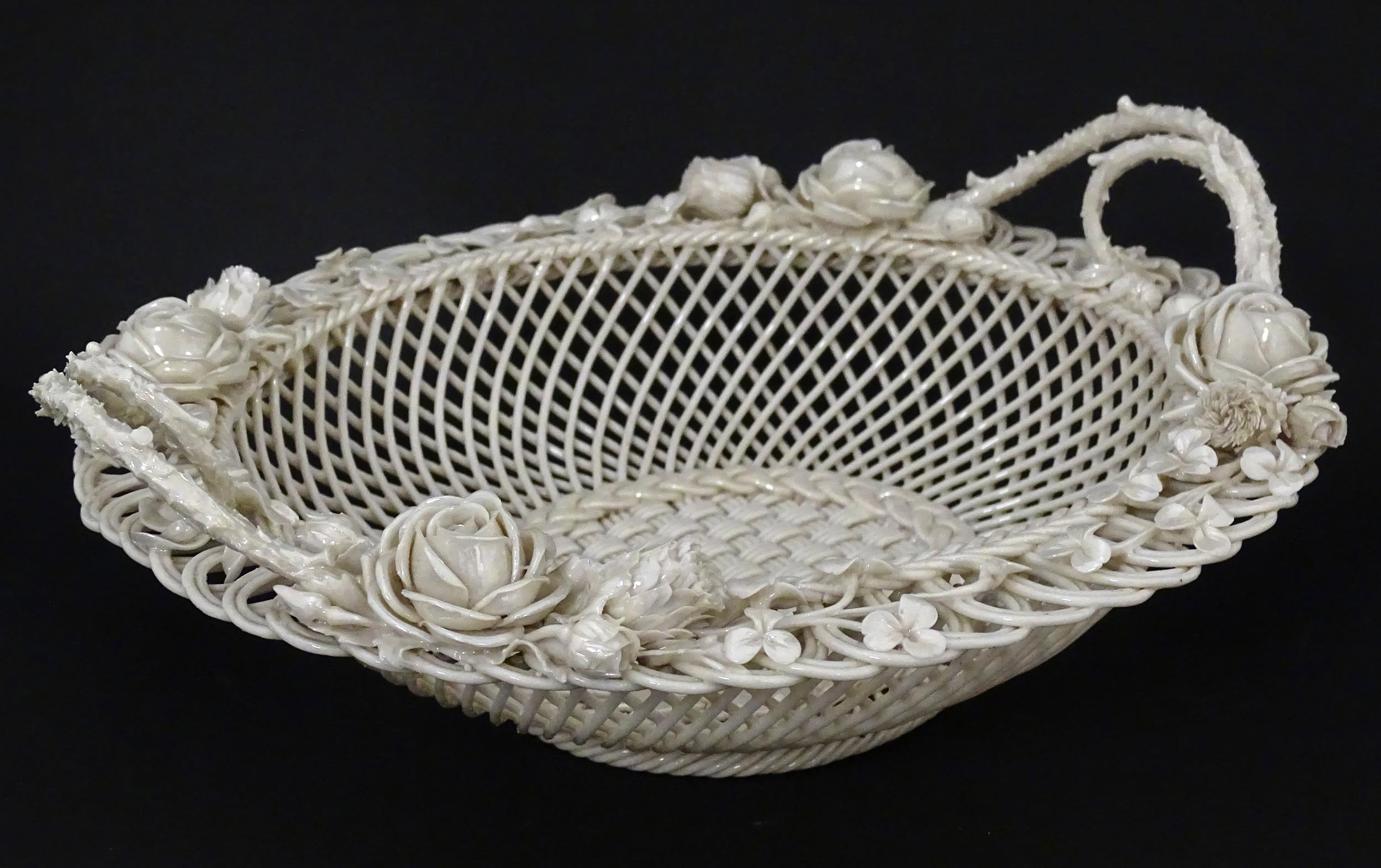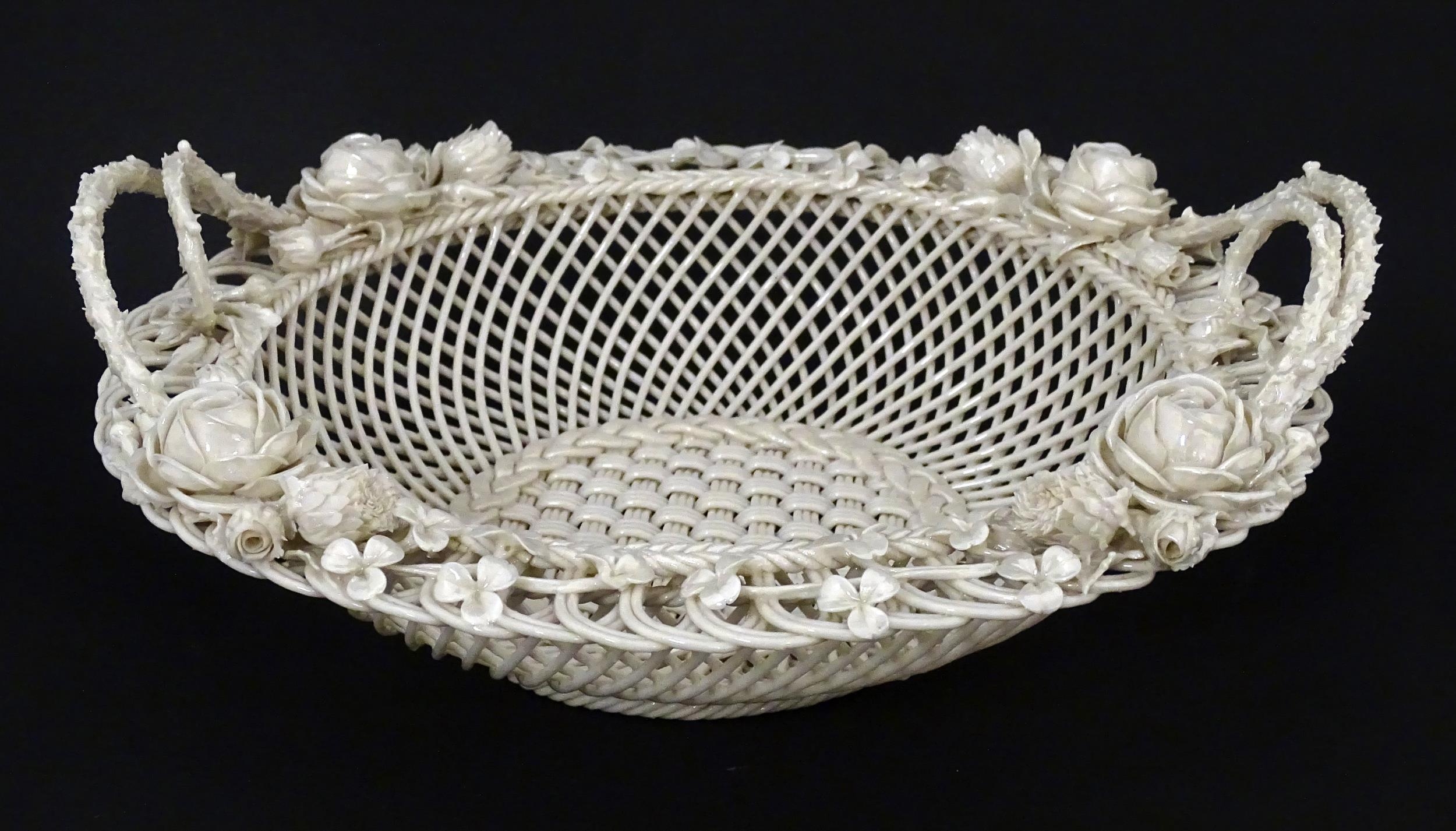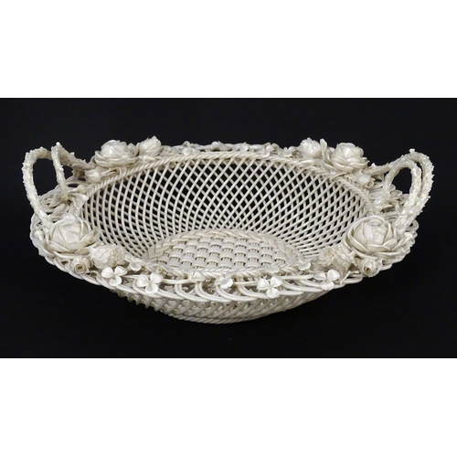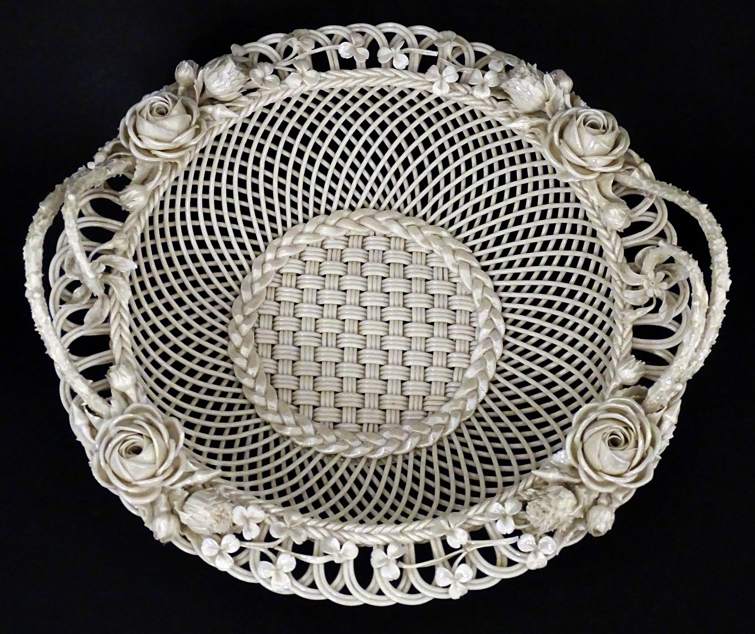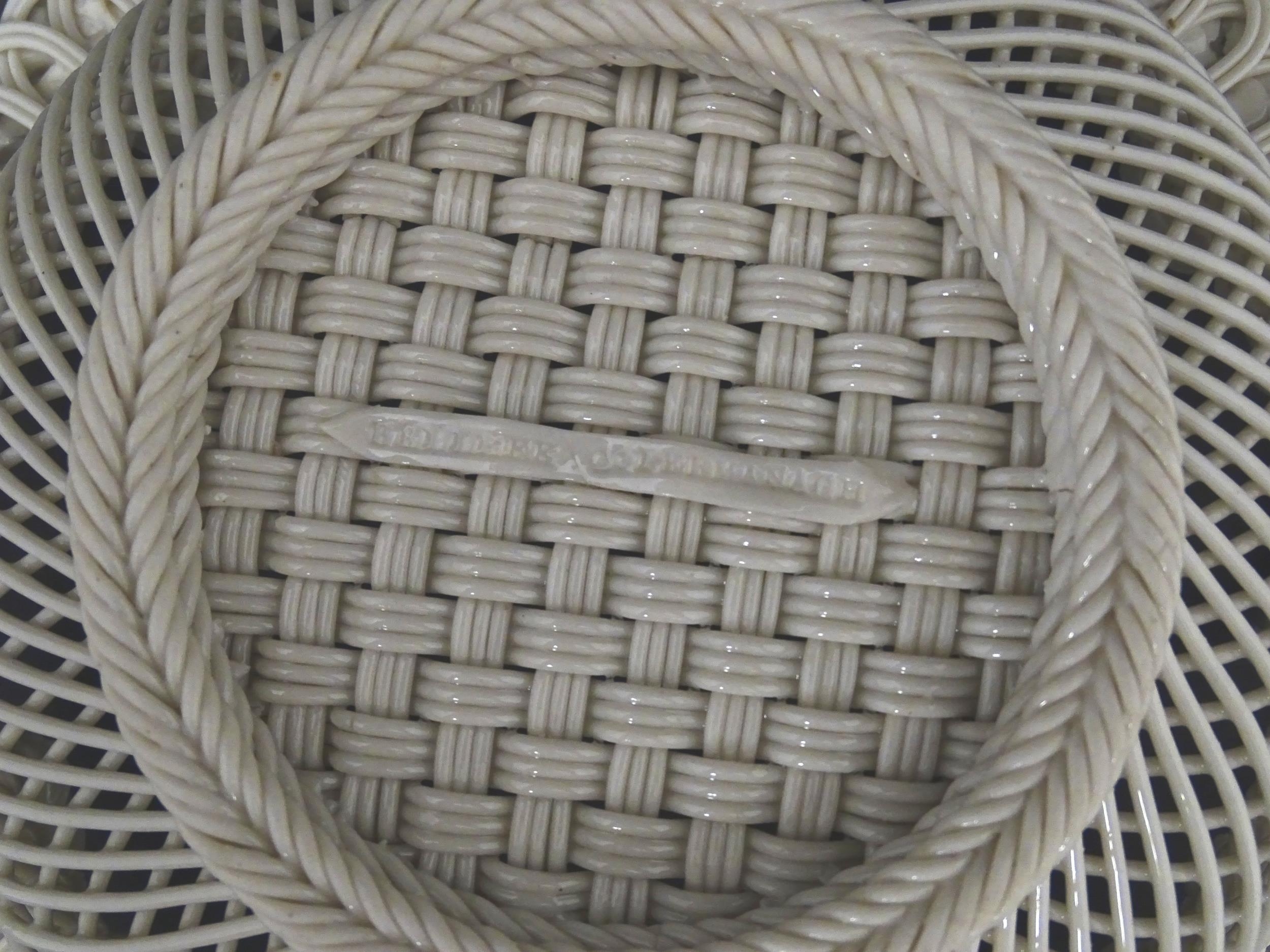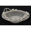 A Belleek three strand Sydenham Twig basket having lattice work with ribbon edges, decorated with flowers and foliage. Impressed with First Period mark under. Approx. 10" wide