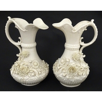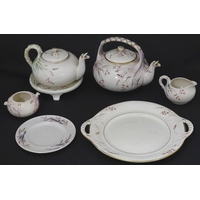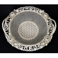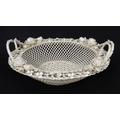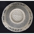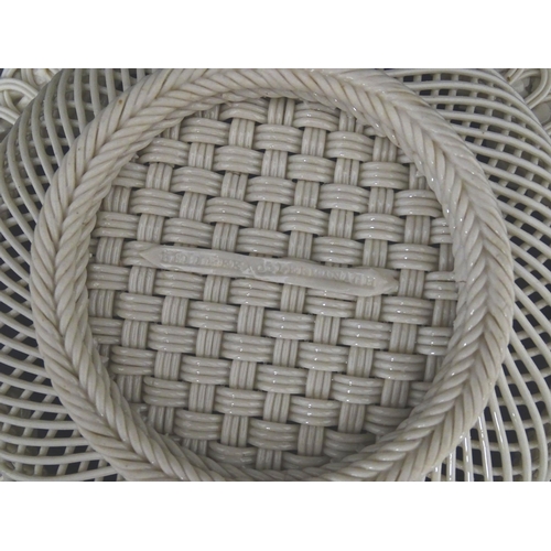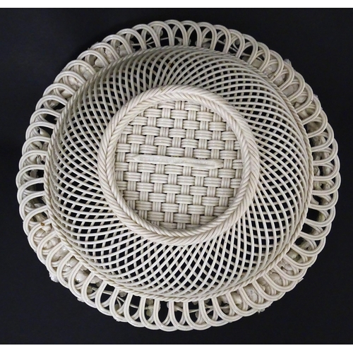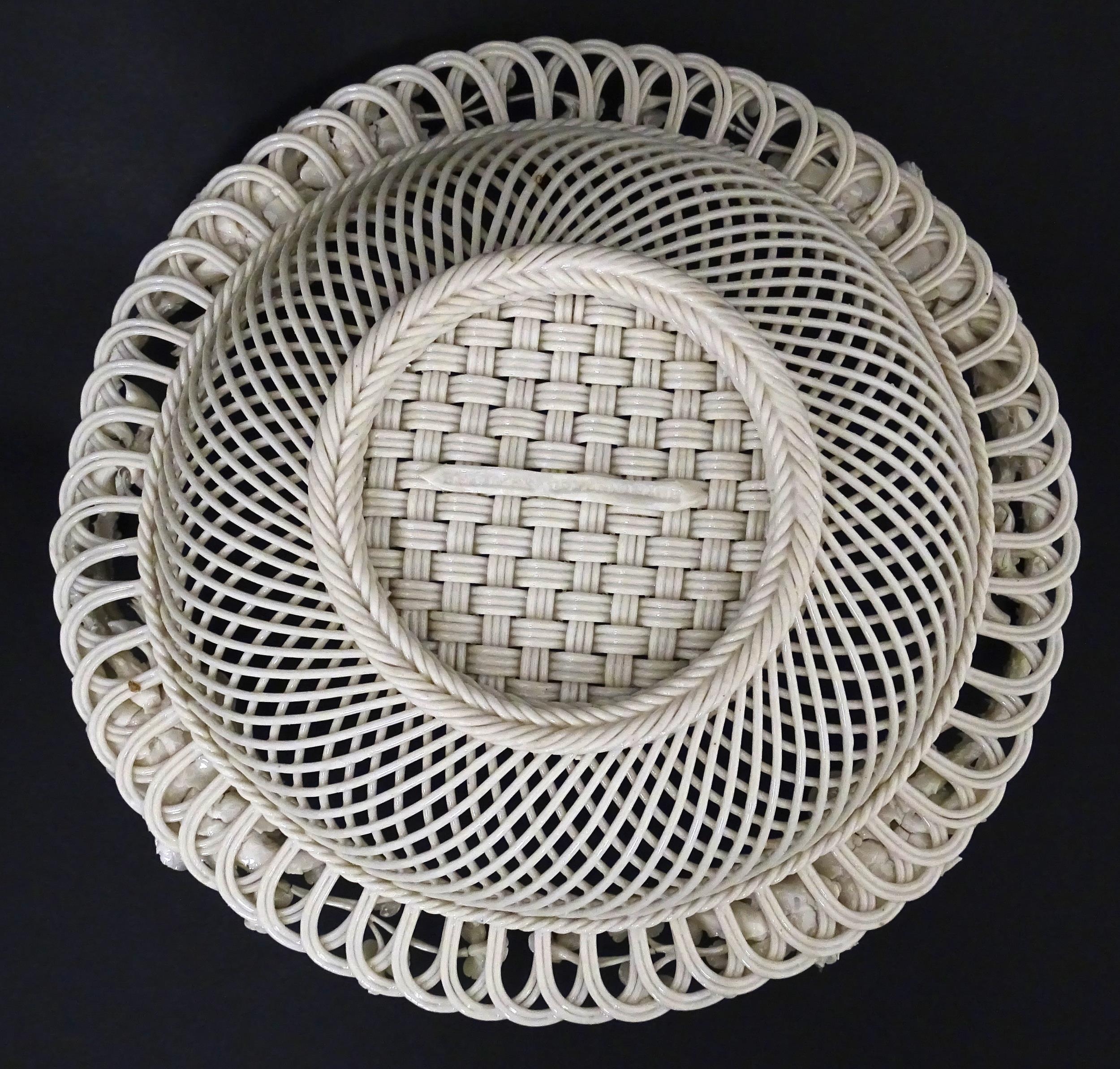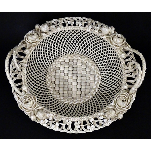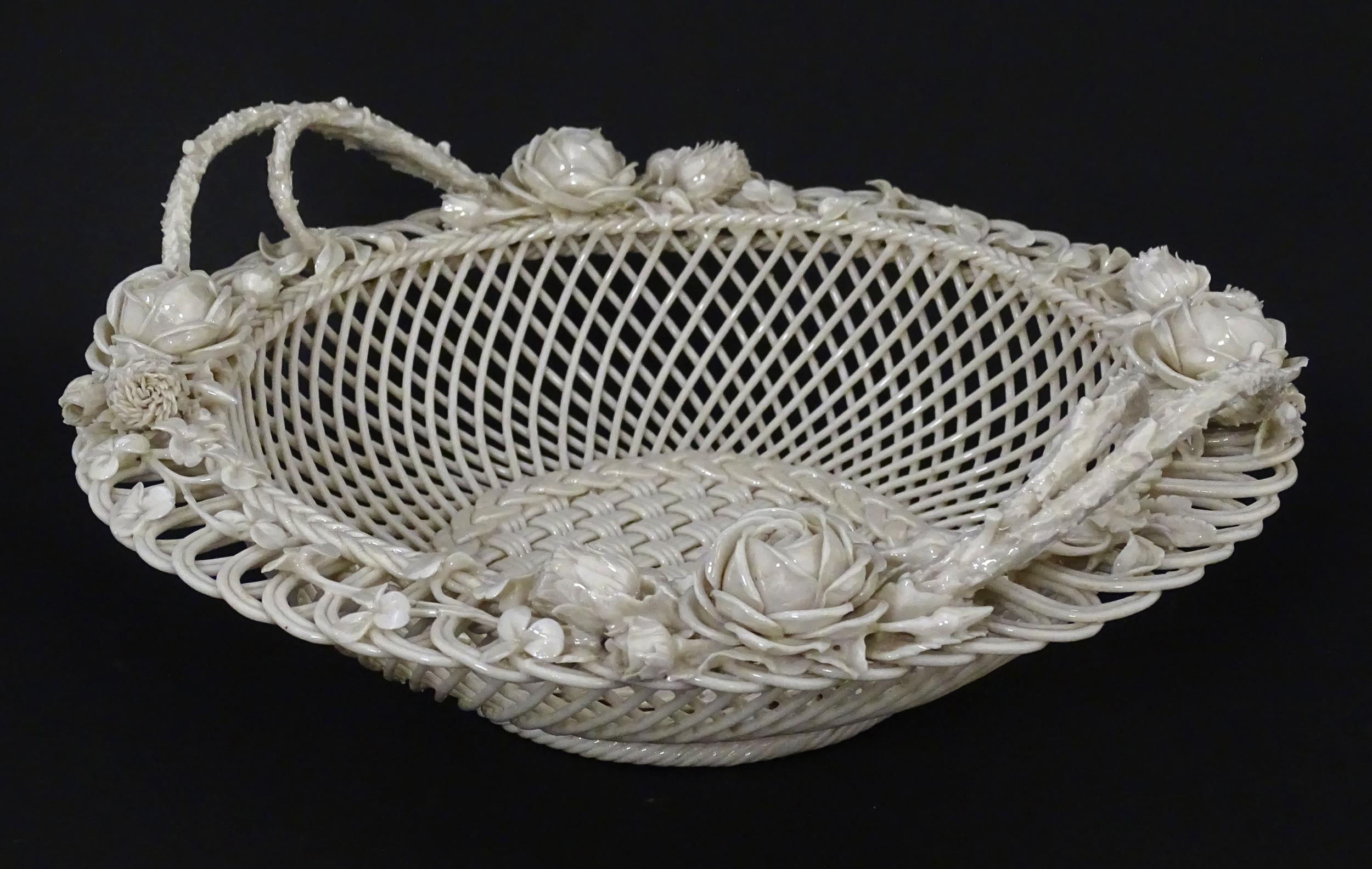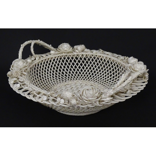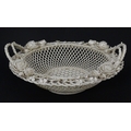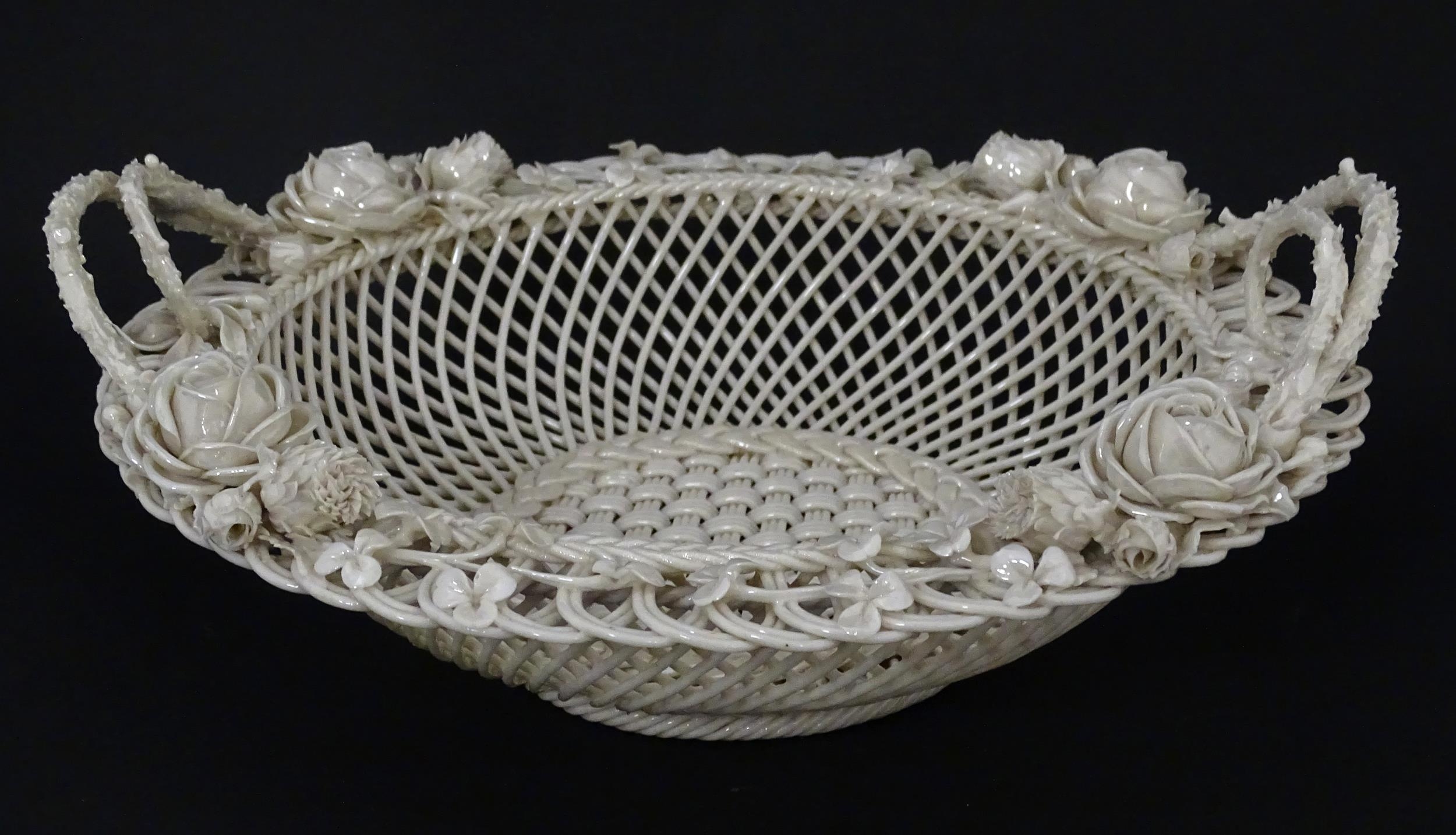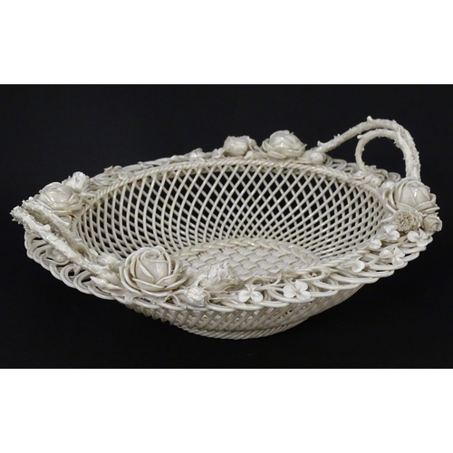 A Belleek three strand Sydenham Twig basket having lattice work with ribbon edges, decorated with flowers and foliage. Impressed with First Period mark under. Approx. 10" wide