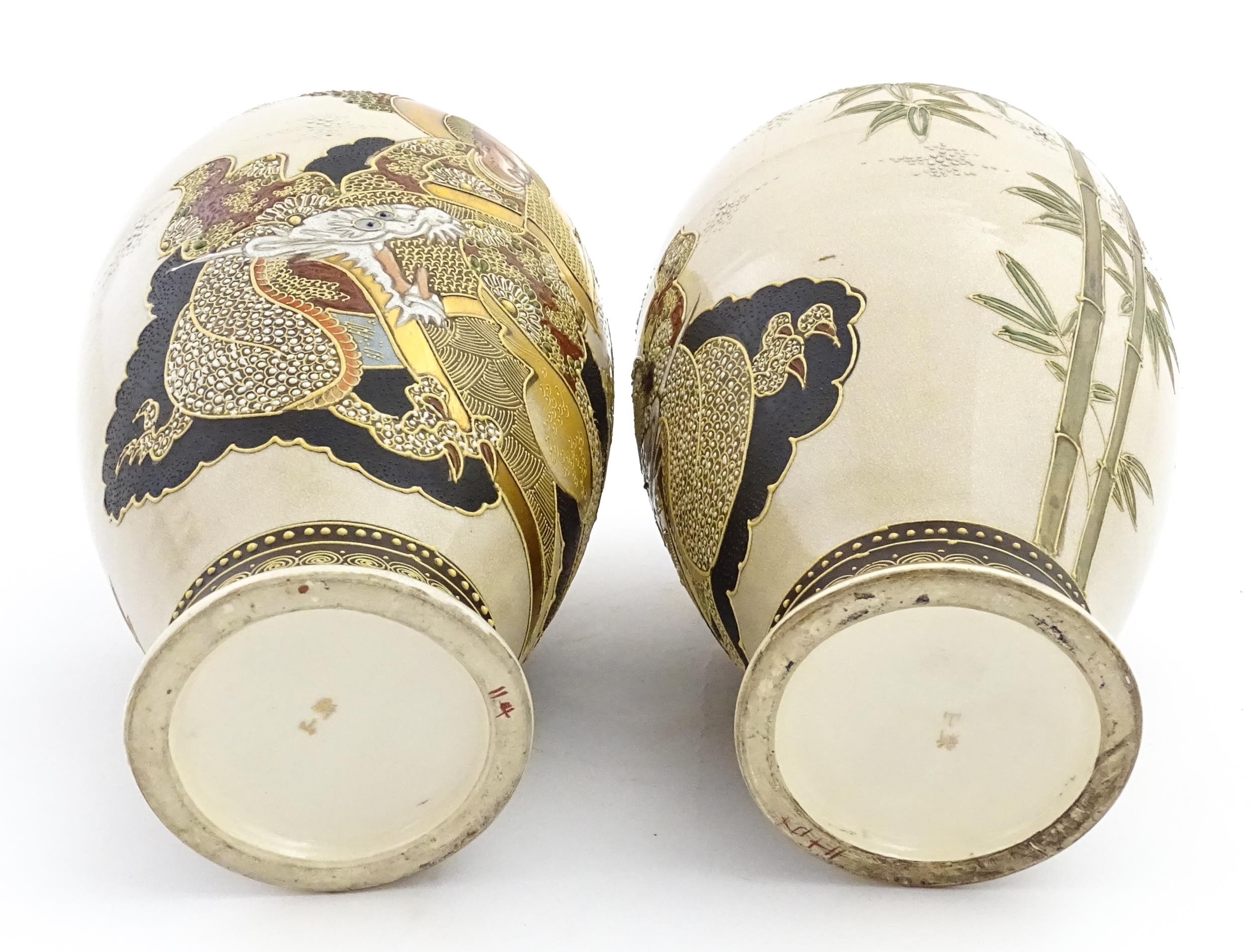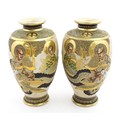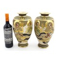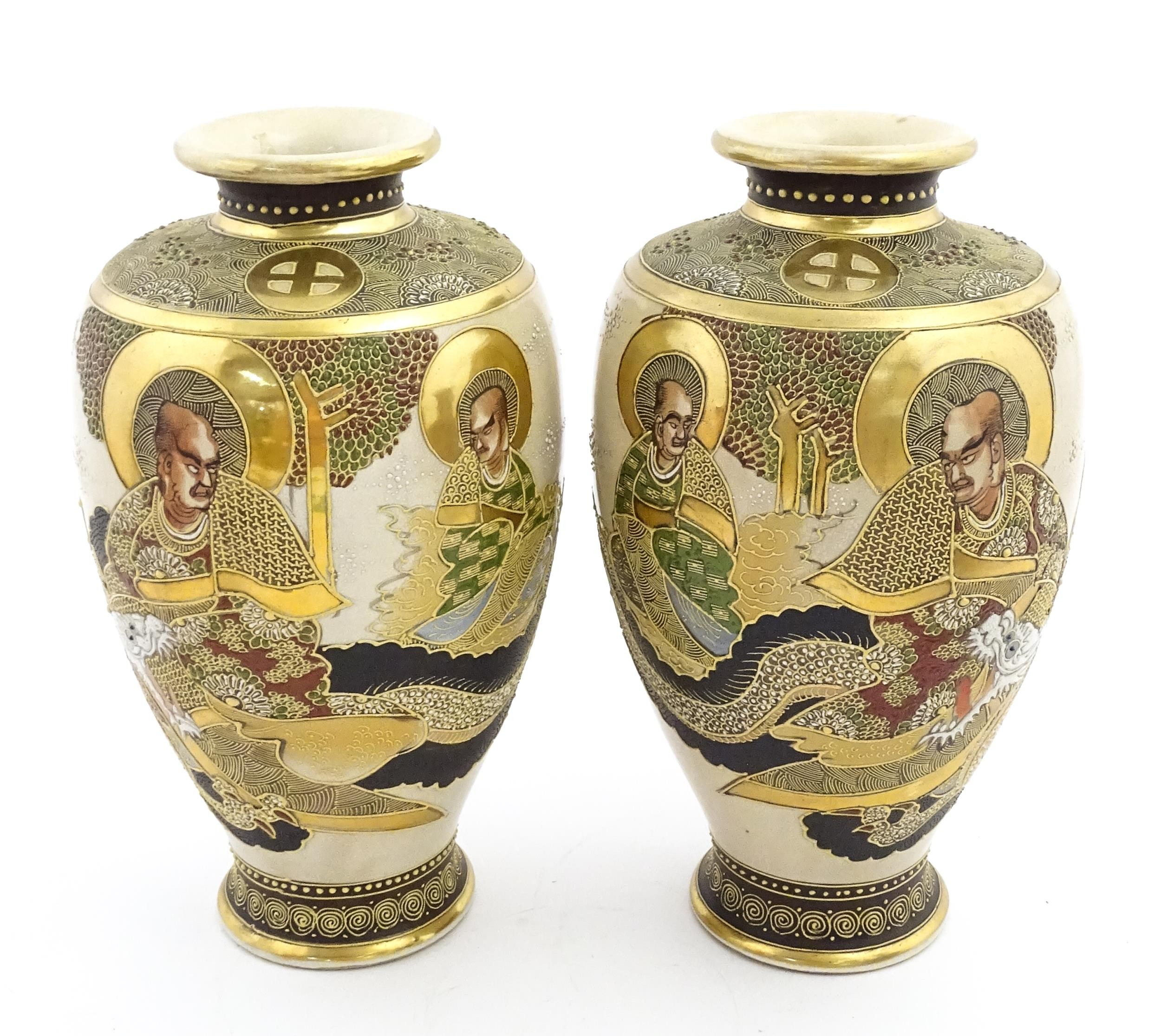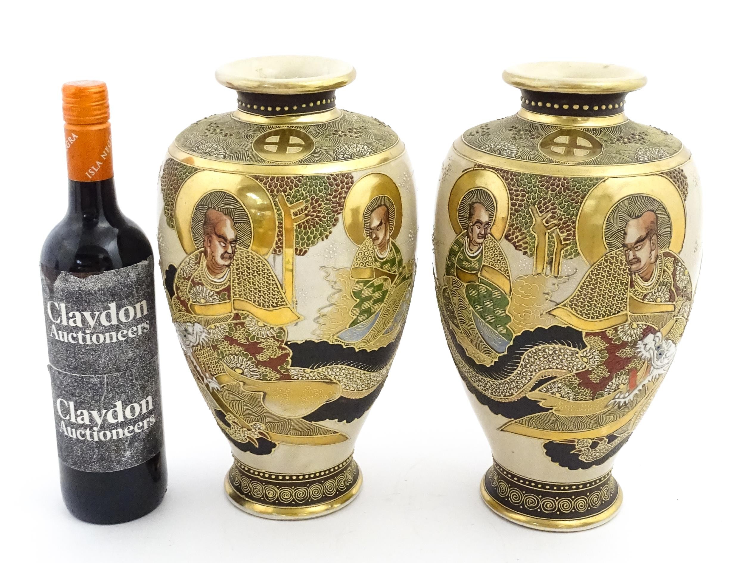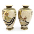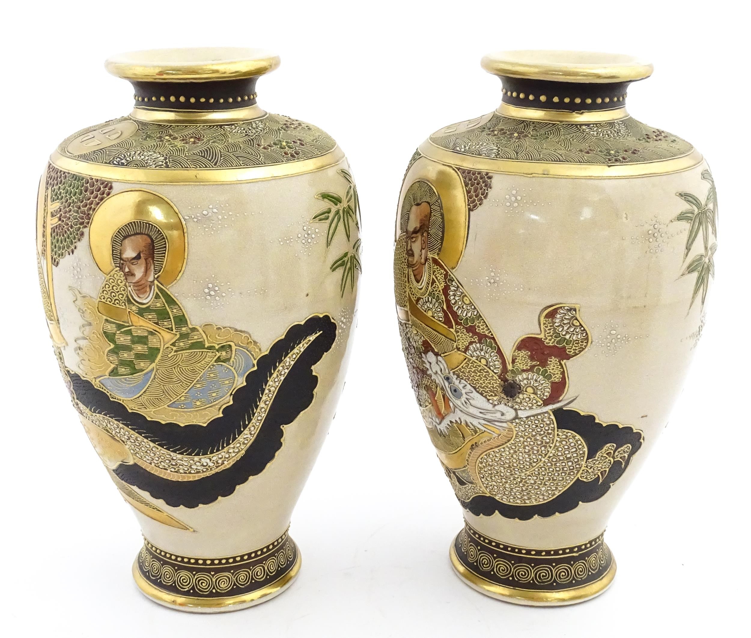 A pair of Japanese satsuma vases decorated with Immortal figures. Character marks under. Approx. 12 1/4" high (2)