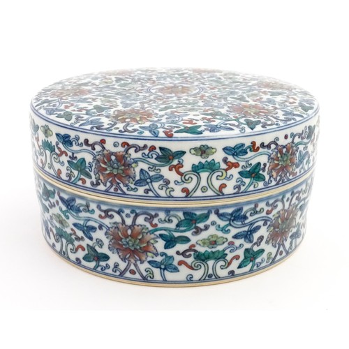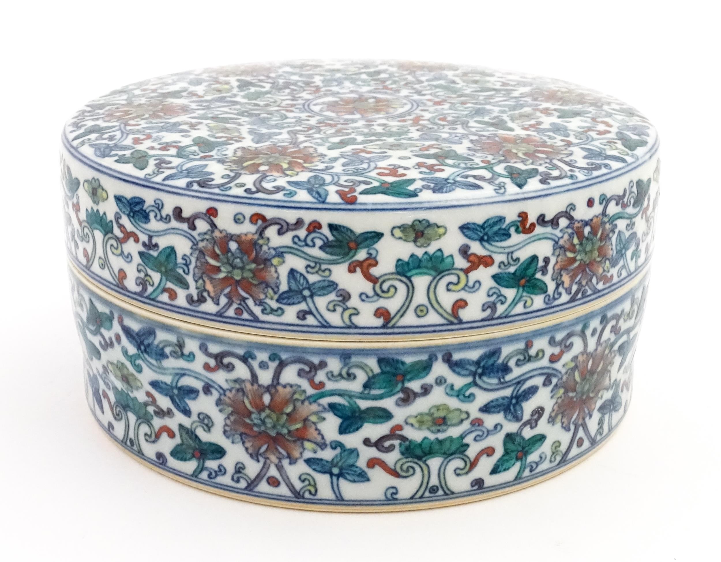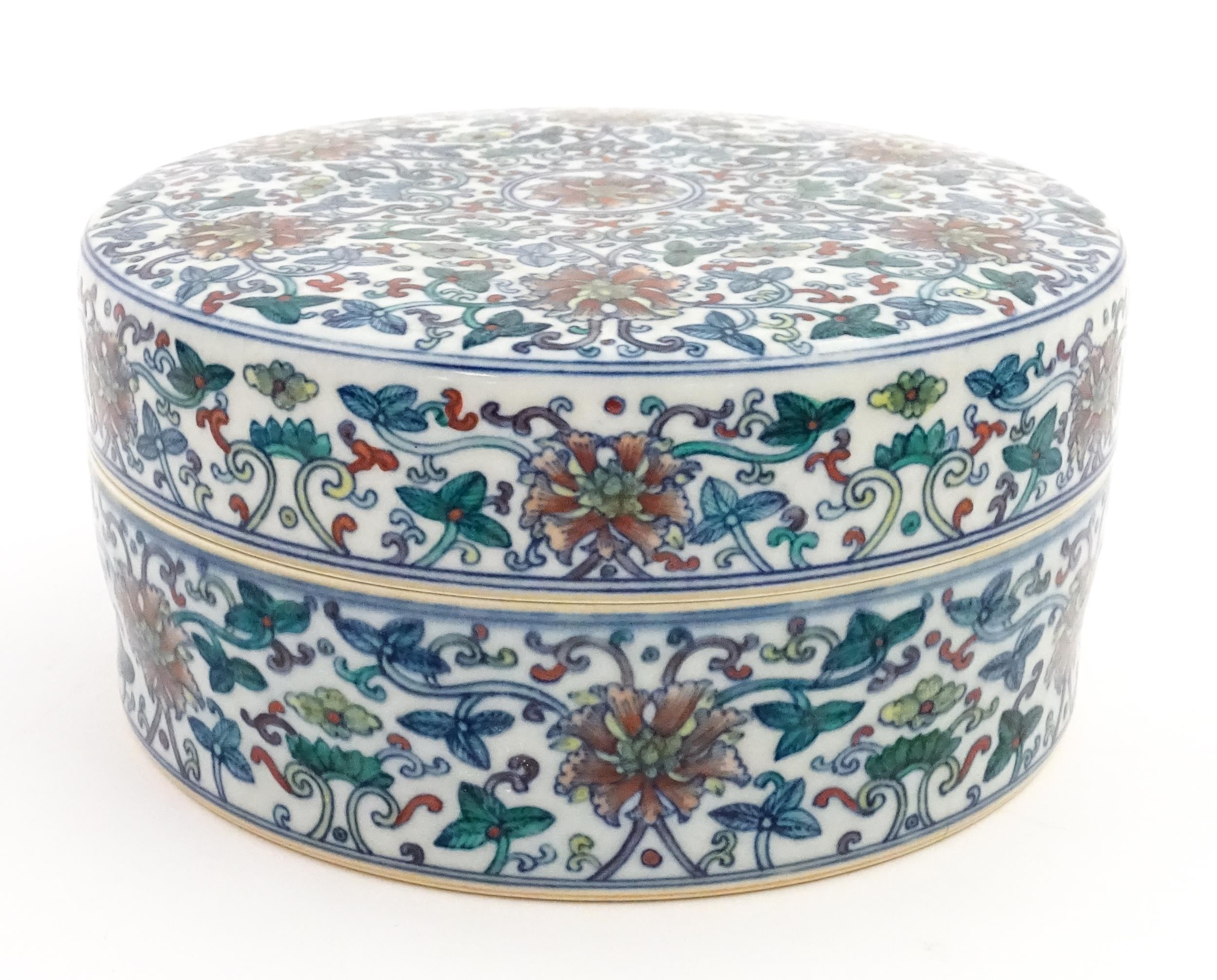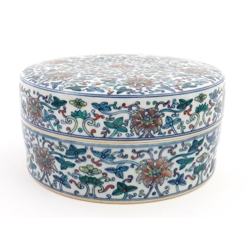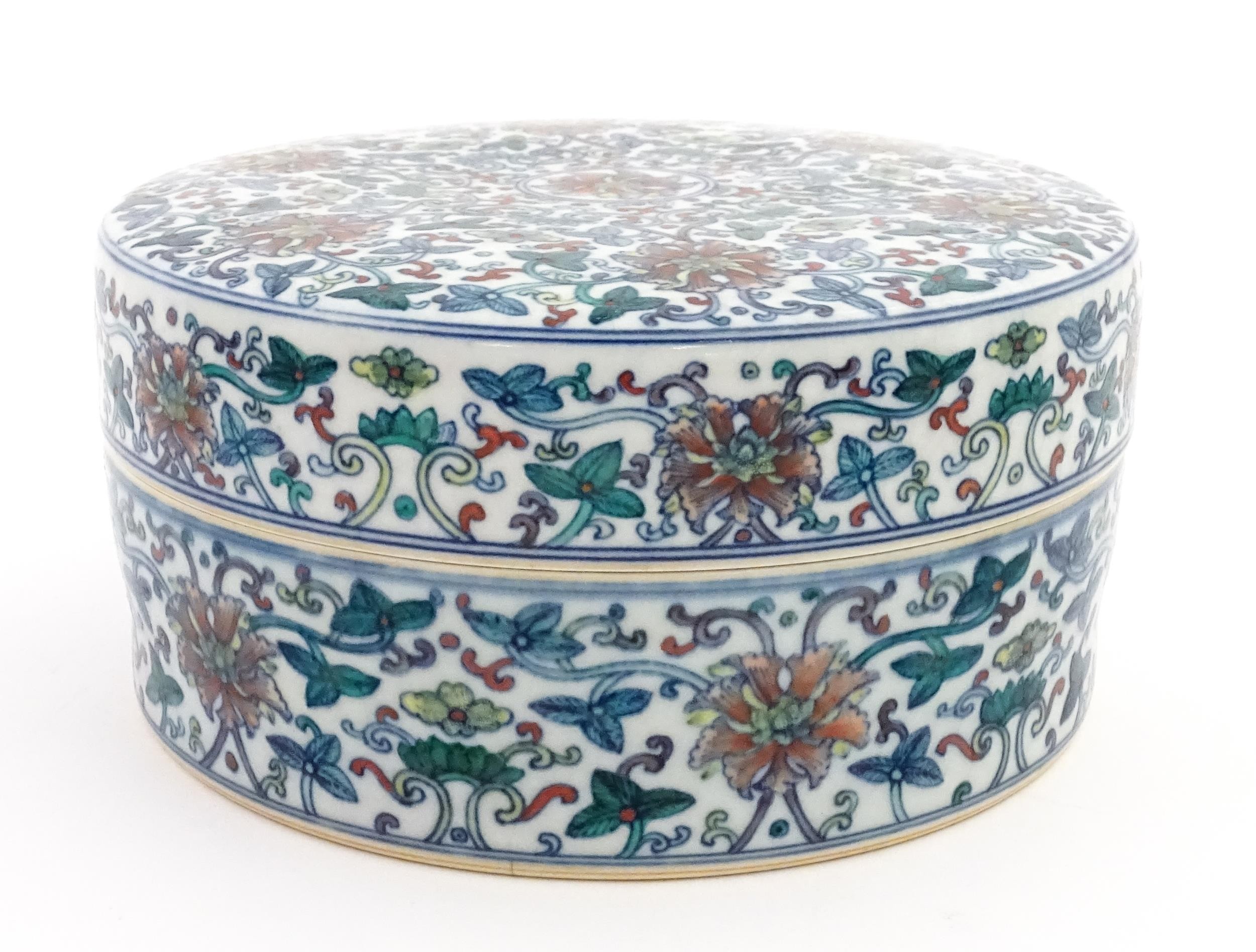 A Chinese Doucai pot and cover of circular form with scrolling floral and foliate decoration. Character marks under. Approx. 8 1/2" wide