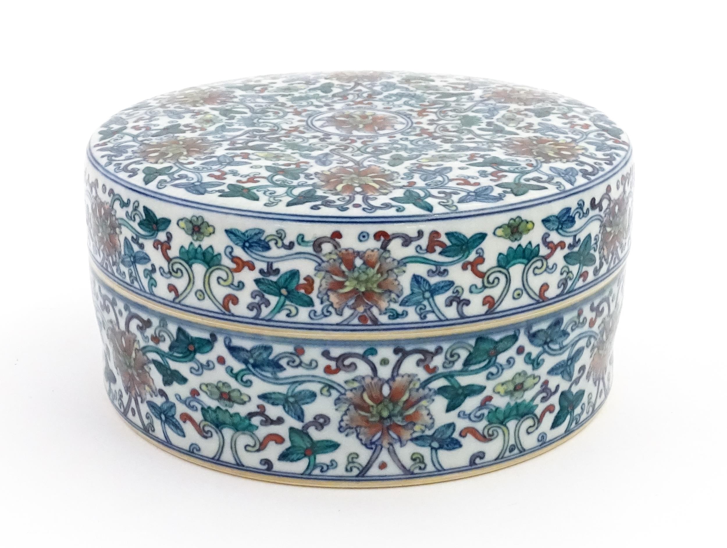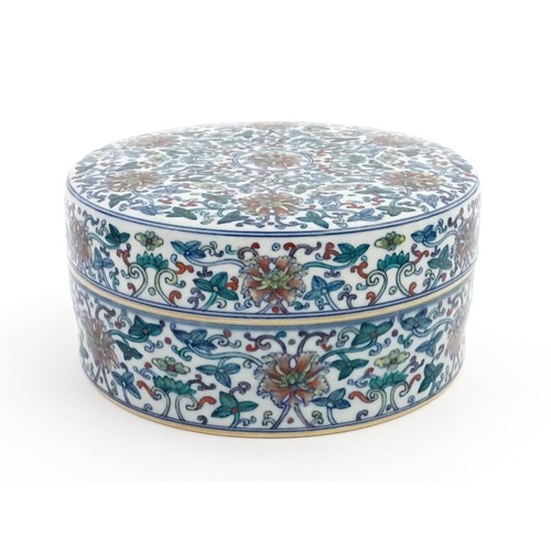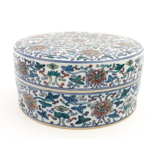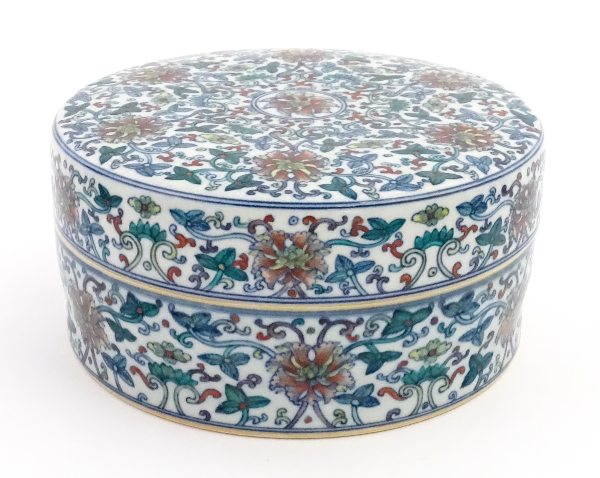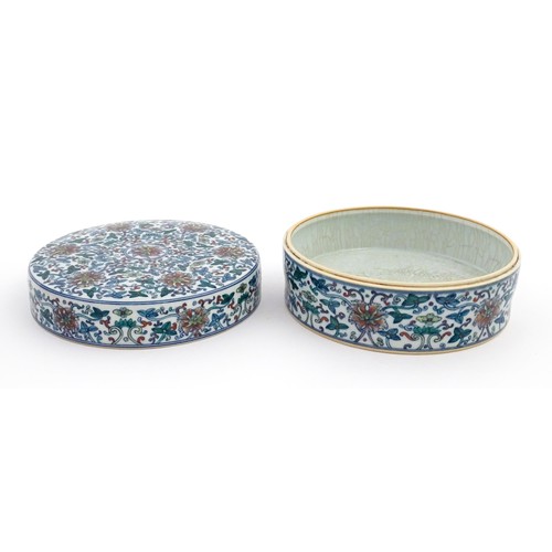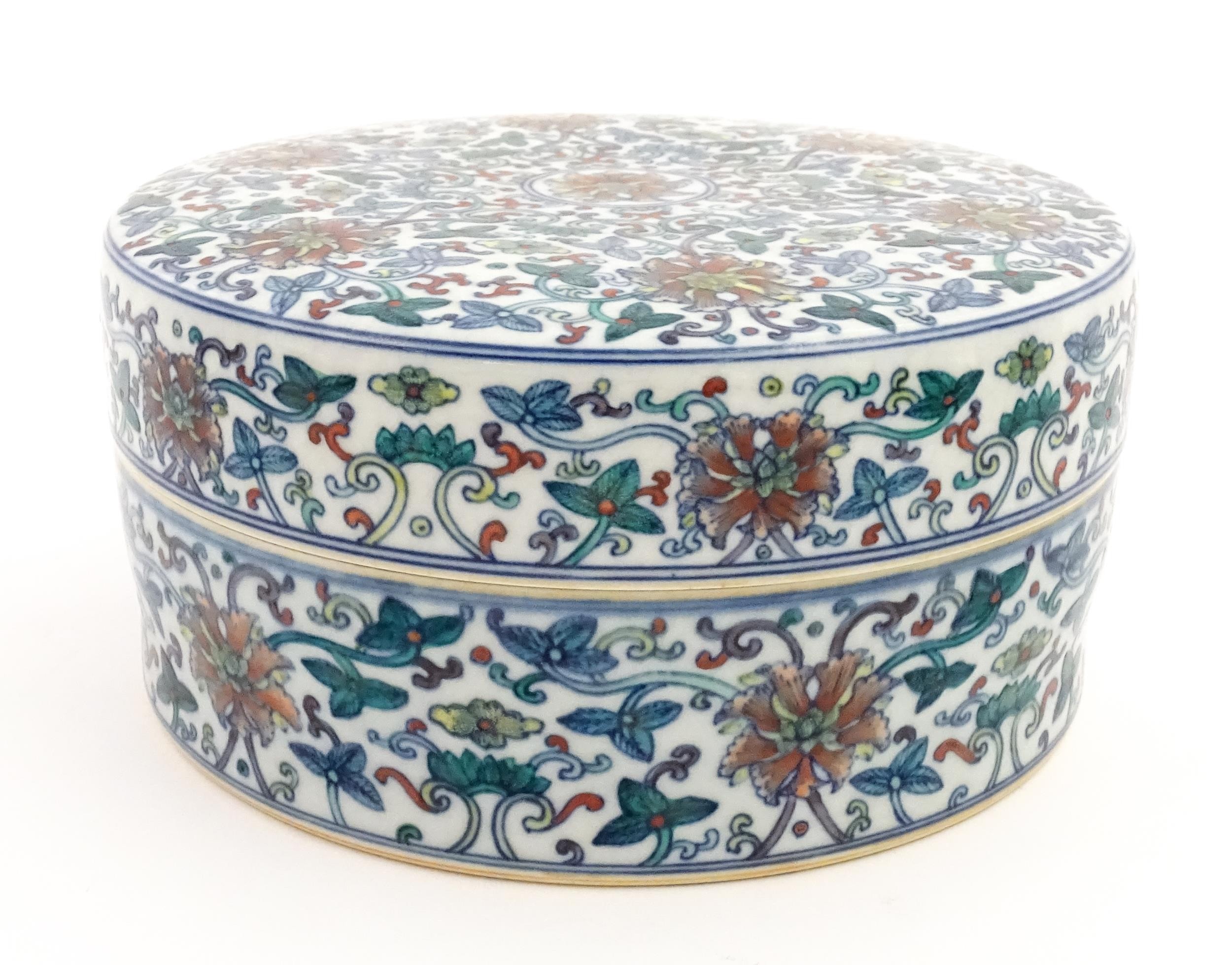 A Chinese Doucai pot and cover of circular form with scrolling floral and foliate decoration. Character marks under. Approx. 8 1/2" wide