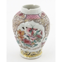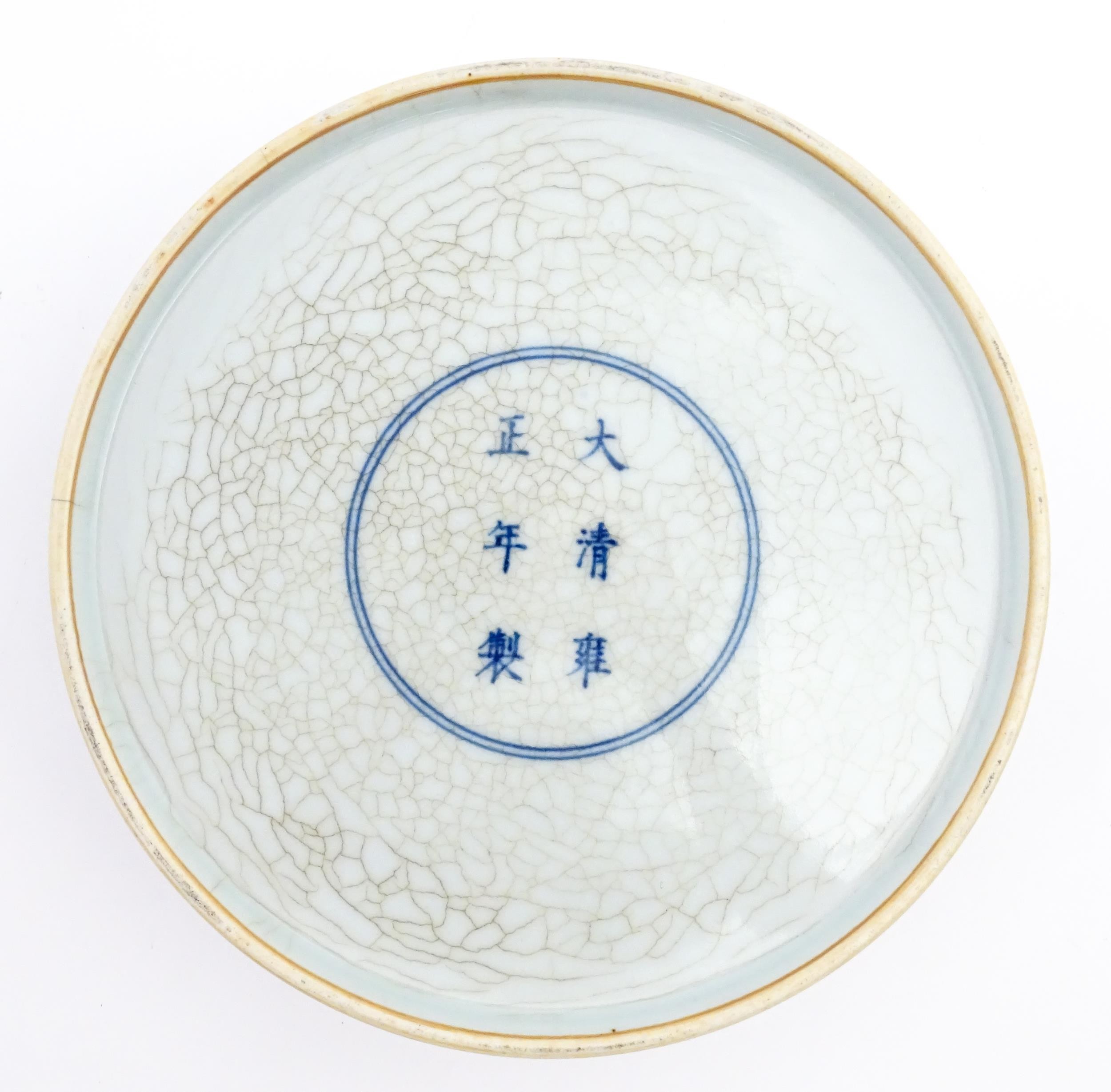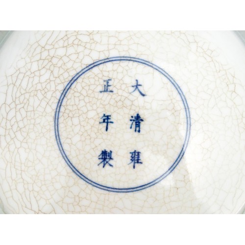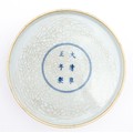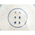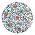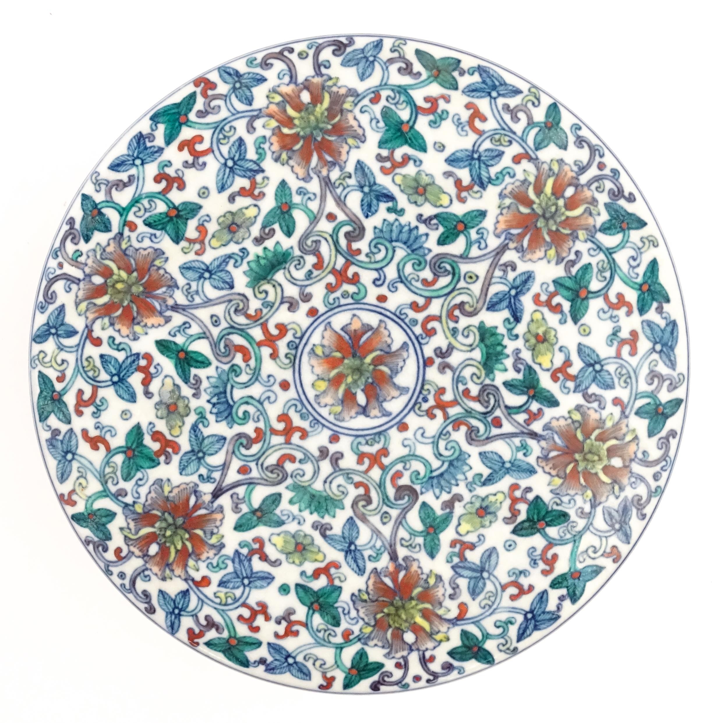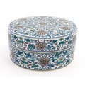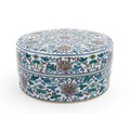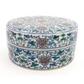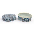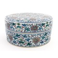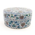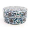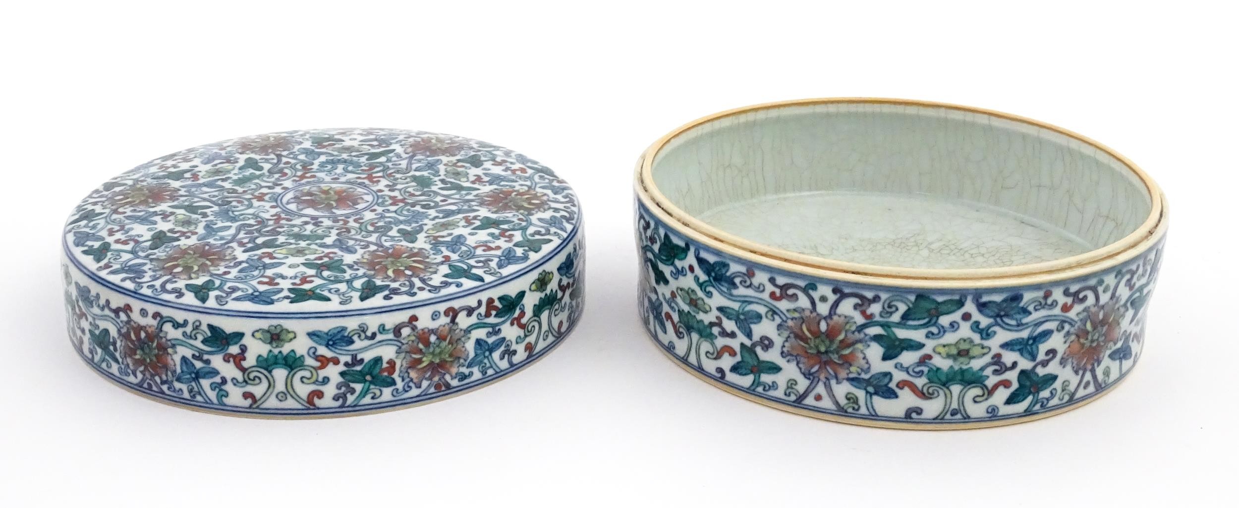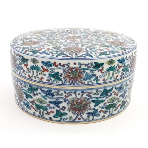 A Chinese Doucai pot and cover of circular form with scrolling floral and foliate decoration. Character marks under. Approx. 8 1/2" wide