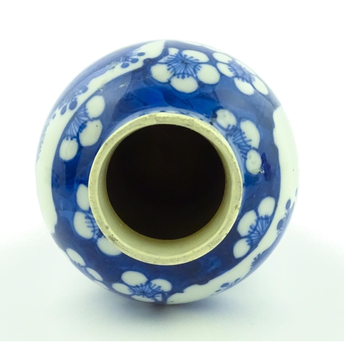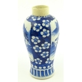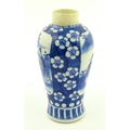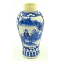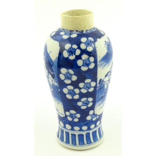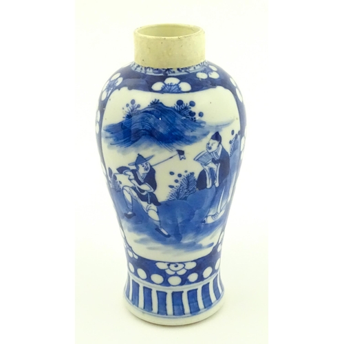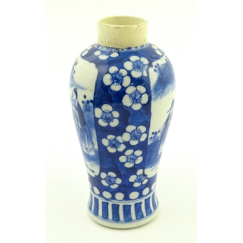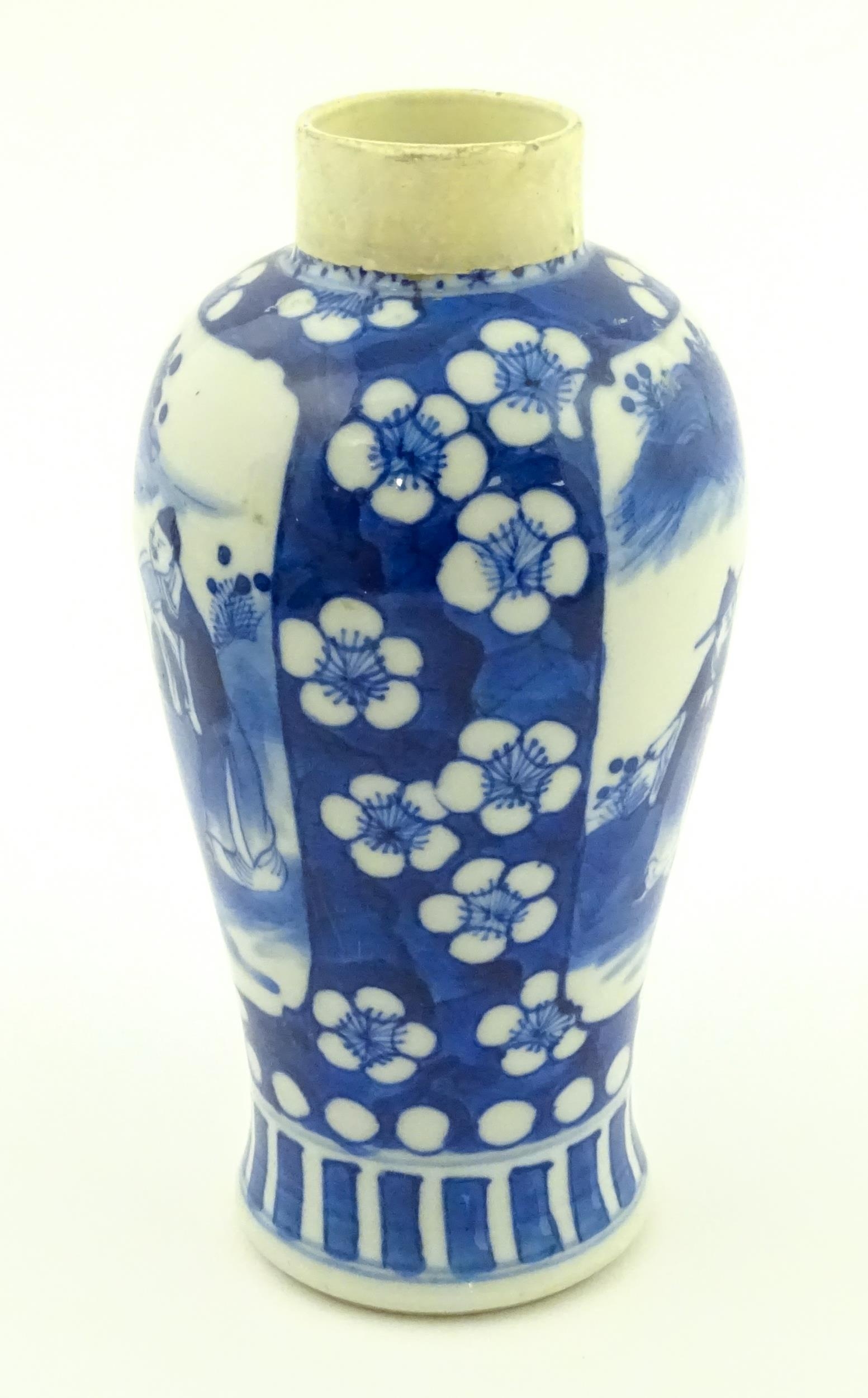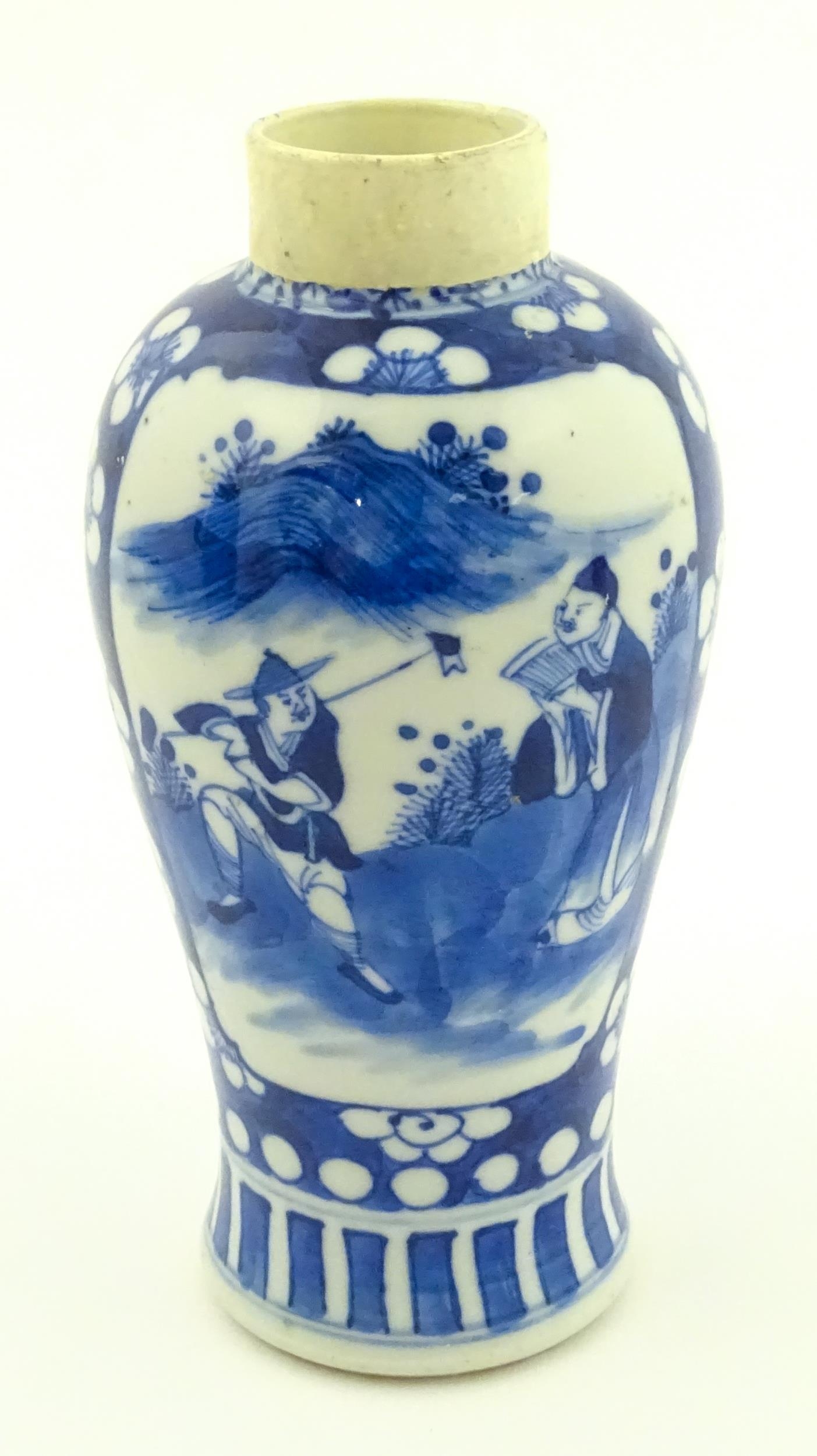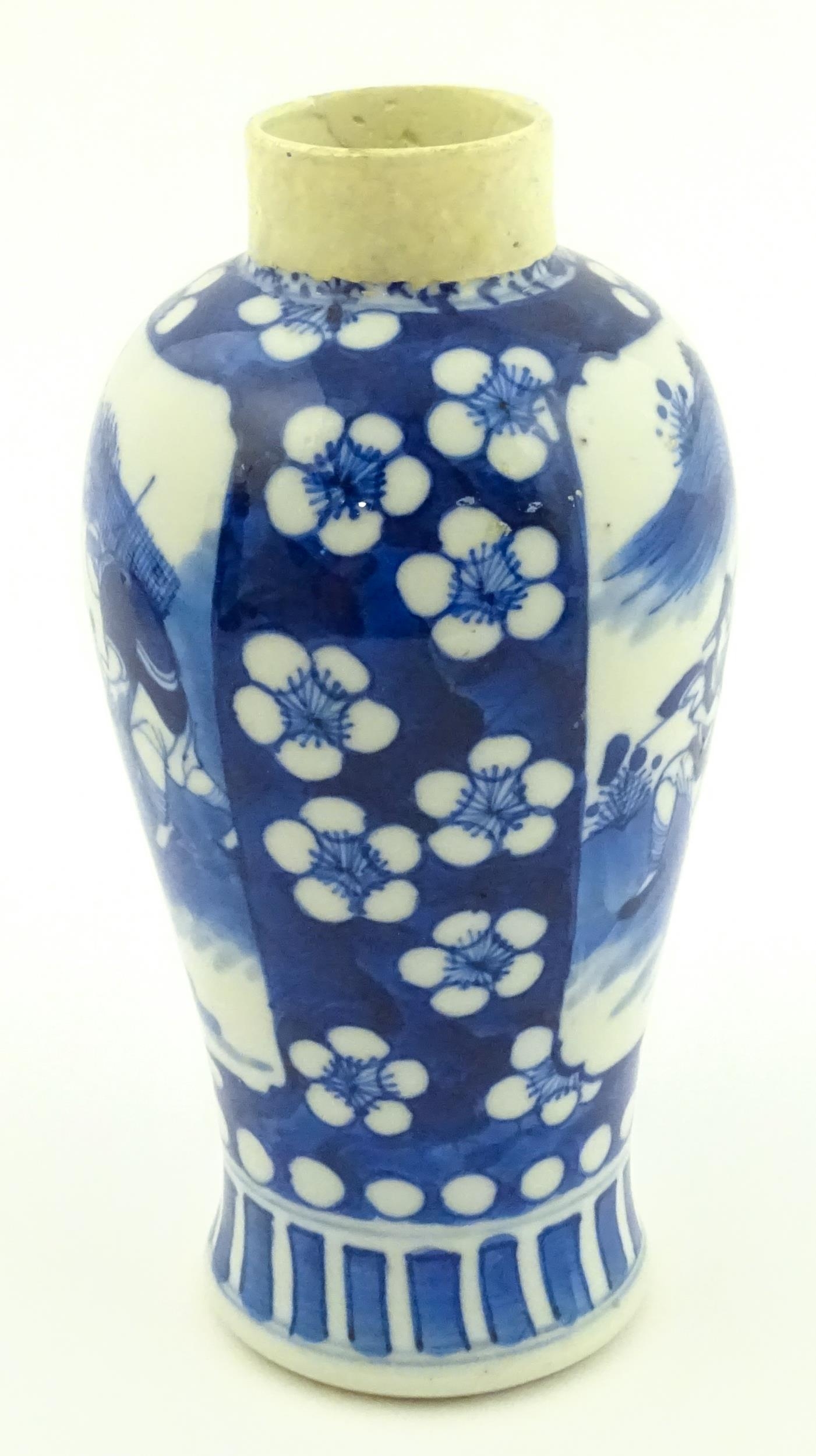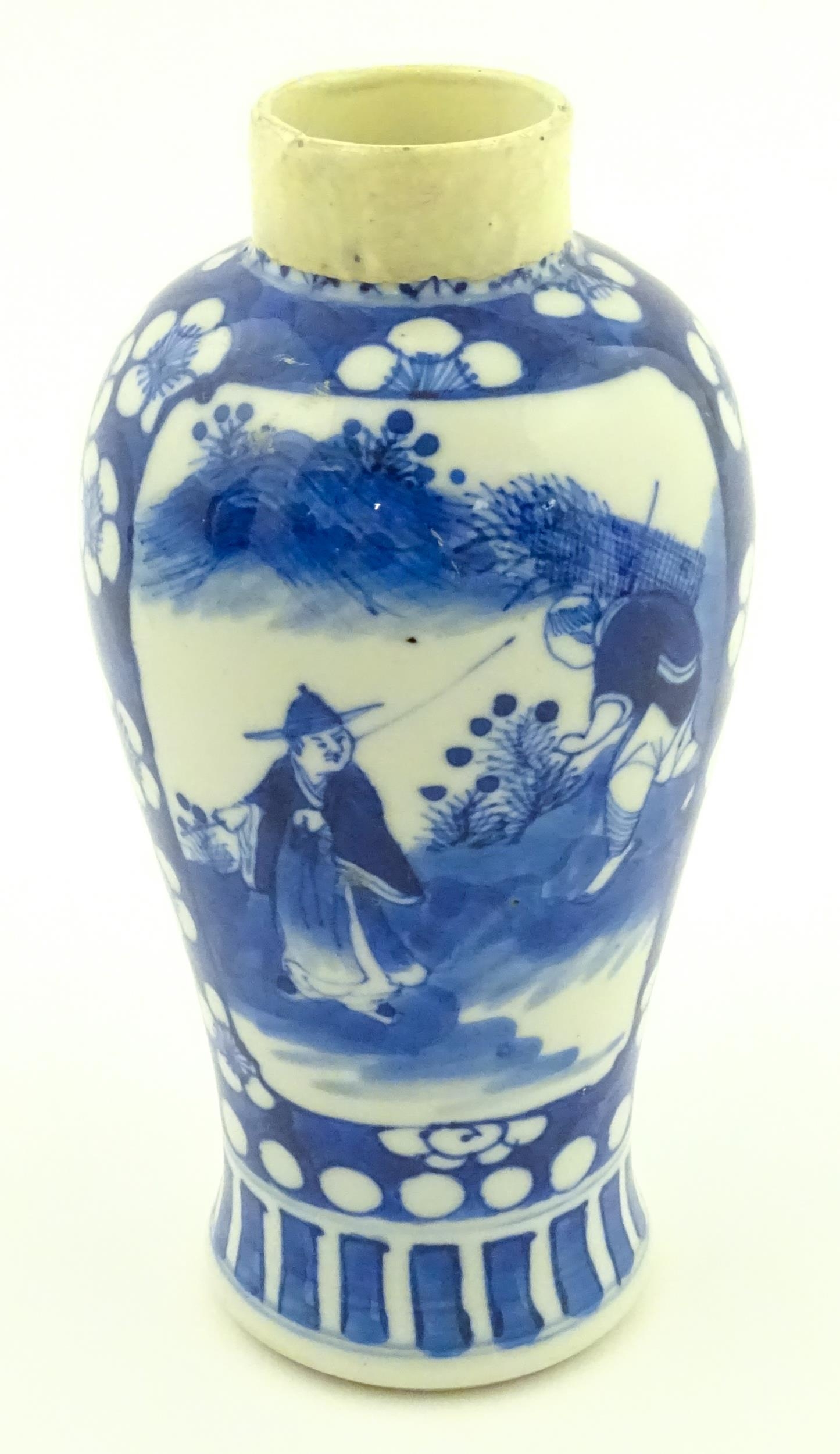A Chinese blue and white vase decorated with figures in a landscape, bordered by prunus blossom. Approx. 6 1/2" high