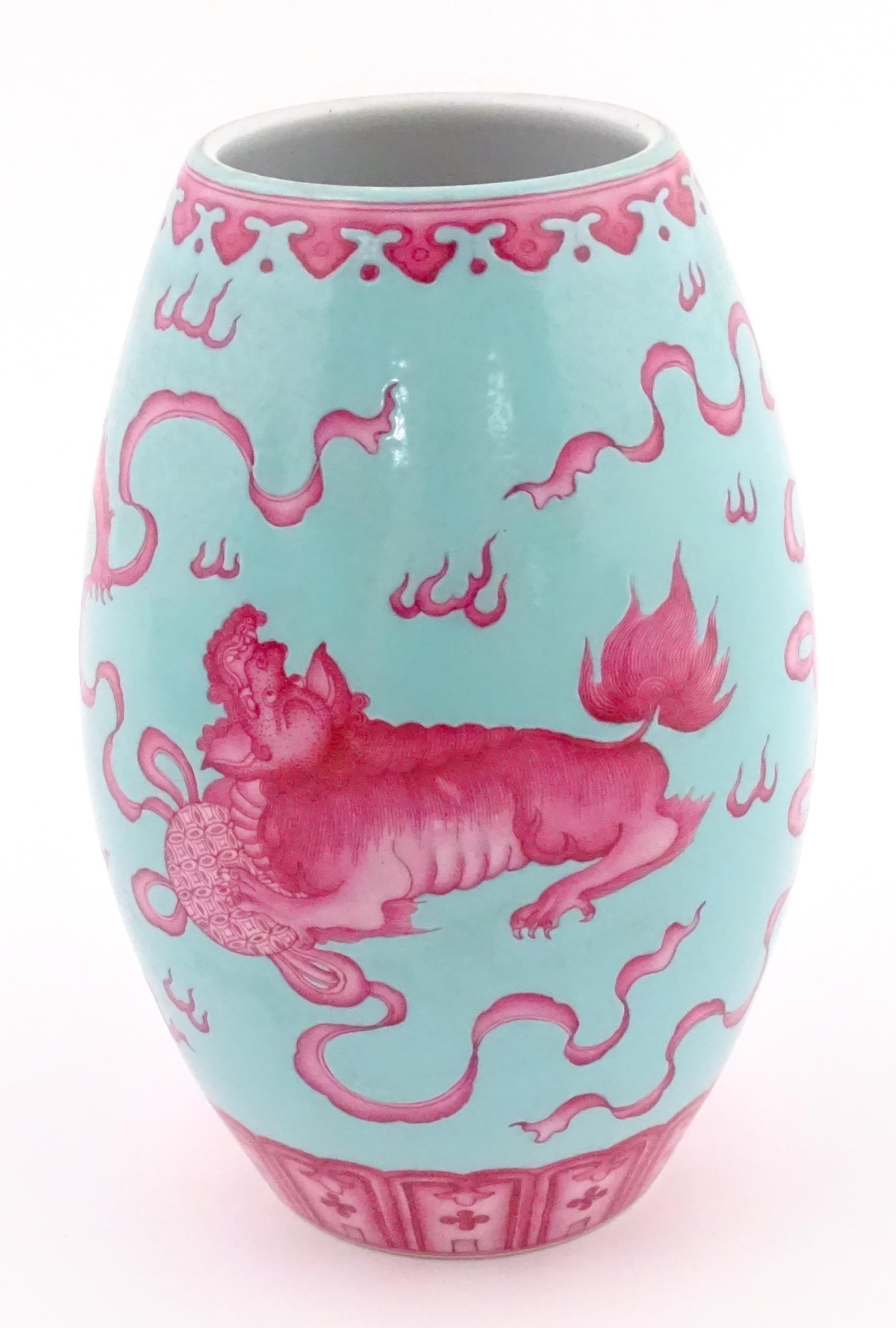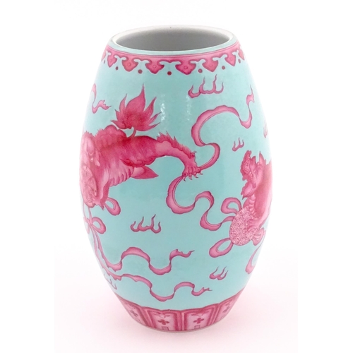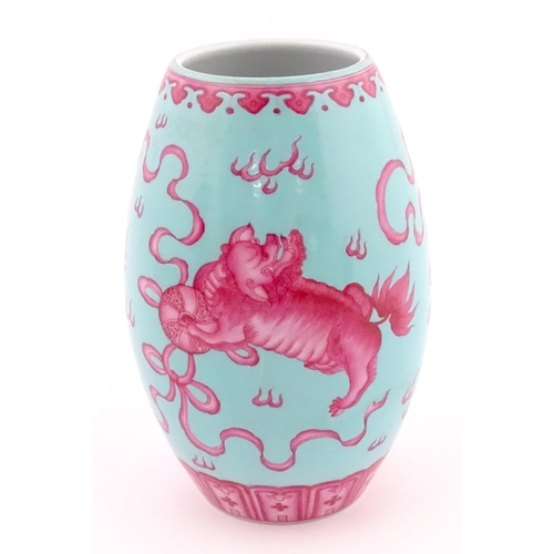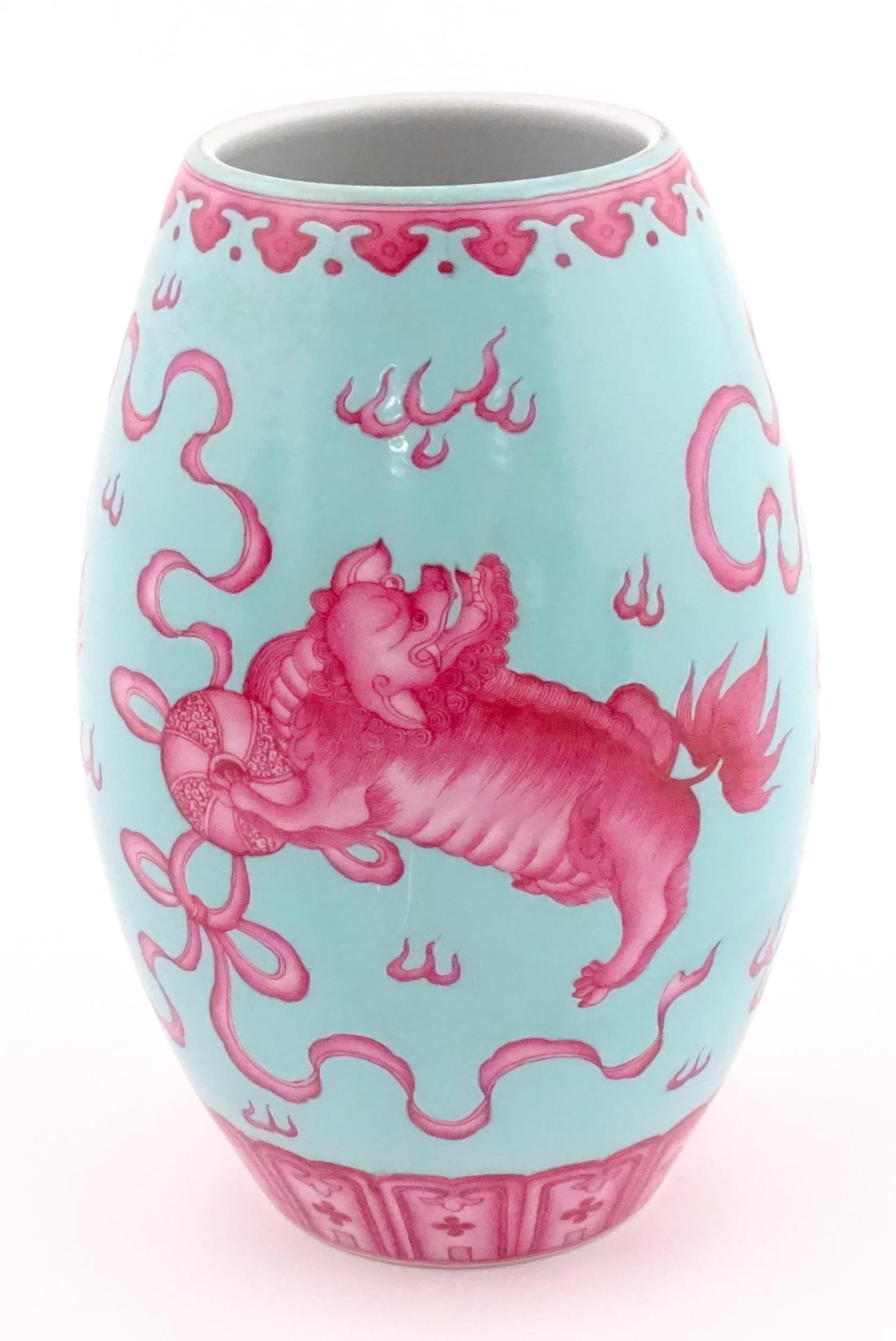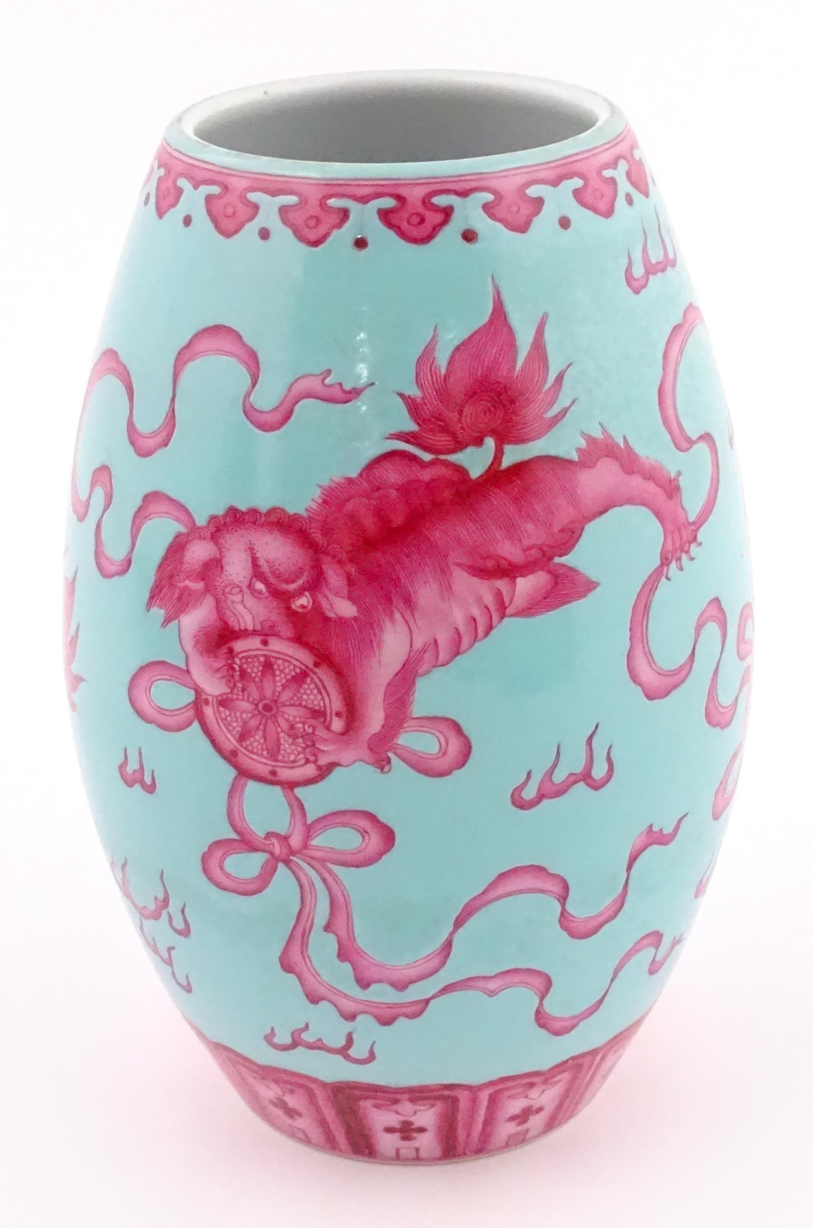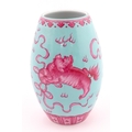 A Chinese famille rose vase, the turquoise ground decorated with guardian lions / foo dogs. Character marks under. Approx. 6 3/4" high