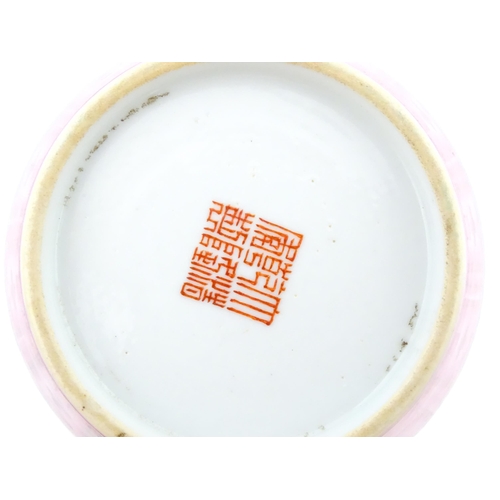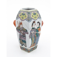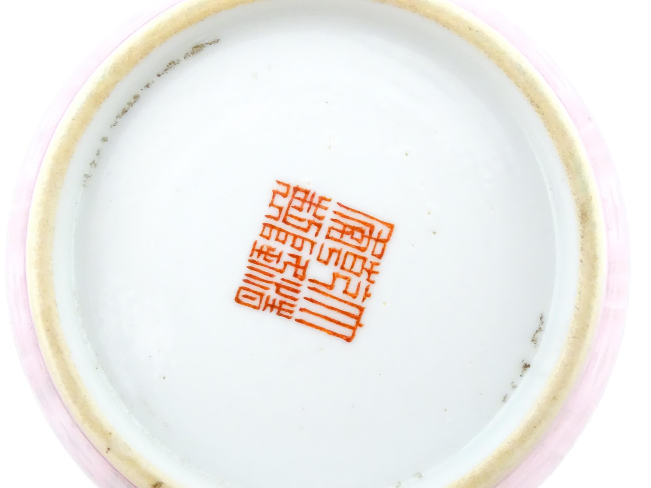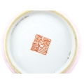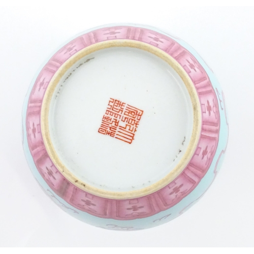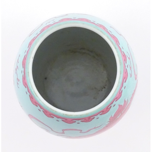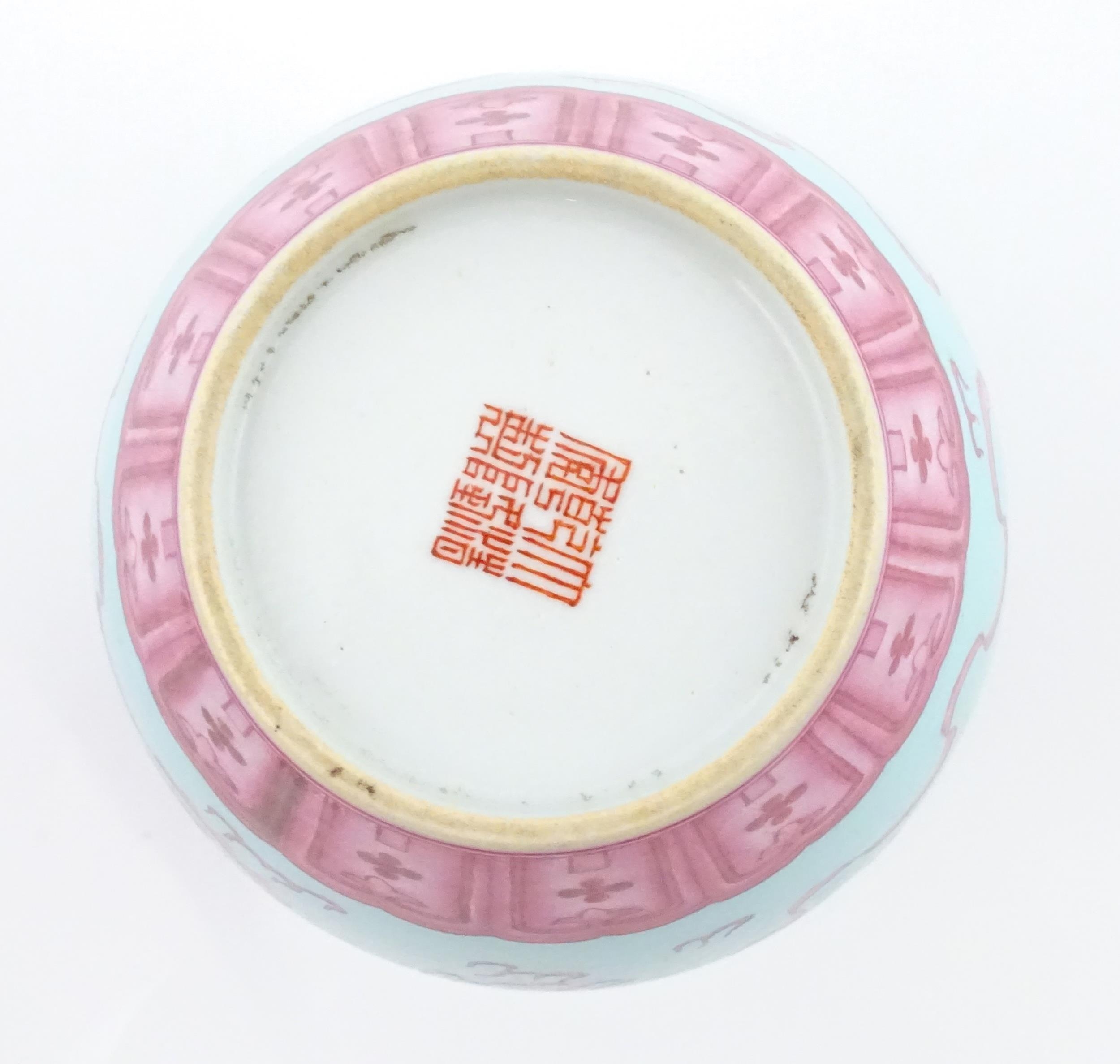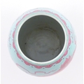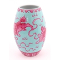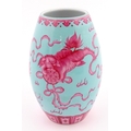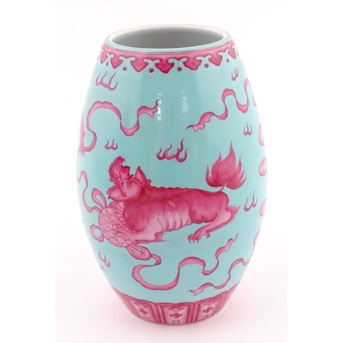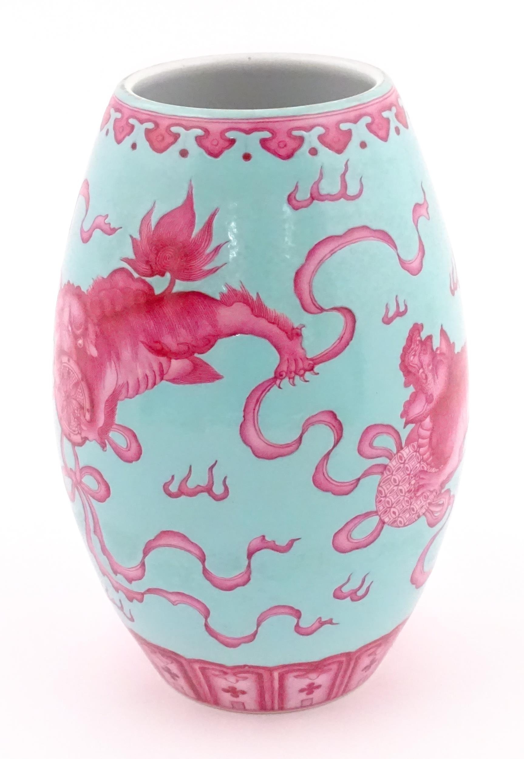 A Chinese famille rose vase, the turquoise ground decorated with guardian lions / foo dogs. Character marks under. Approx. 6 3/4" high