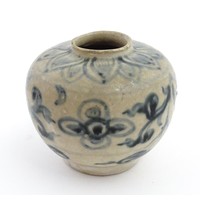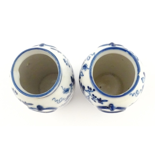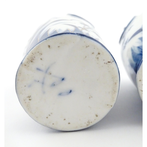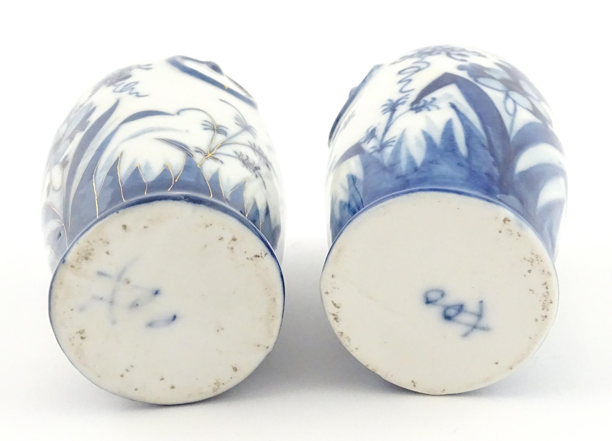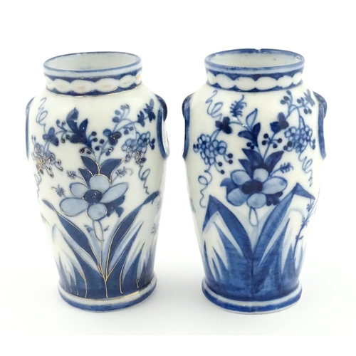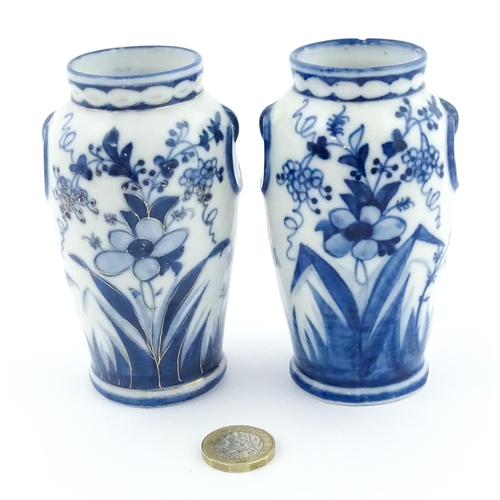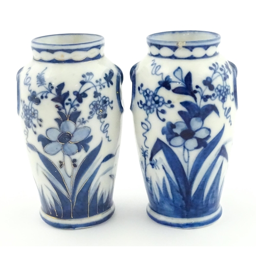 A pair of Chinese blue and white vases with relief ring handles. Marked under. Approx. 4 1/2" high