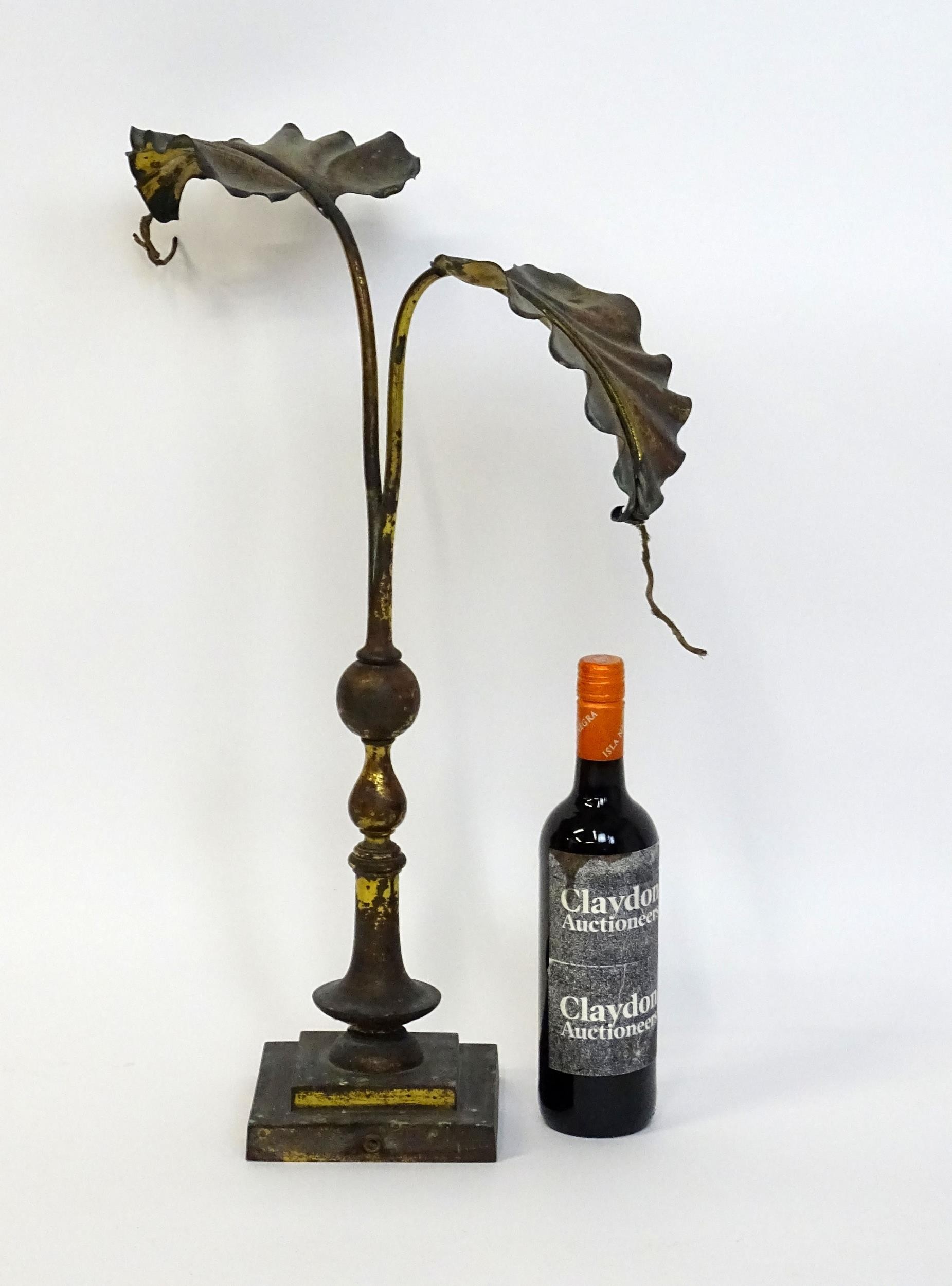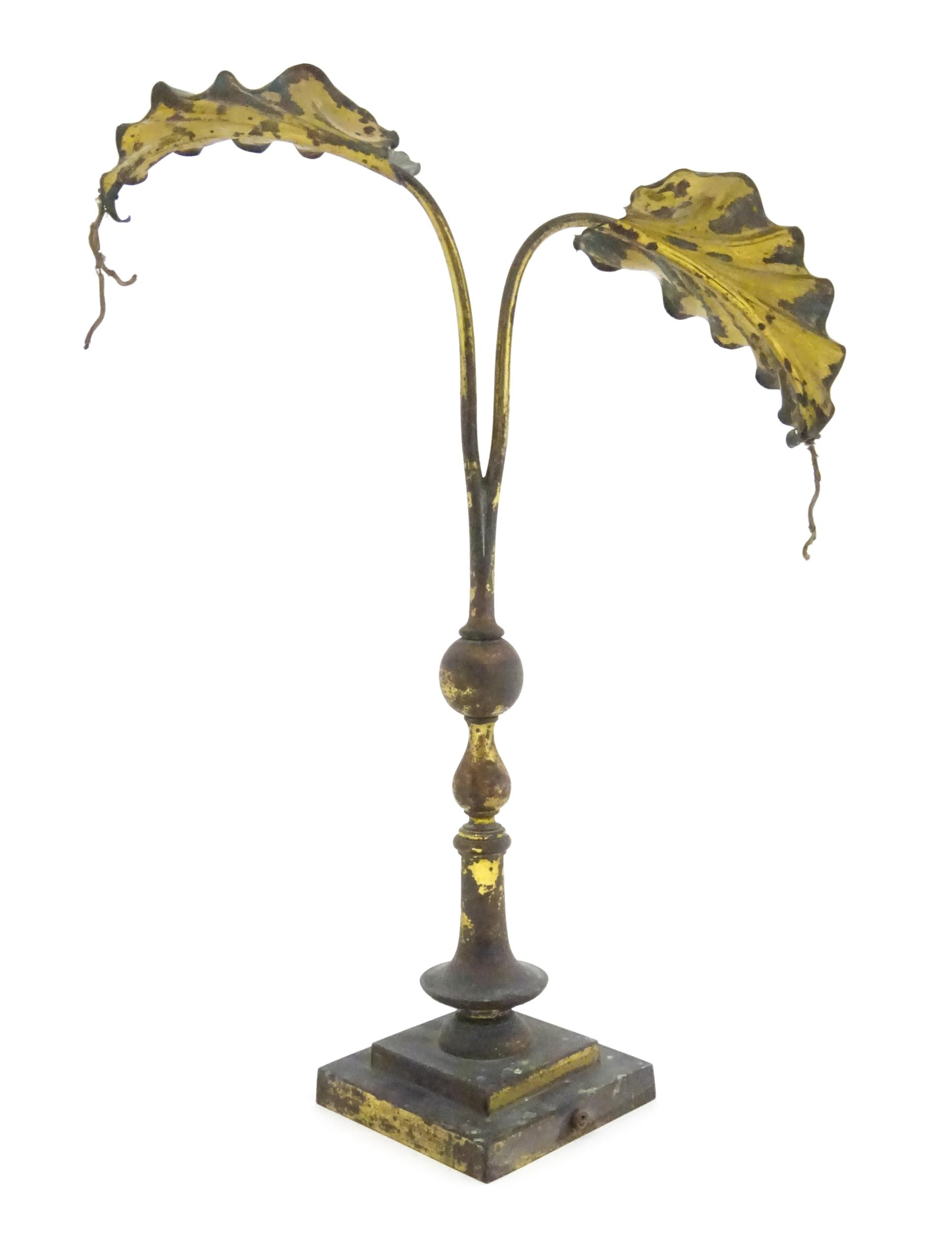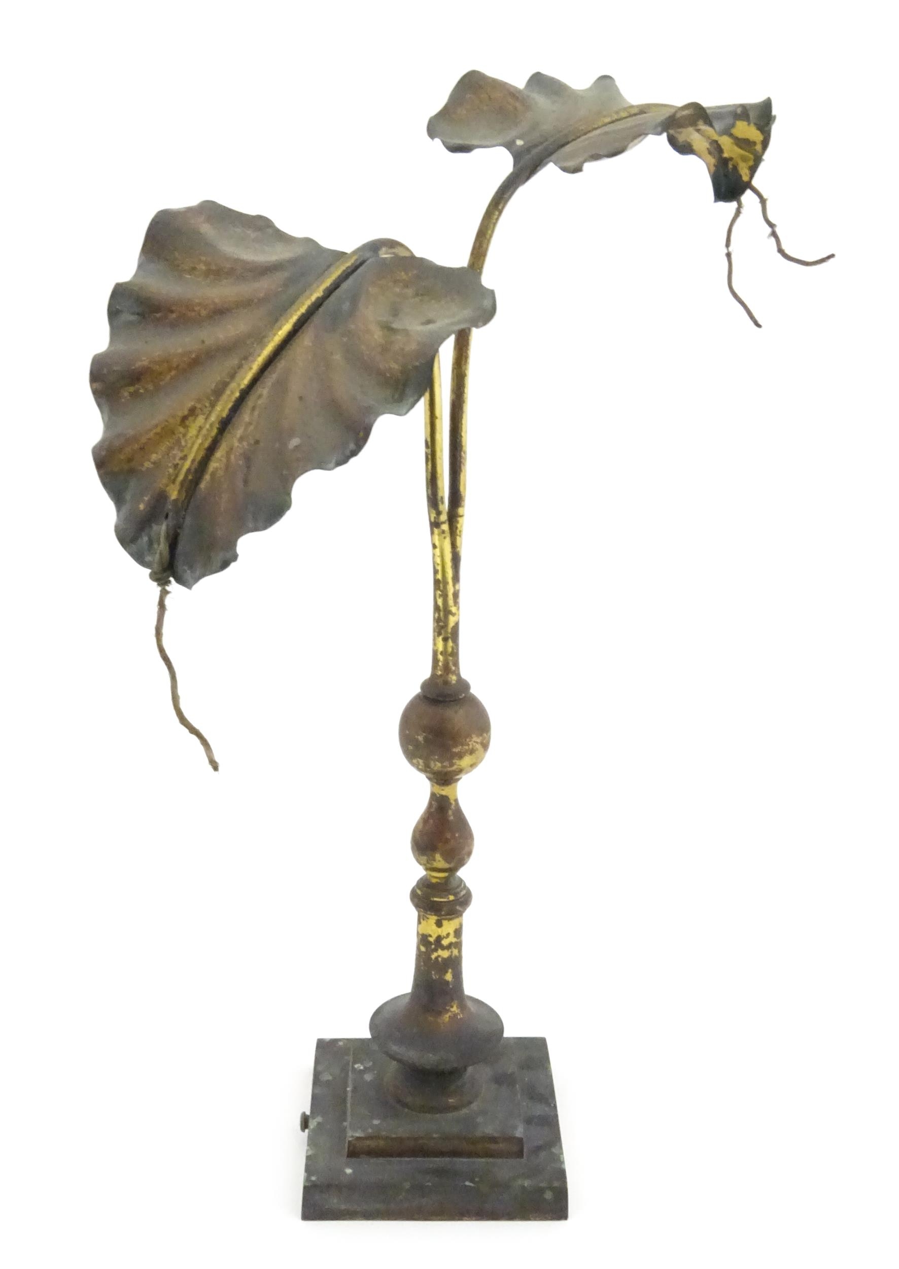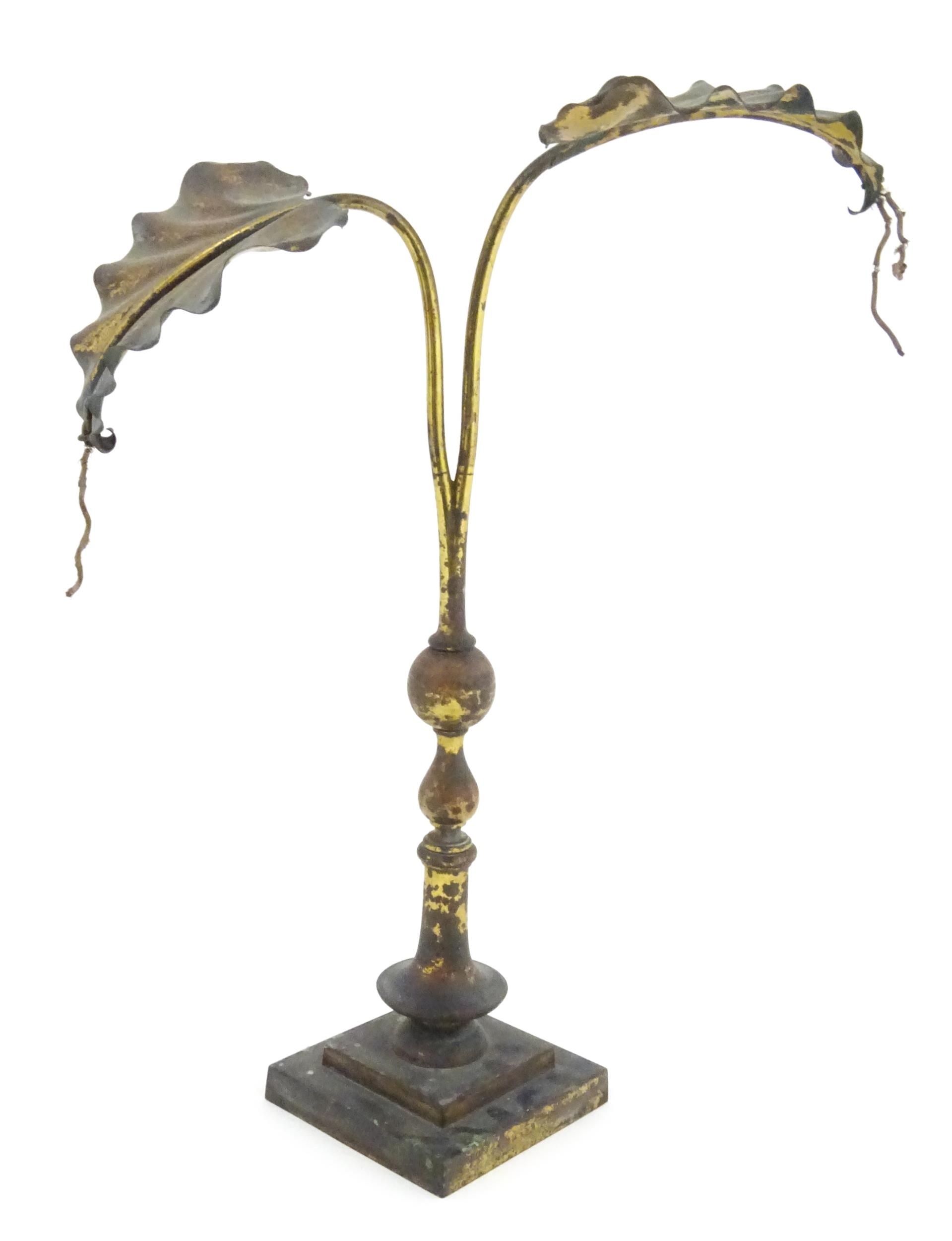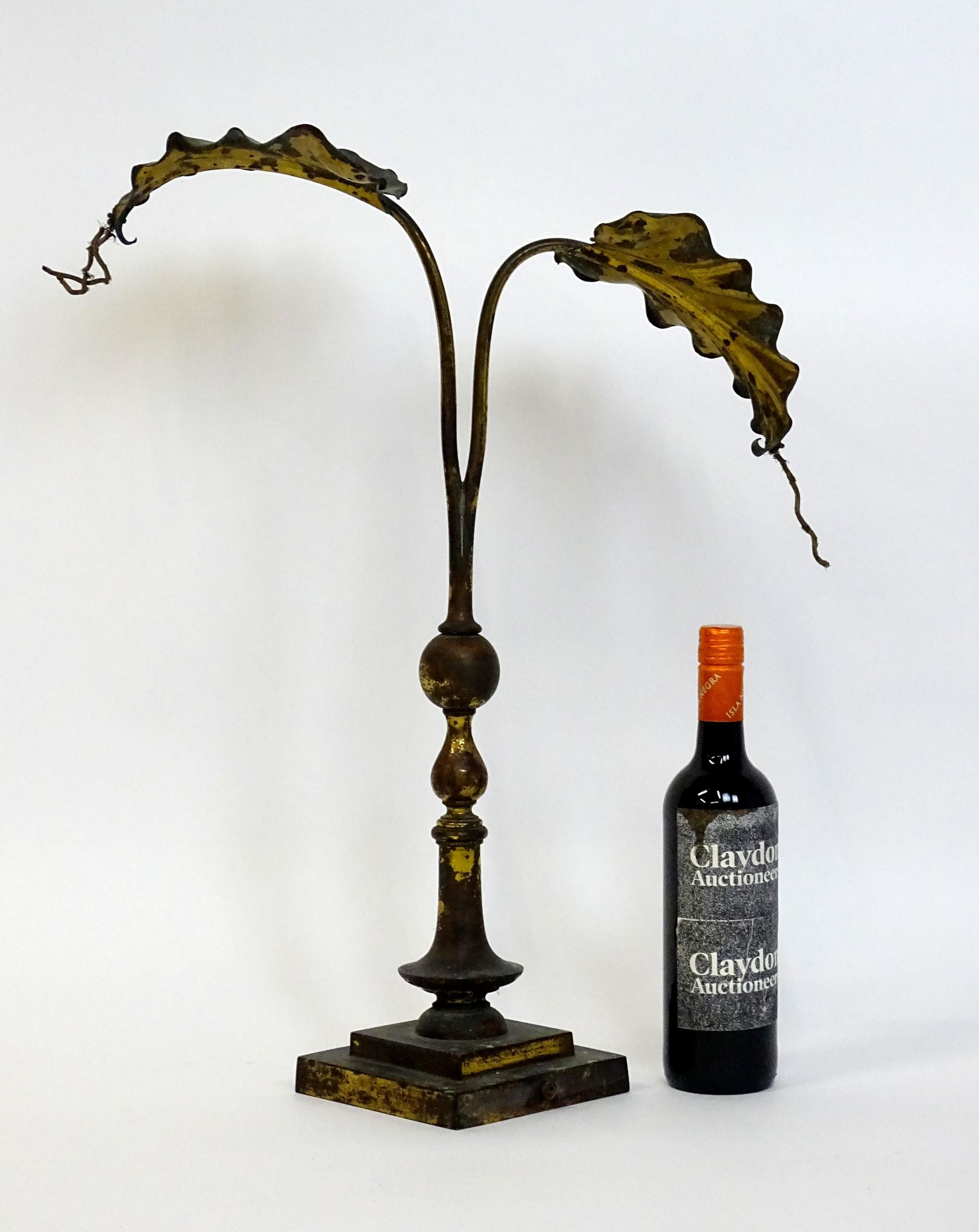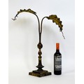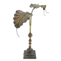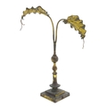An Arts & Crafts brass table lamp in the manner of WAS Benson having twin Art Nouveau leaf reflector detail, raised on a stepped base with knopped support. Approx. 24" high