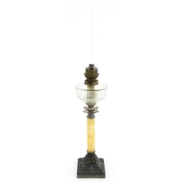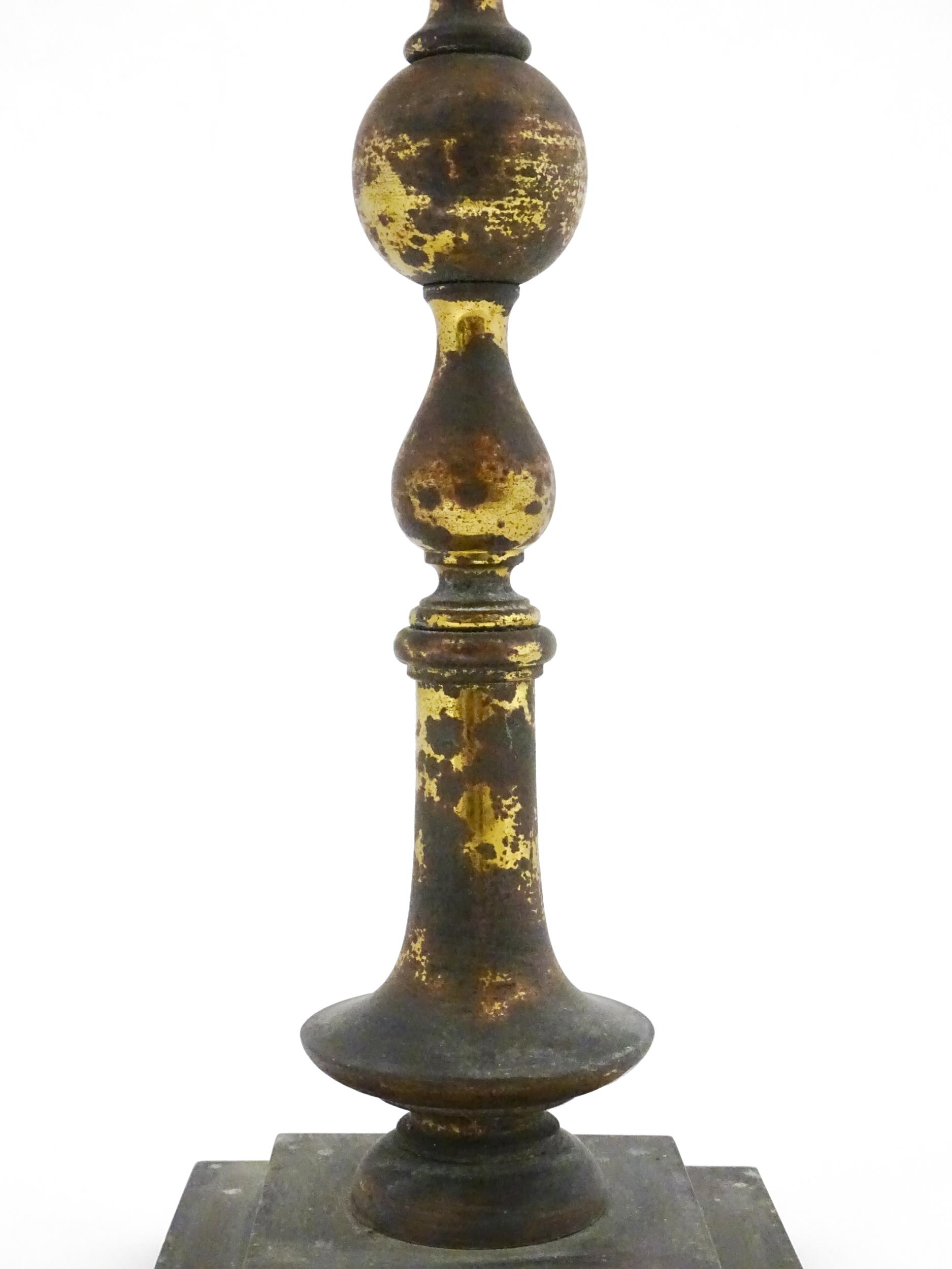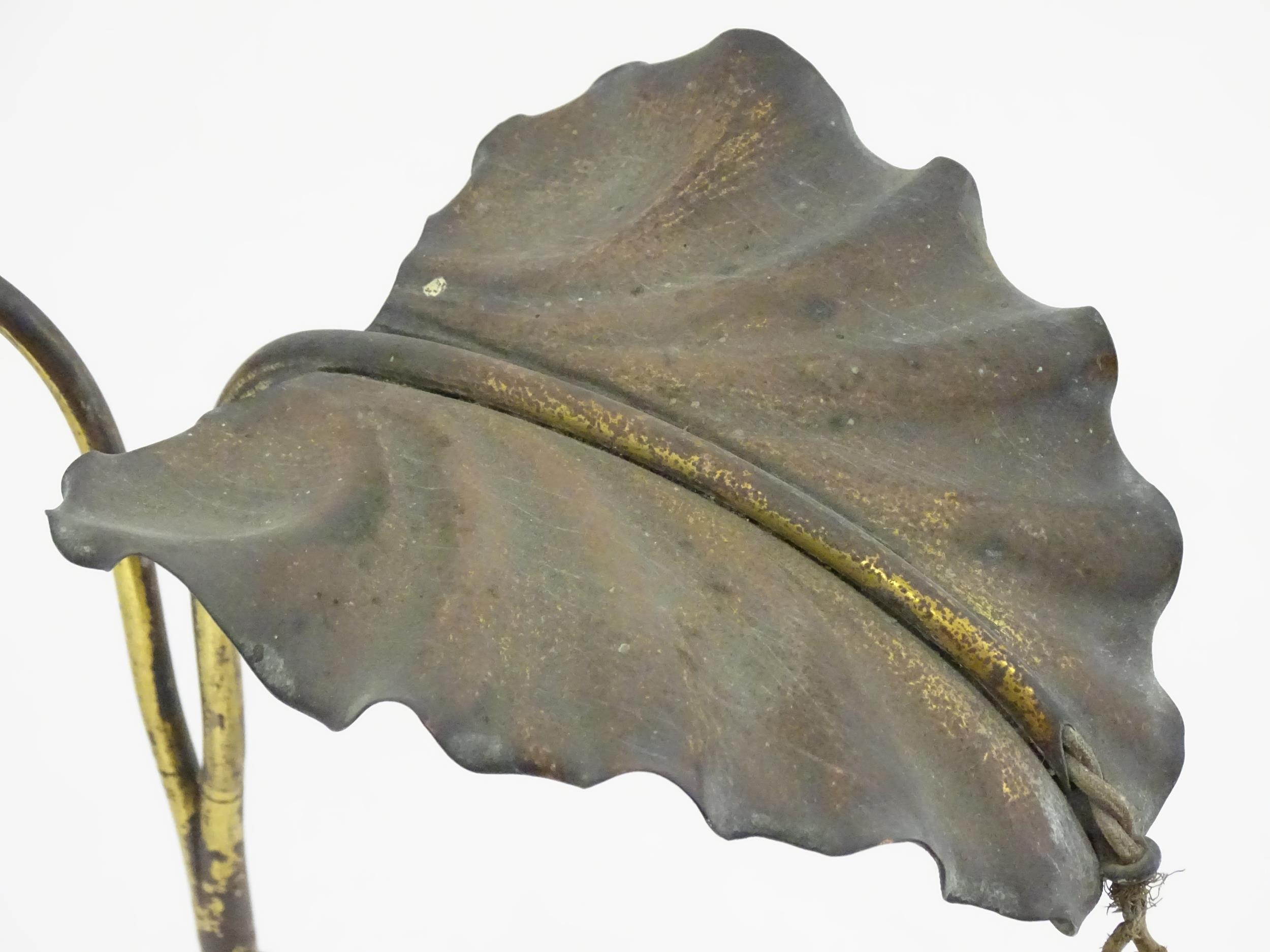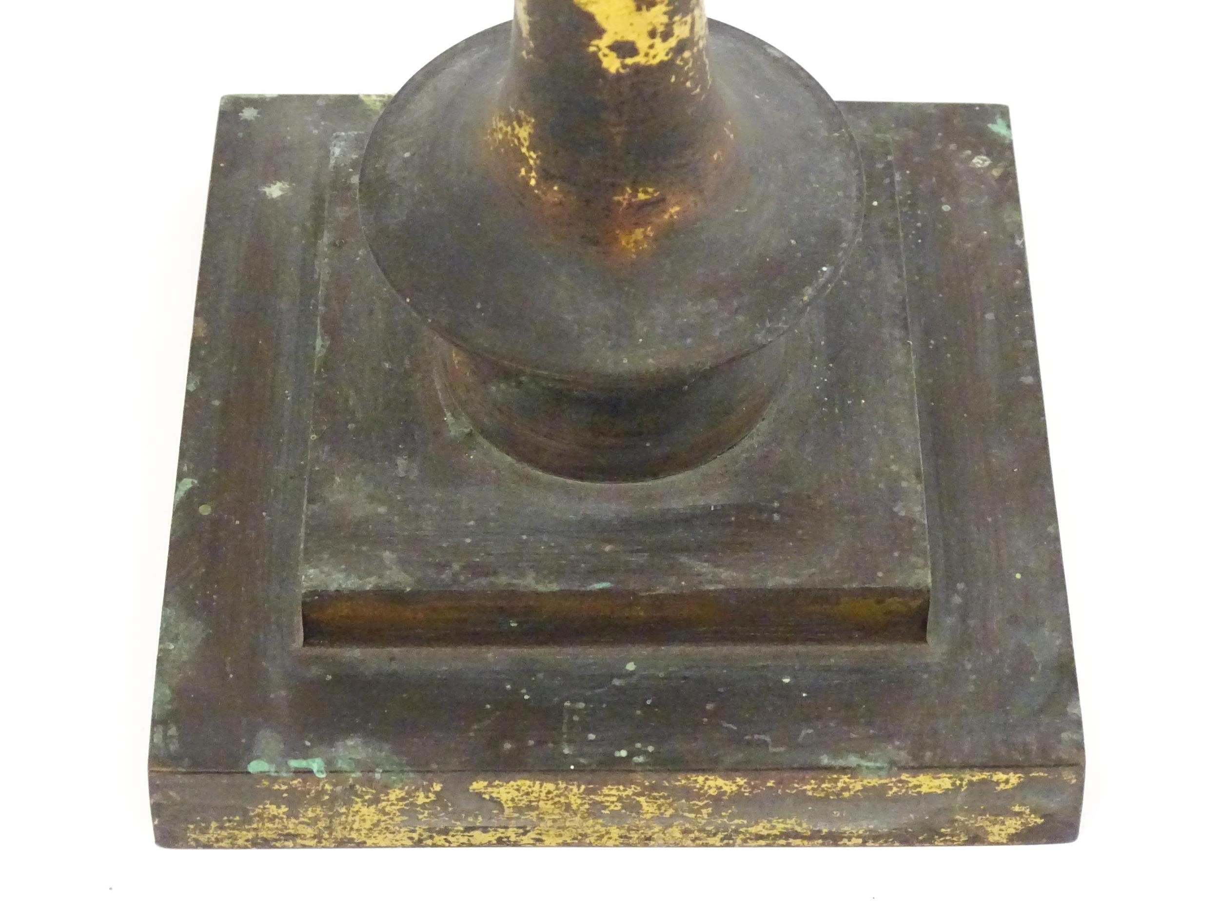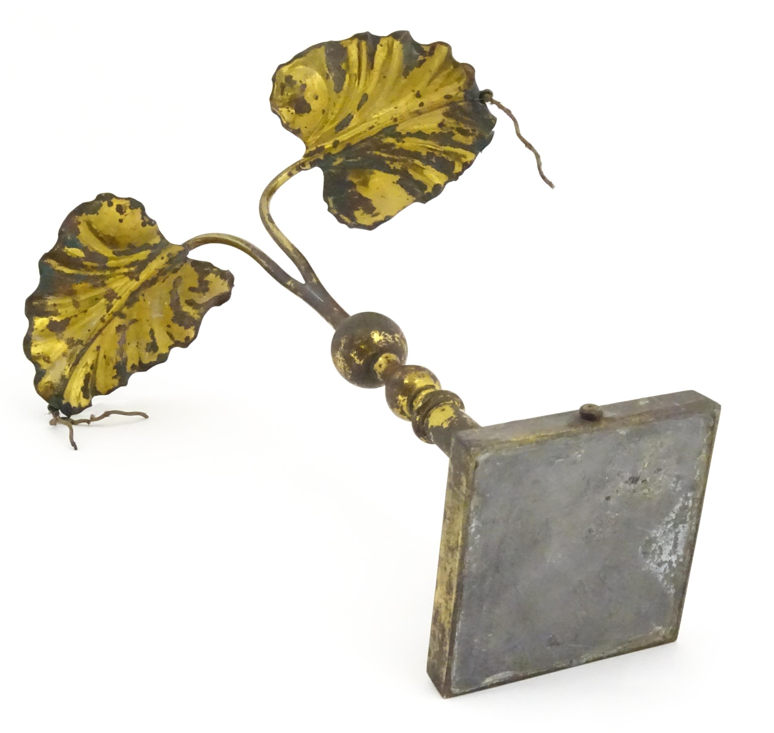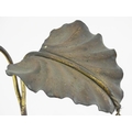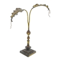 An Arts & Crafts brass table lamp in the manner of WAS Benson having twin Art Nouveau leaf reflector detail, raised on a stepped base with knopped support. Approx. 24" high
