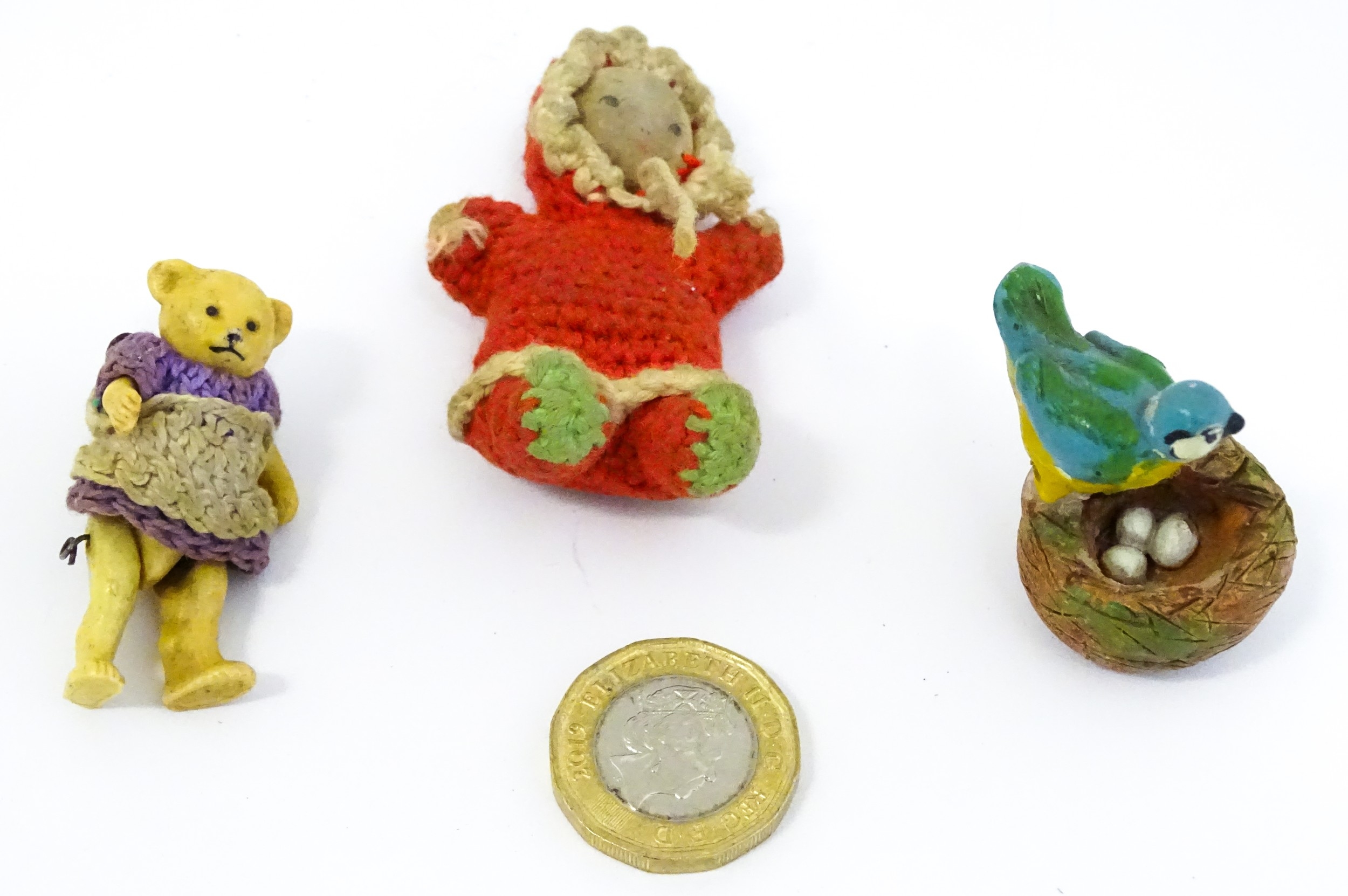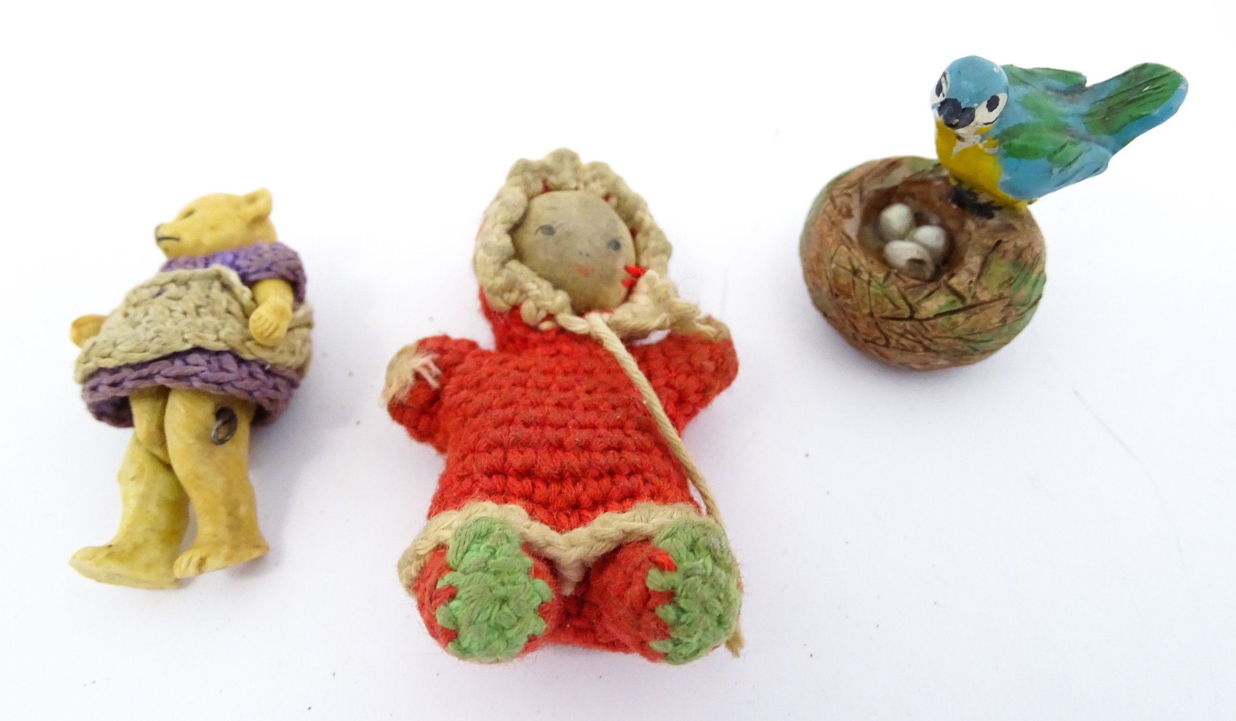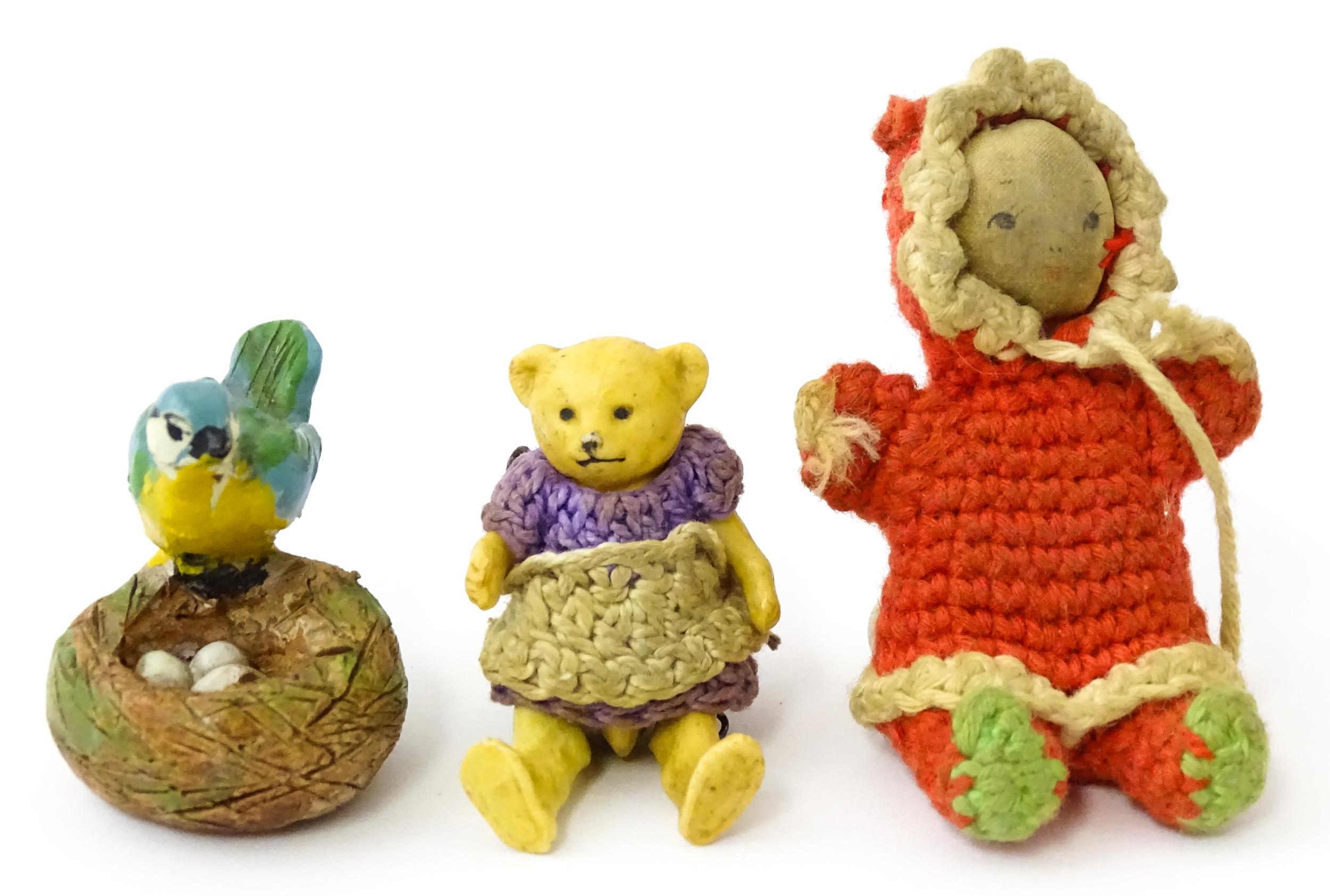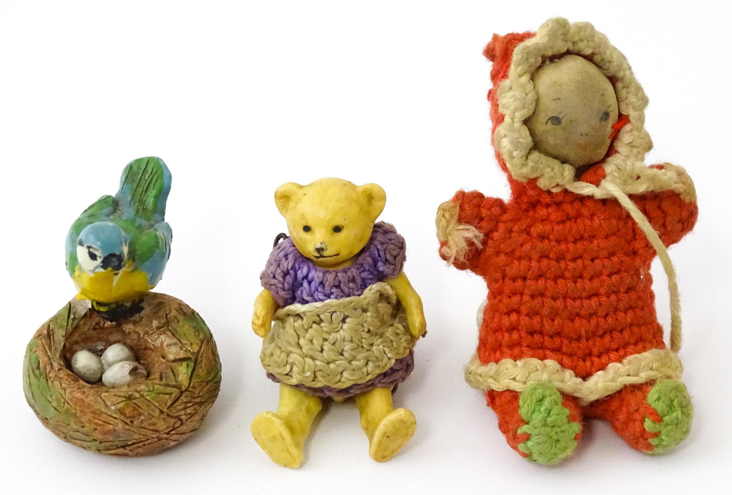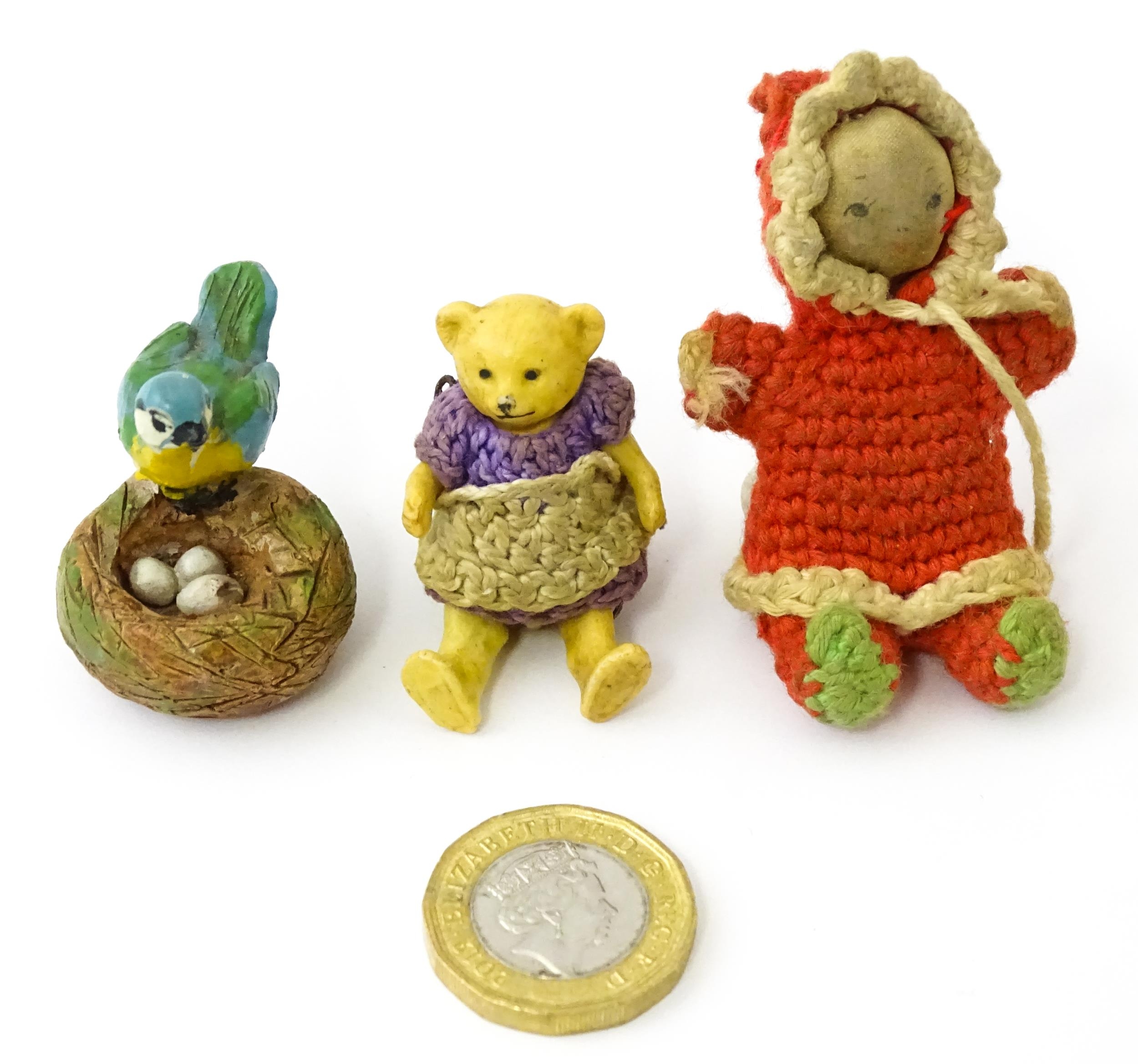 Toys: A Hertwig bisque dolls house teddy bear with pin jointed limbs wearing a purple and white crochet dress. Together with a small Japanese Amigurumi doll, and a small model of a bird with nest. Bear approx. 1 3/4" high (3)