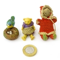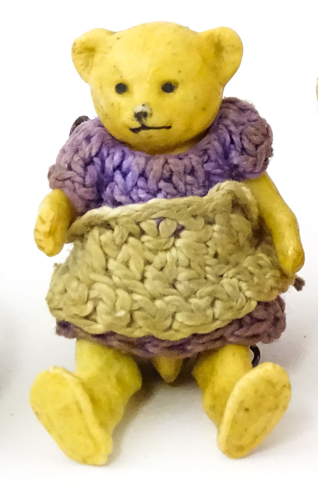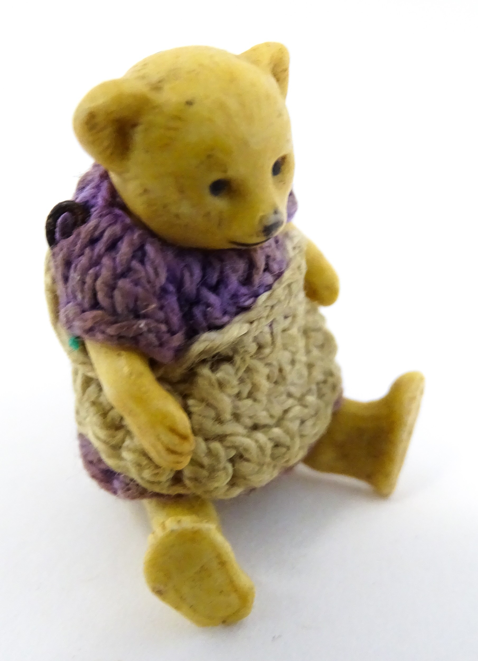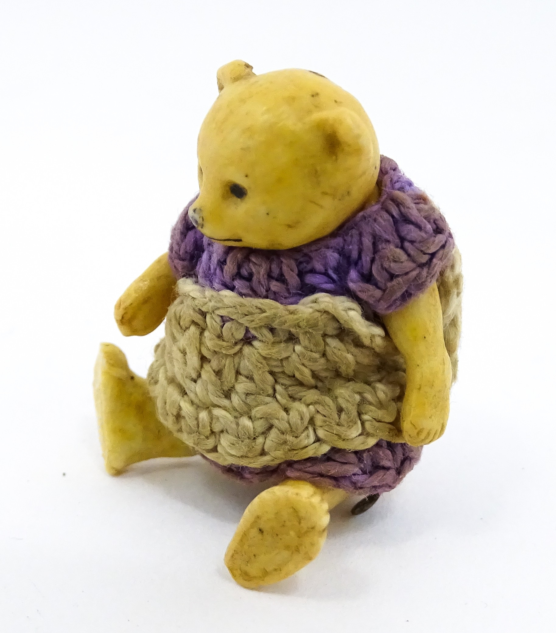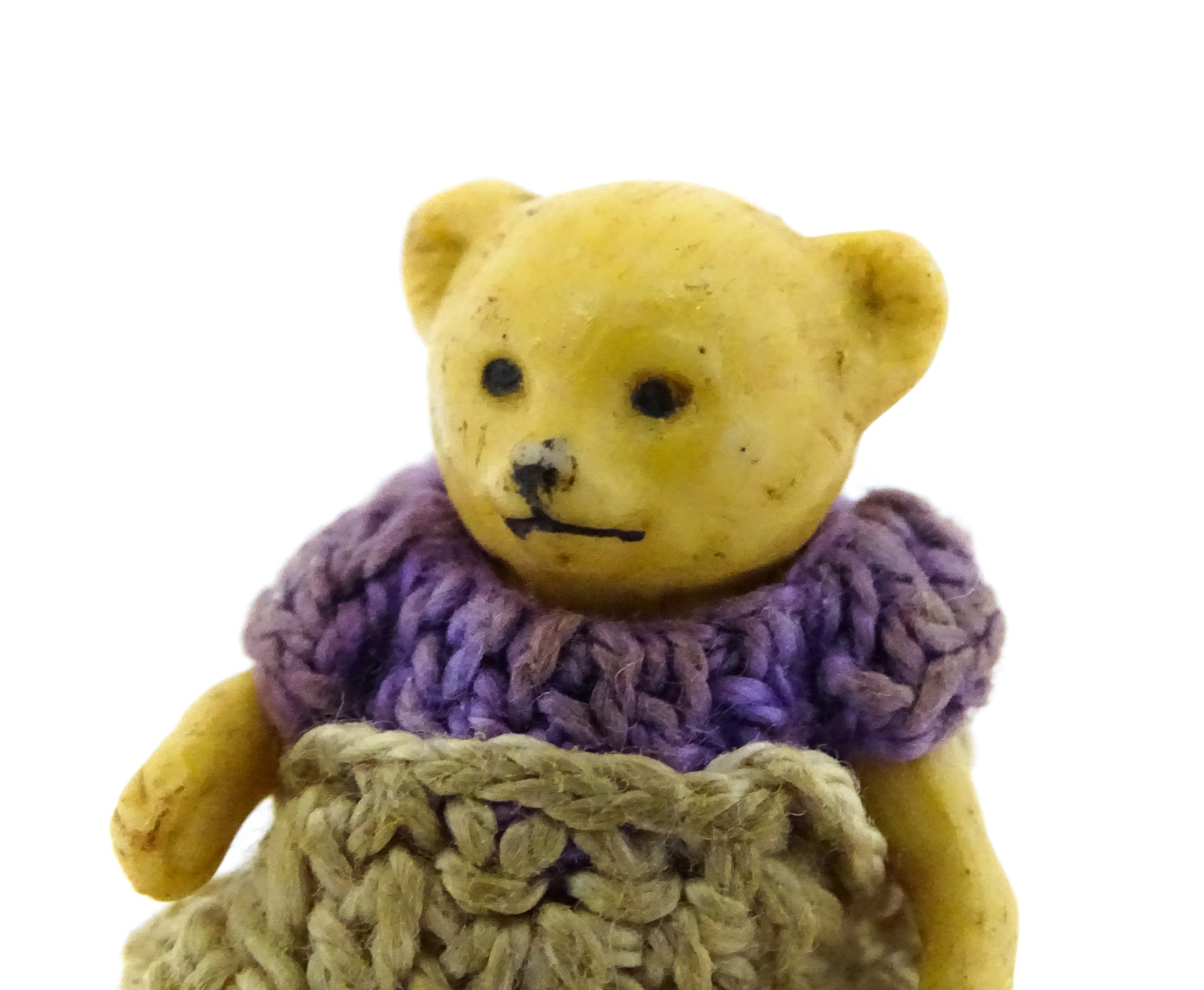 Toys: A Hertwig bisque dolls house teddy bear with pin jointed limbs wearing a purple and white crochet dress. Together with a small Japanese Amigurumi doll, and a small model of a bird with nest. Bear approx. 1 3/4" high (3)
