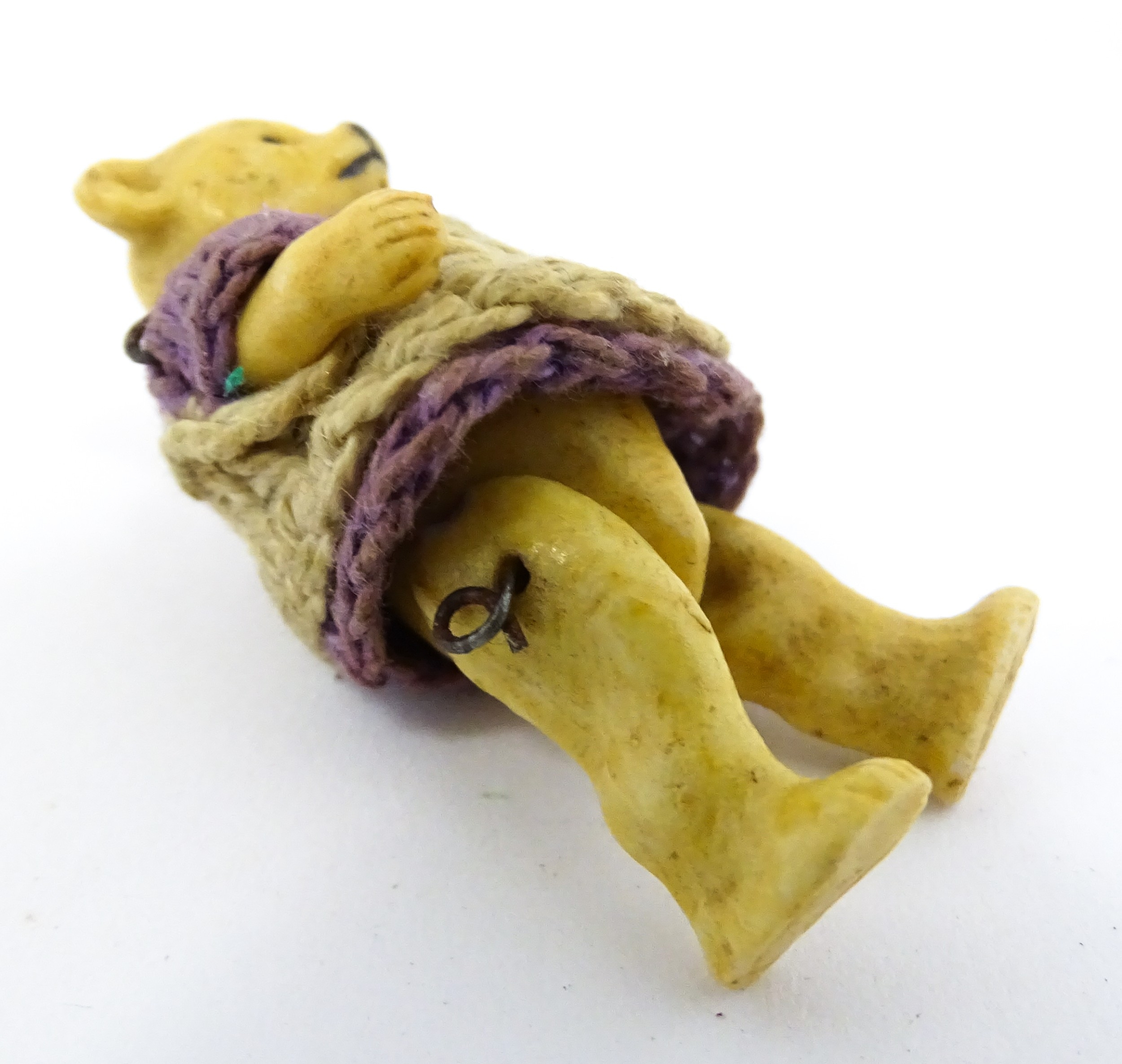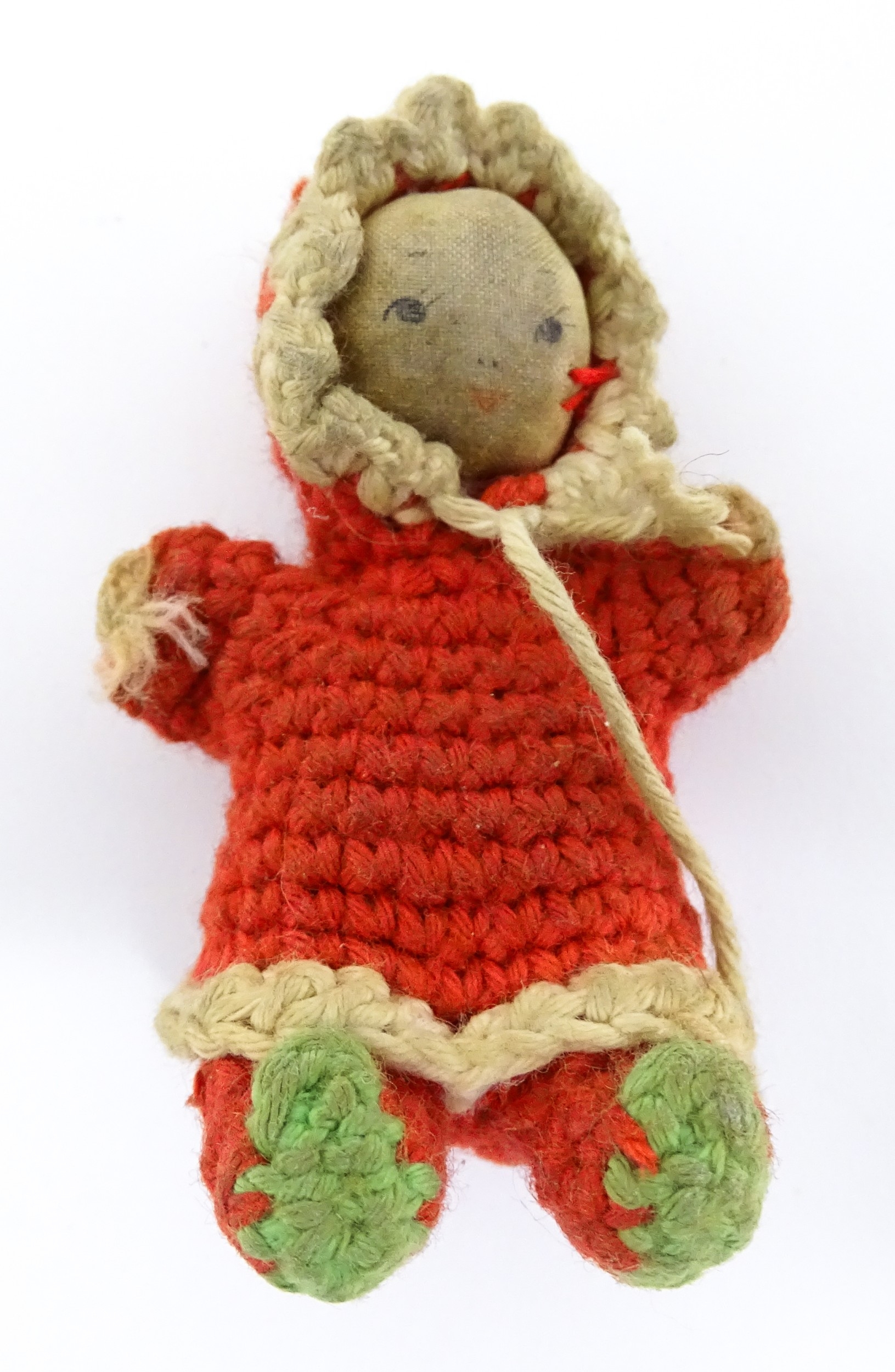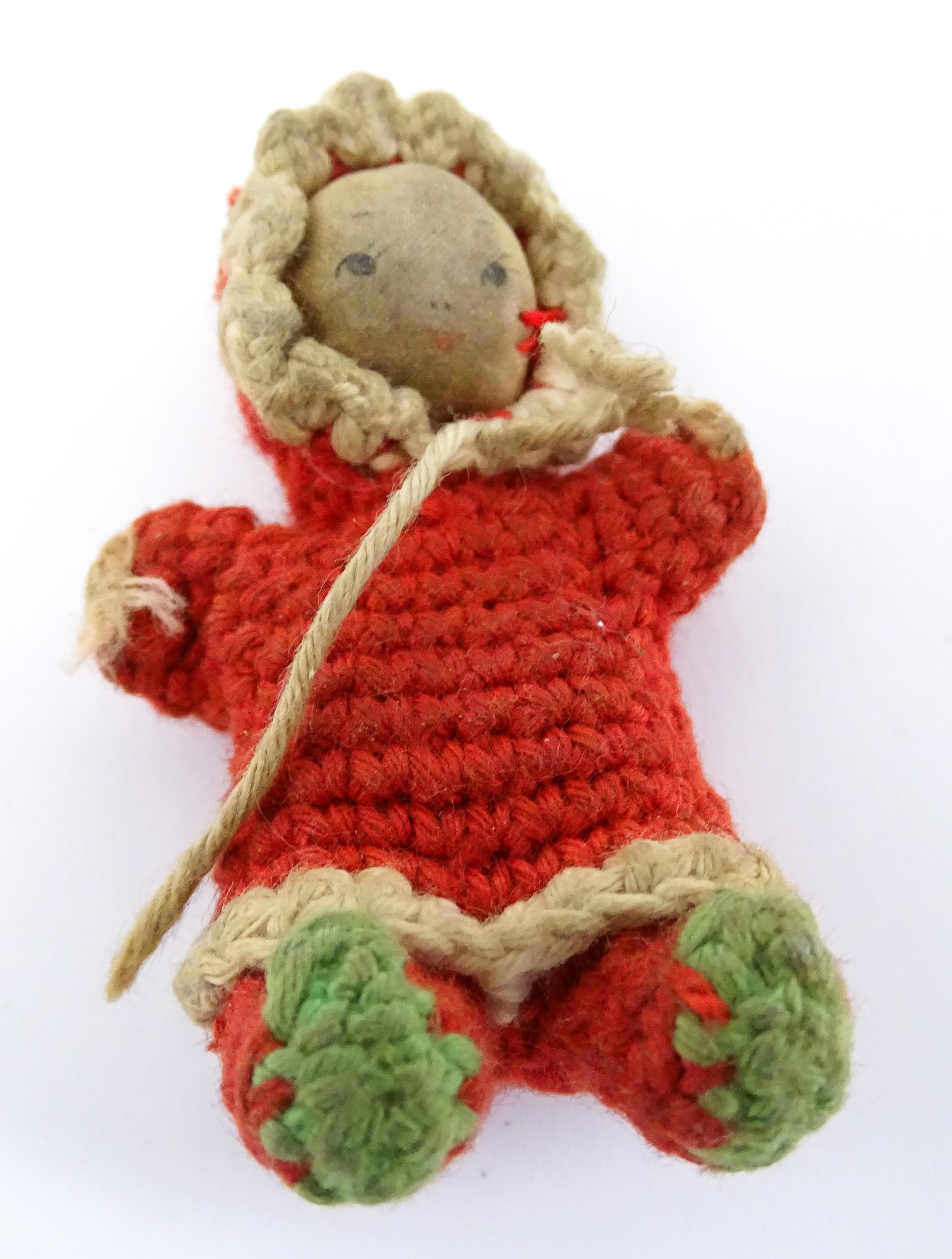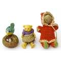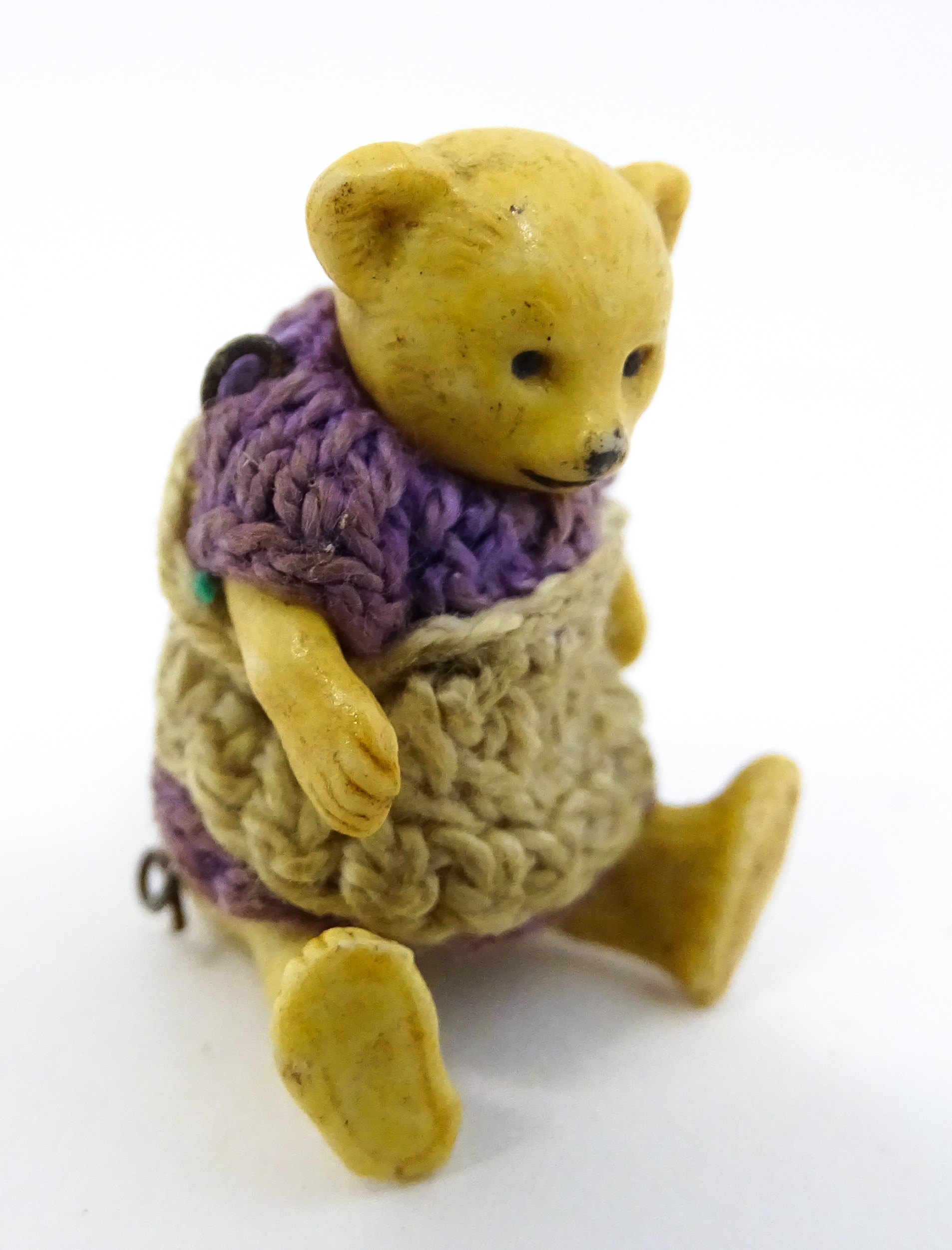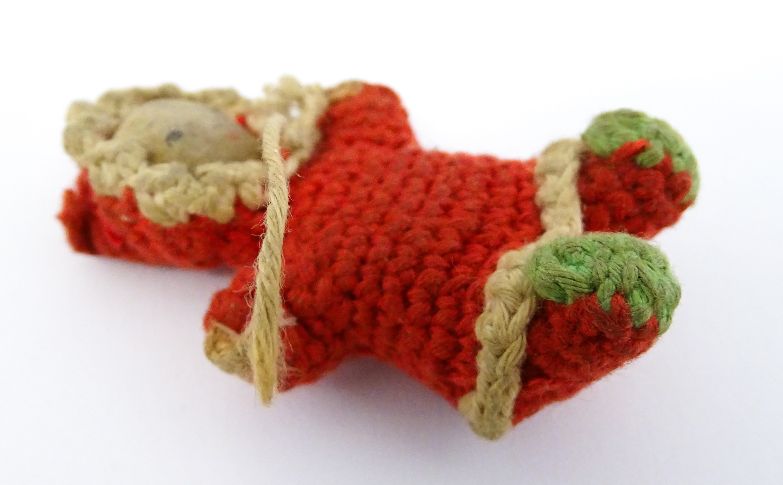 Toys: A Hertwig bisque dolls house teddy bear with pin jointed limbs wearing a purple and white crochet dress. Together with a small Japanese Amigurumi doll, and a small model of a bird with nest. Bear approx. 1 3/4" high (3)
