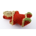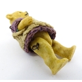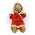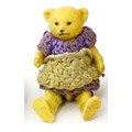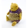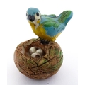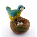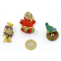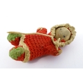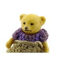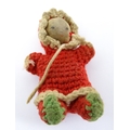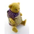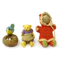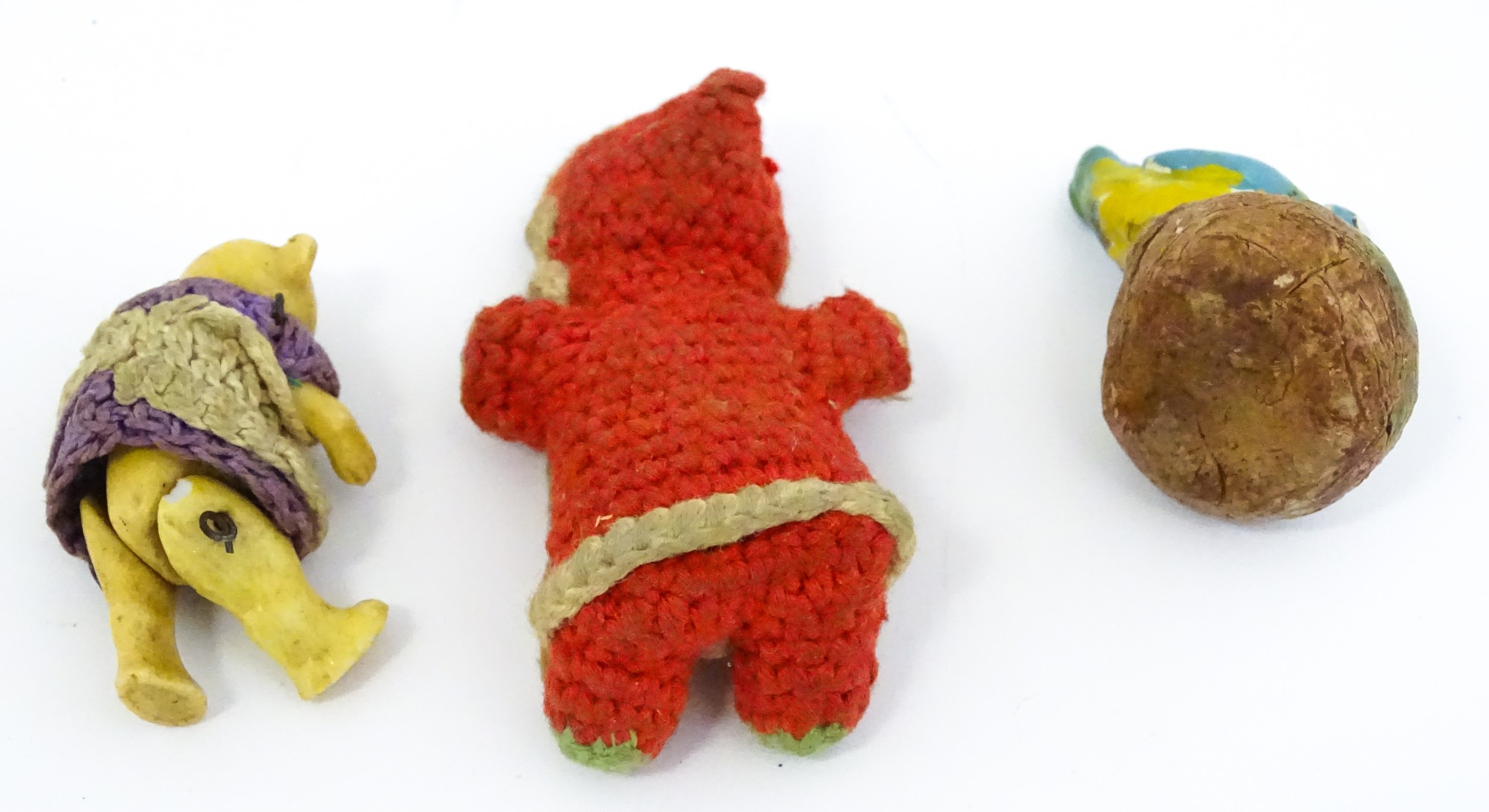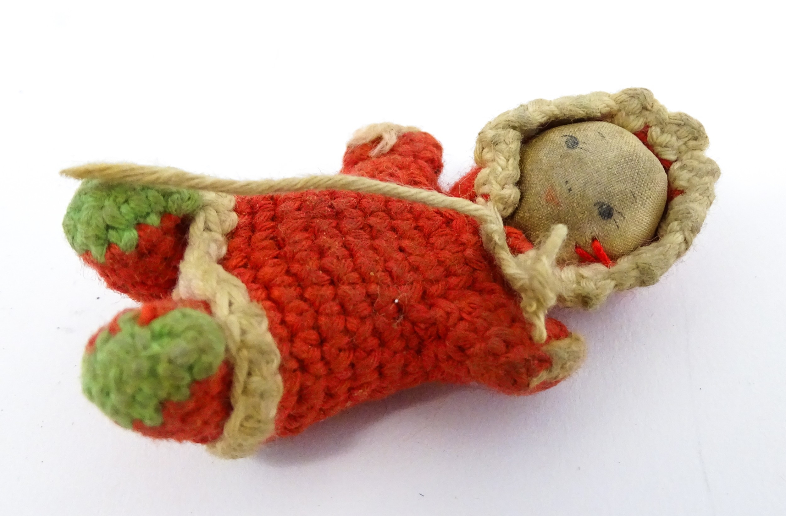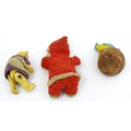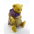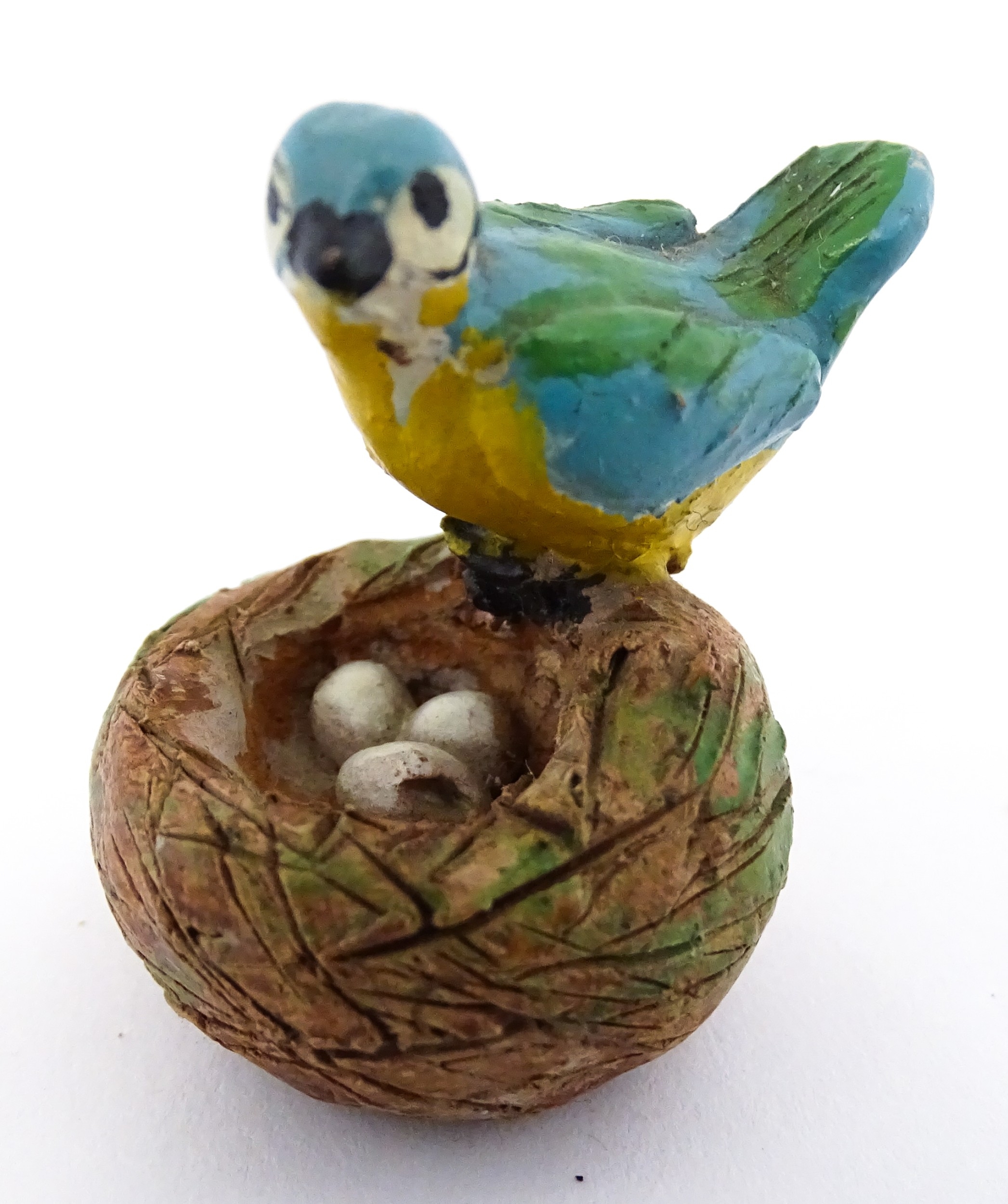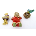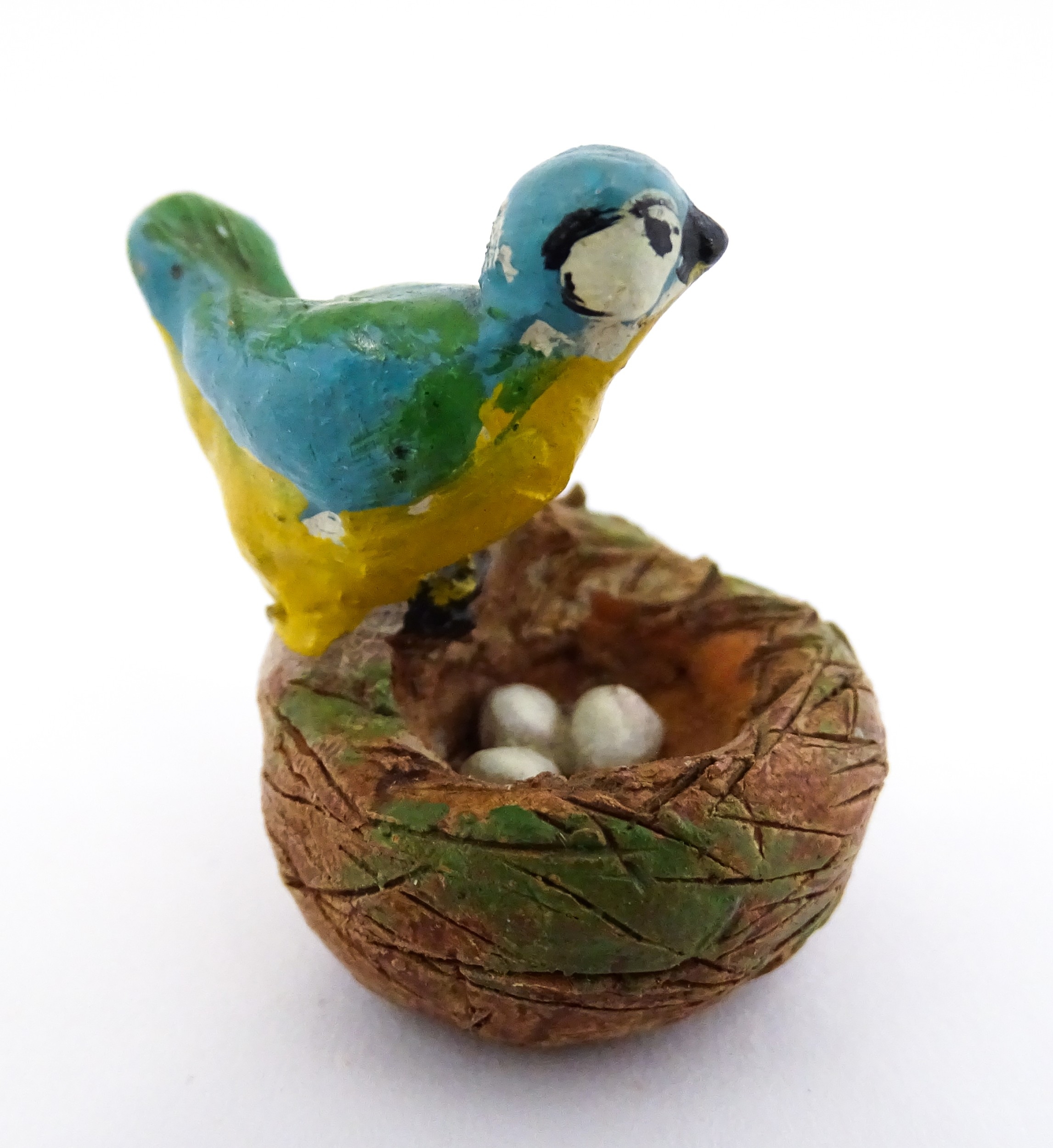 Toys: A Hertwig bisque dolls house teddy bear with pin jointed limbs wearing a purple and white crochet dress. Together with a small Japanese Amigurumi doll, and a small model of a bird with nest. Bear approx. 1 3/4" high (3)