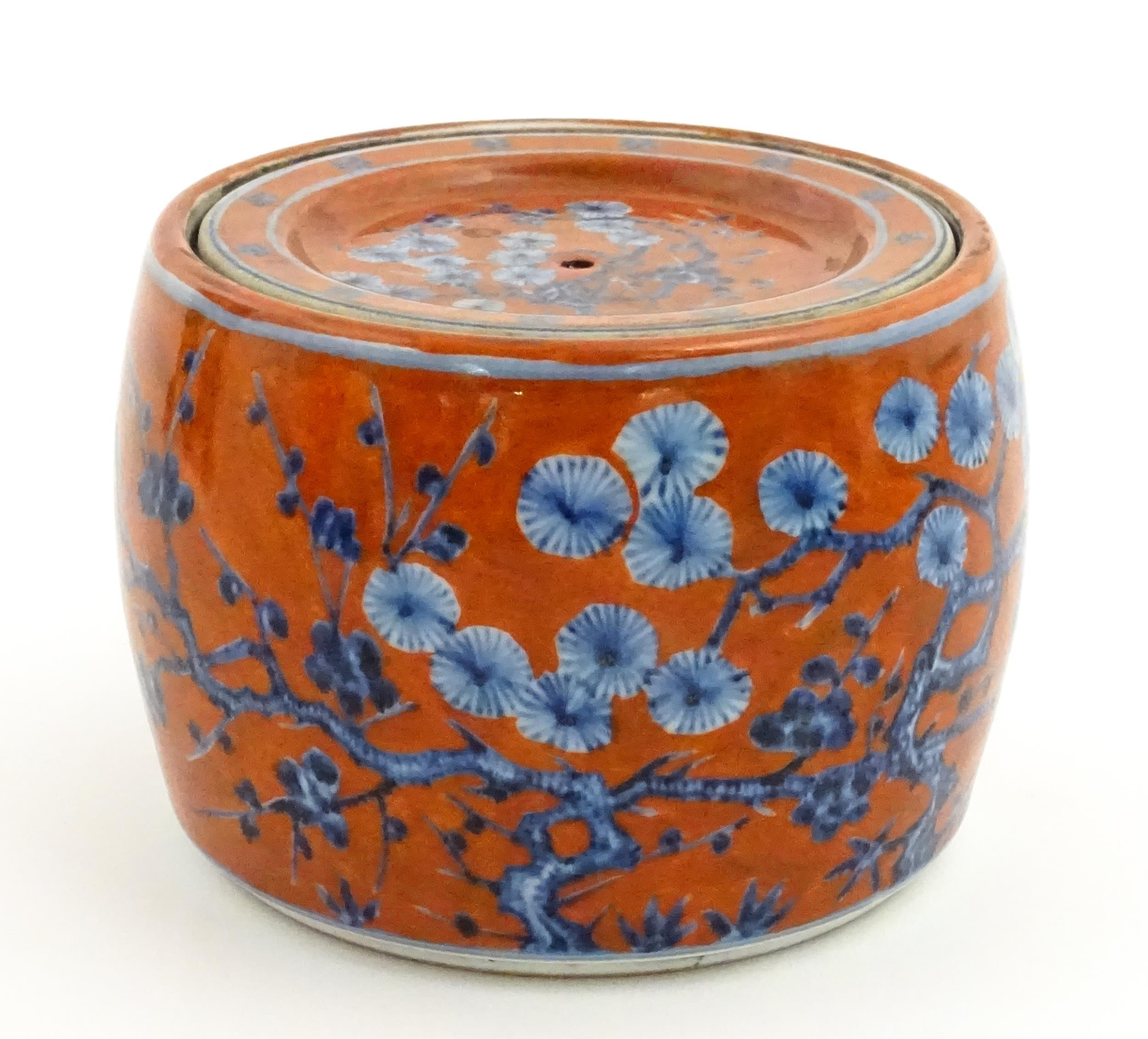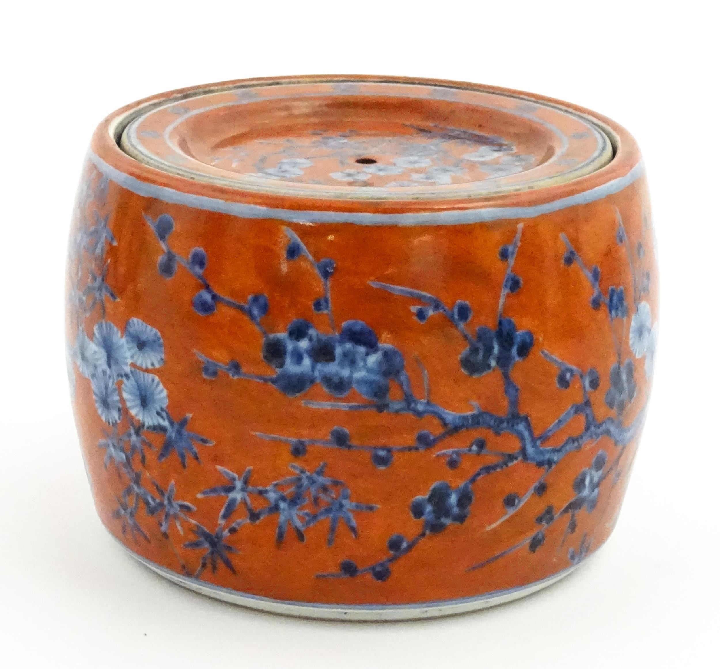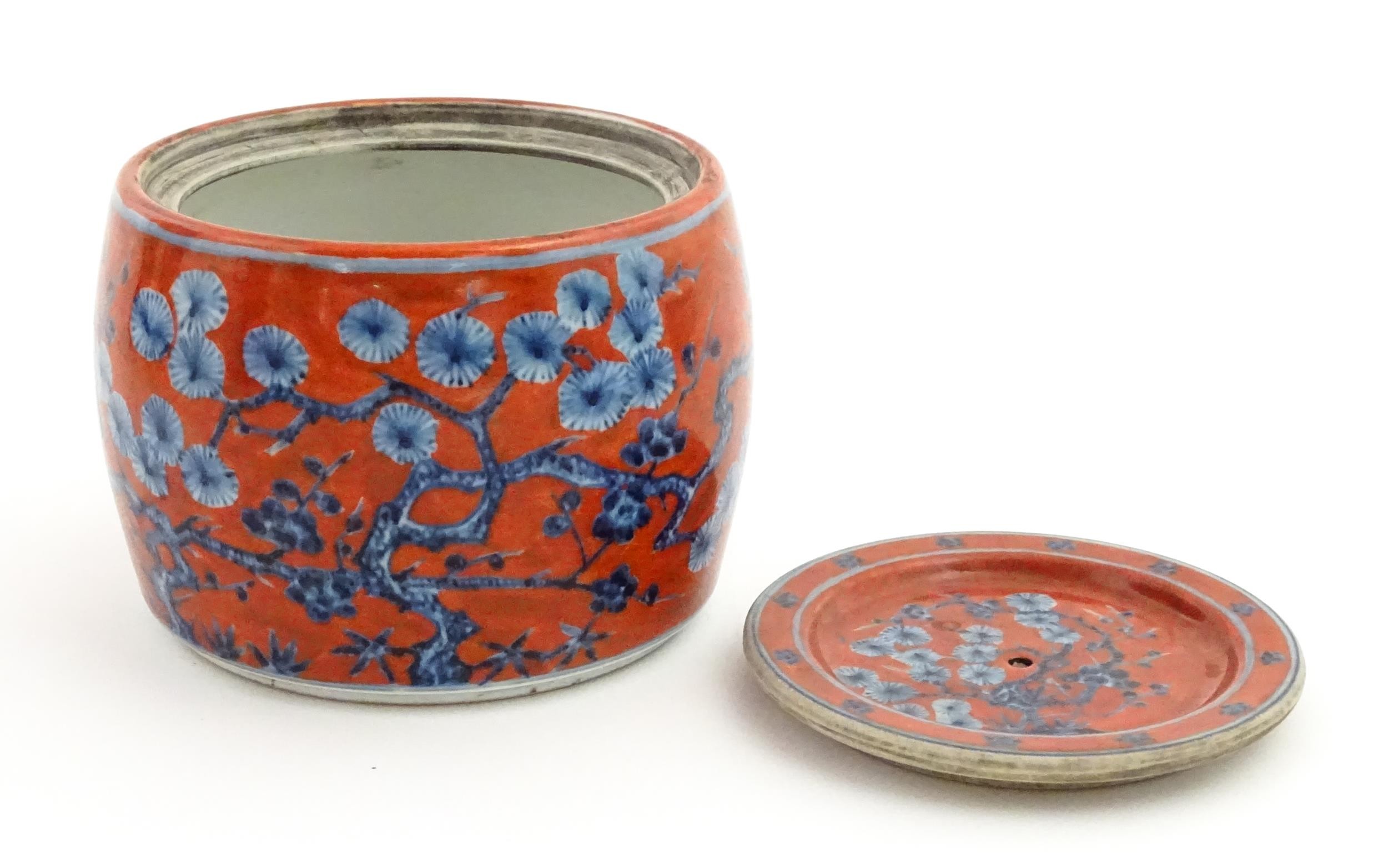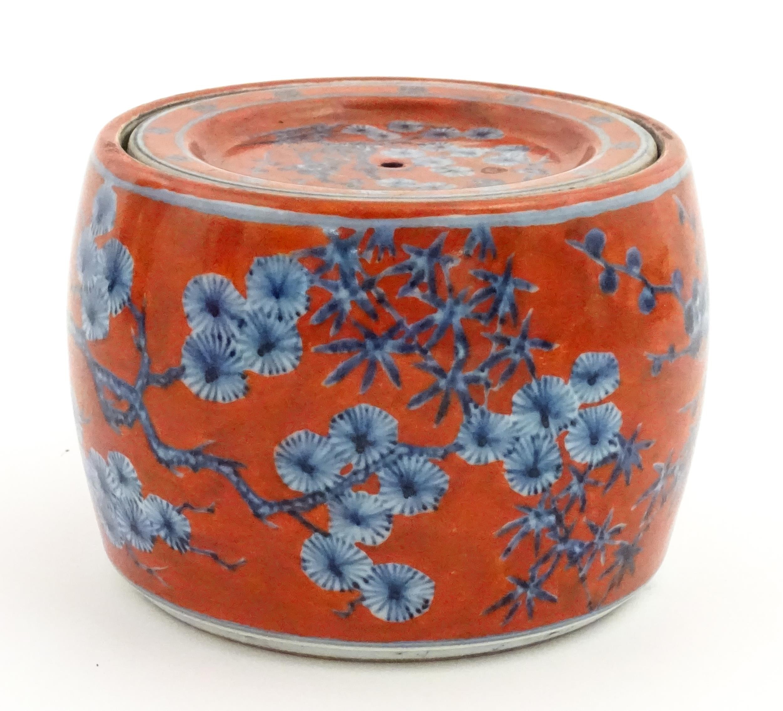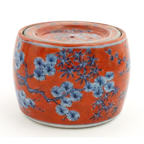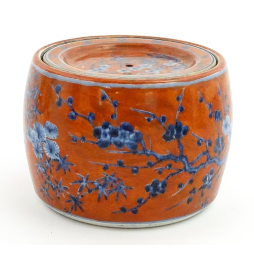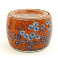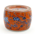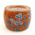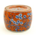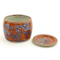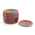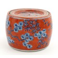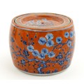 A Chinese blue and iron red pot and cover with floral and foliate decoration. Character marks under. Approx. 4" high