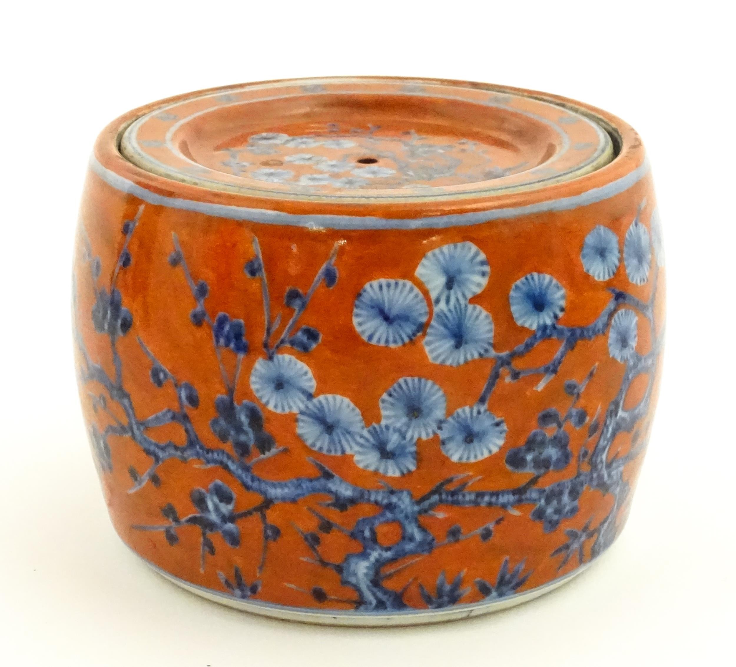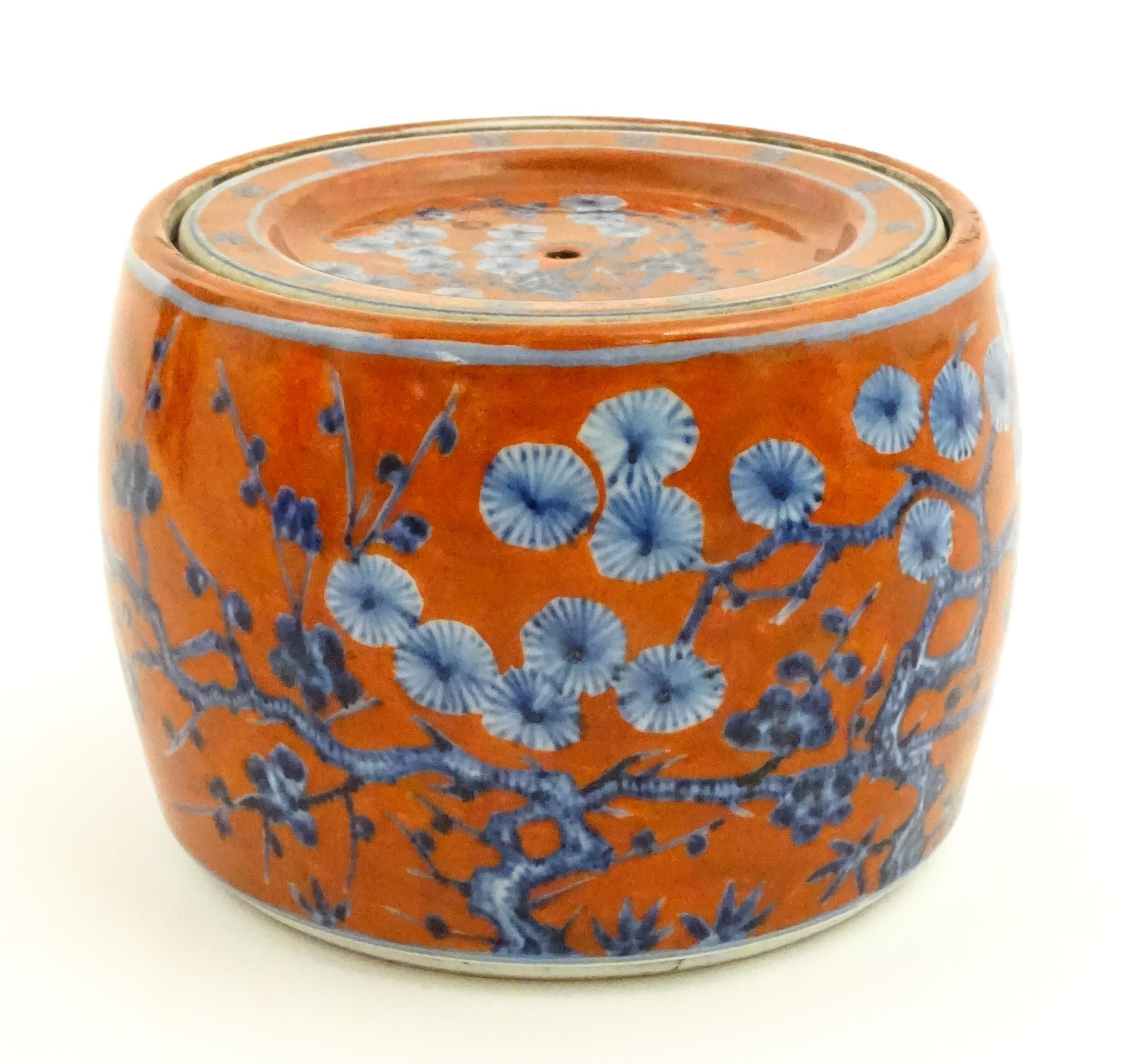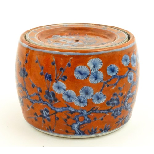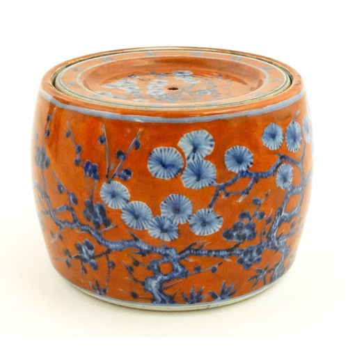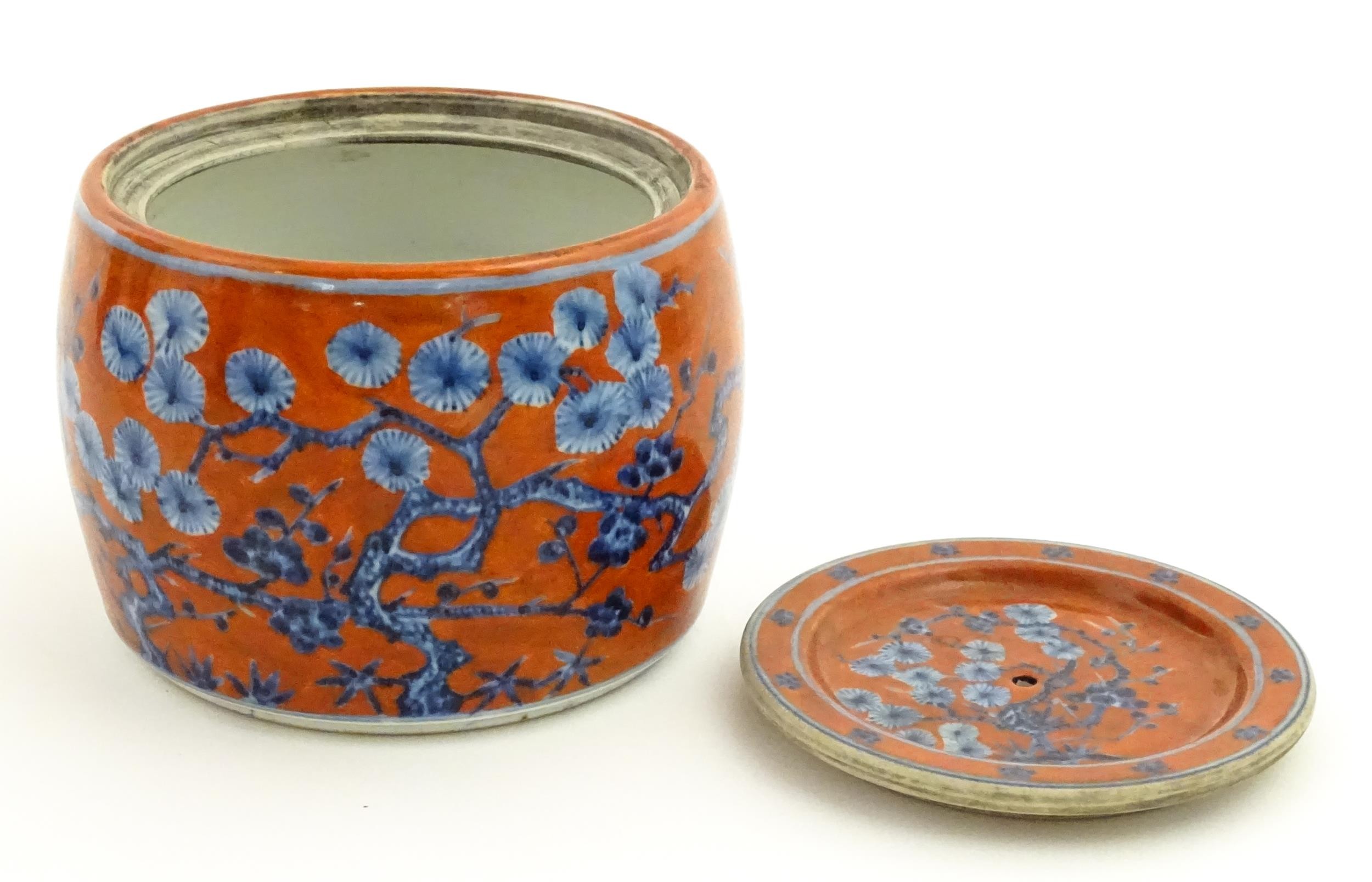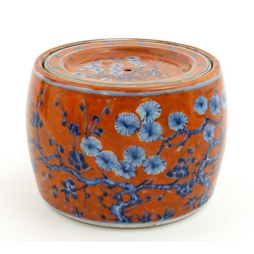 A Chinese blue and iron red pot and cover with floral and foliate decoration. Character marks under. Approx. 4" high
