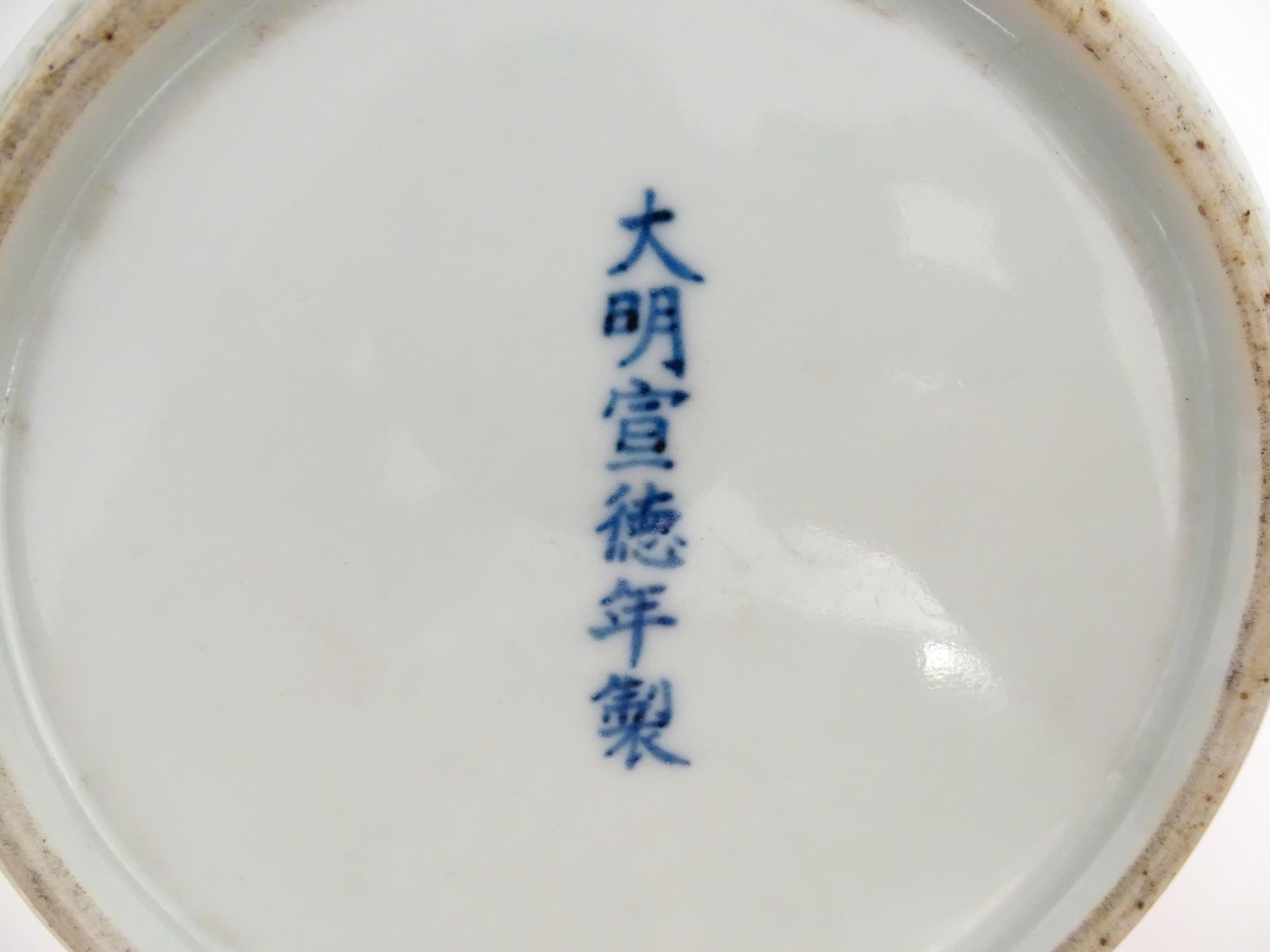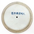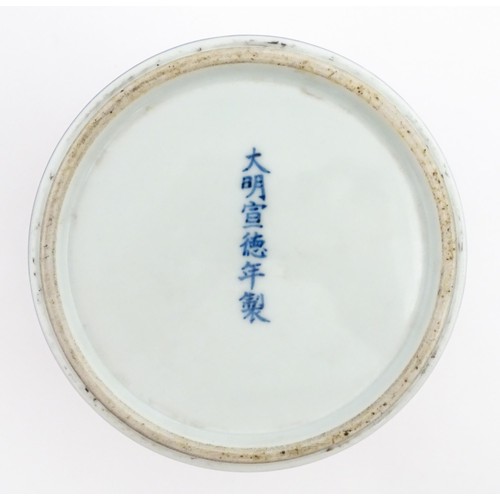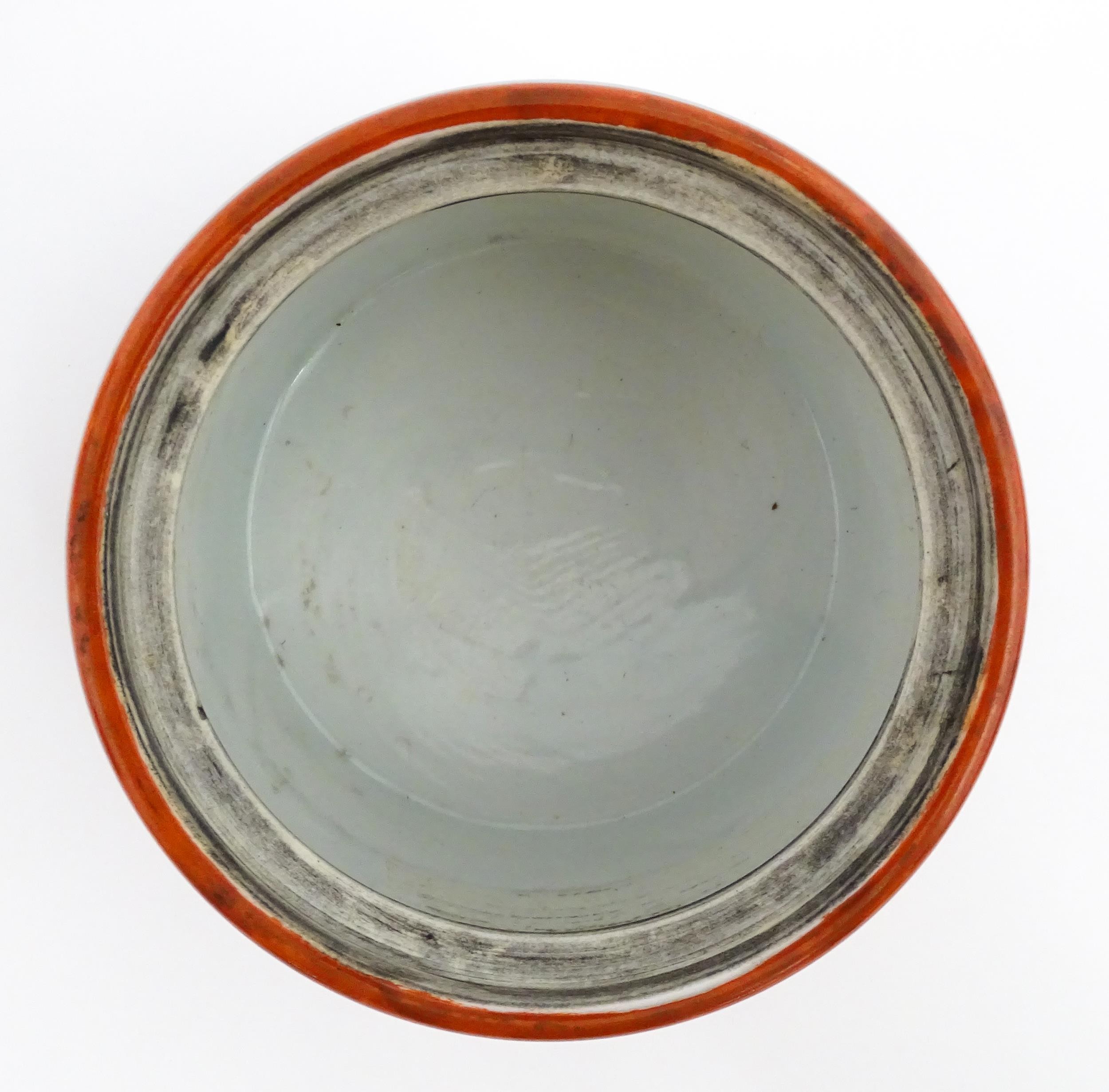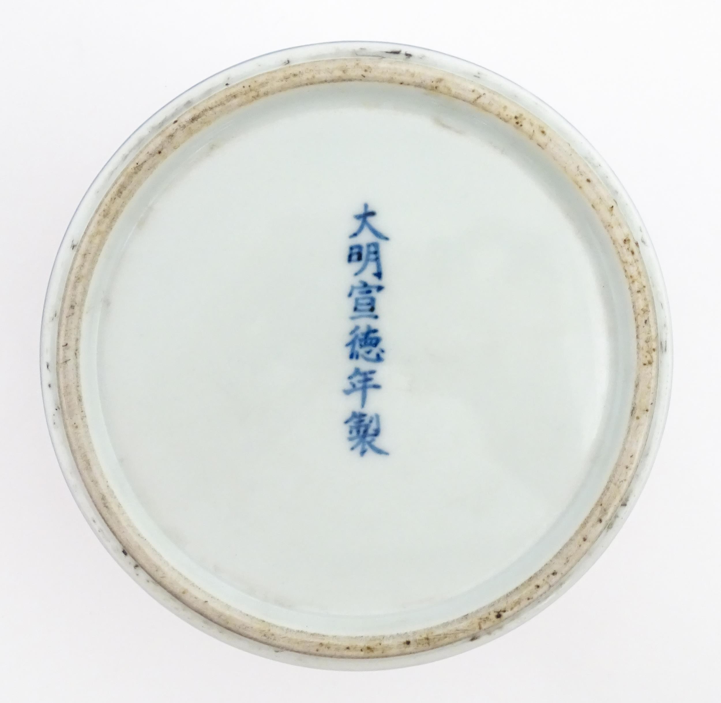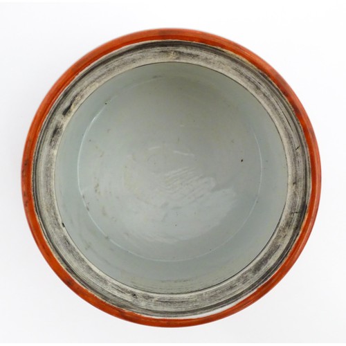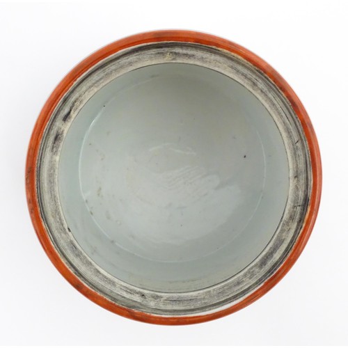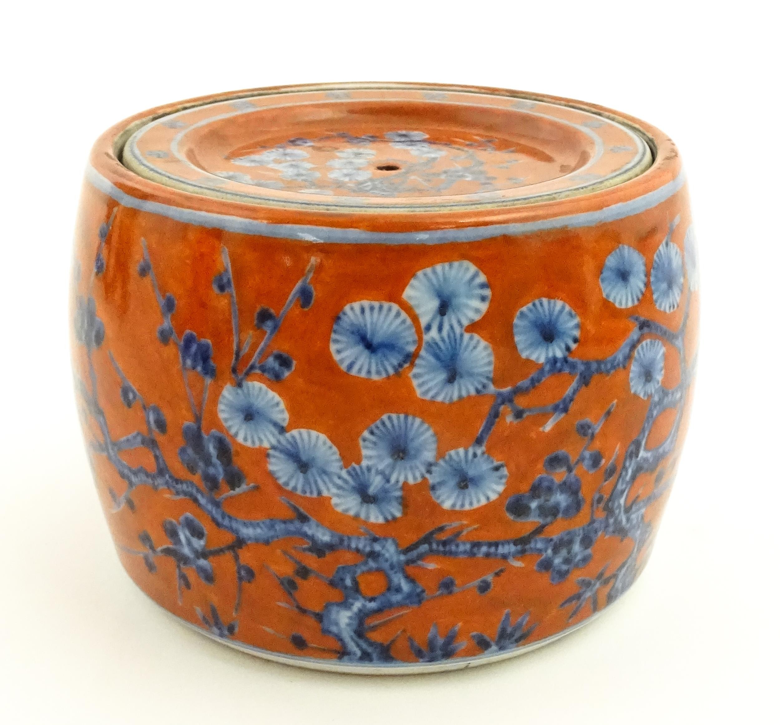 A Chinese blue and iron red pot and cover with floral and foliate decoration. Character marks under. Approx. 4" high