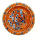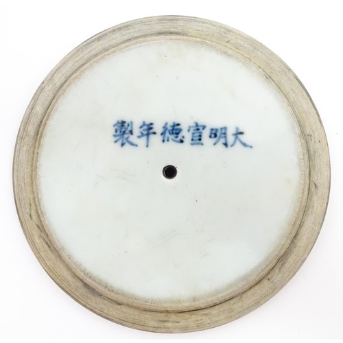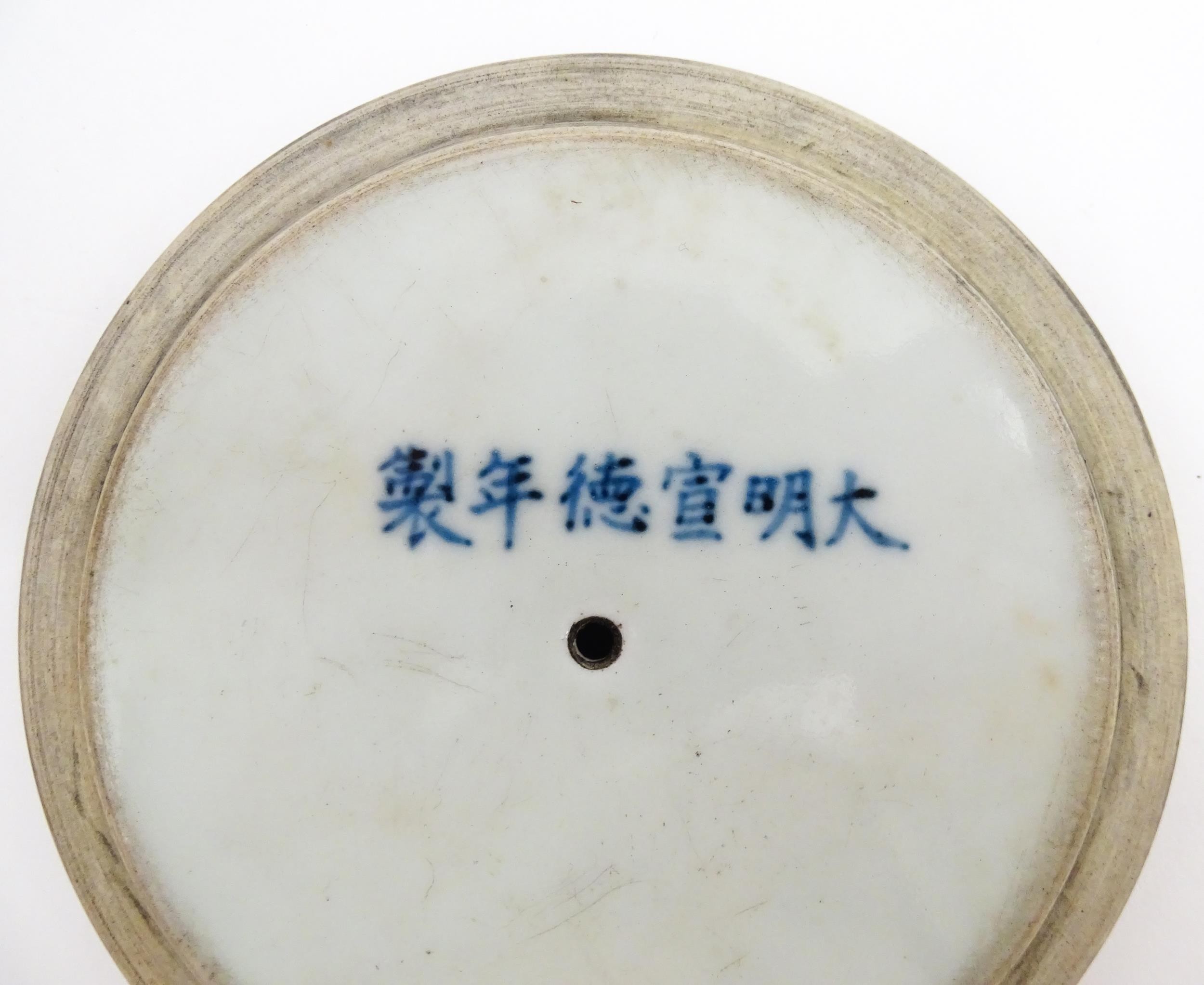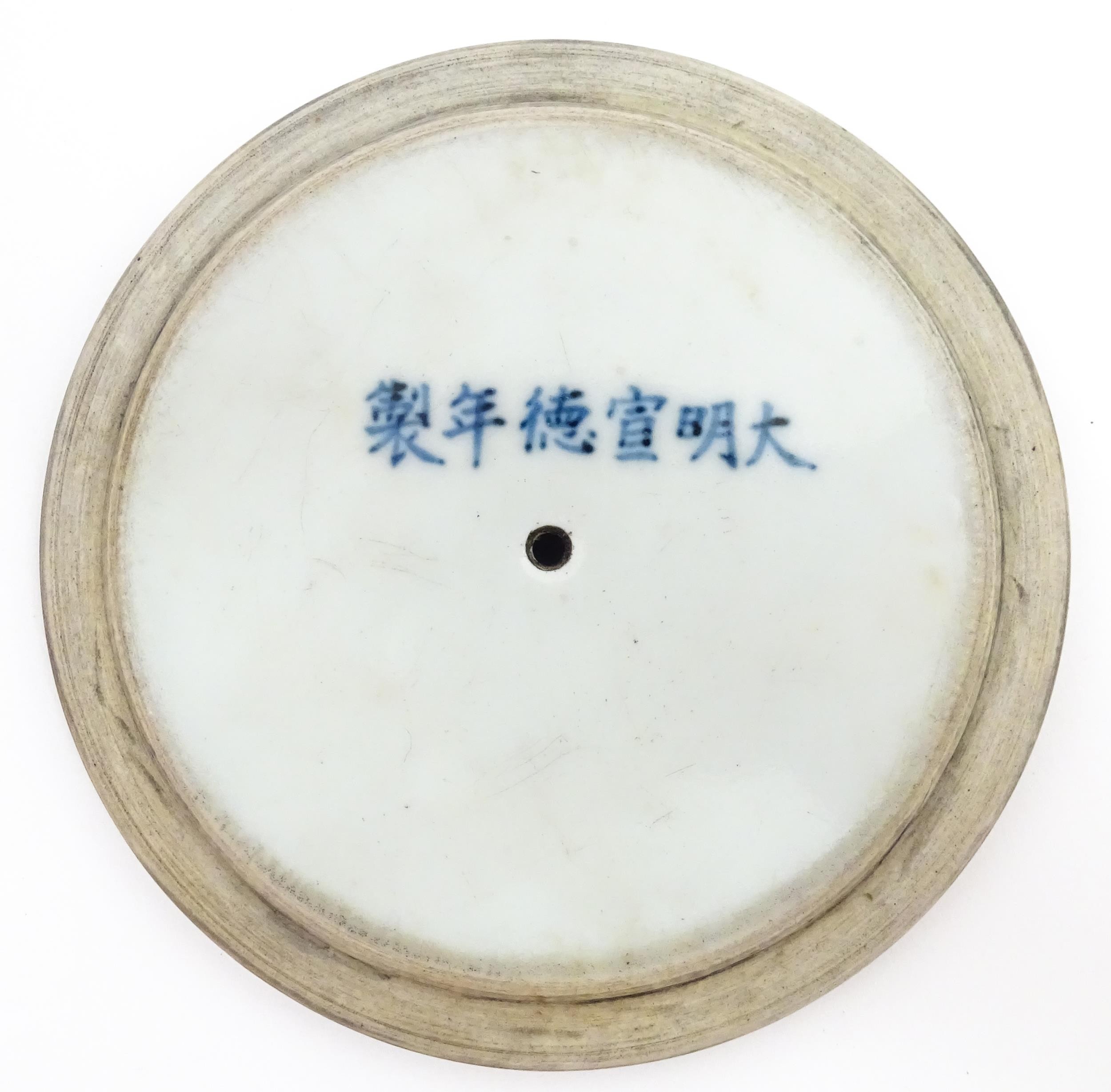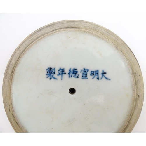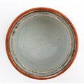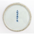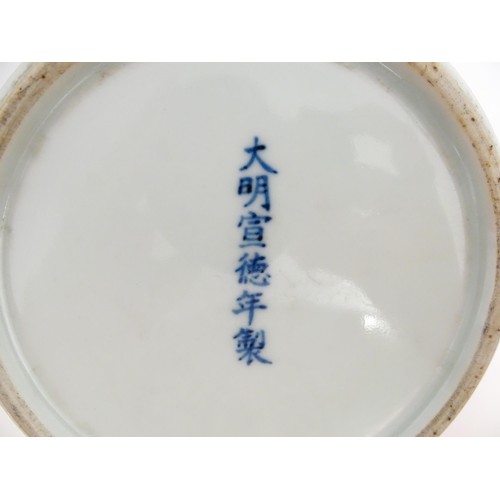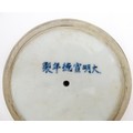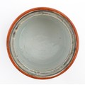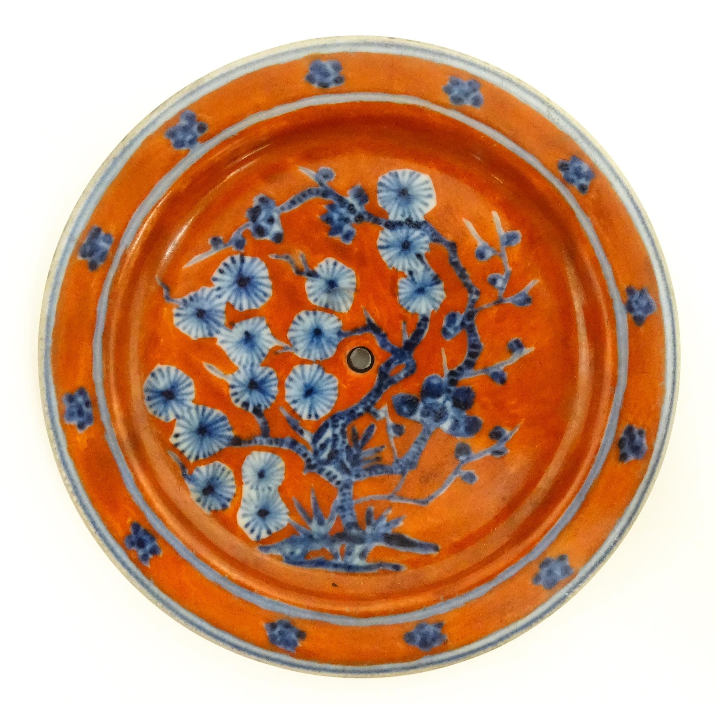 A Chinese blue and iron red pot and cover with floral and foliate decoration. Character marks under. Approx. 4" high