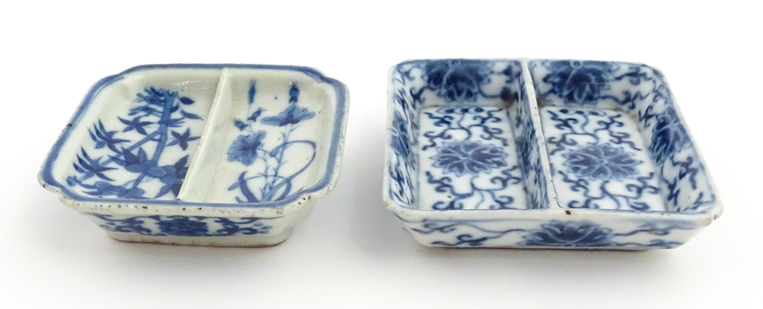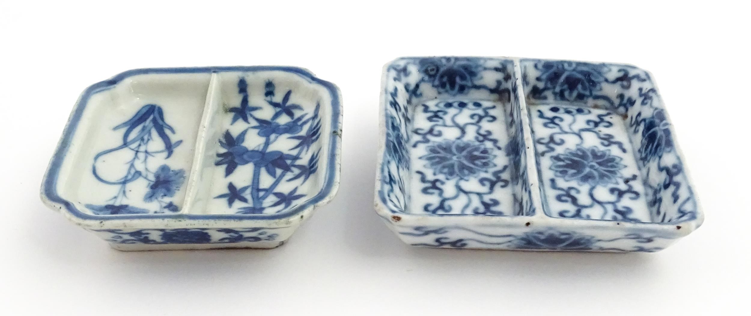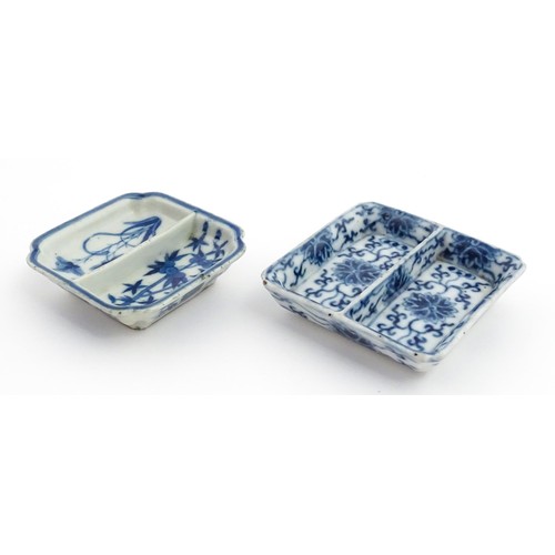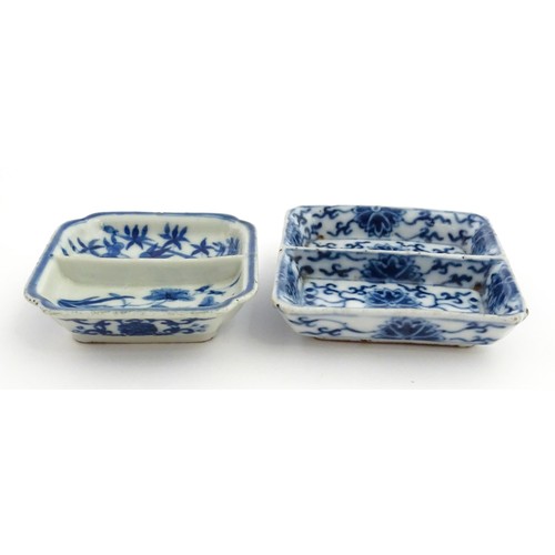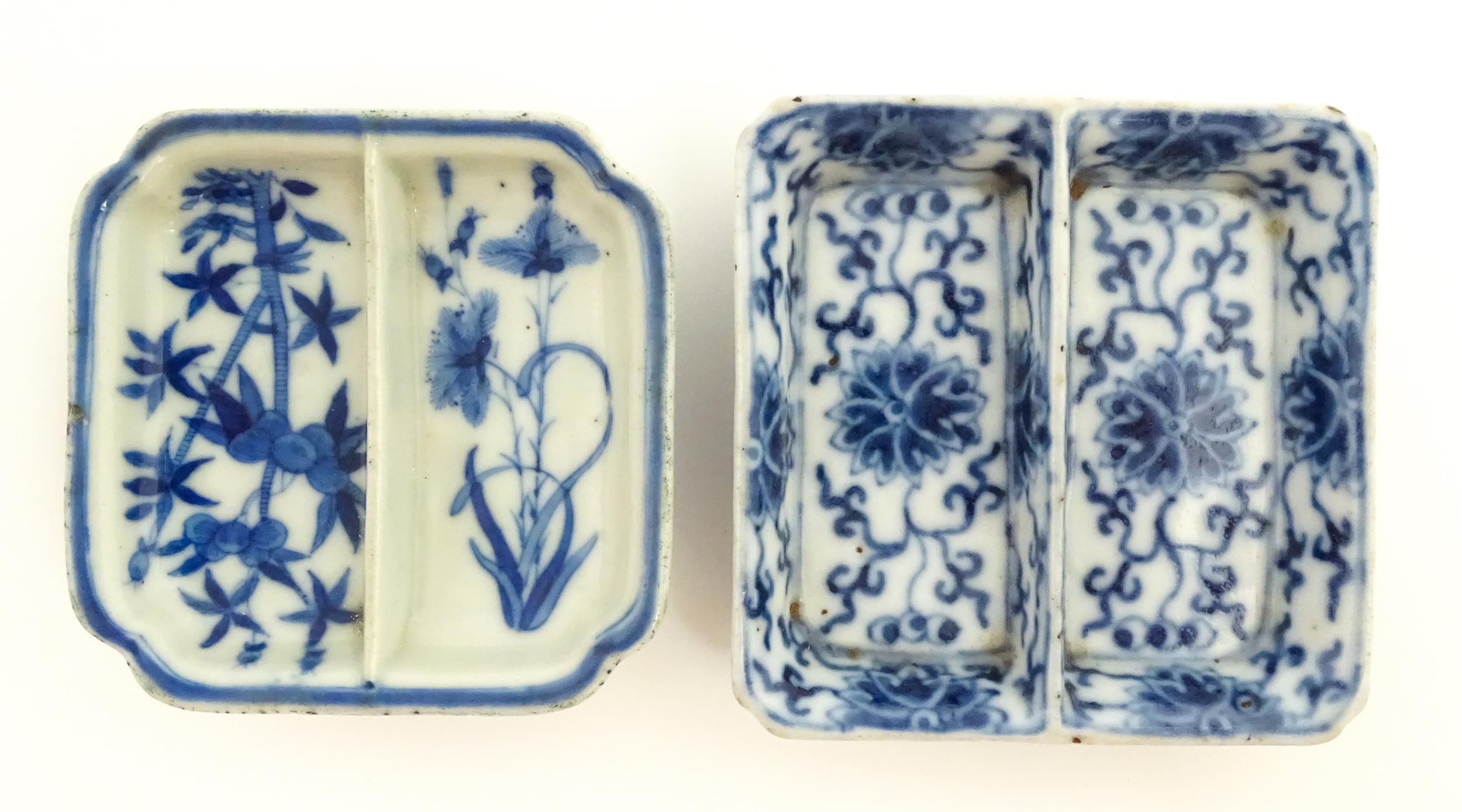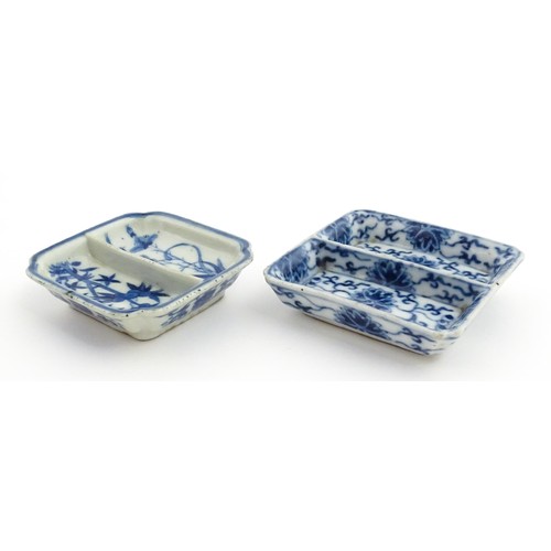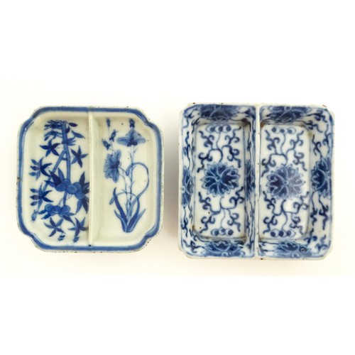 Two small Chinese blue and white dishes with central division, possibly for ink, decorated with flowers and foliage. Both bearing Character marks under. Largest approx. 3 1/4" wide (2)