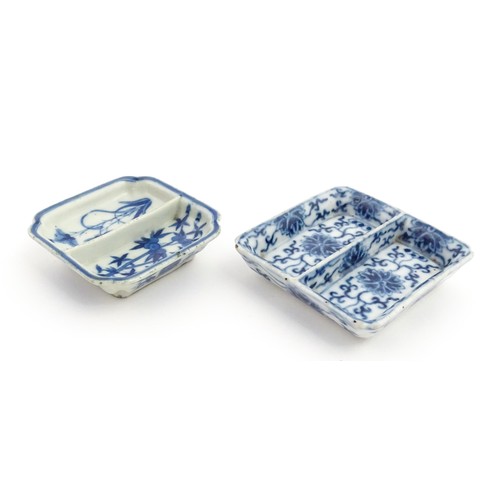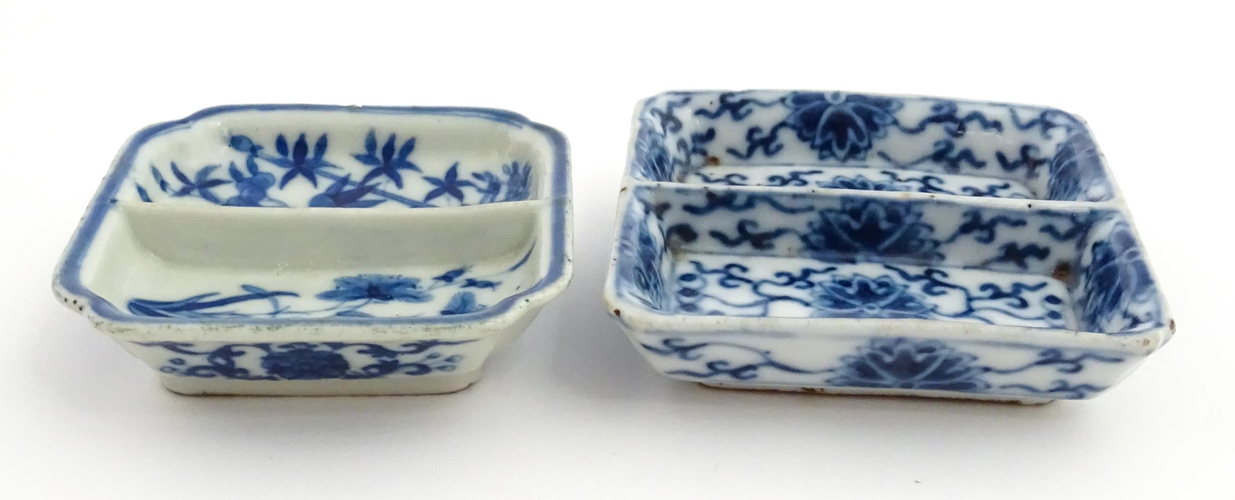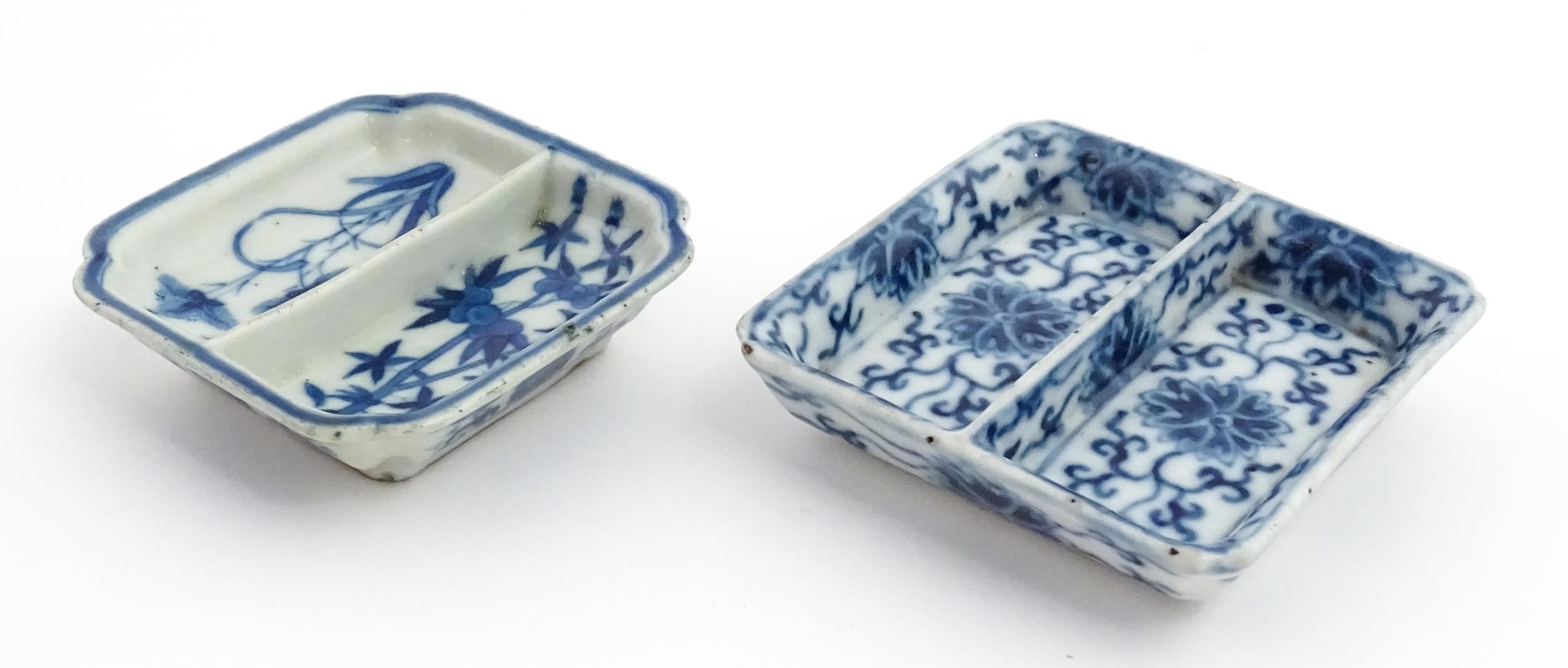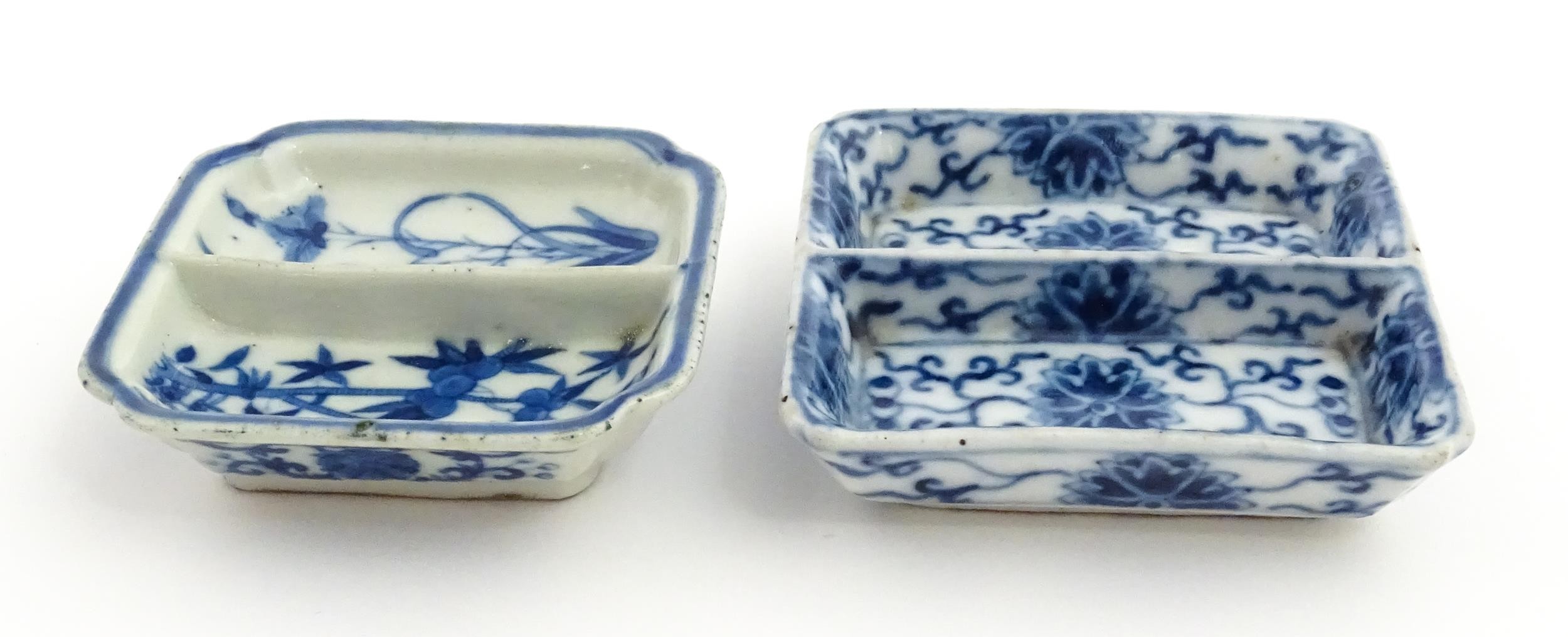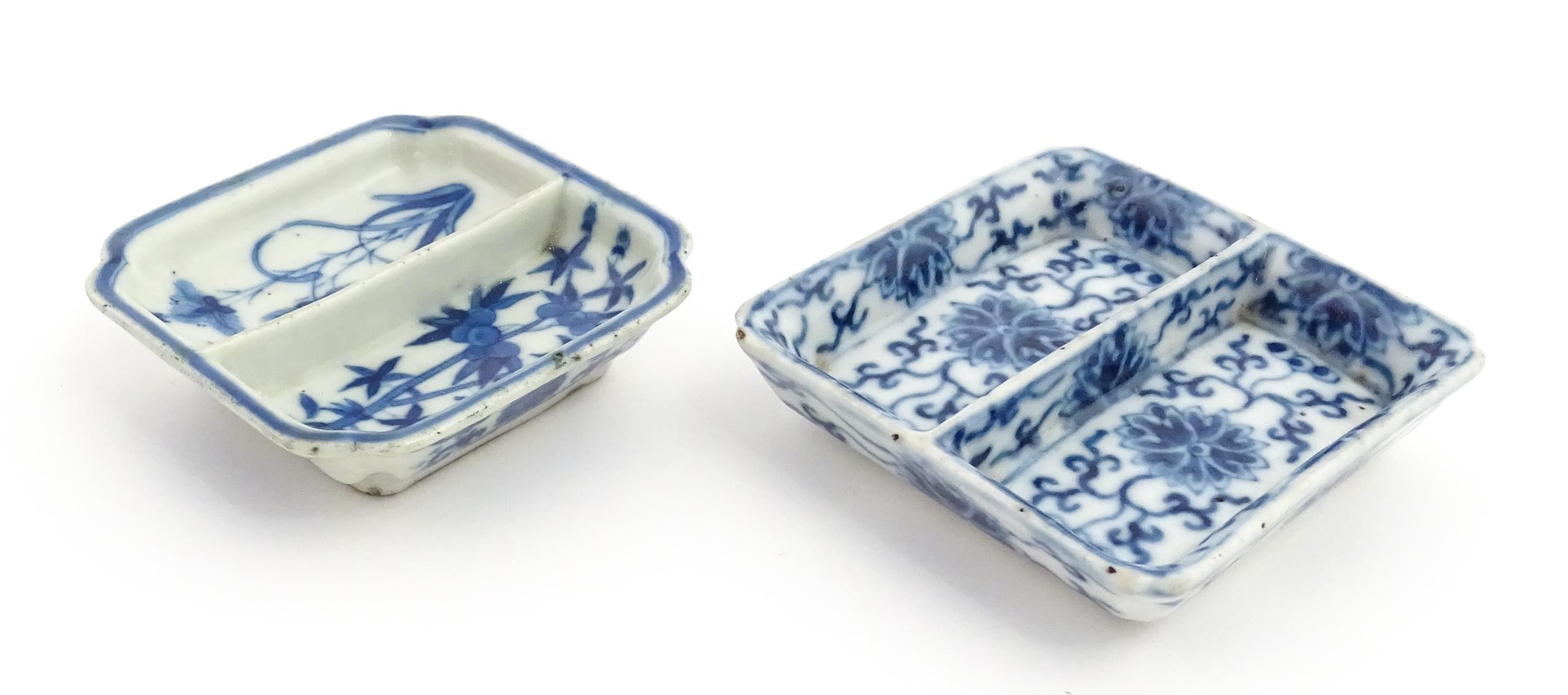 Two small Chinese blue and white dishes with central division, possibly for ink, decorated with flowers and foliage. Both bearing Character marks under. Largest approx. 3 1/4" wide (2)
