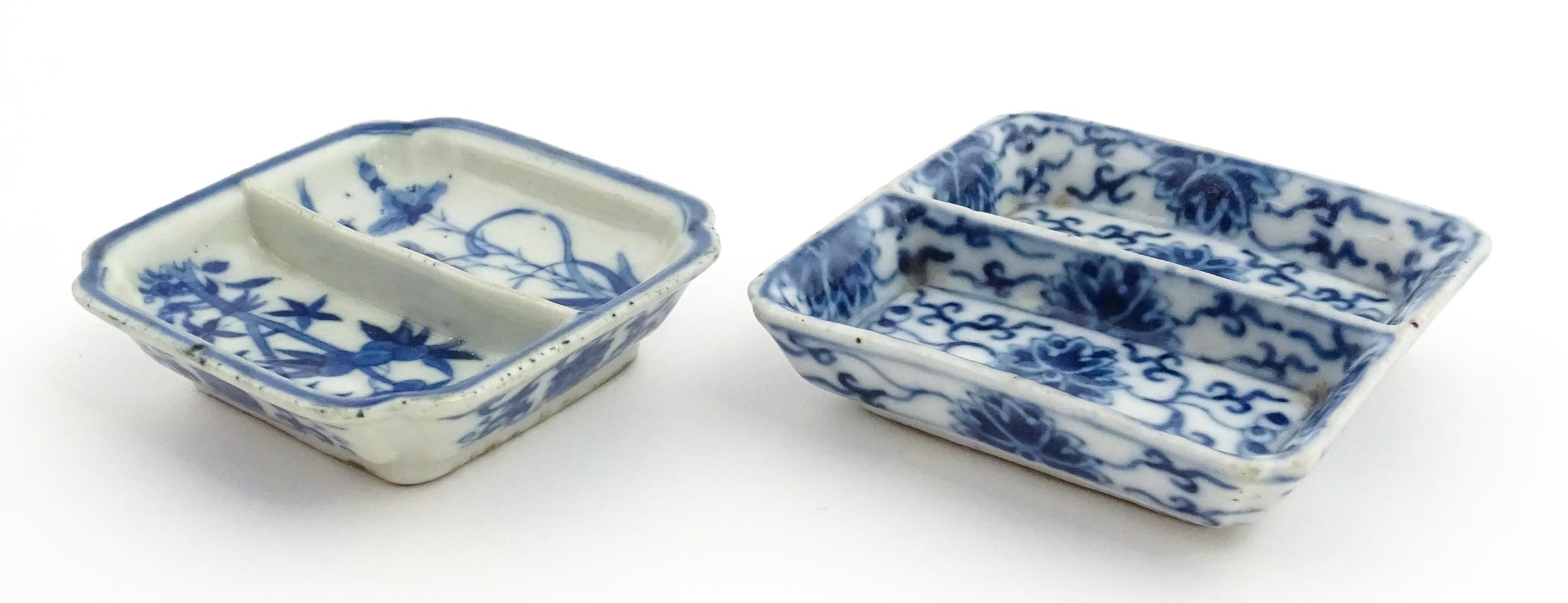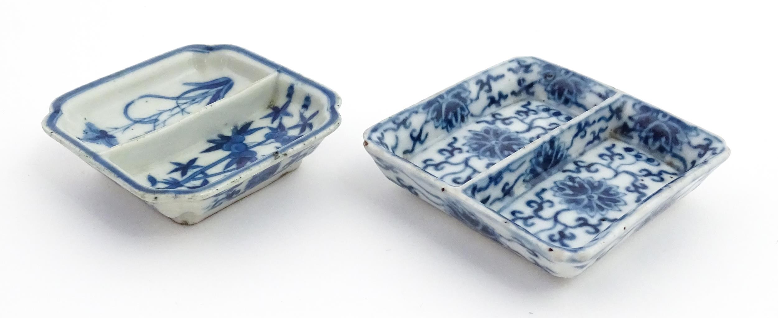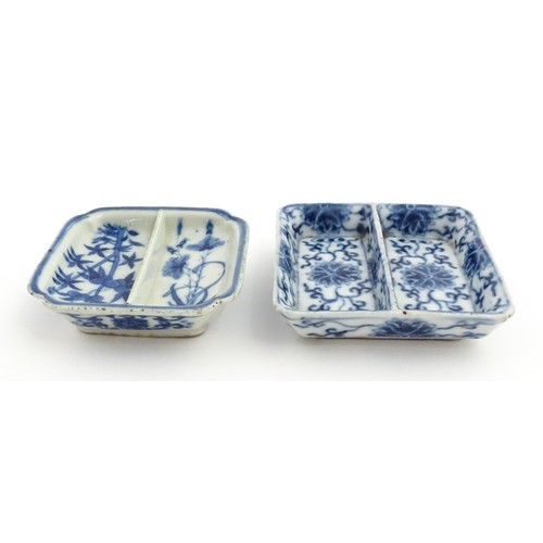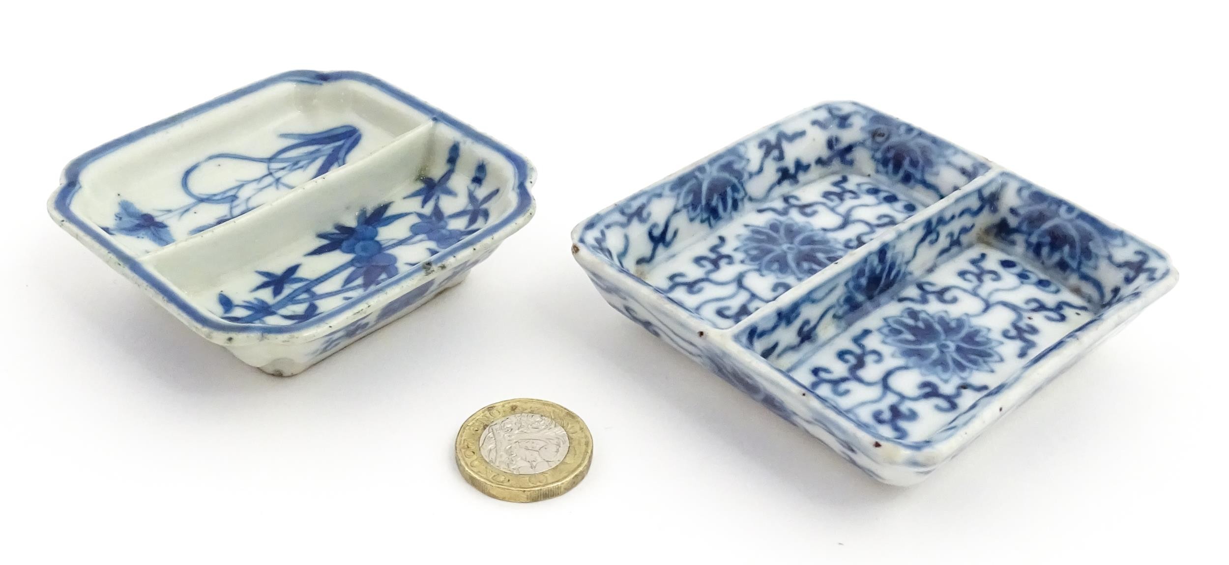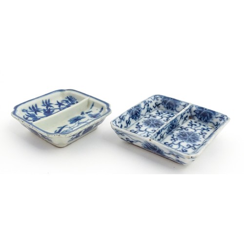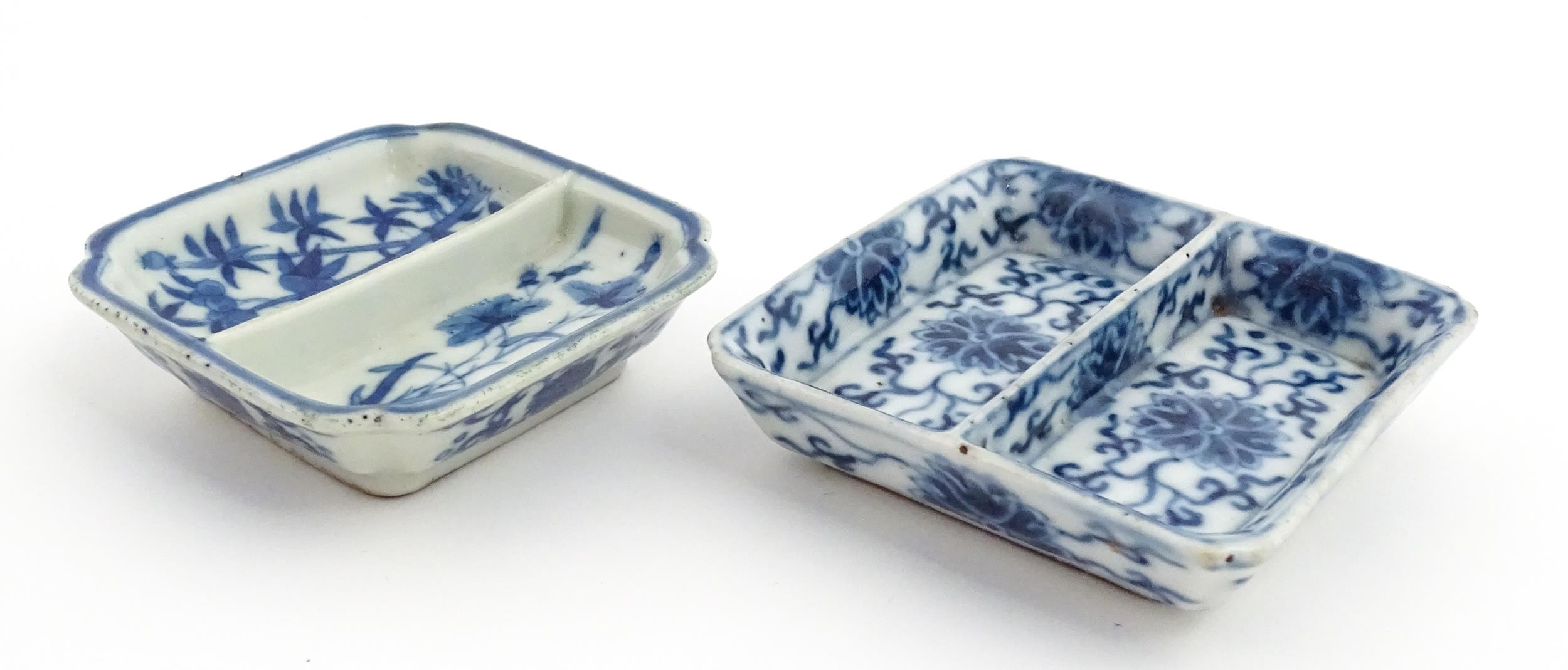 Two small Chinese blue and white dishes with central division, possibly for ink, decorated with flowers and foliage. Both bearing Character marks under. Largest approx. 3 1/4" wide (2)