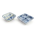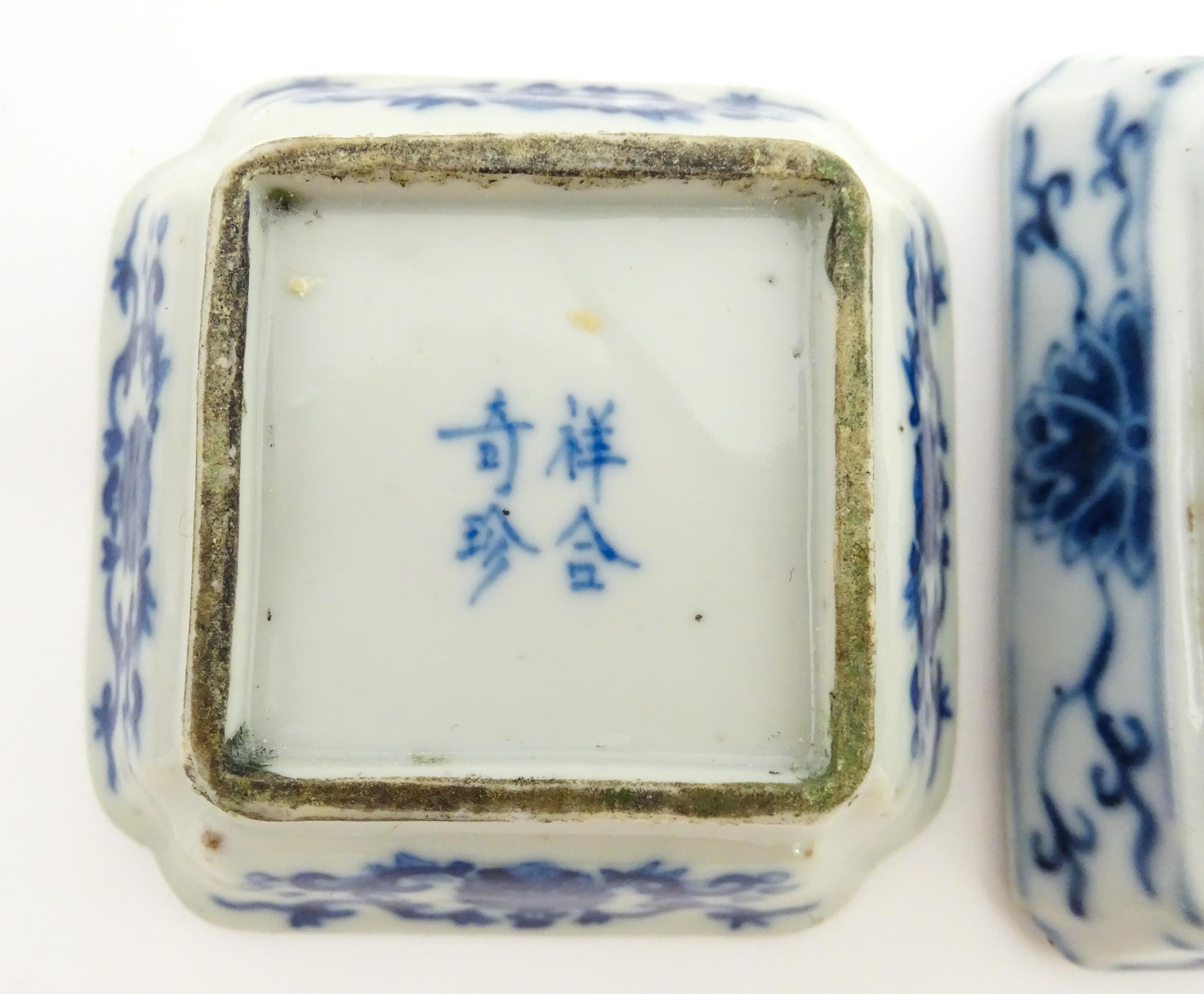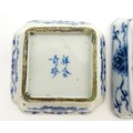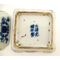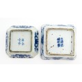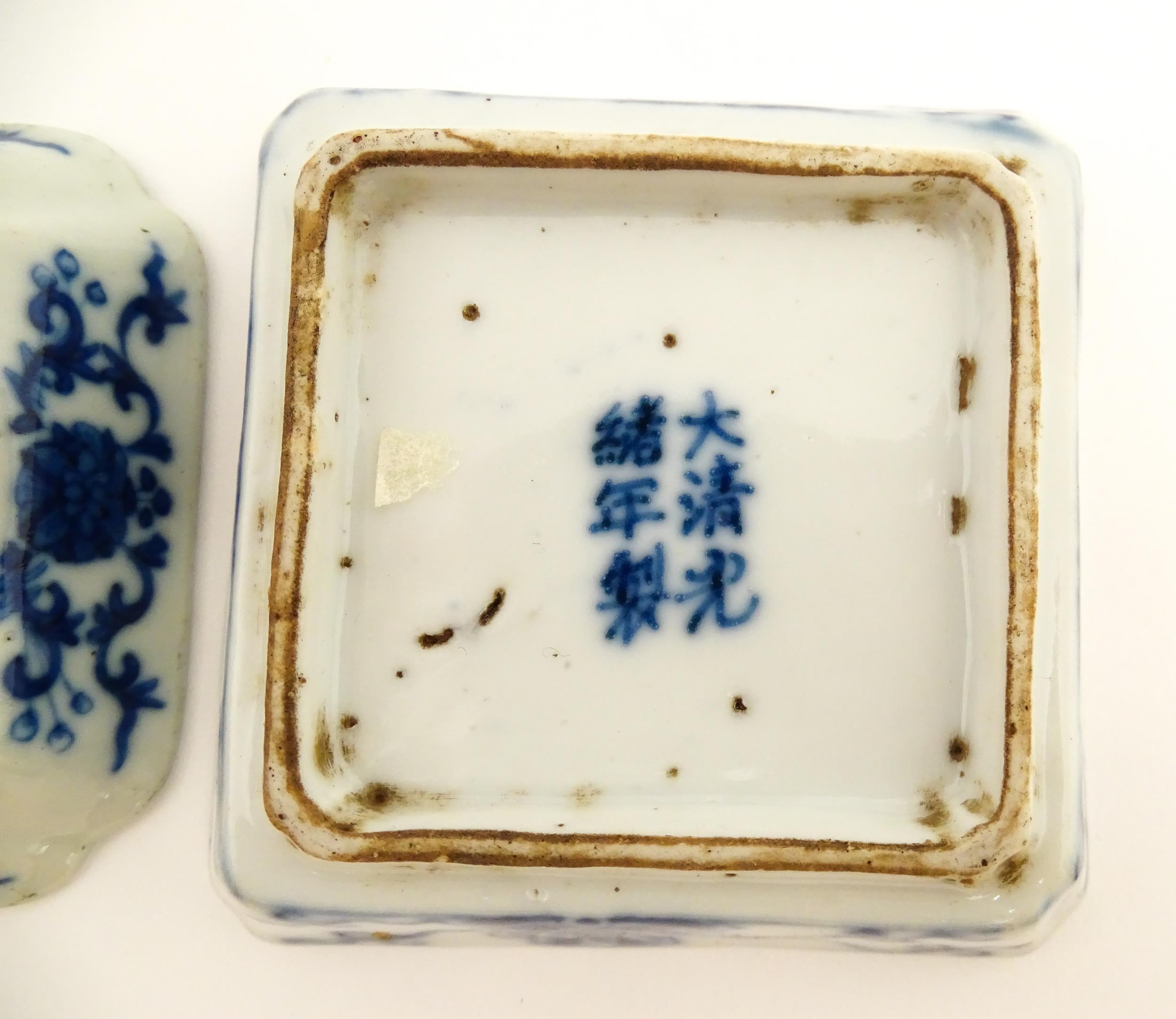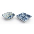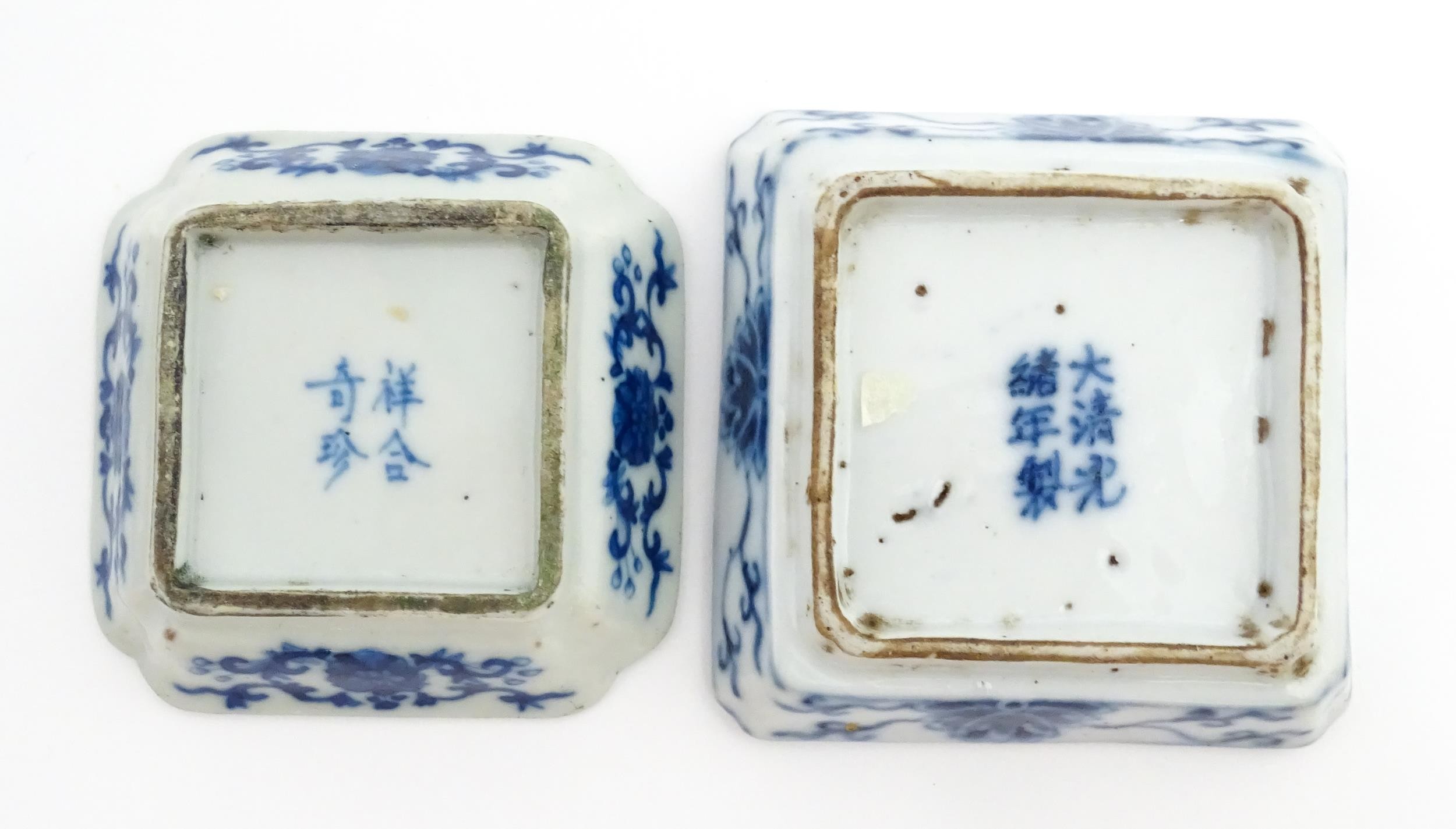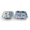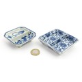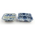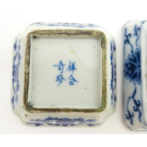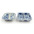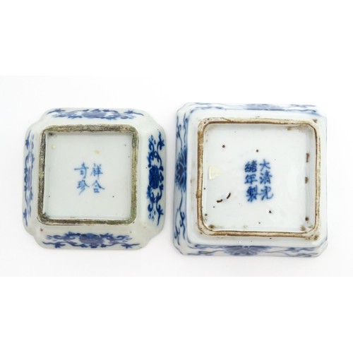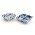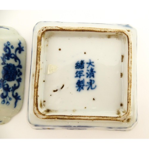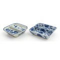 Two small Chinese blue and white dishes with central division, possibly for ink, decorated with flowers and foliage. Both bearing Character marks under. Largest approx. 3 1/4" wide (2)