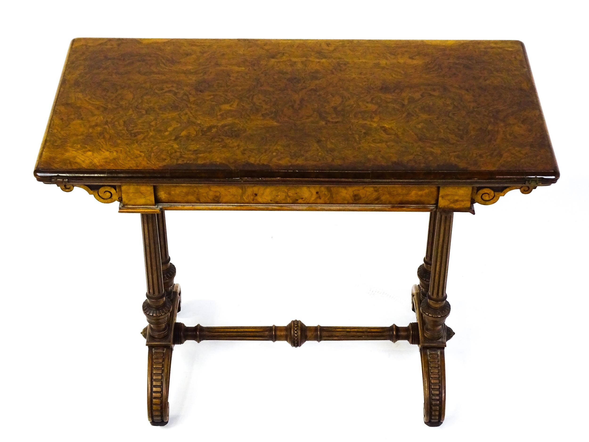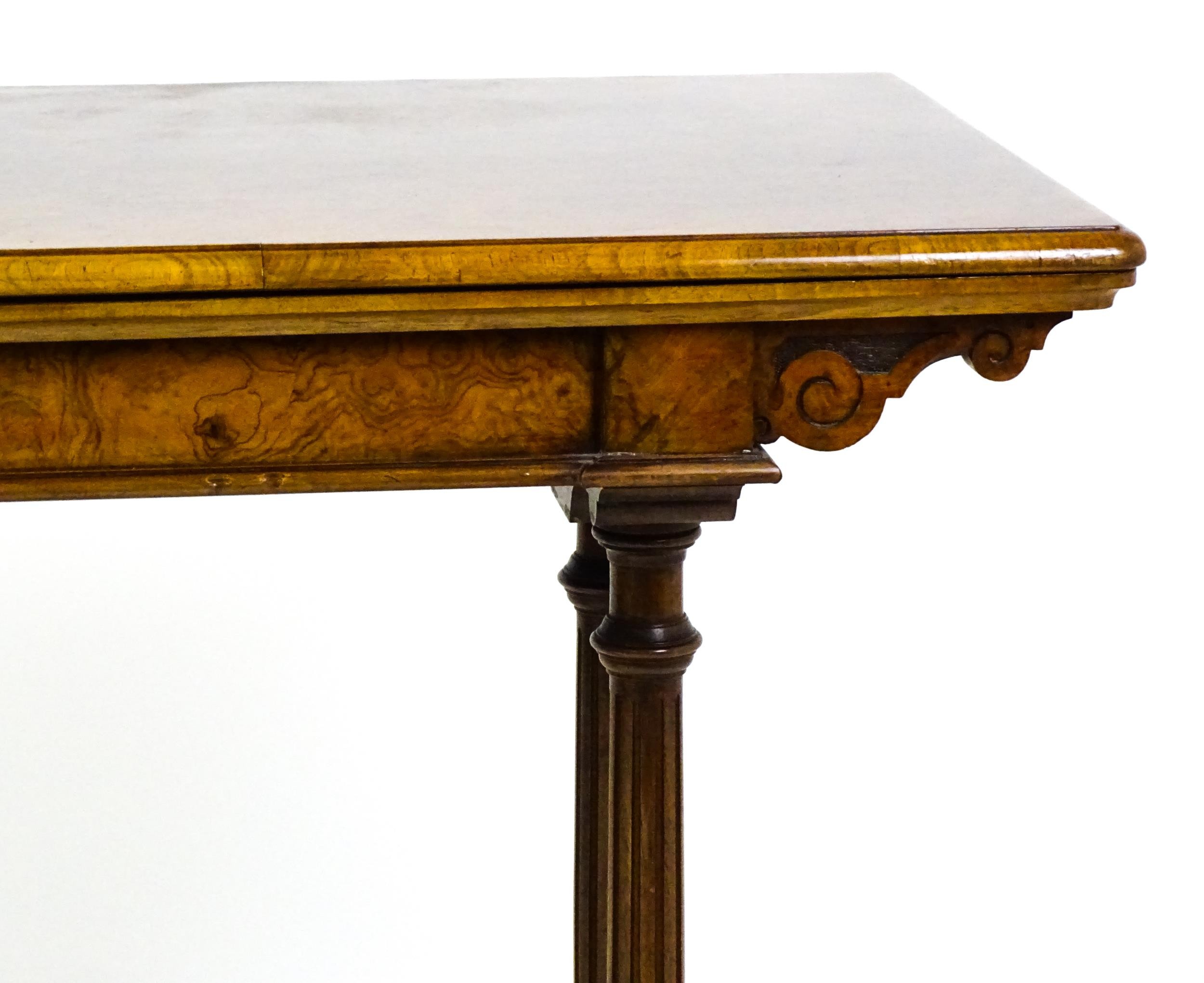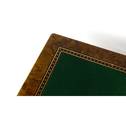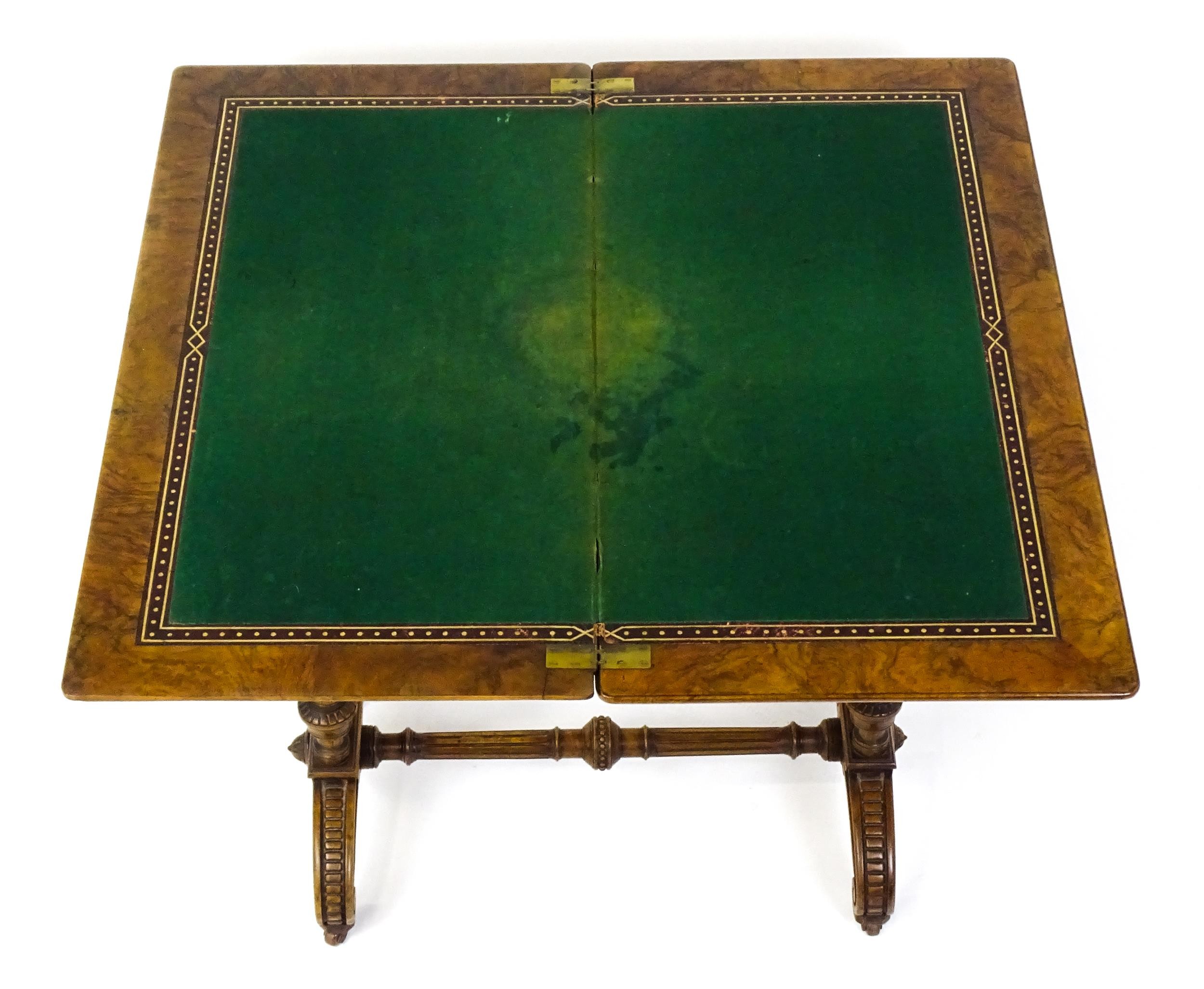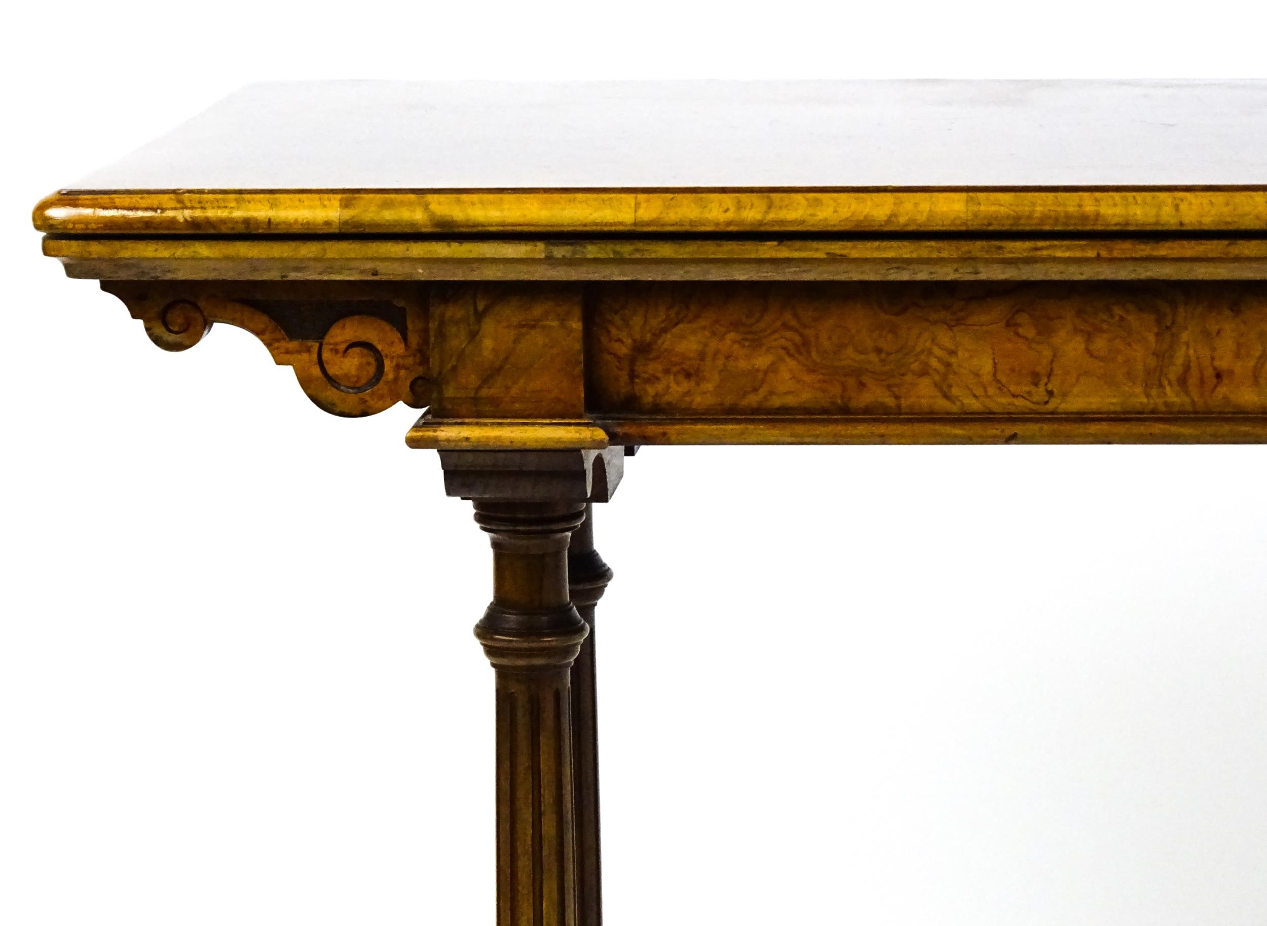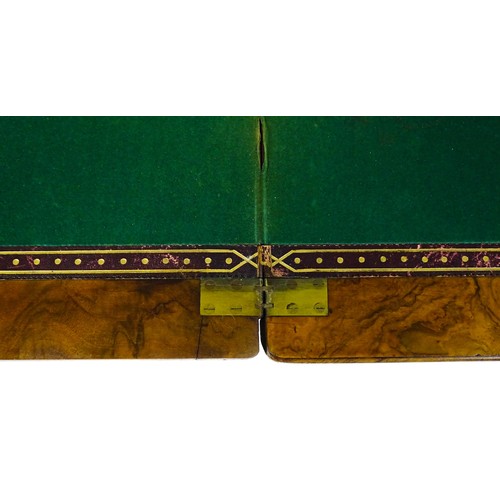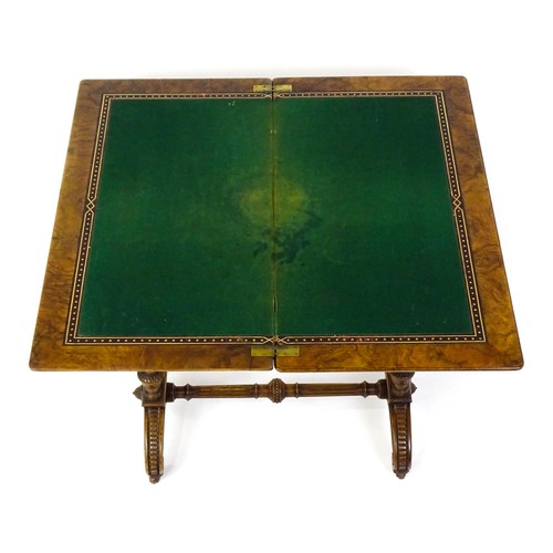 A 19thC walnut card table by Lambs of Manchester with a burr walnut table top opening to show a baize playing surface. The table having a moulded frieze and scrolled brackets raised on turned tapering fluted supports above four carved legs united by a turned stretcher. 36" wide x 18" deep x 29" high. When opened 36" wide x 36" deep. Marked 'Lamb 308'.