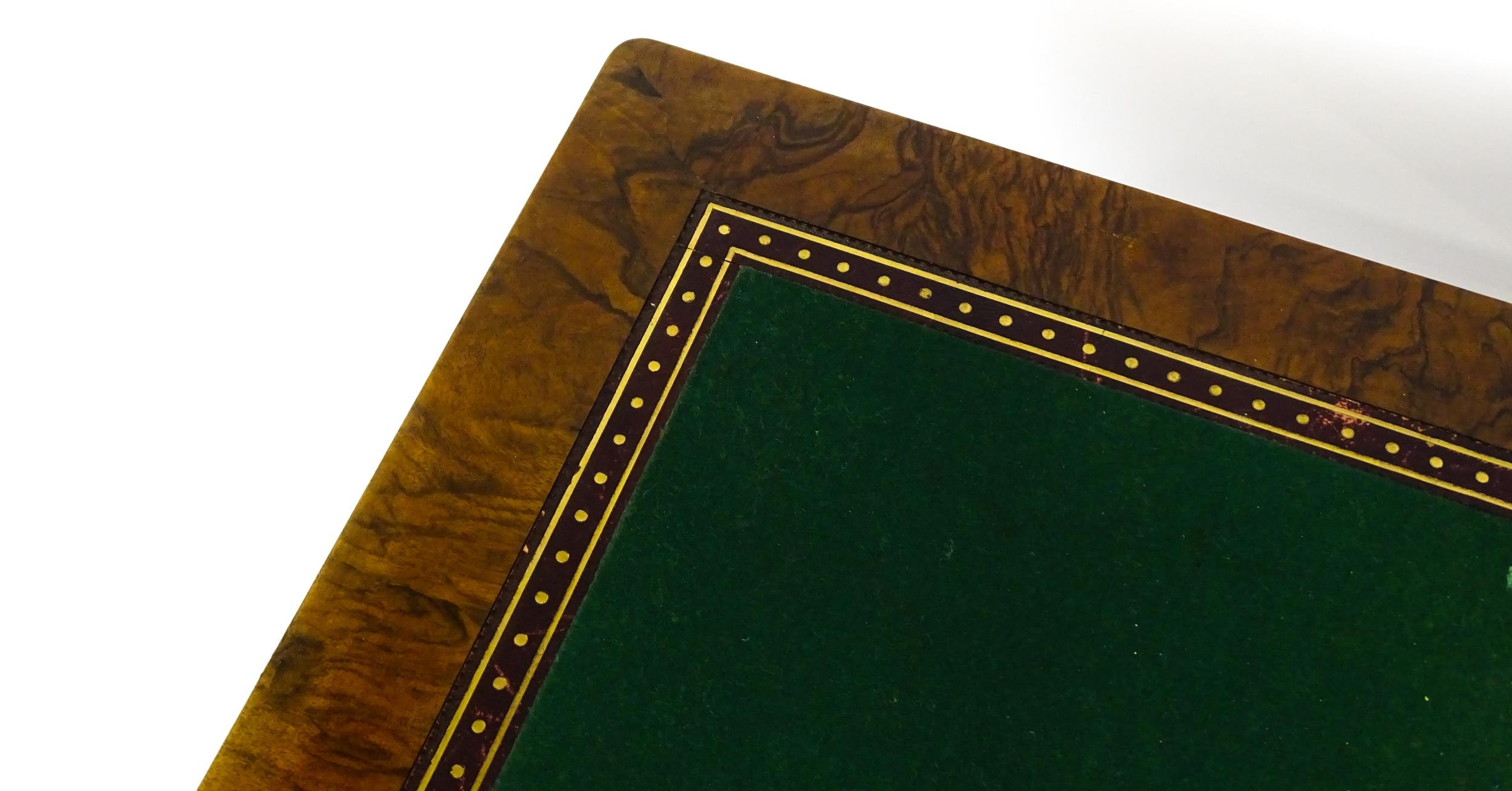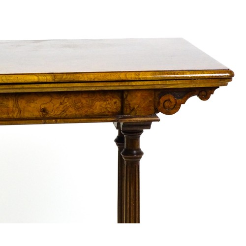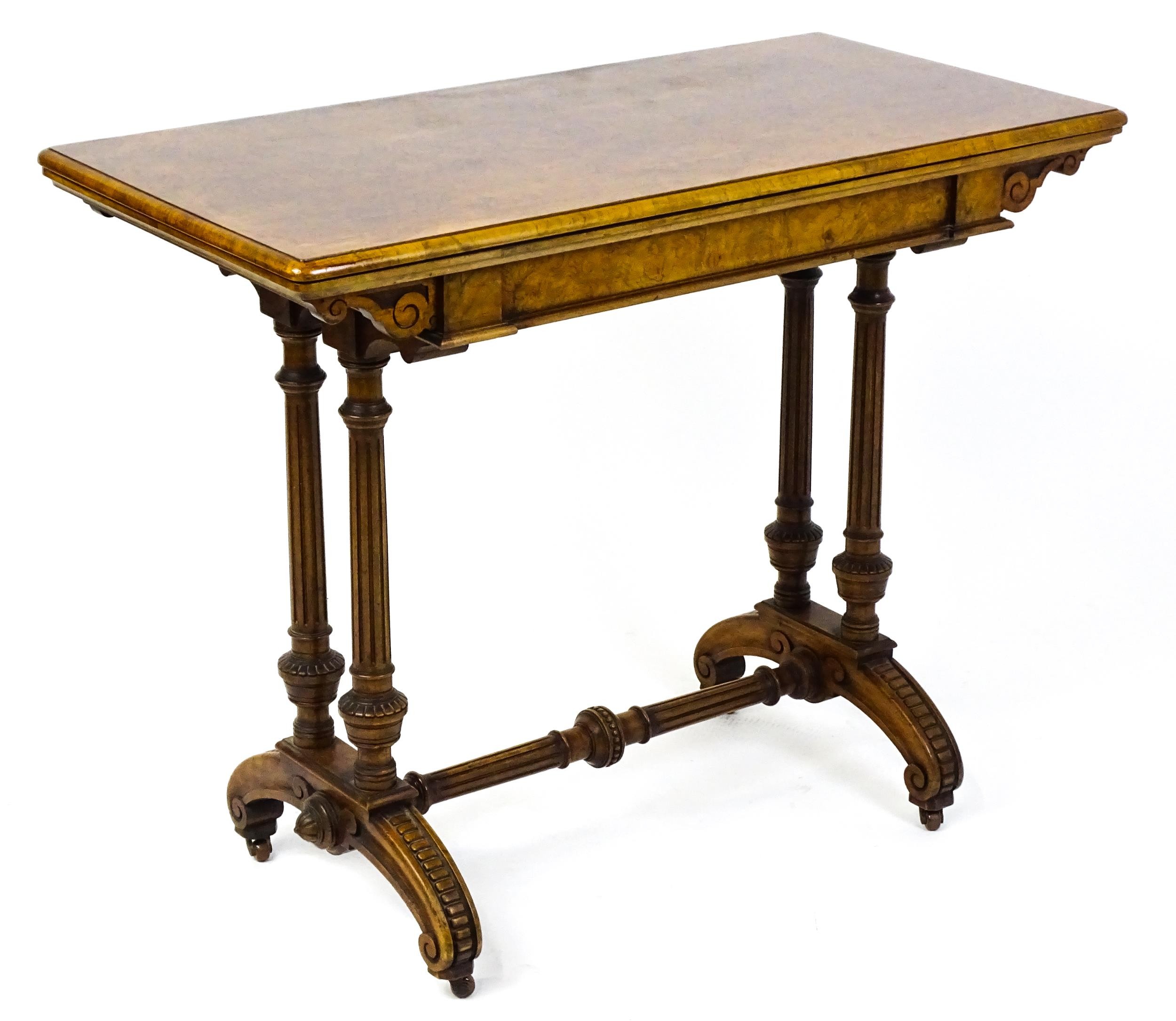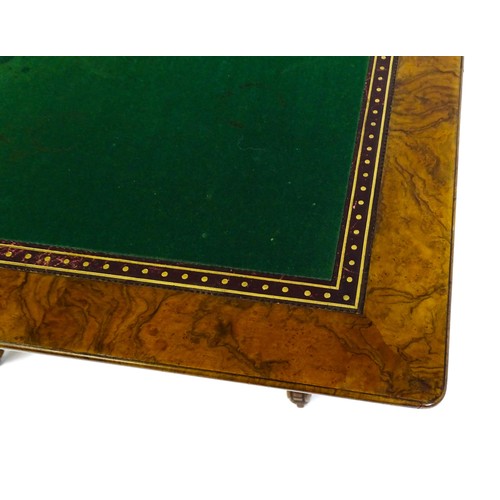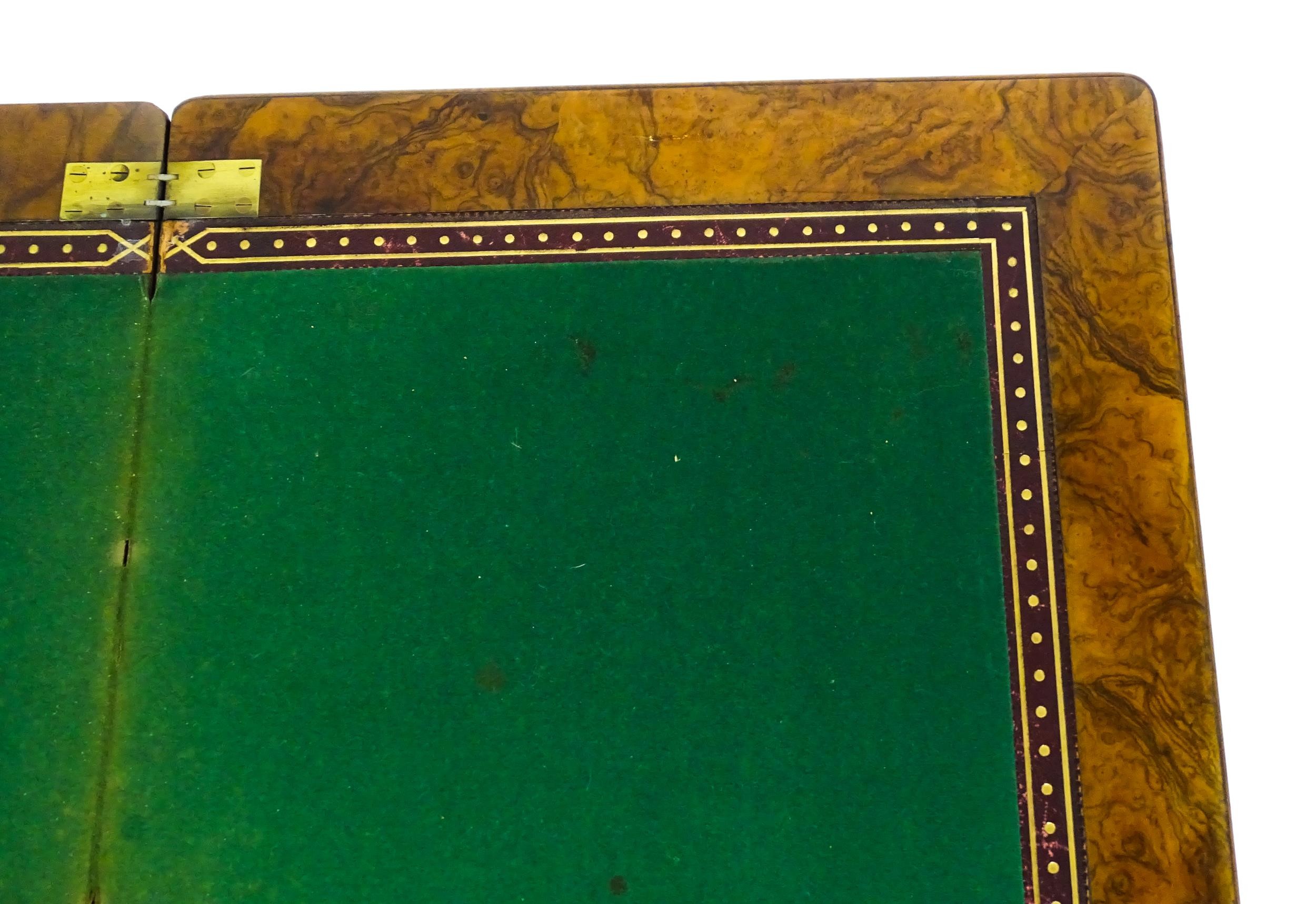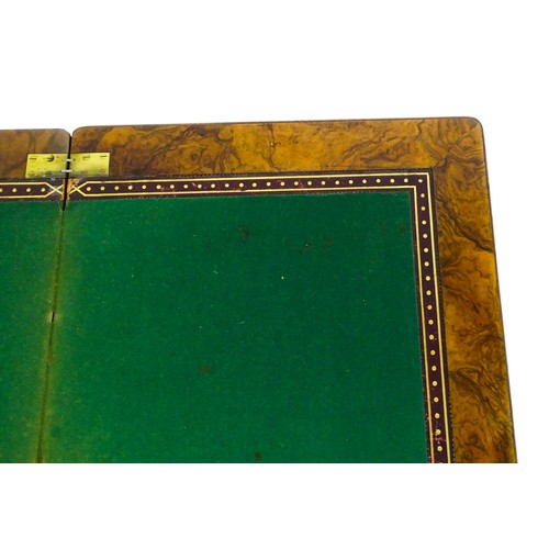 A 19thC walnut card table by Lambs of Manchester with a burr walnut table top opening to show a baize playing surface. The table having a moulded frieze and scrolled brackets raised on turned tapering fluted supports above four carved legs united by a turned stretcher. 36" wide x 18" deep x 29" high. When opened 36" wide x 36" deep. Marked 'Lamb 308'.