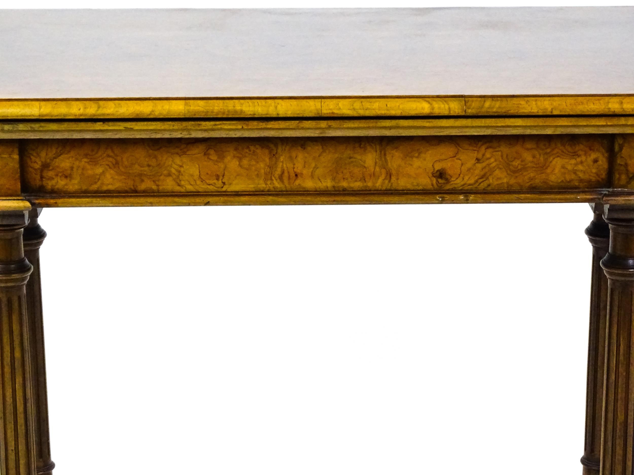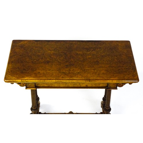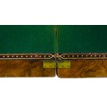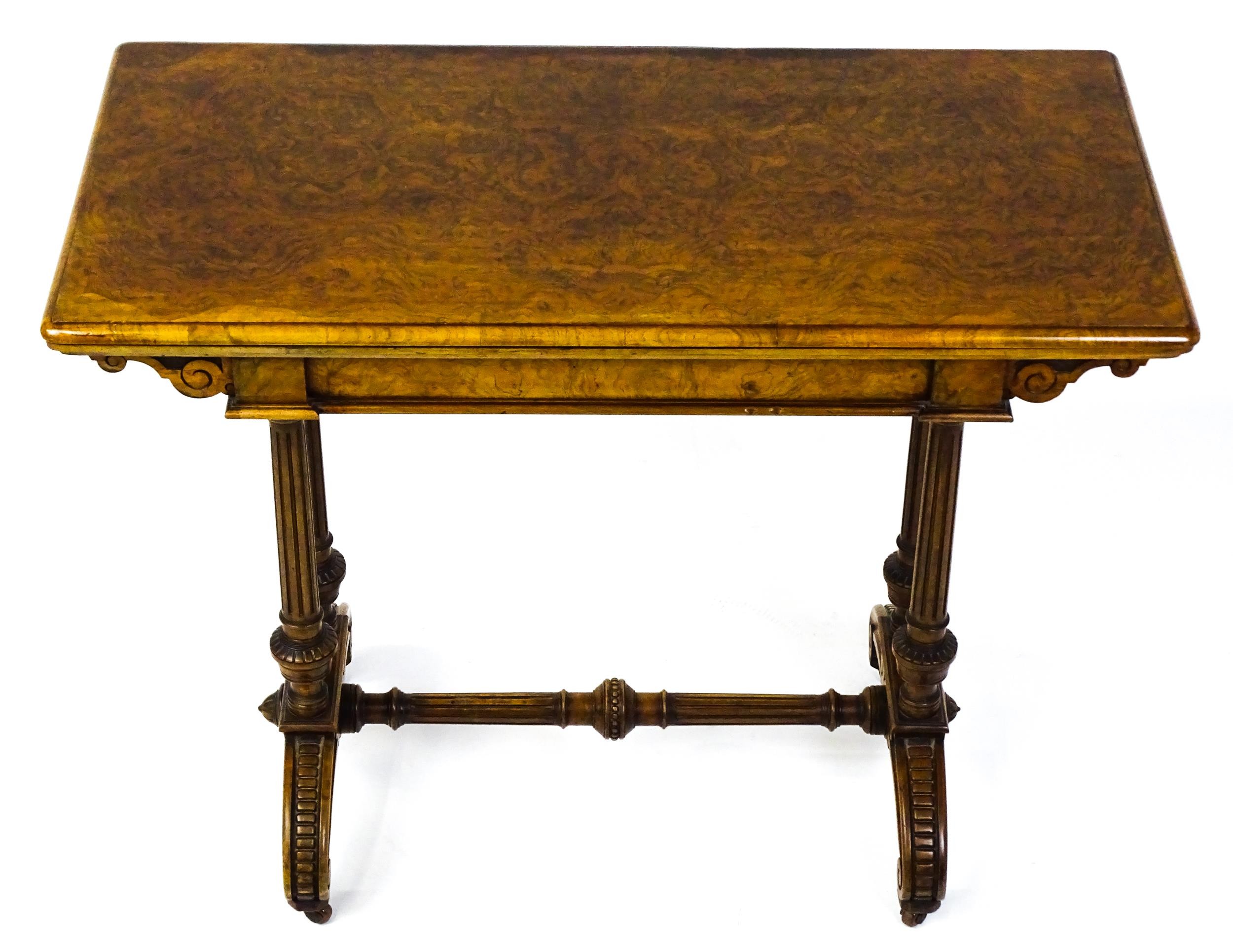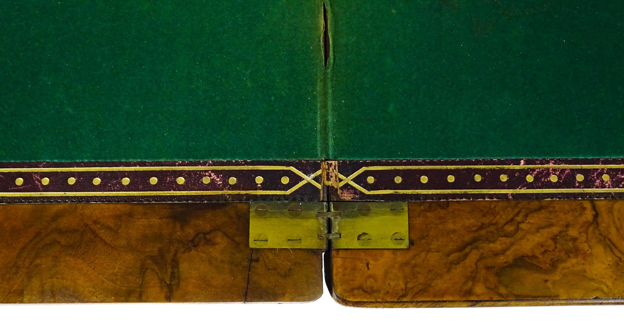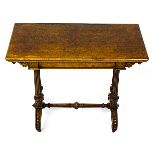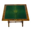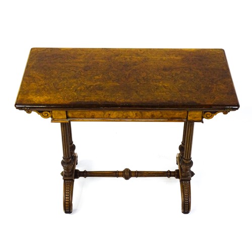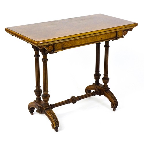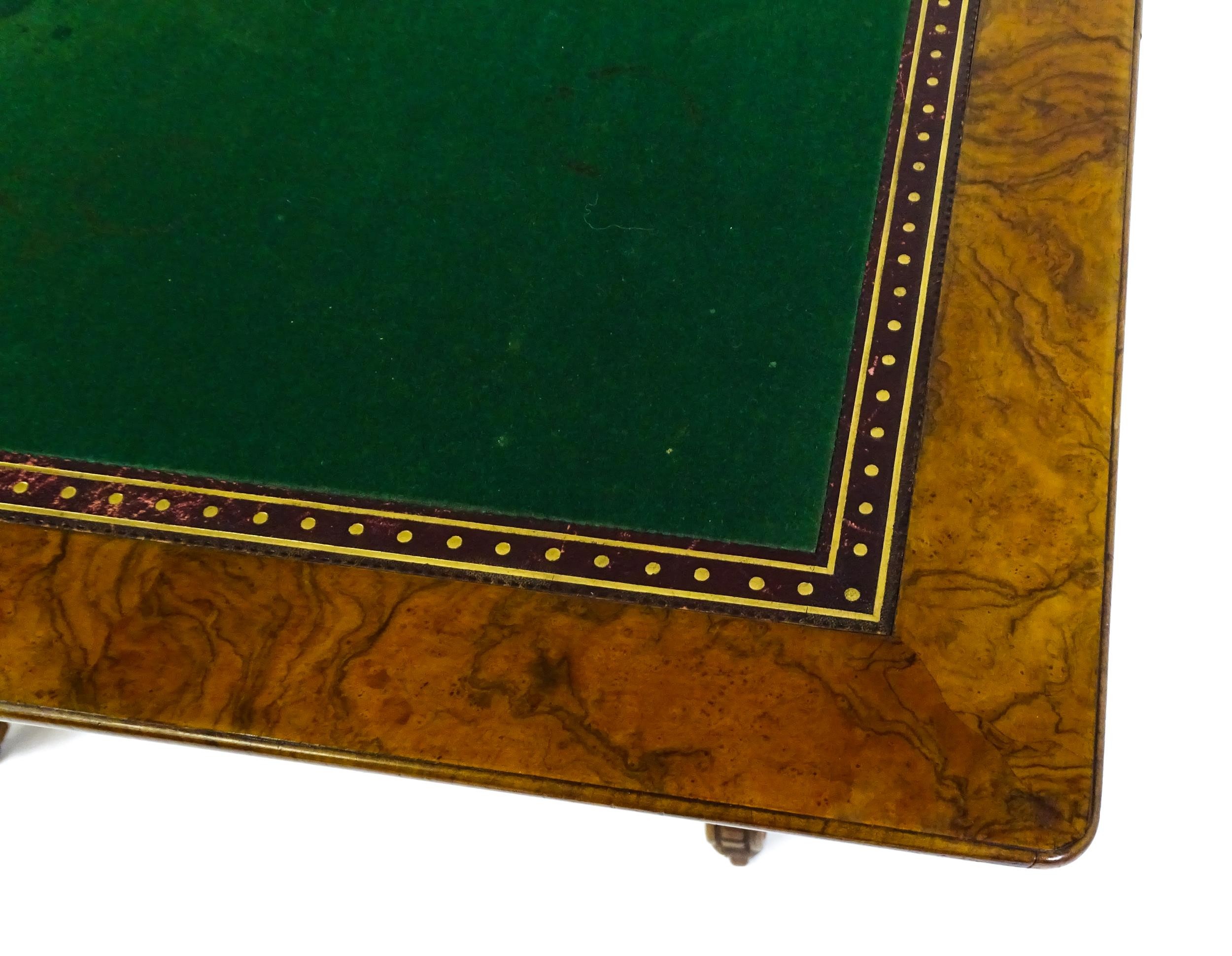 A 19thC walnut card table by Lambs of Manchester with a burr walnut table top opening to show a baize playing surface. The table having a moulded frieze and scrolled brackets raised on turned tapering fluted supports above four carved legs united by a turned stretcher. 36" wide x 18" deep x 29" high. When opened 36" wide x 36" deep. Marked 'Lamb 308'.