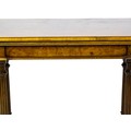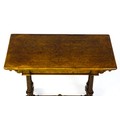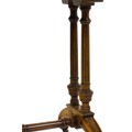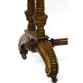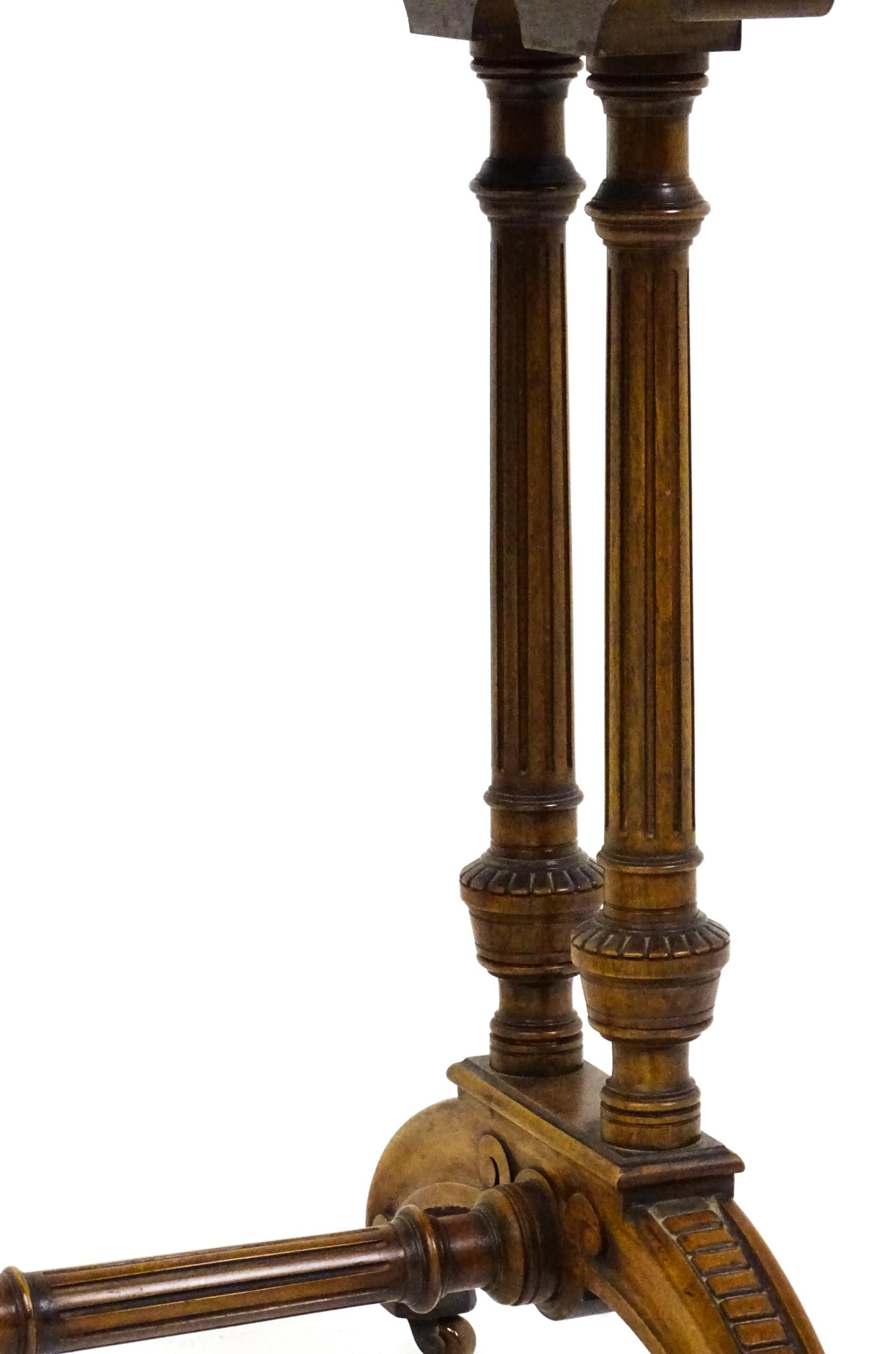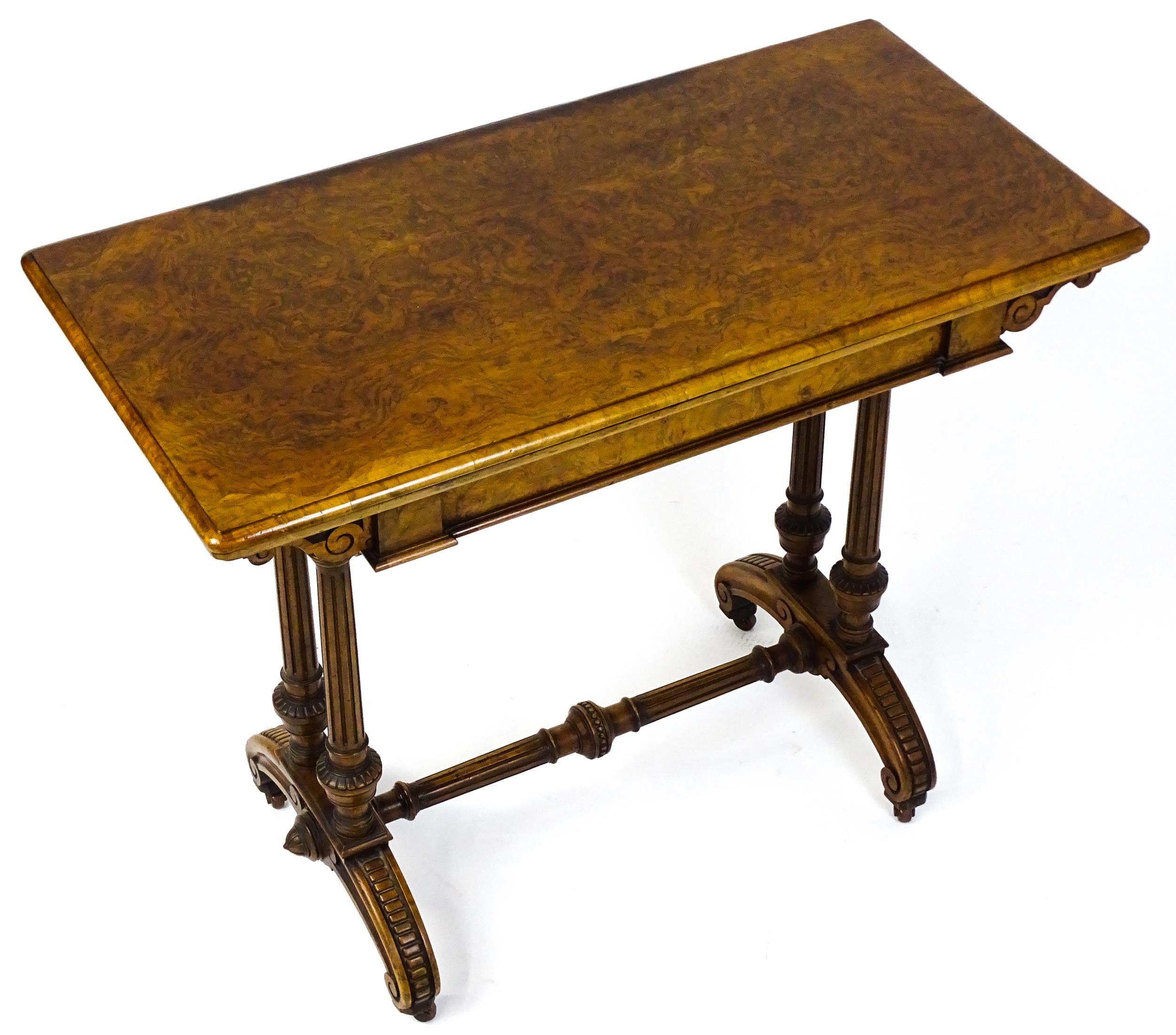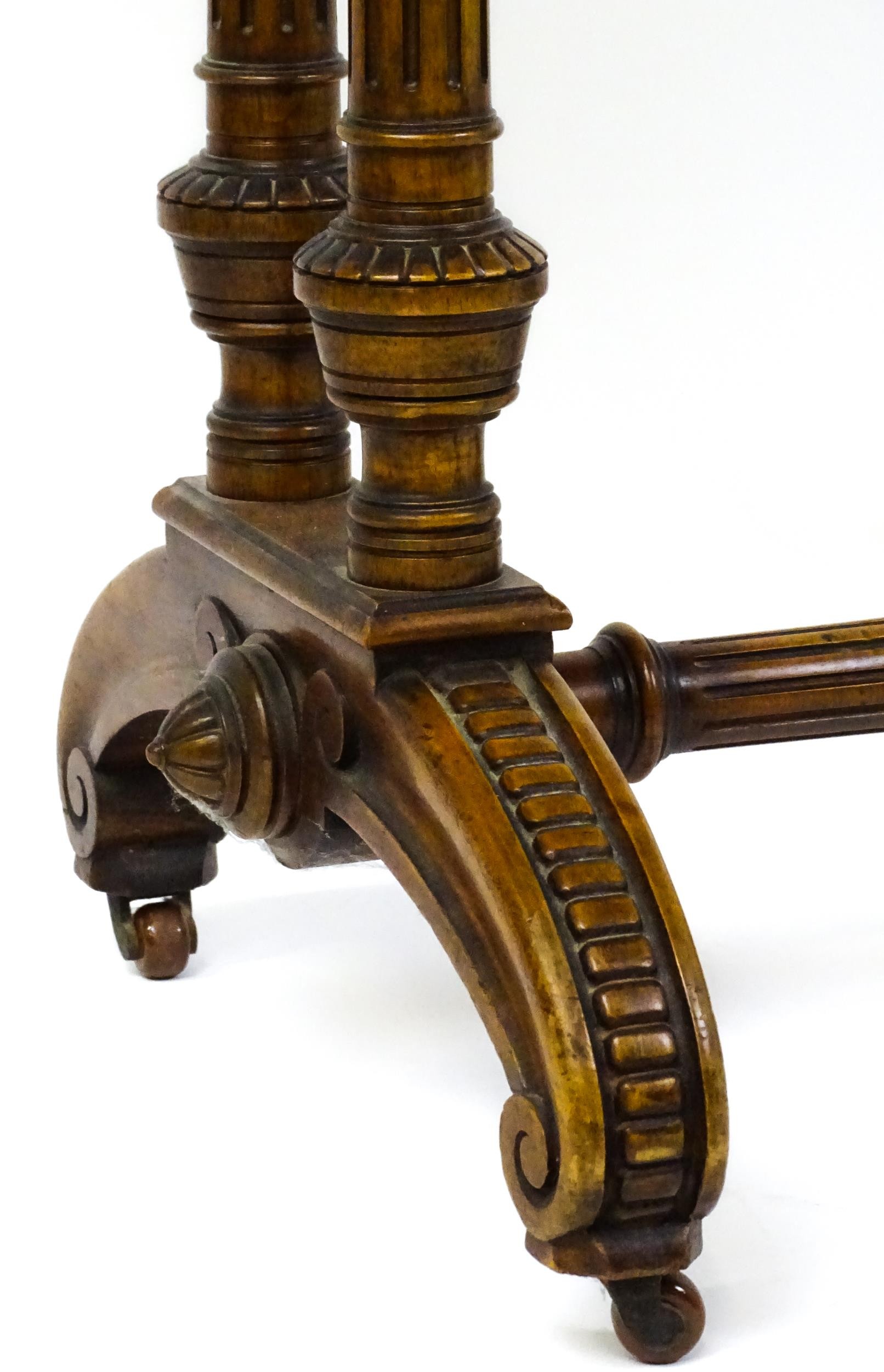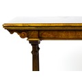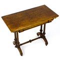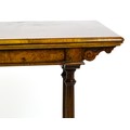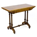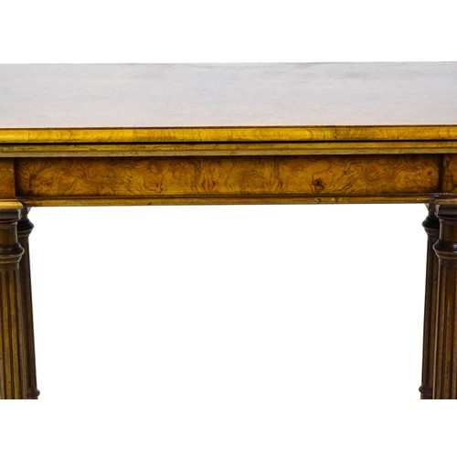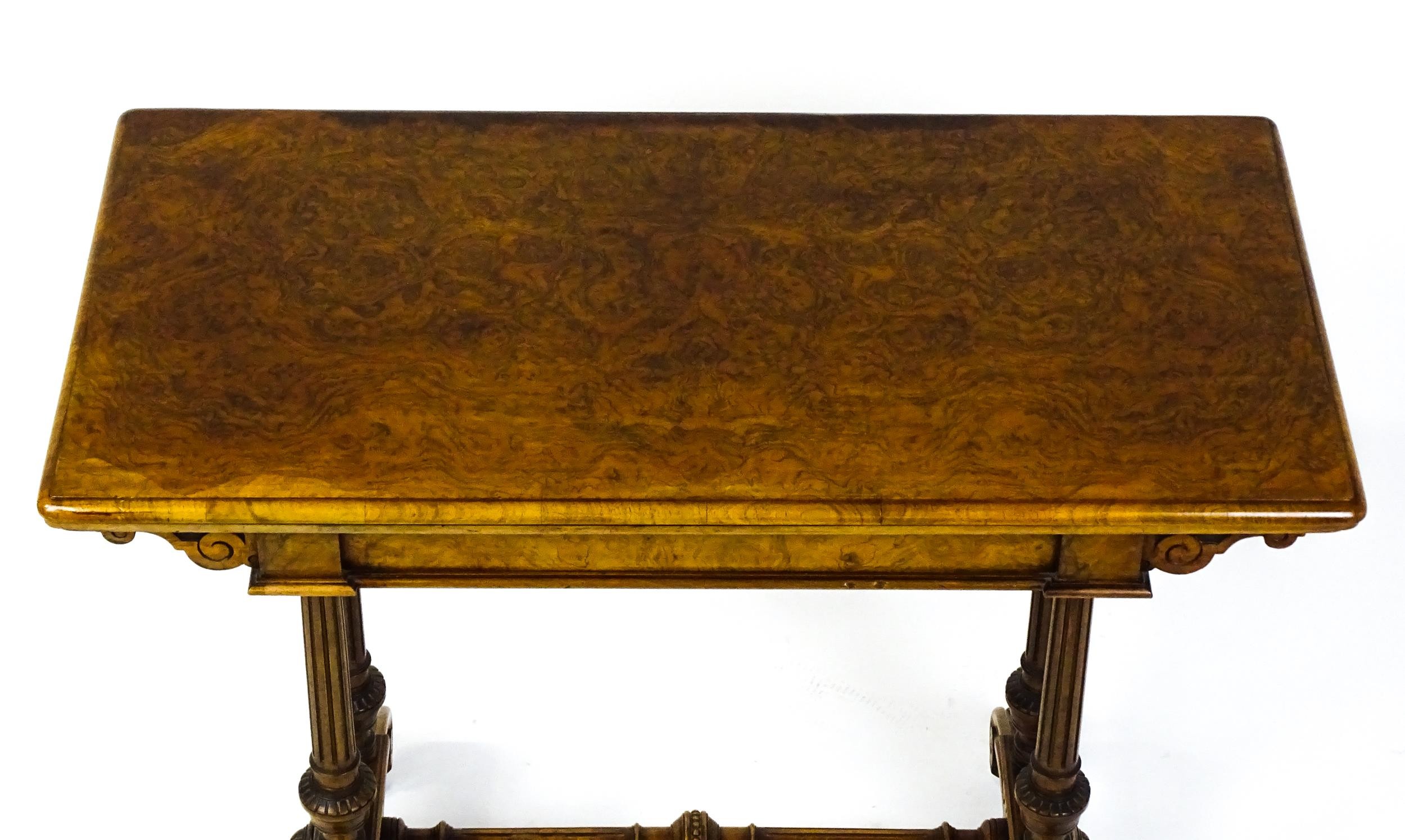 A 19thC walnut card table by Lambs of Manchester with a burr walnut table top opening to show a baize playing surface. The table having a moulded frieze and scrolled brackets raised on turned tapering fluted supports above four carved legs united by a turned stretcher. 36" wide x 18" deep x 29" high. When opened 36" wide x 36" deep. Marked 'Lamb 308'.
