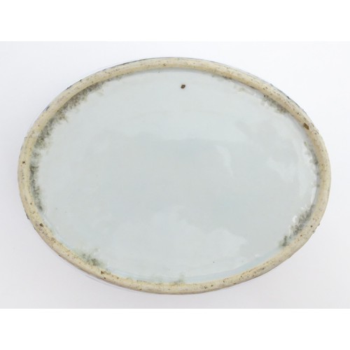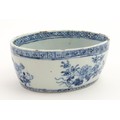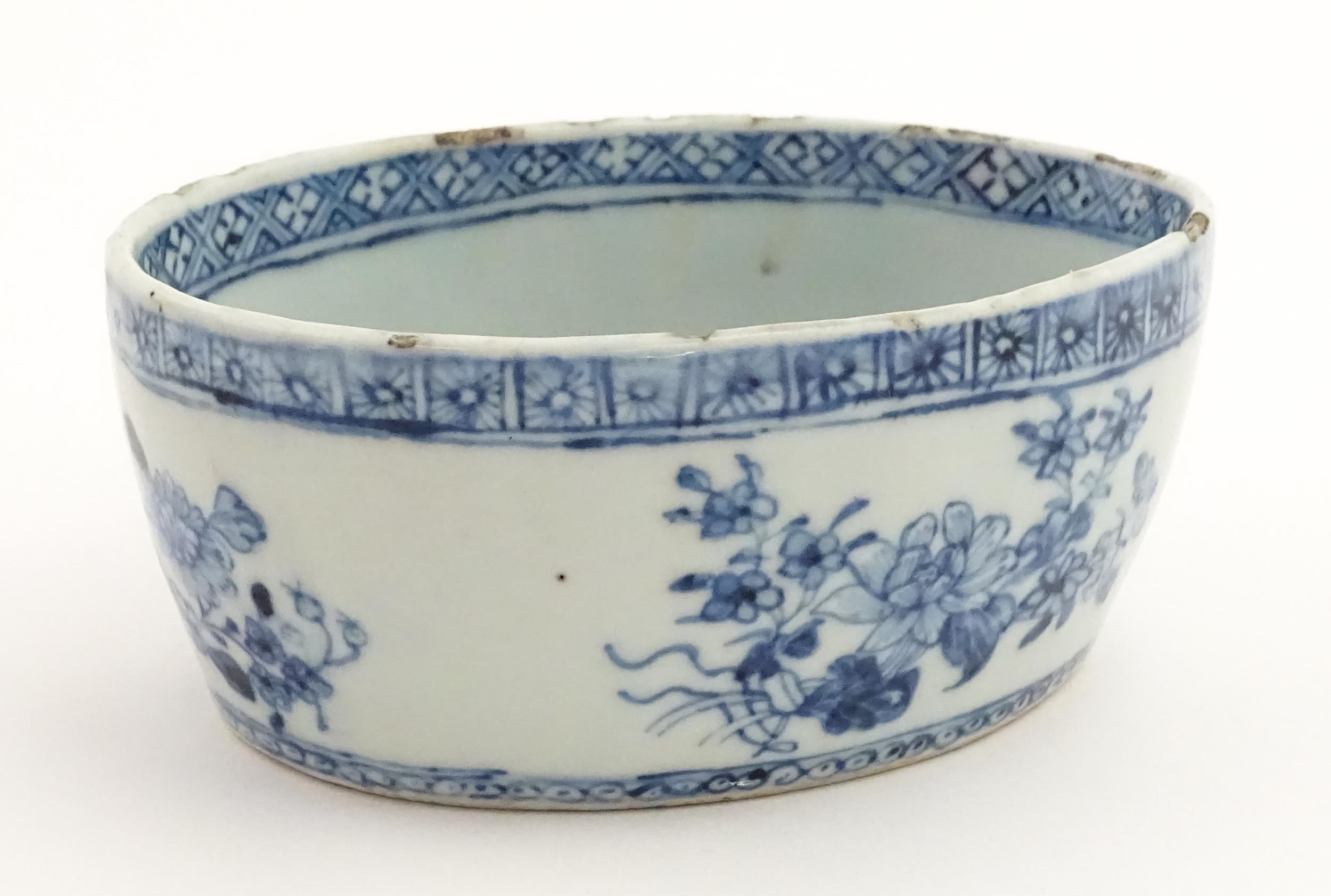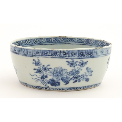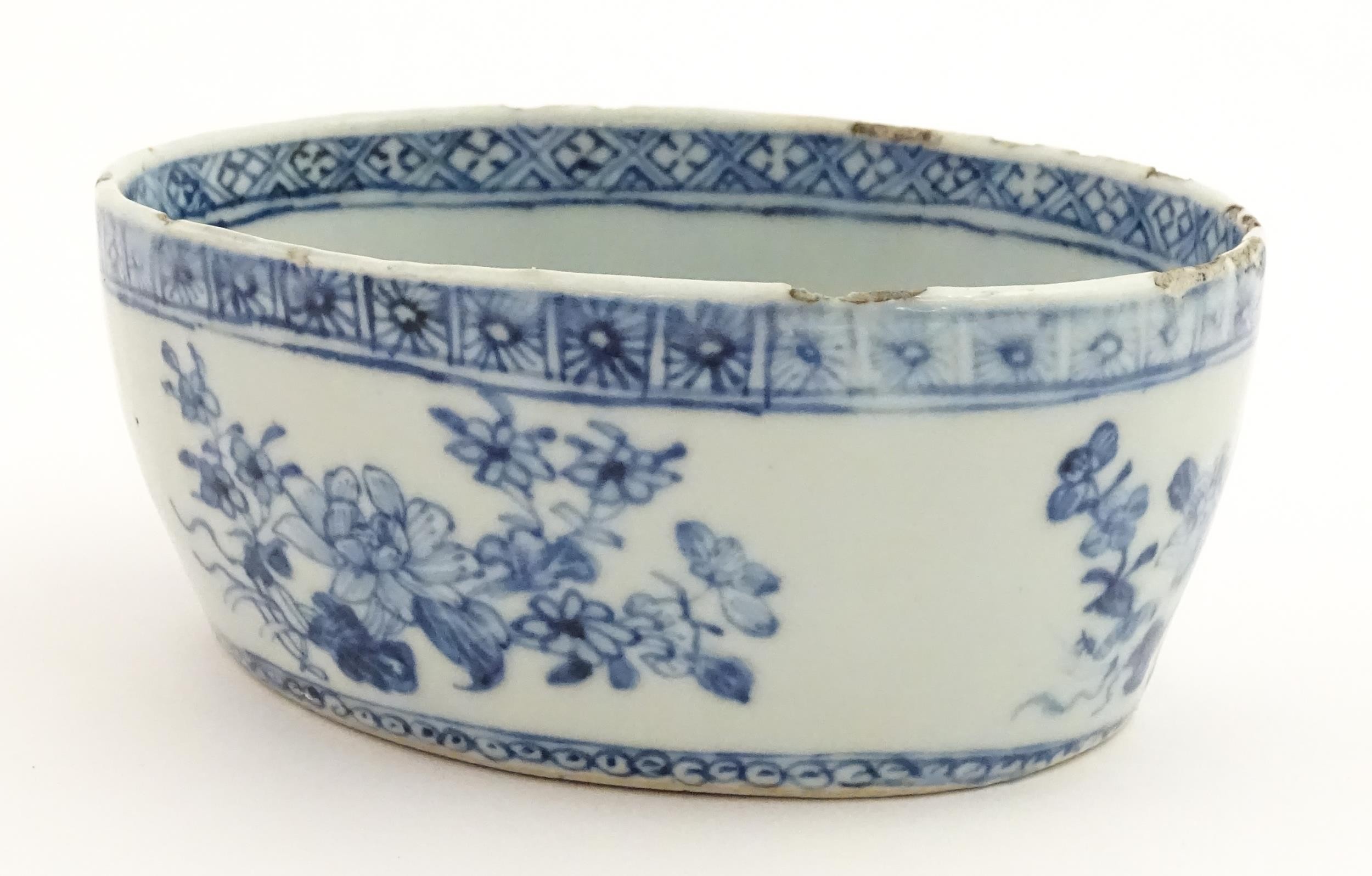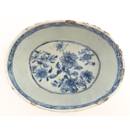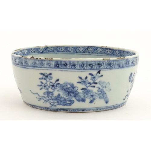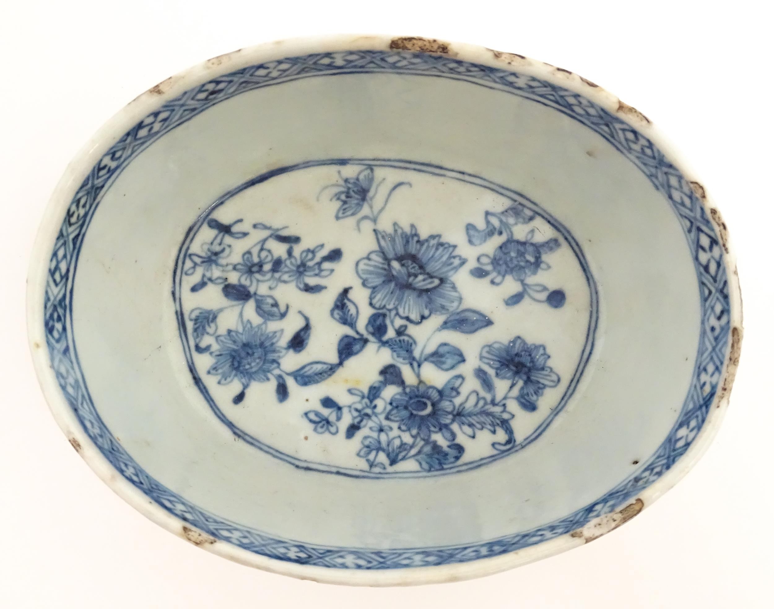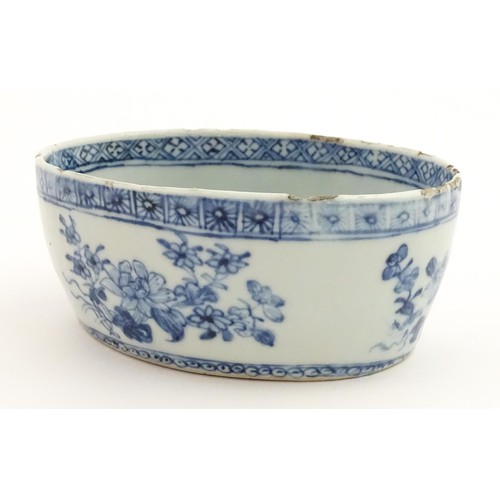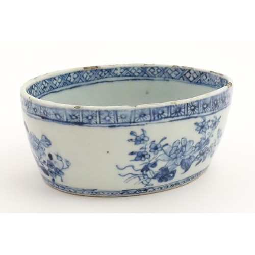 A Chinese blue and white dish of oval form decorated with flowers and foliage, having geometric borders. Approx. 6" wide