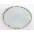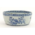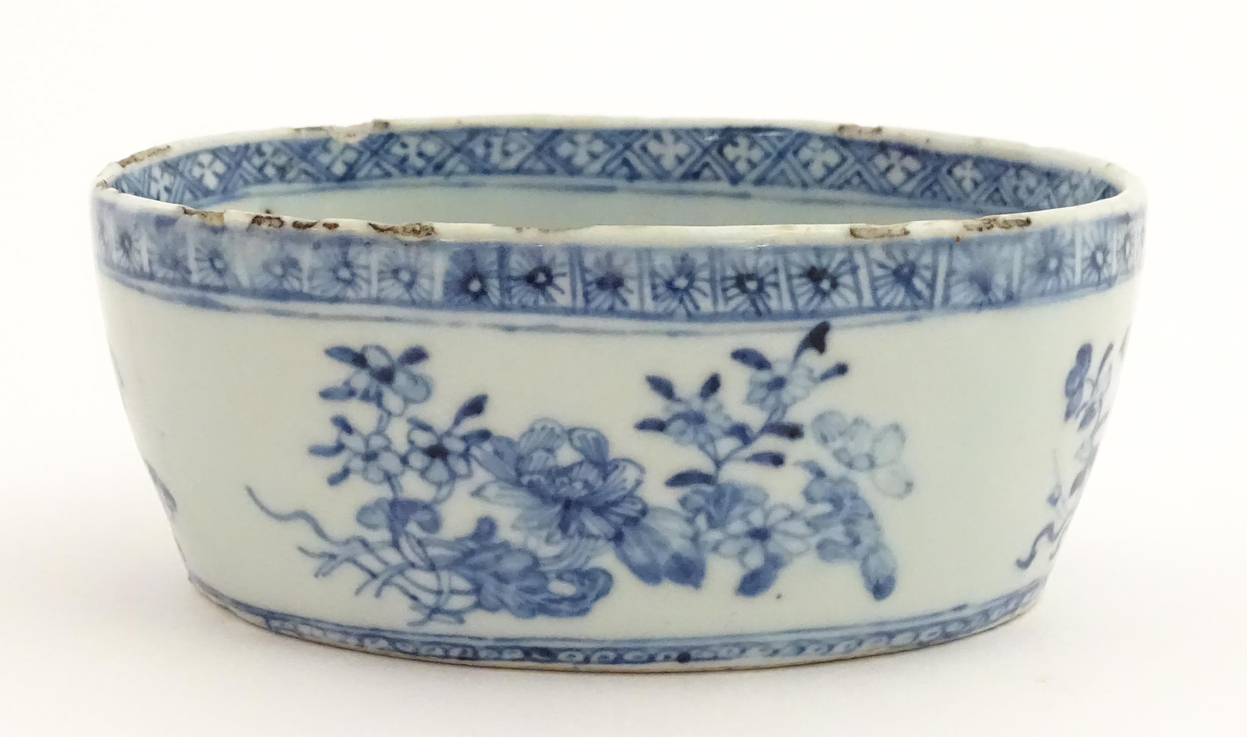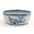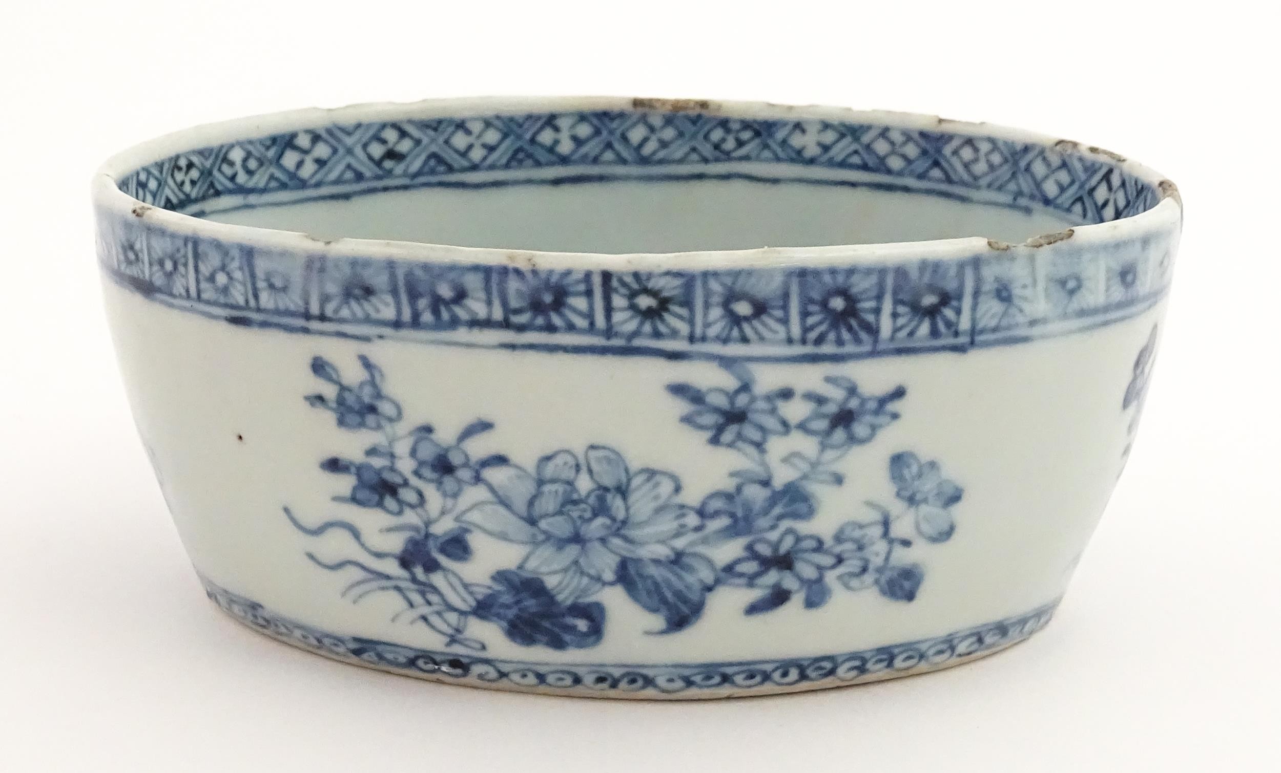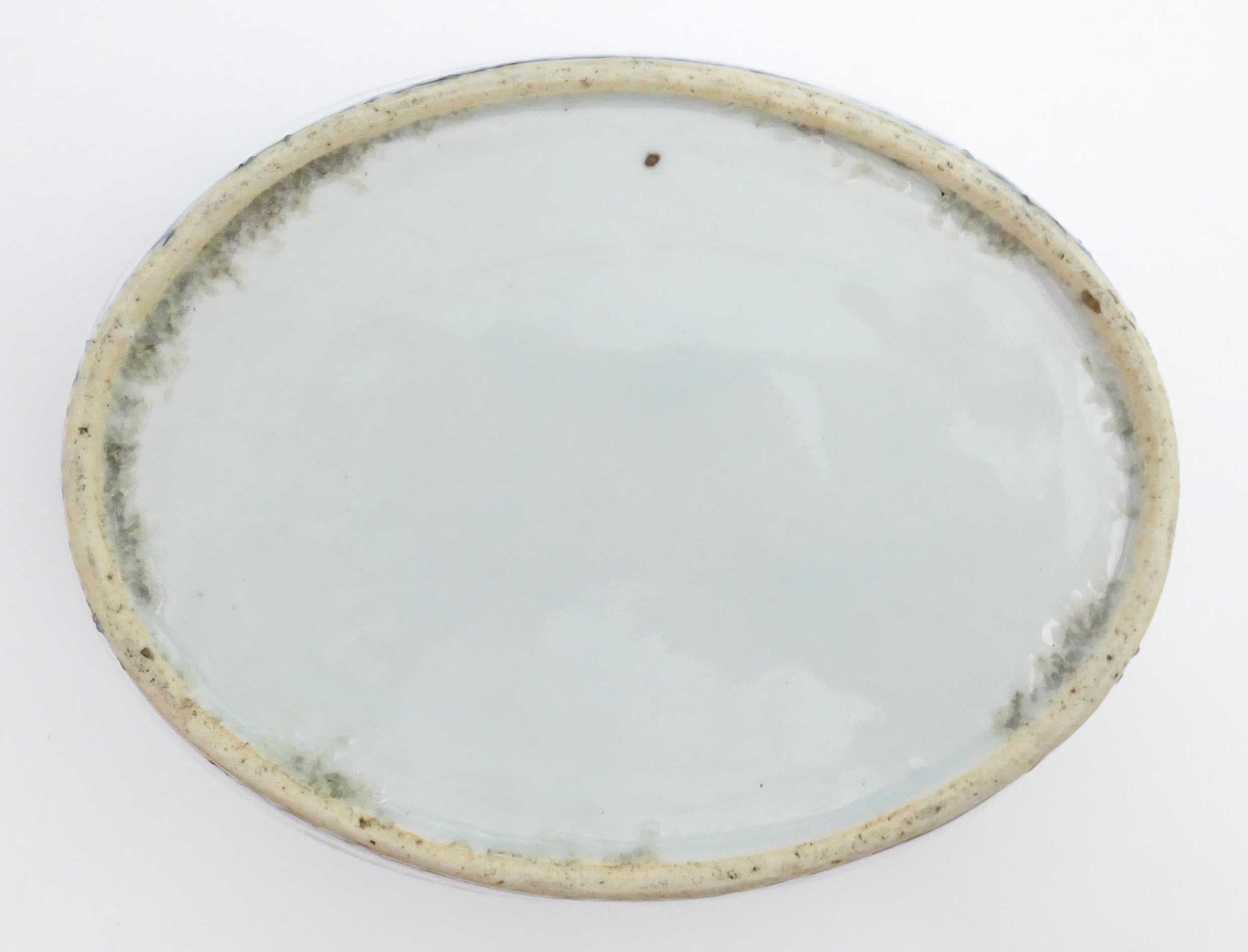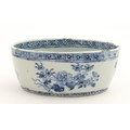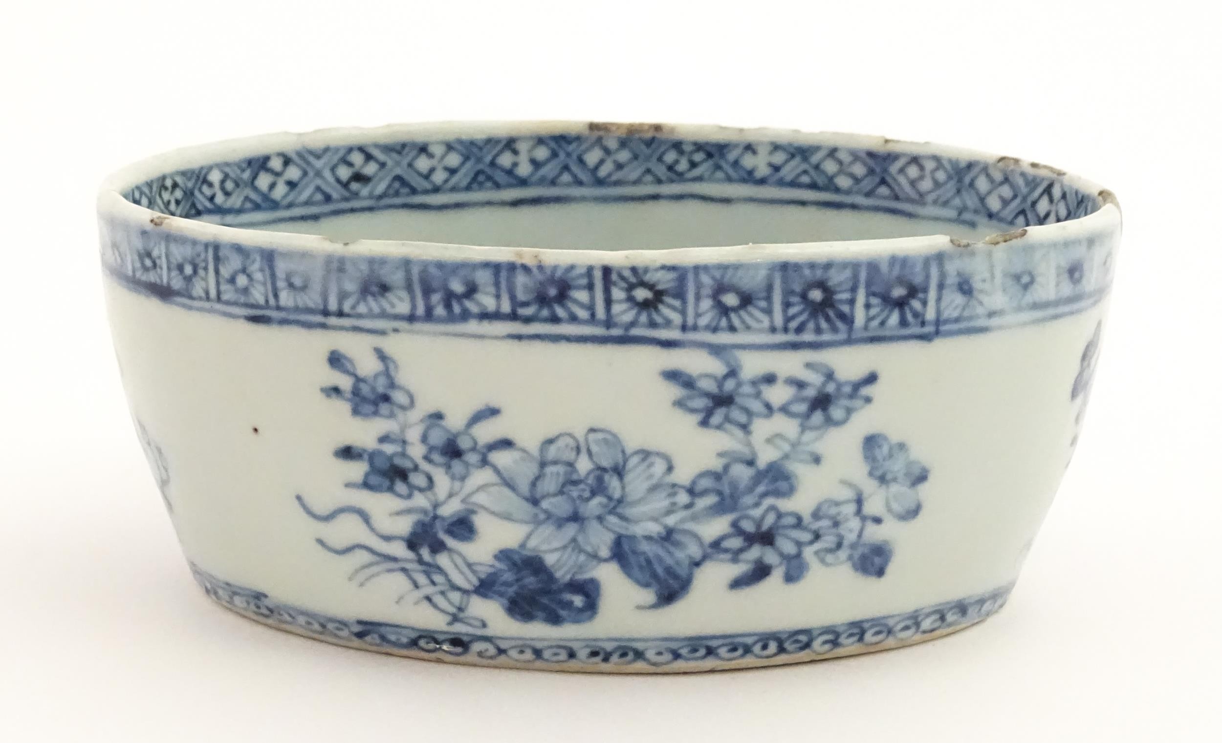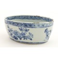 A Chinese blue and white dish of oval form decorated with flowers and foliage, having geometric borders. Approx. 6" wide