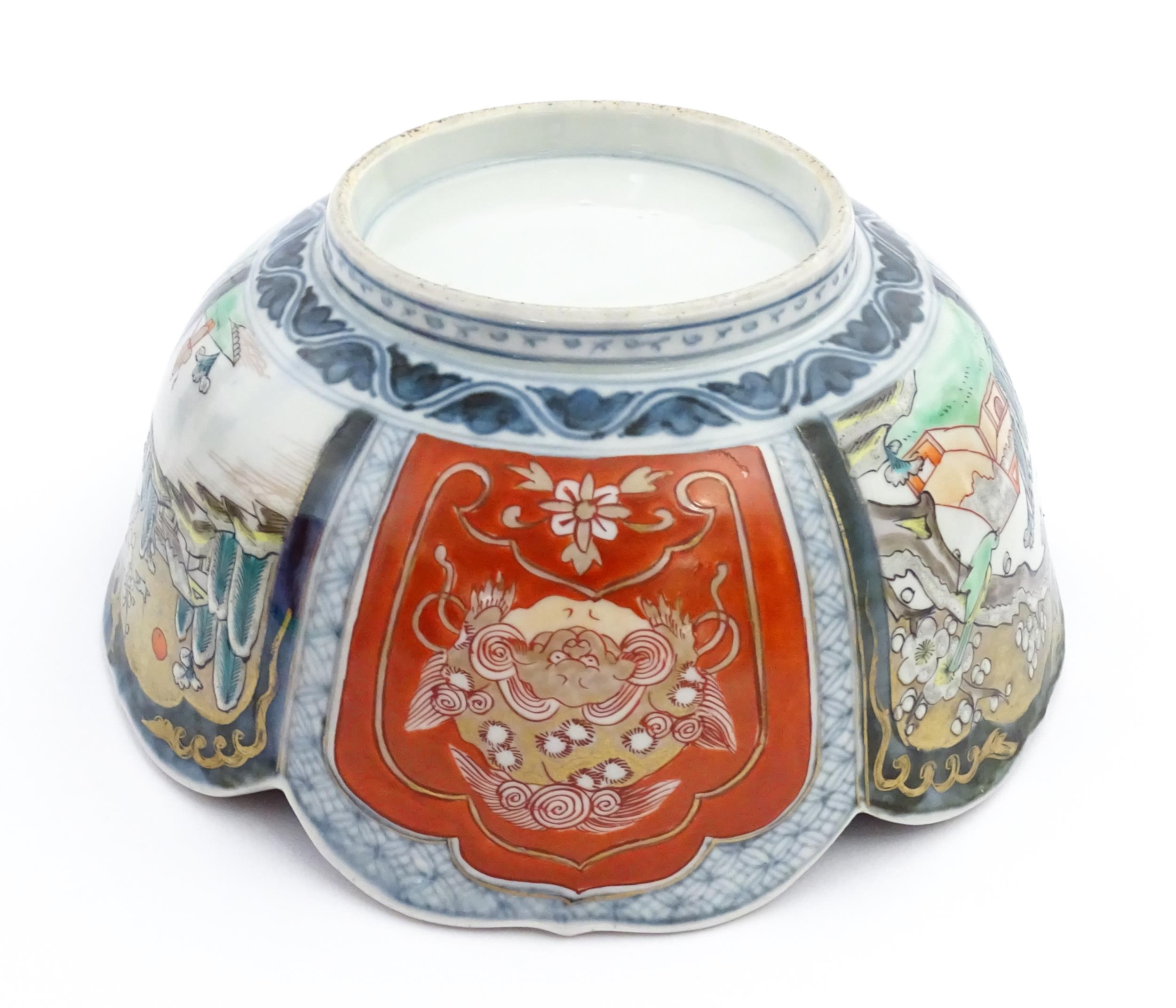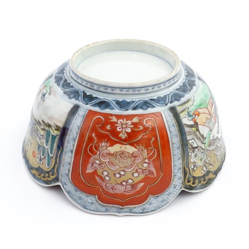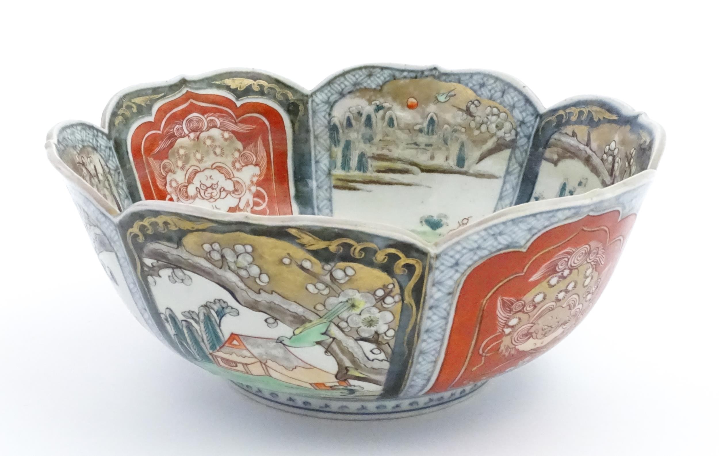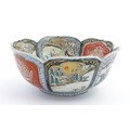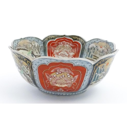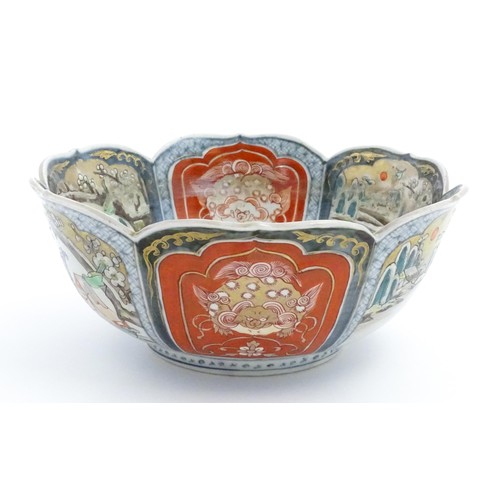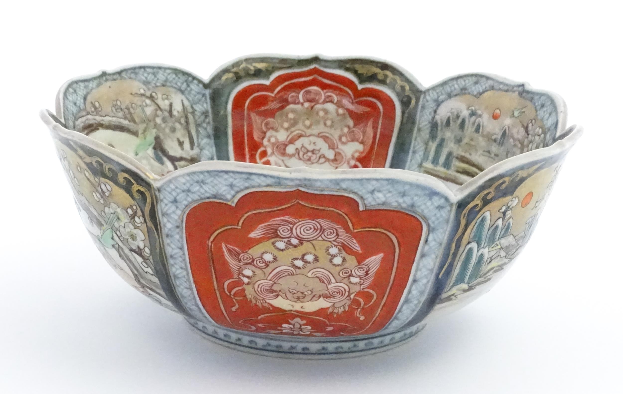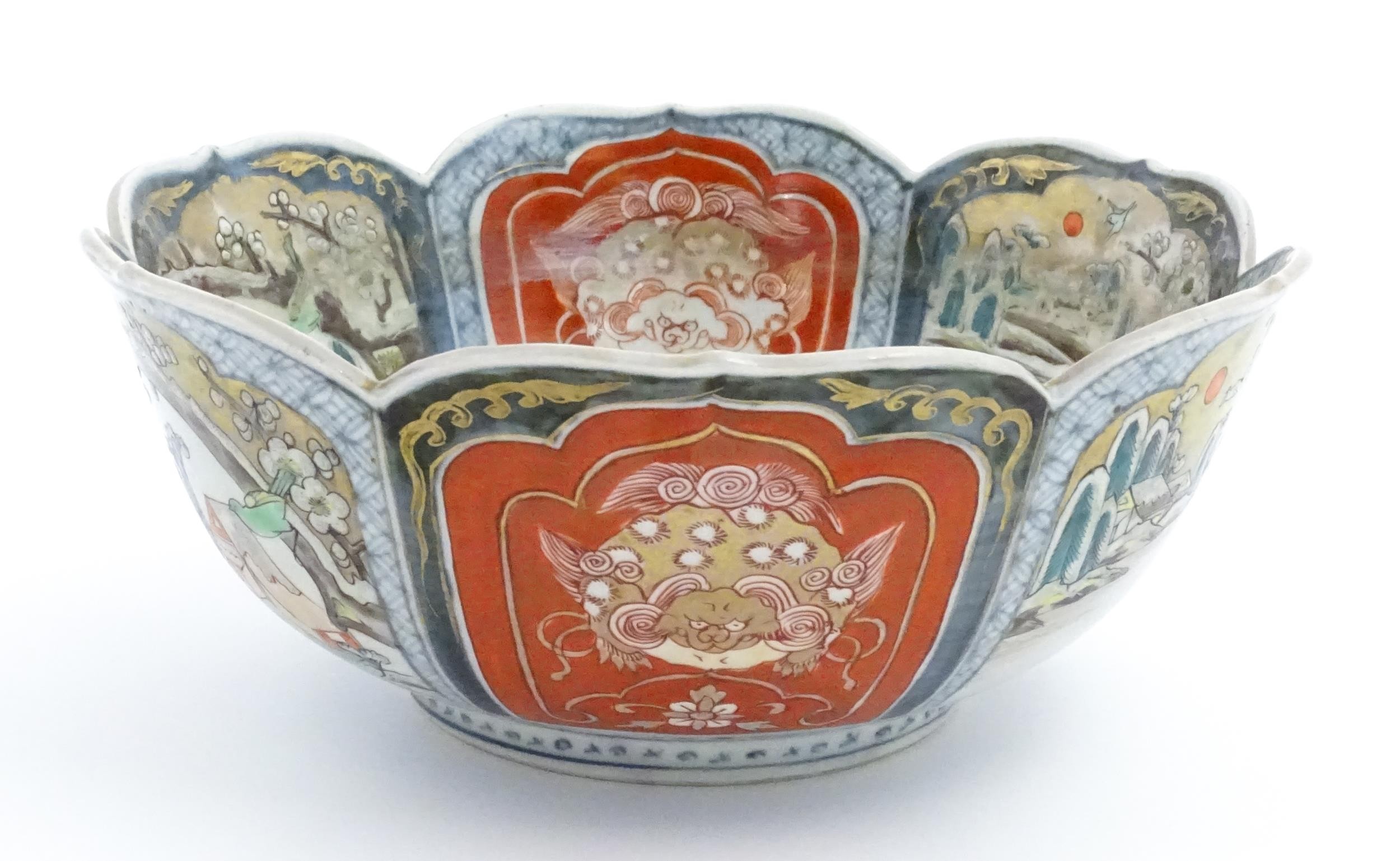 A Japanese Imari bowl of lobed form, with alternatively decorated panels with landscapes and guardian lions. Approx. 4" high