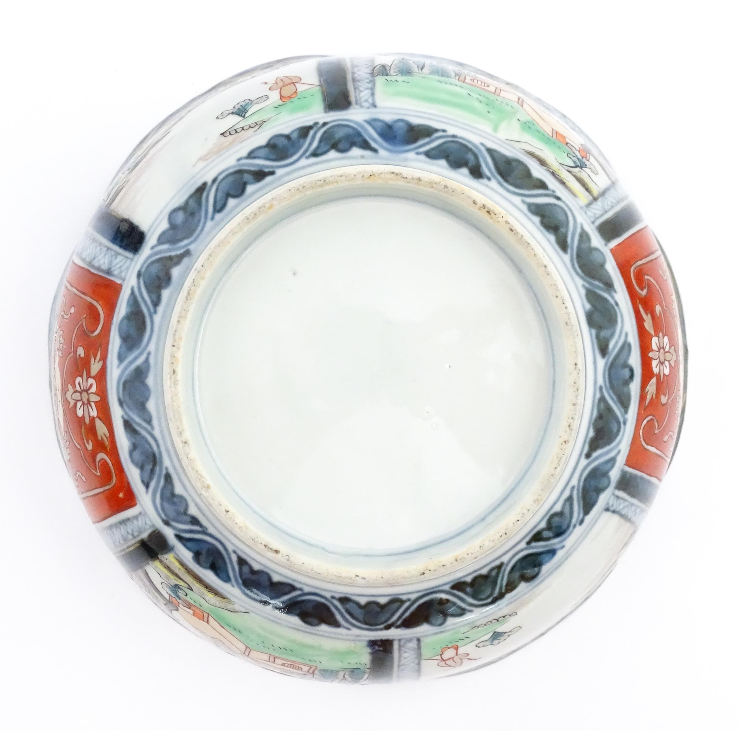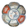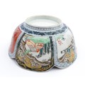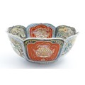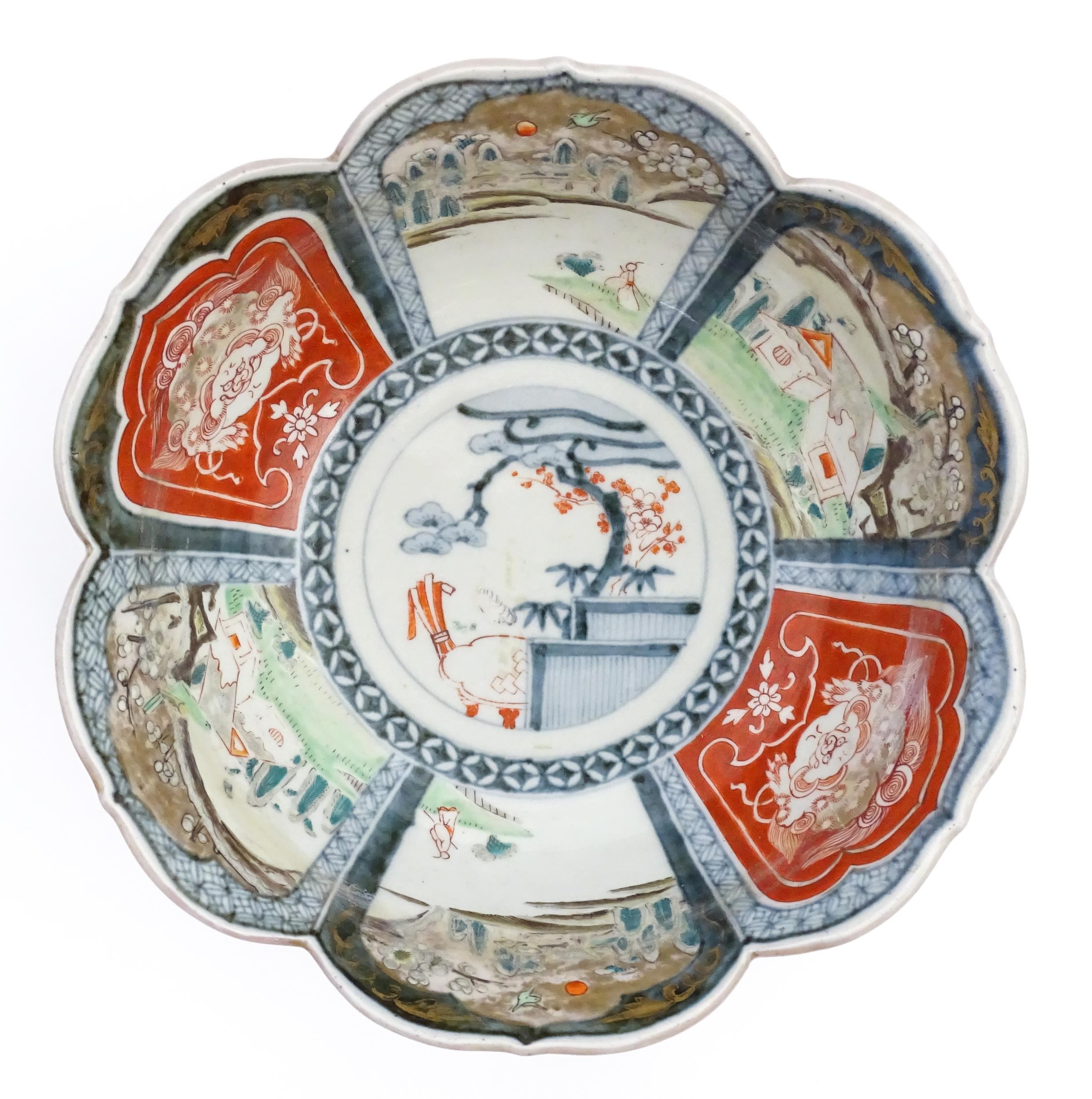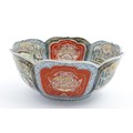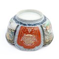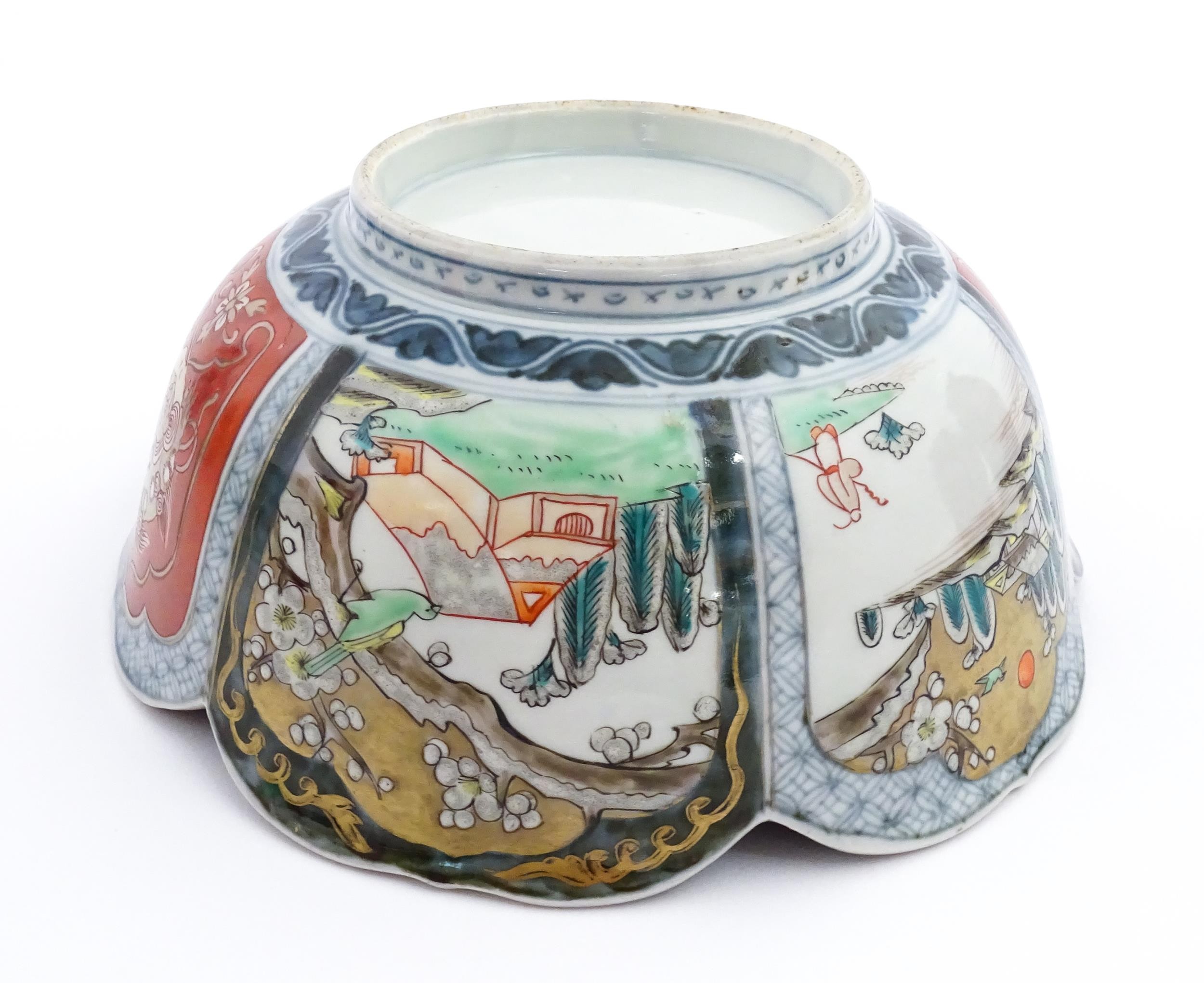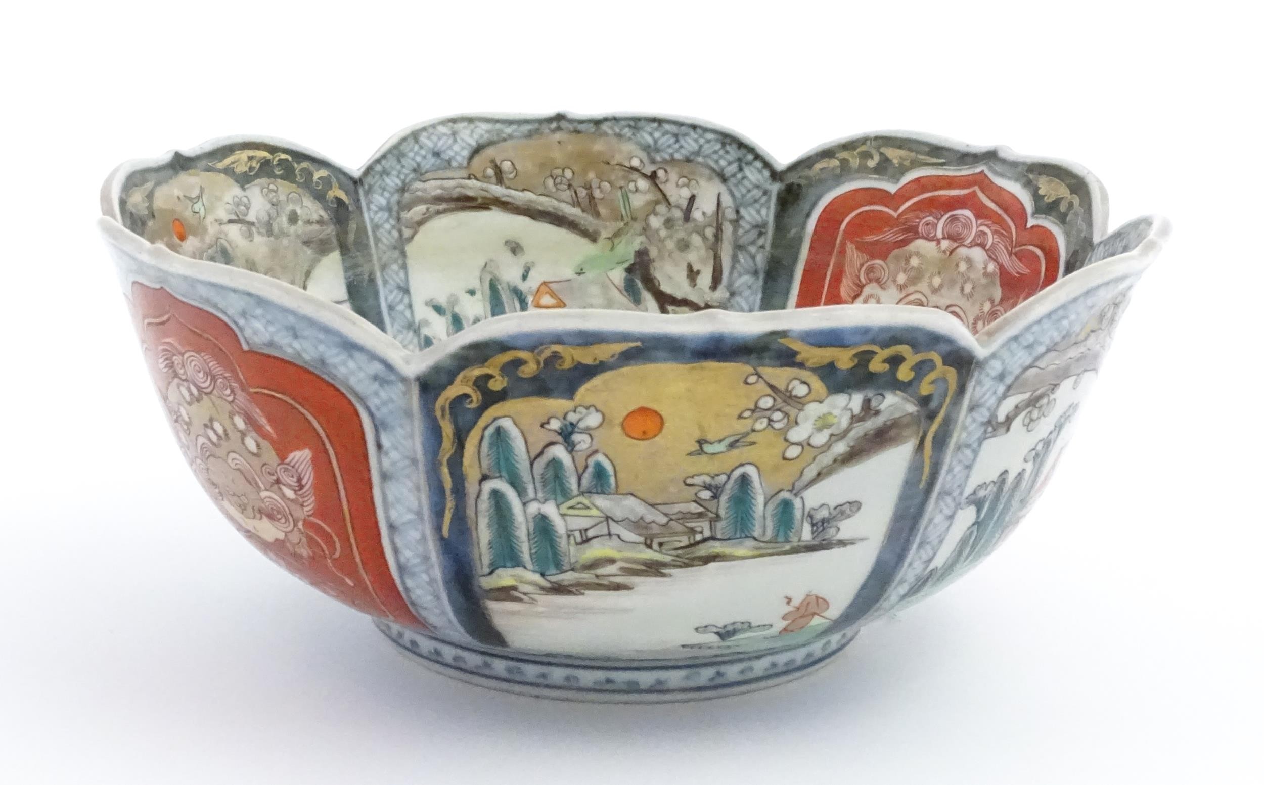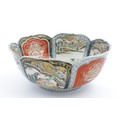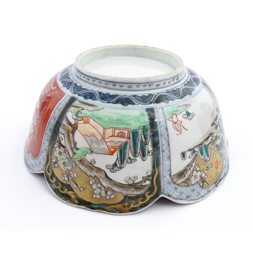 A Japanese Imari bowl of lobed form, with alternatively decorated panels with landscapes and guardian lions. Approx. 4" high