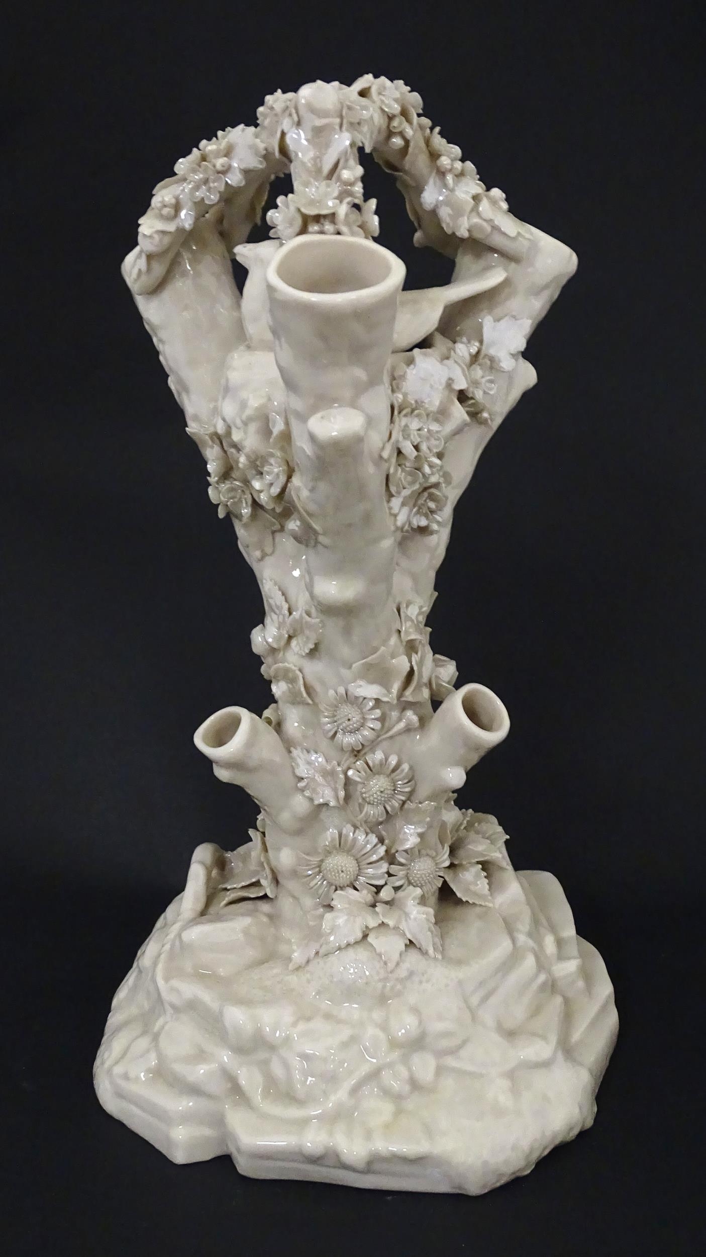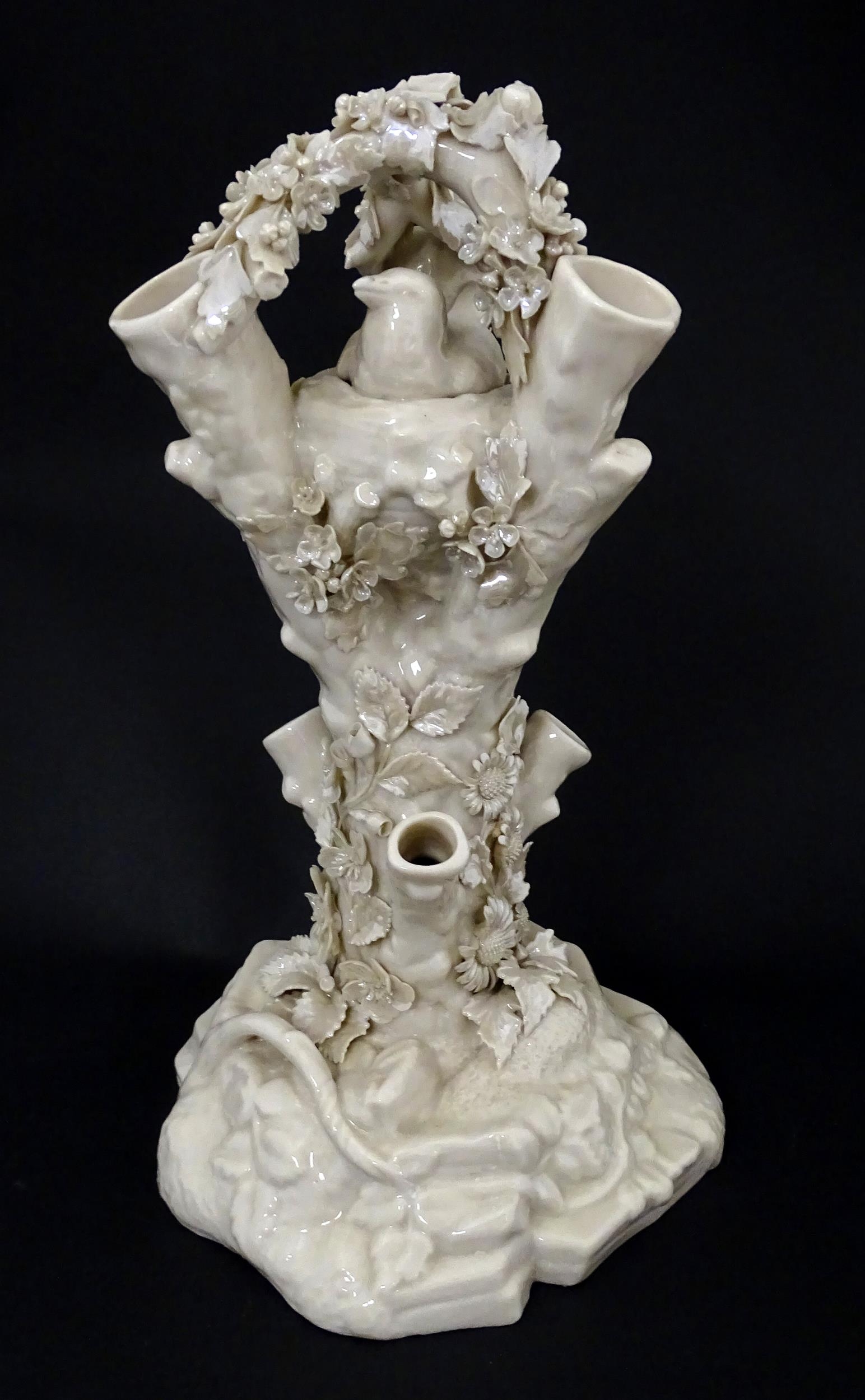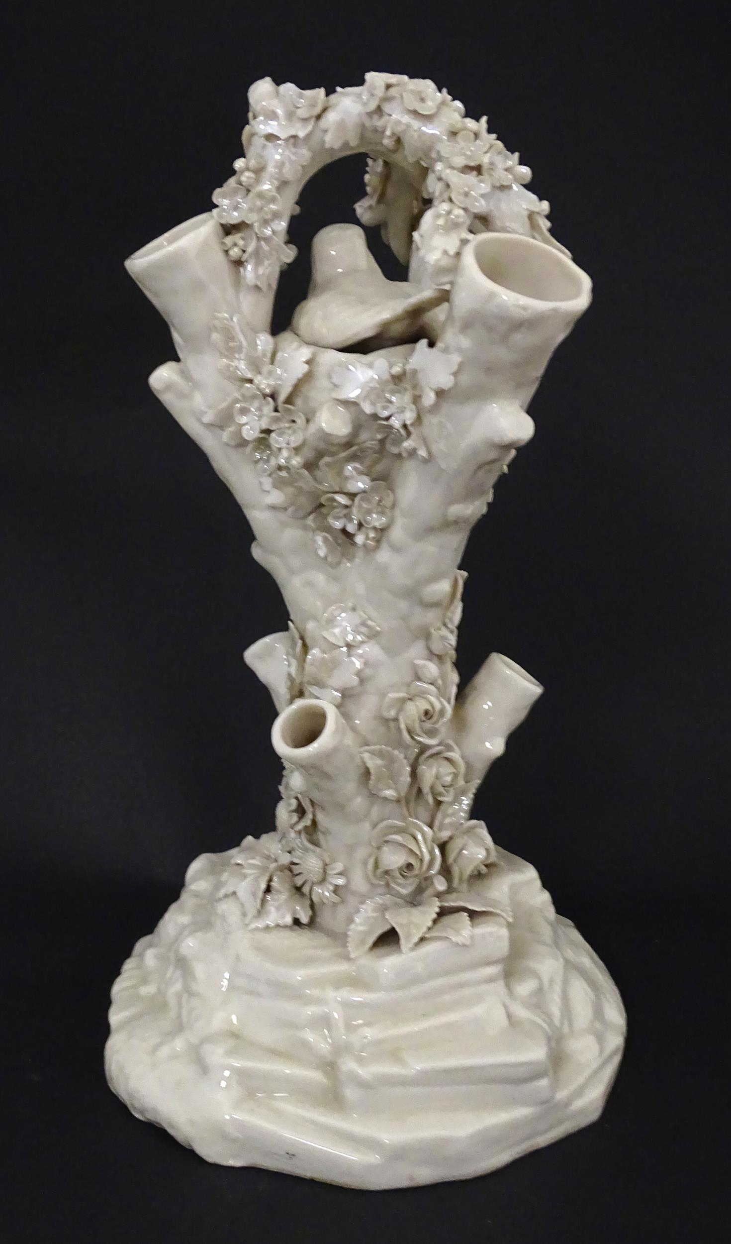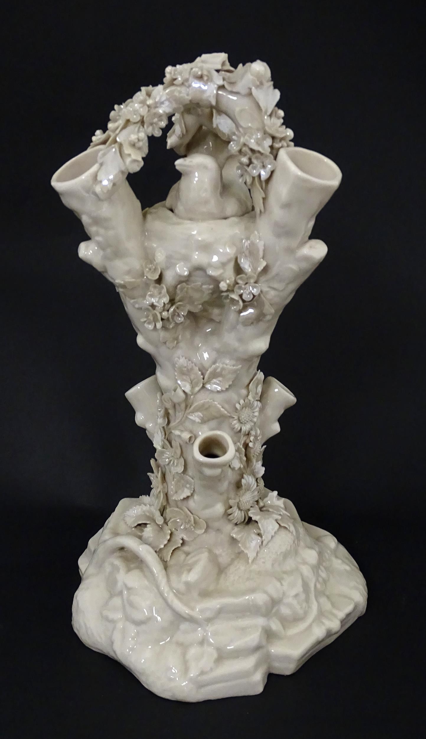 A Belleek Bird Nest Stump vase with floral, foliate and bird decoration. Marked under with Second Period mark. Approx. 11 1/2" high
