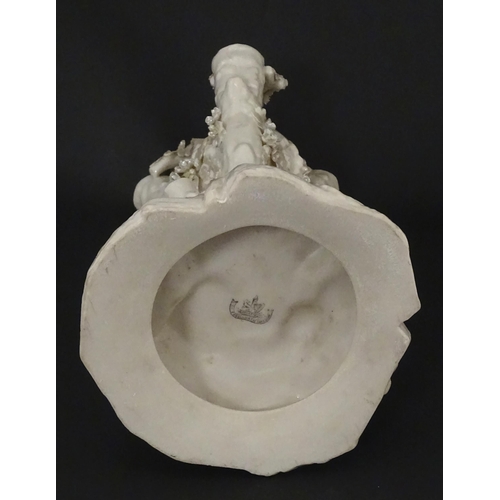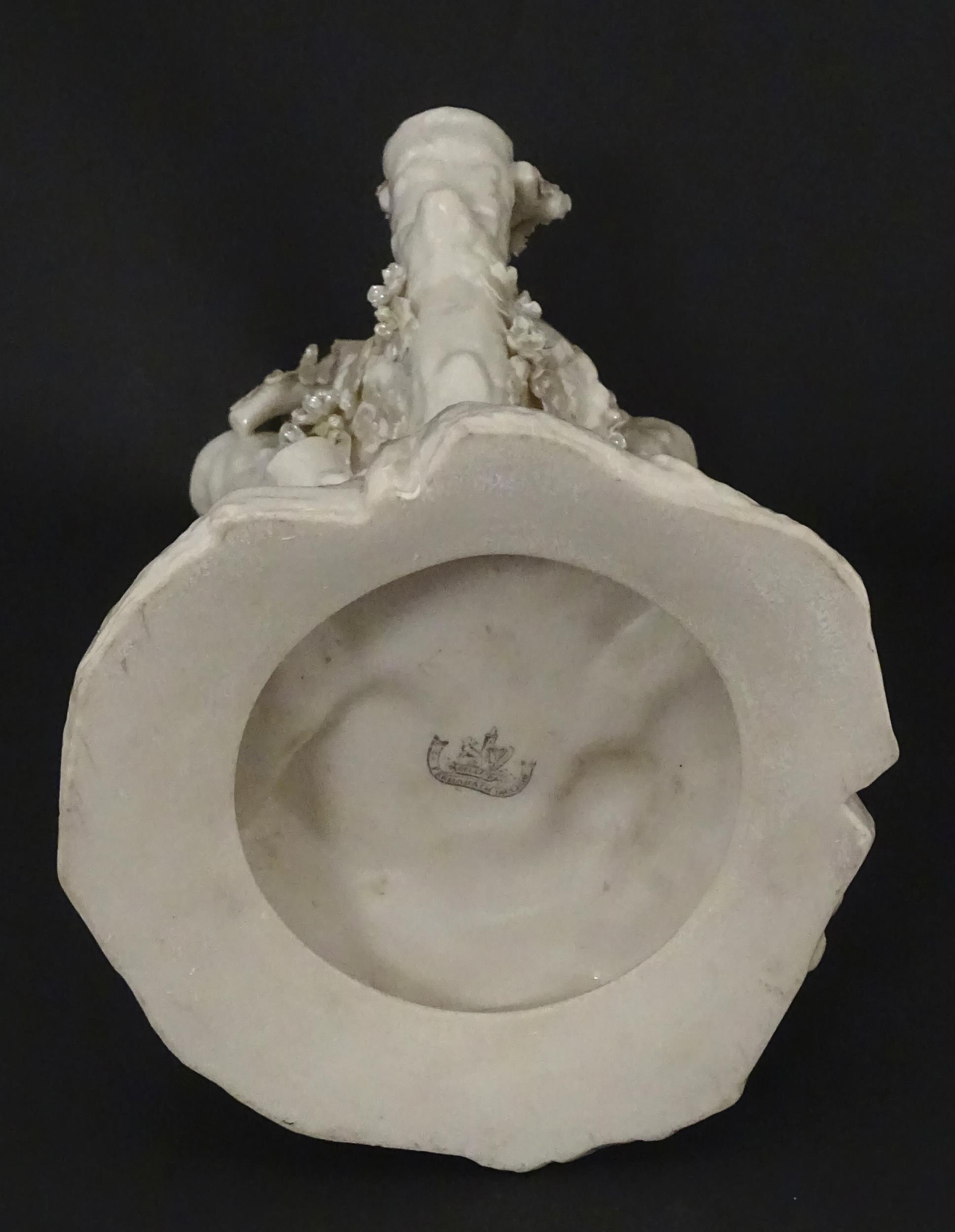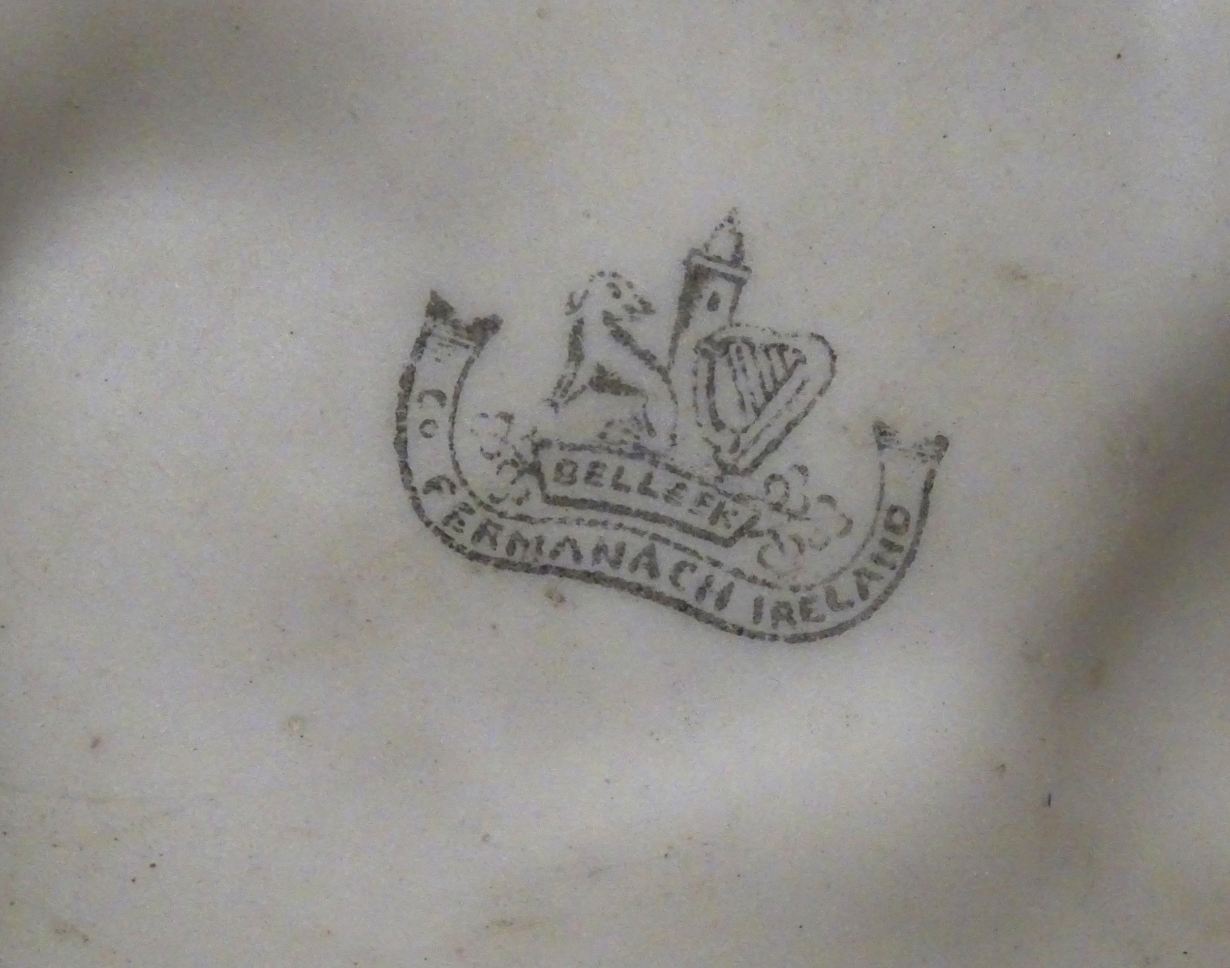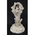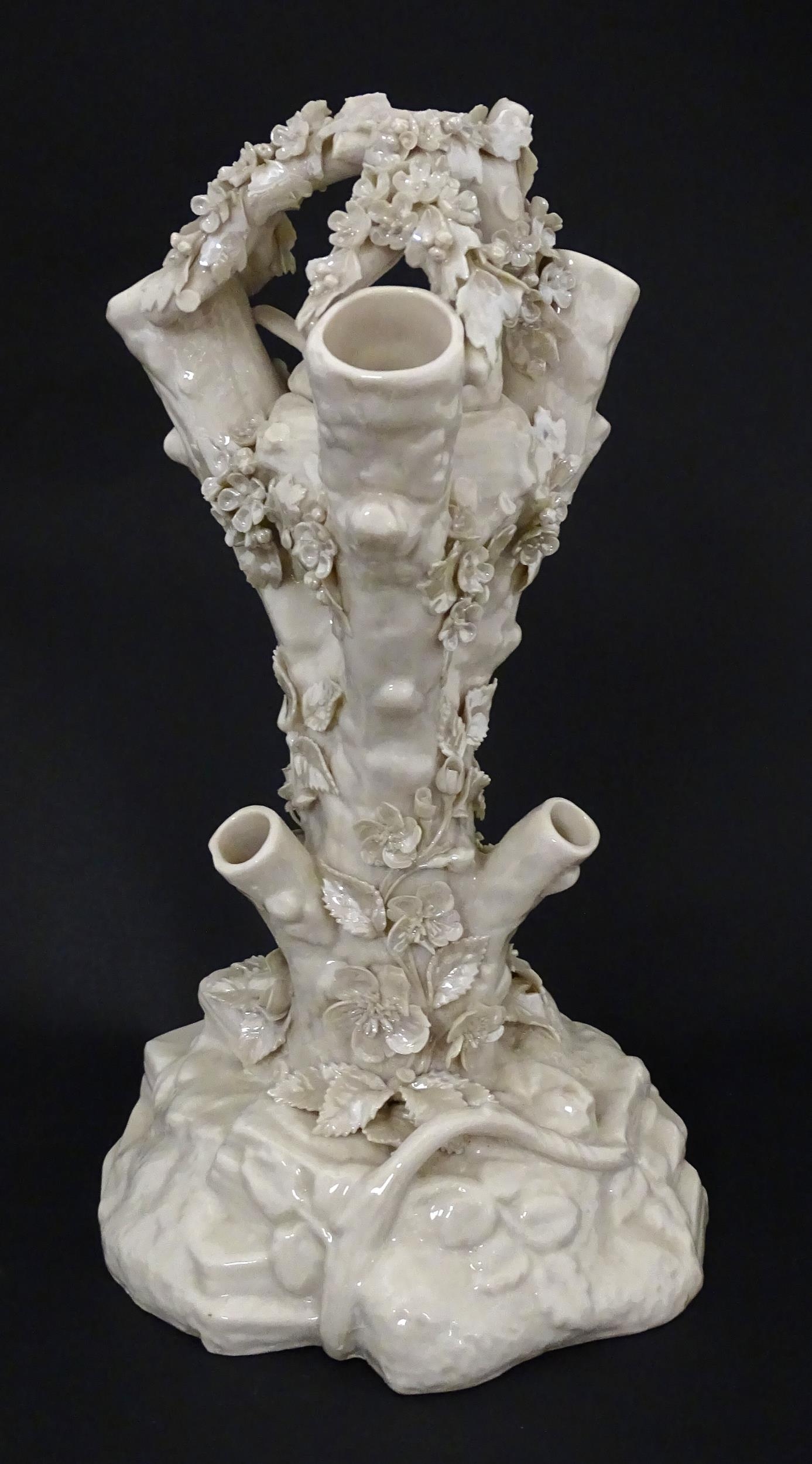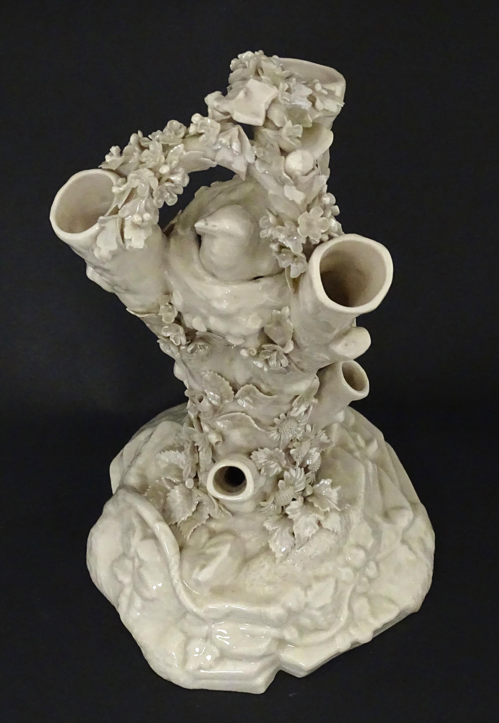 A Belleek Bird Nest Stump vase with floral, foliate and bird decoration. Marked under with Second Period mark. Approx. 11 1/2" high
