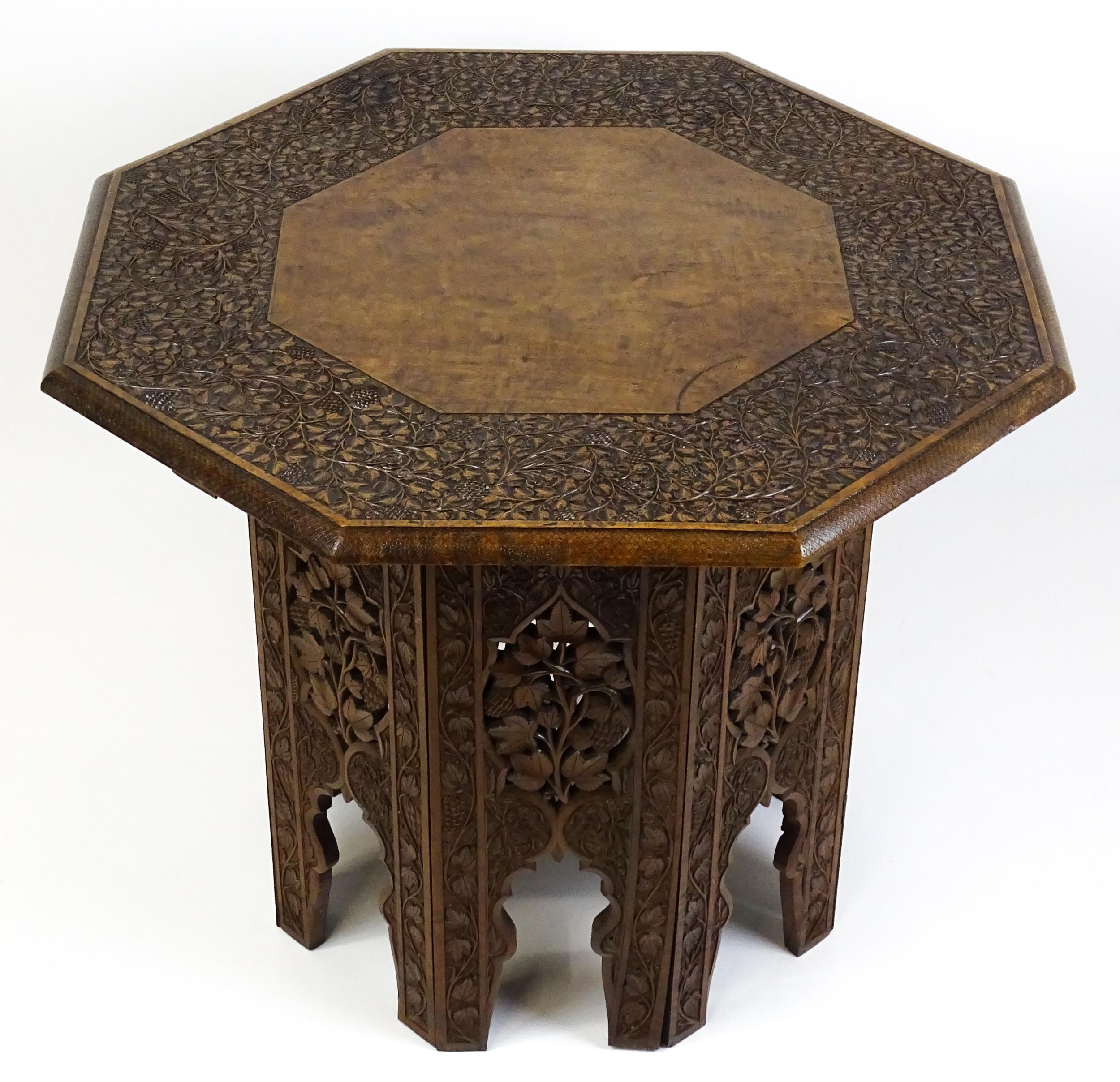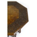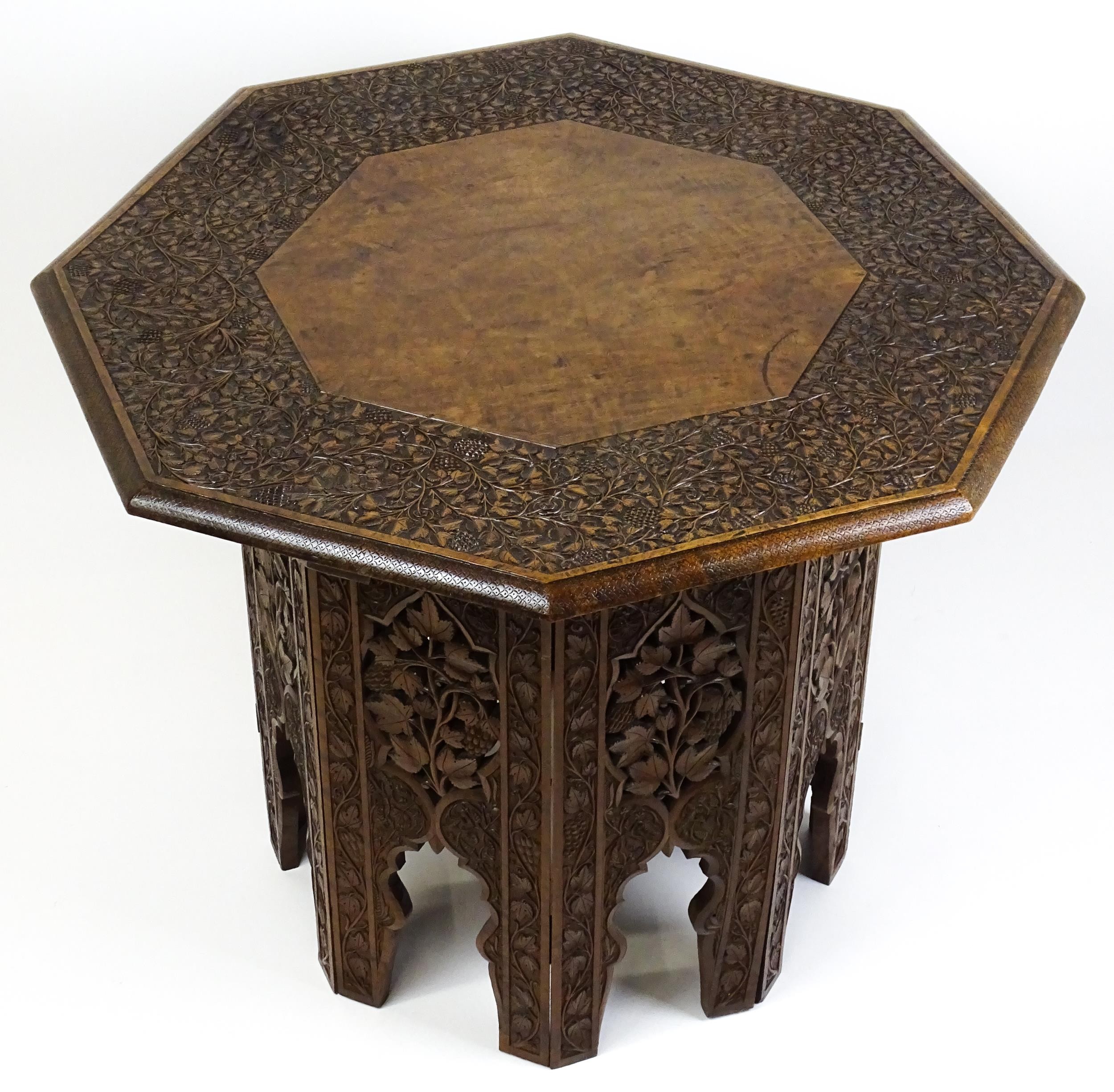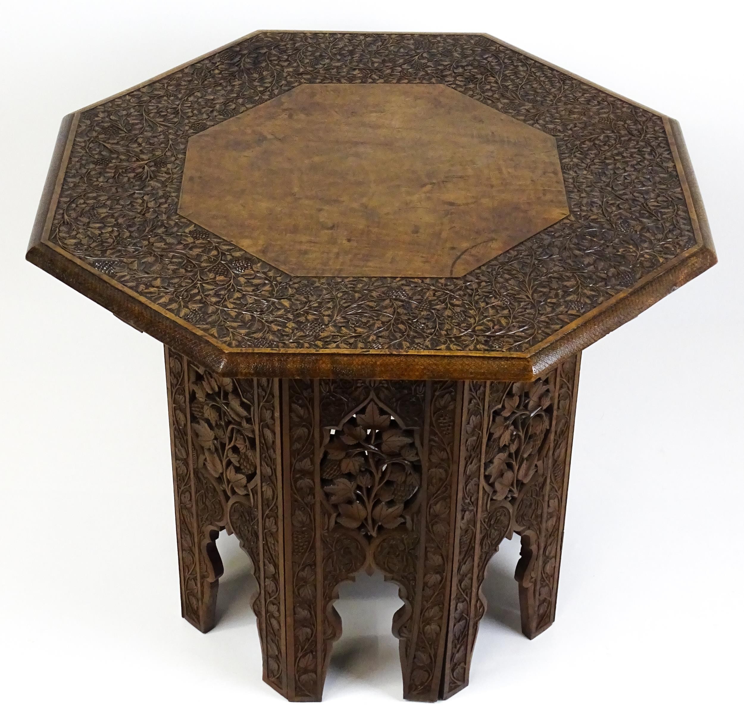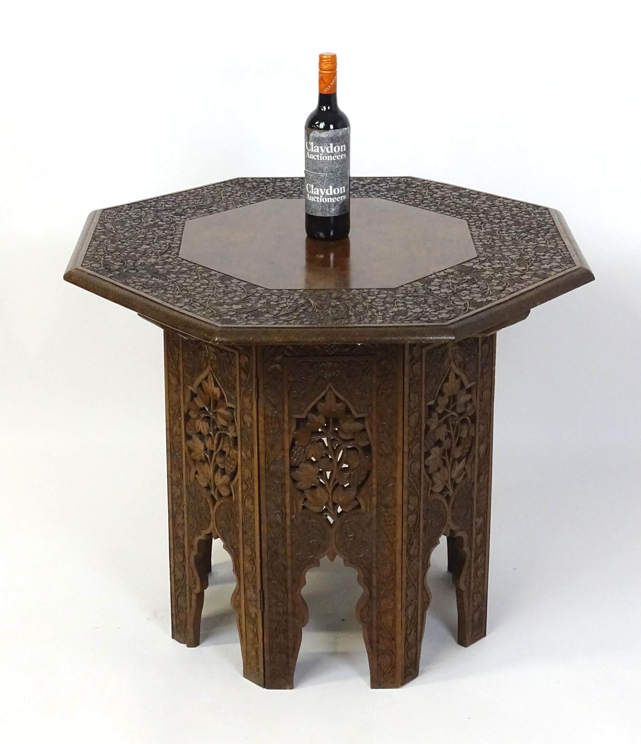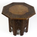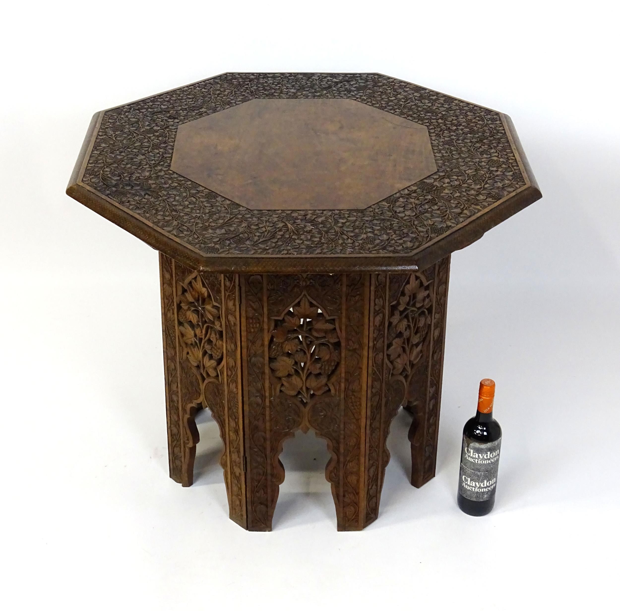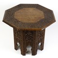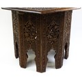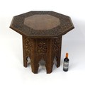An early / mid 20thC Moorish table of unusually large proportions and walnut construction, with an octagonal carved top and eight floral carved pierced sides with Moorish style arches to the bottom of each side. 33" wide x 33" deep x 28" high.