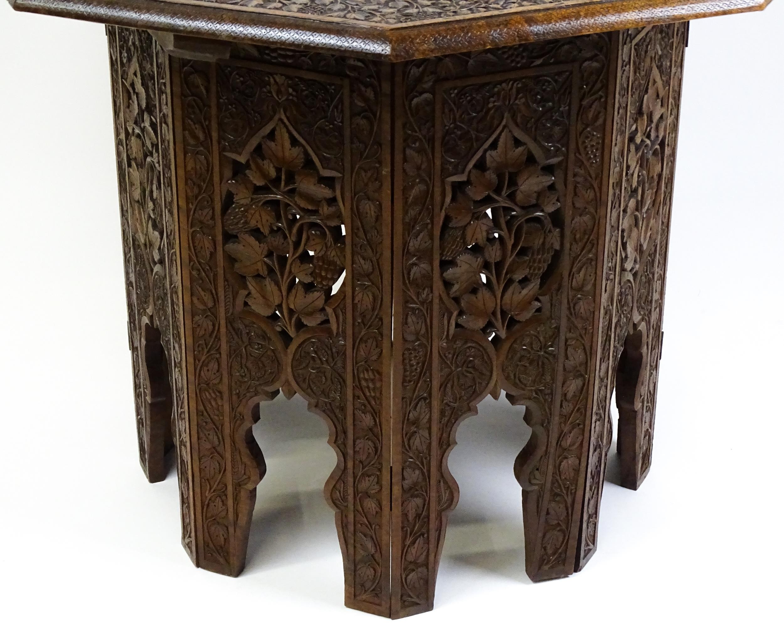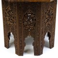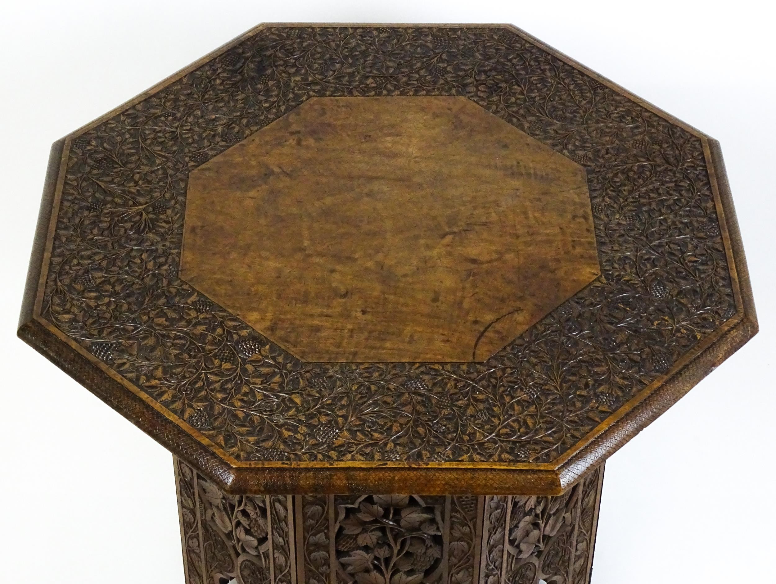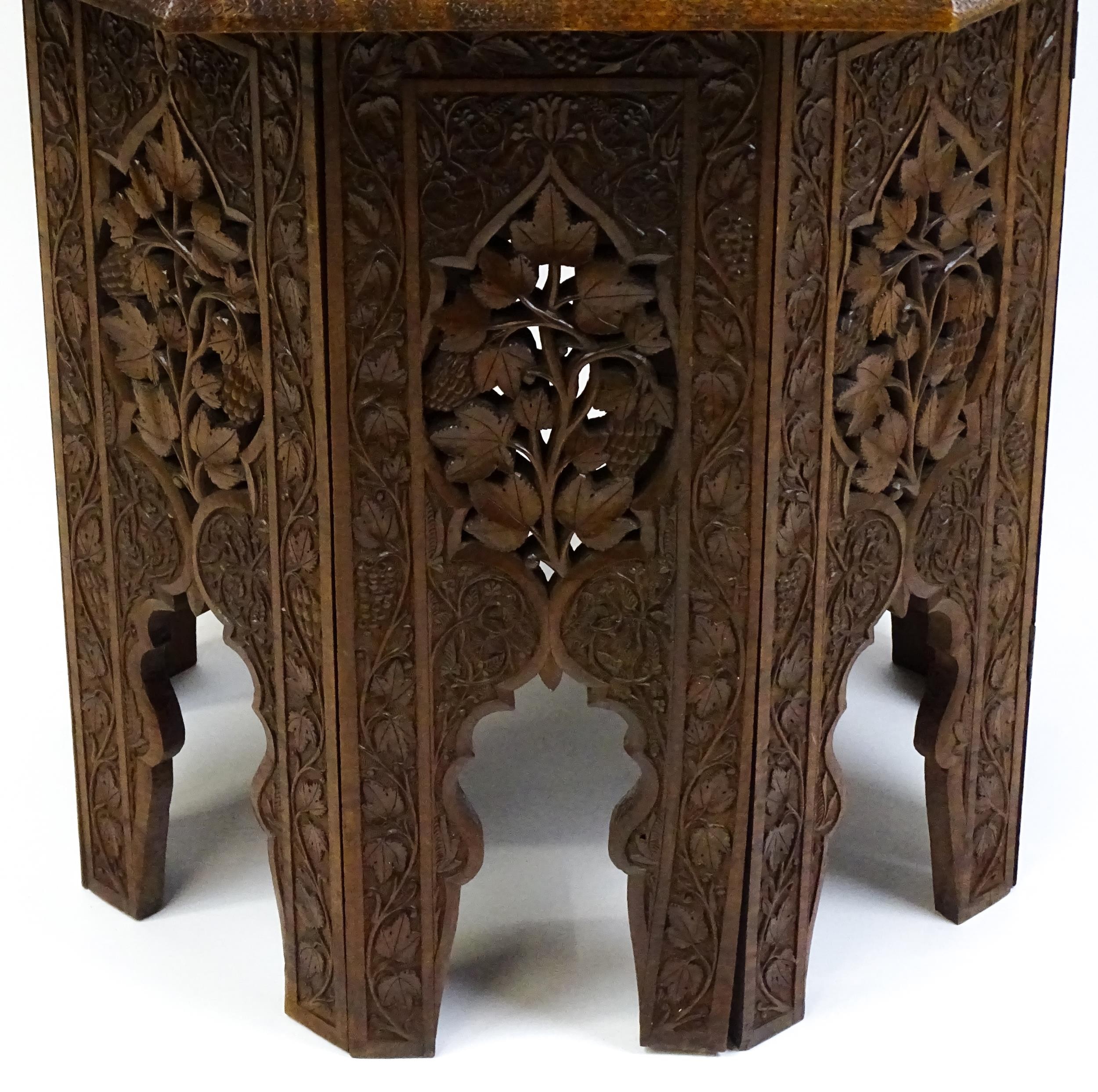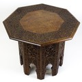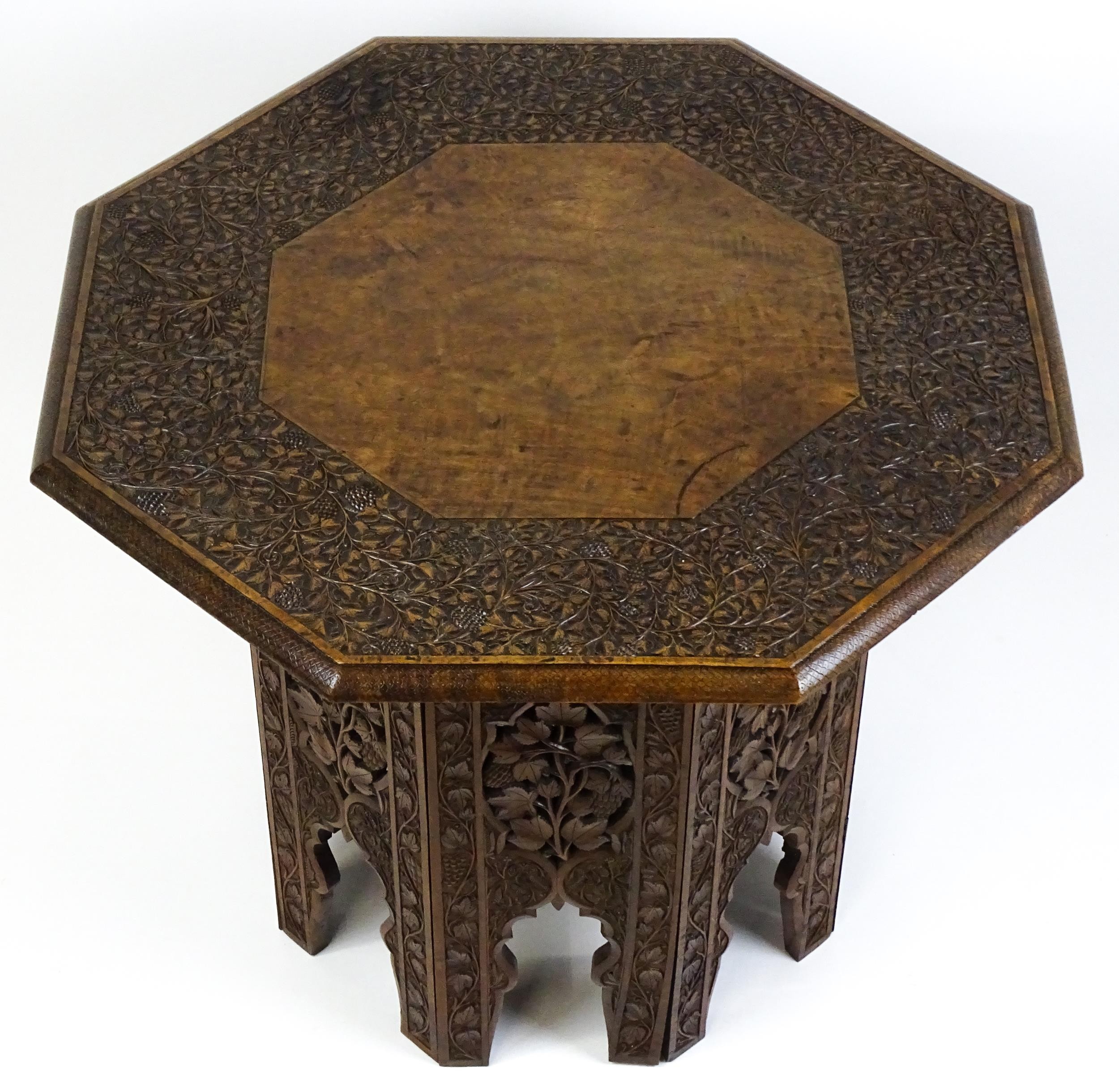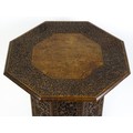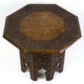 An early / mid 20thC Moorish table of unusually large proportions and walnut construction, with an octagonal carved top and eight floral carved pierced sides with Moorish style arches to the bottom of each side. 33" wide x 33" deep x 28" high.