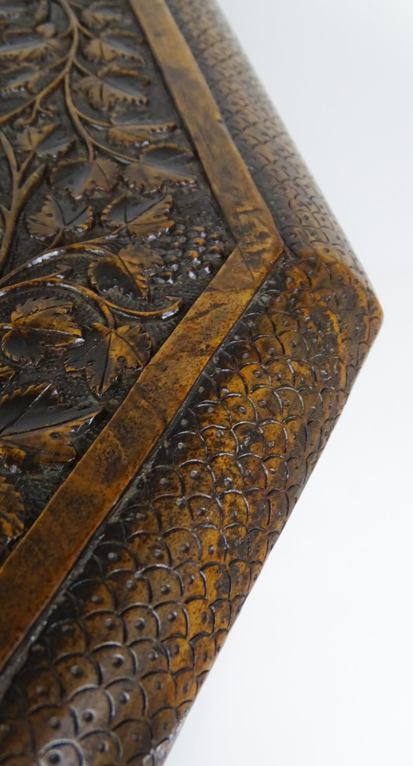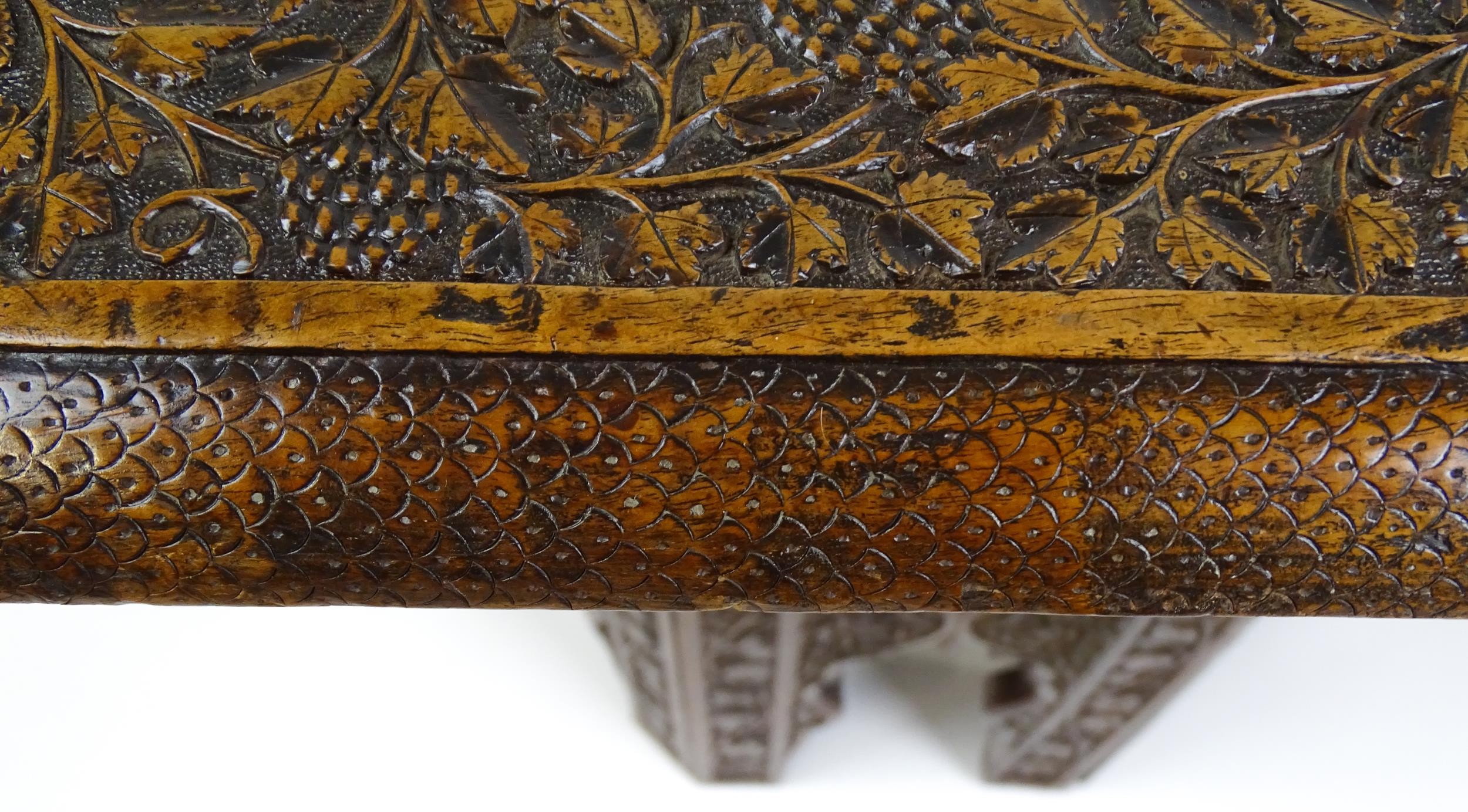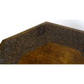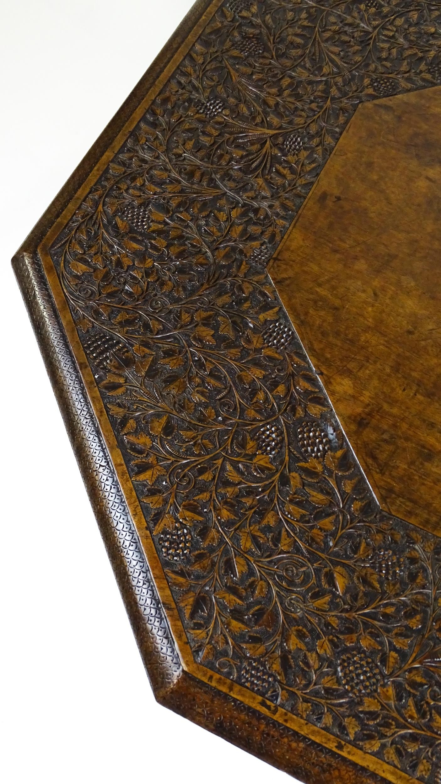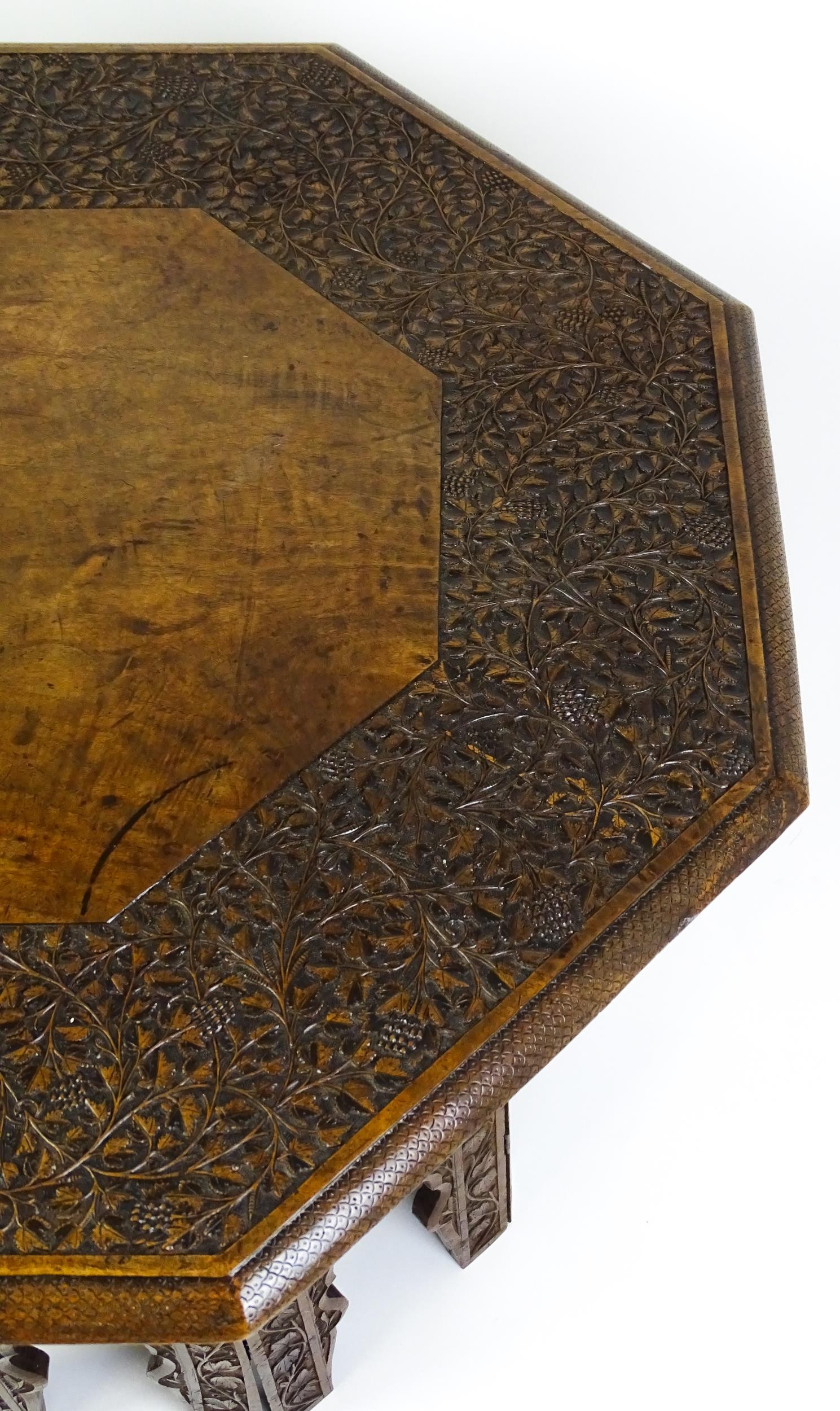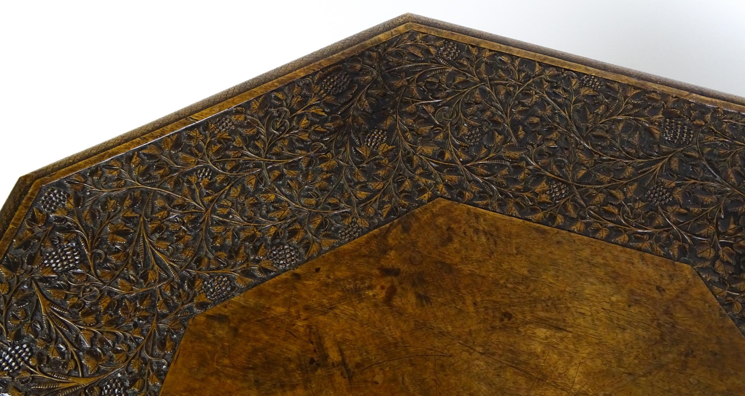 An early / mid 20thC Moorish table of unusually large proportions and walnut construction, with an octagonal carved top and eight floral carved pierced sides with Moorish style arches to the bottom of each side. 33" wide x 33" deep x 28" high.